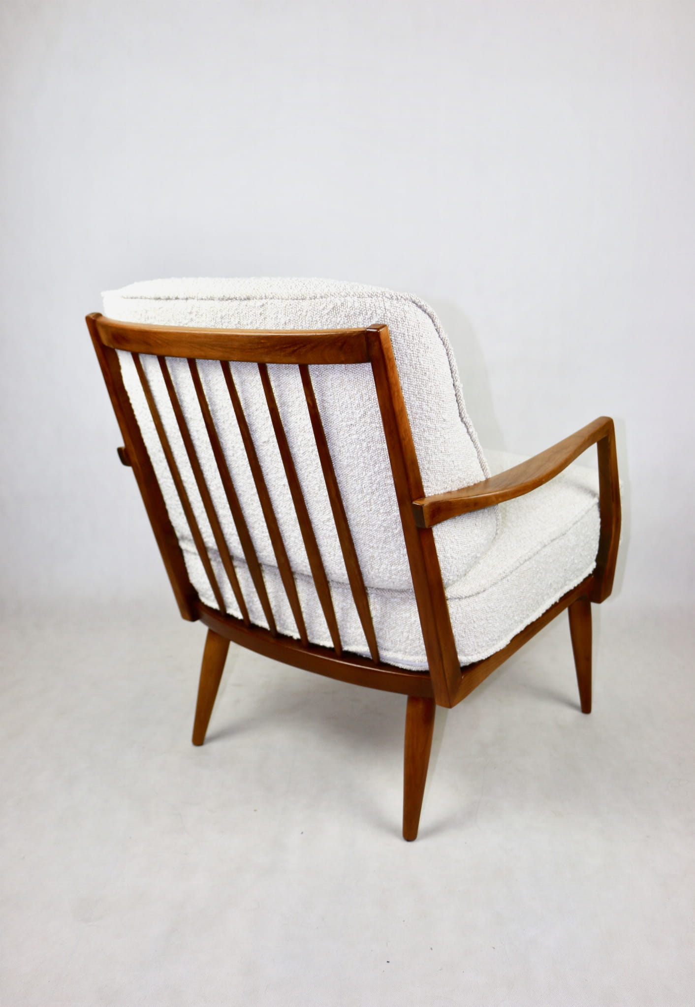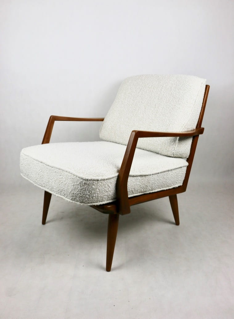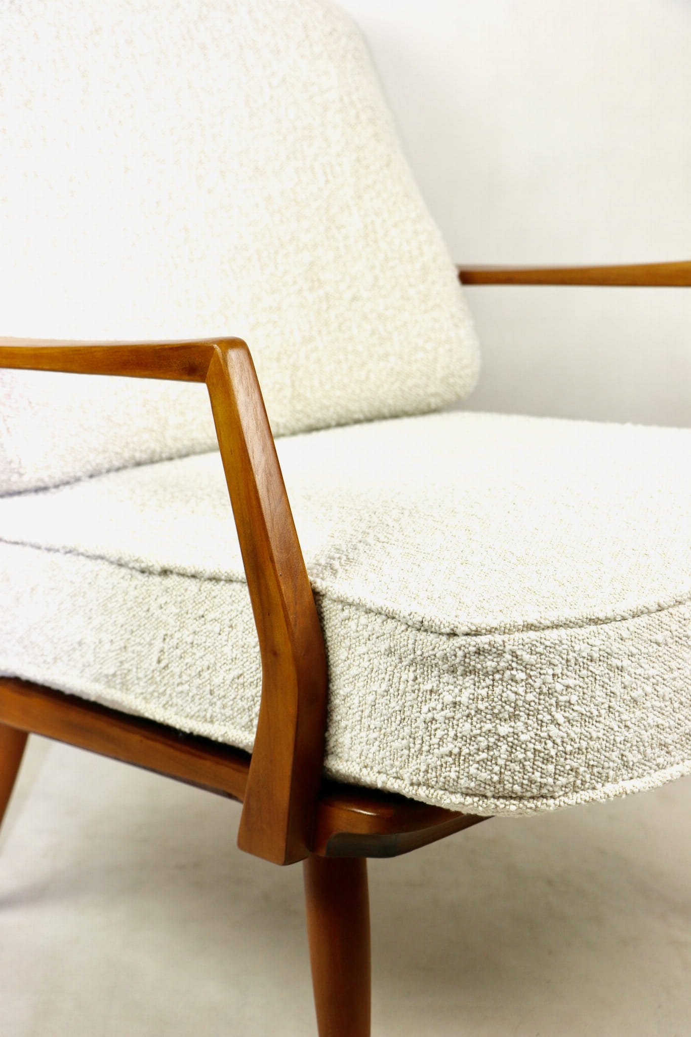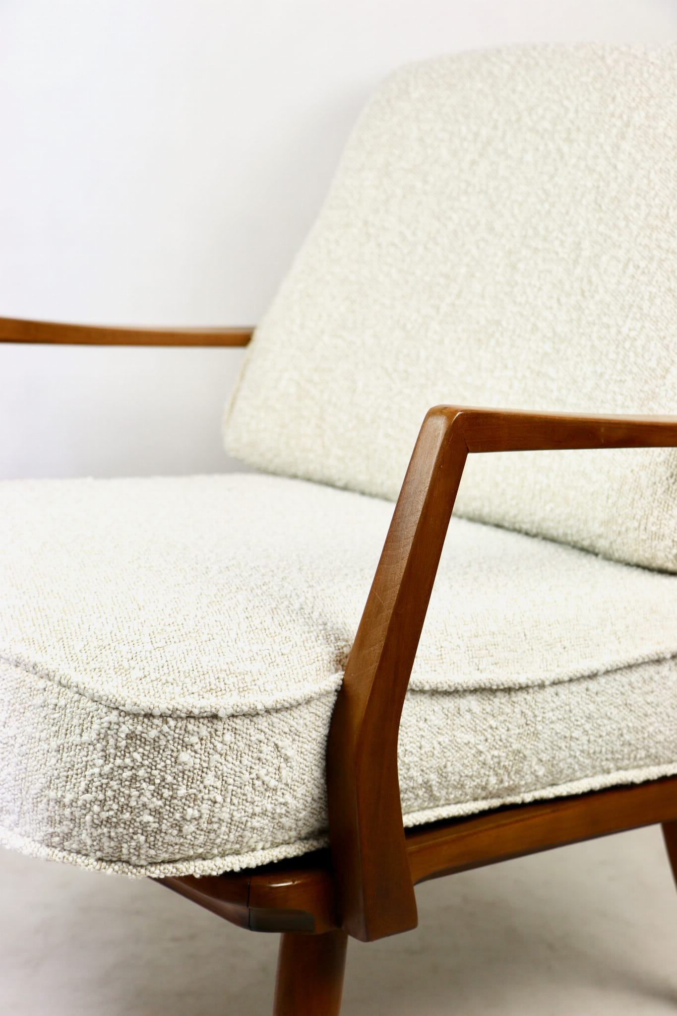 Duński fotel vintage na szczebelkach z lat 70 tych całkowicie odrestaurowany. Nowe obicie pokryte najwyższej jakości materiałem tapicerskim w kolorze kremowym z serii strukturalnych tkanin jak wełna - Boucle. Stelaż drewniany z podłokietnikami pokryty lakierem w naturalnym kolorze drewna z gatunku podobnym do teak.