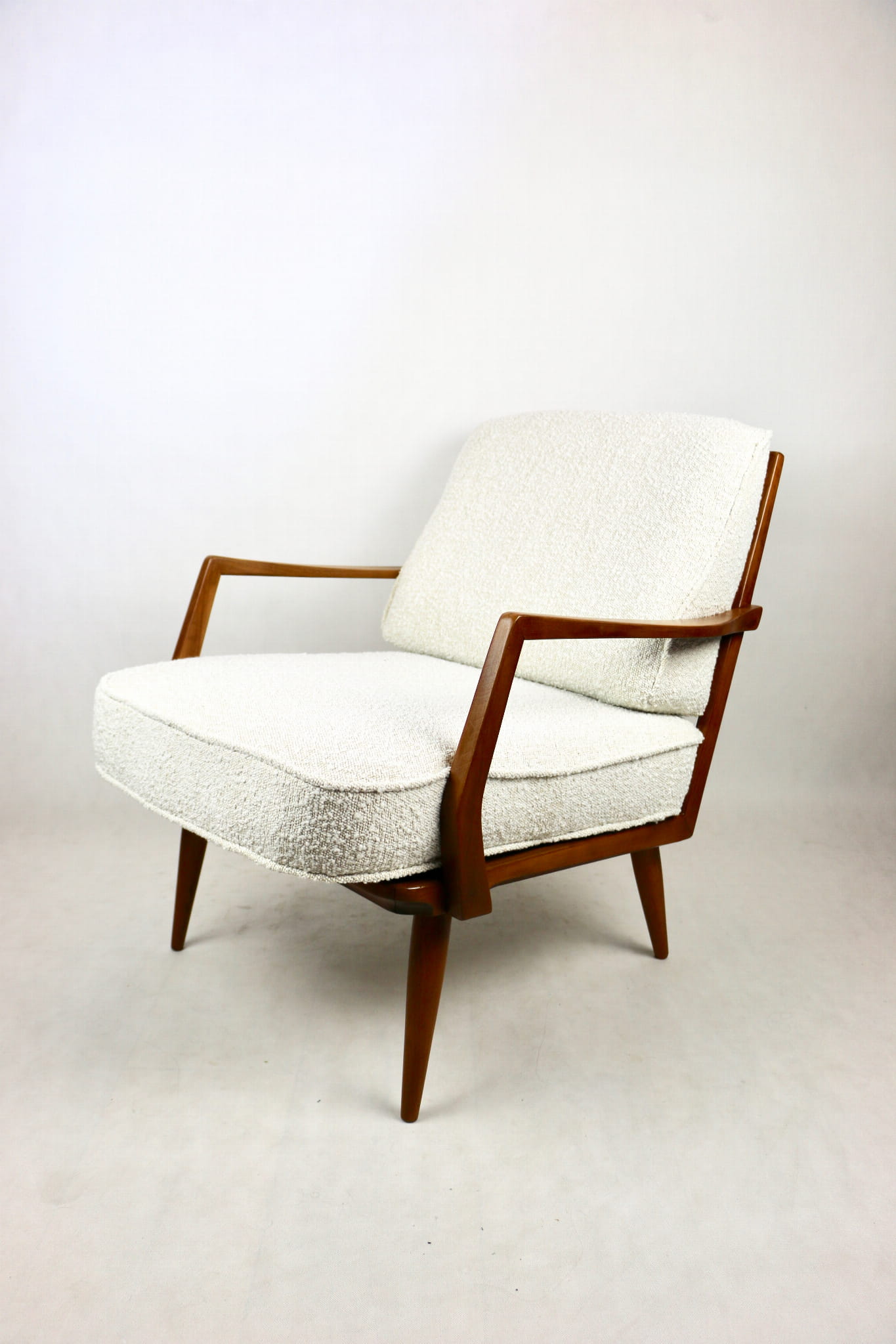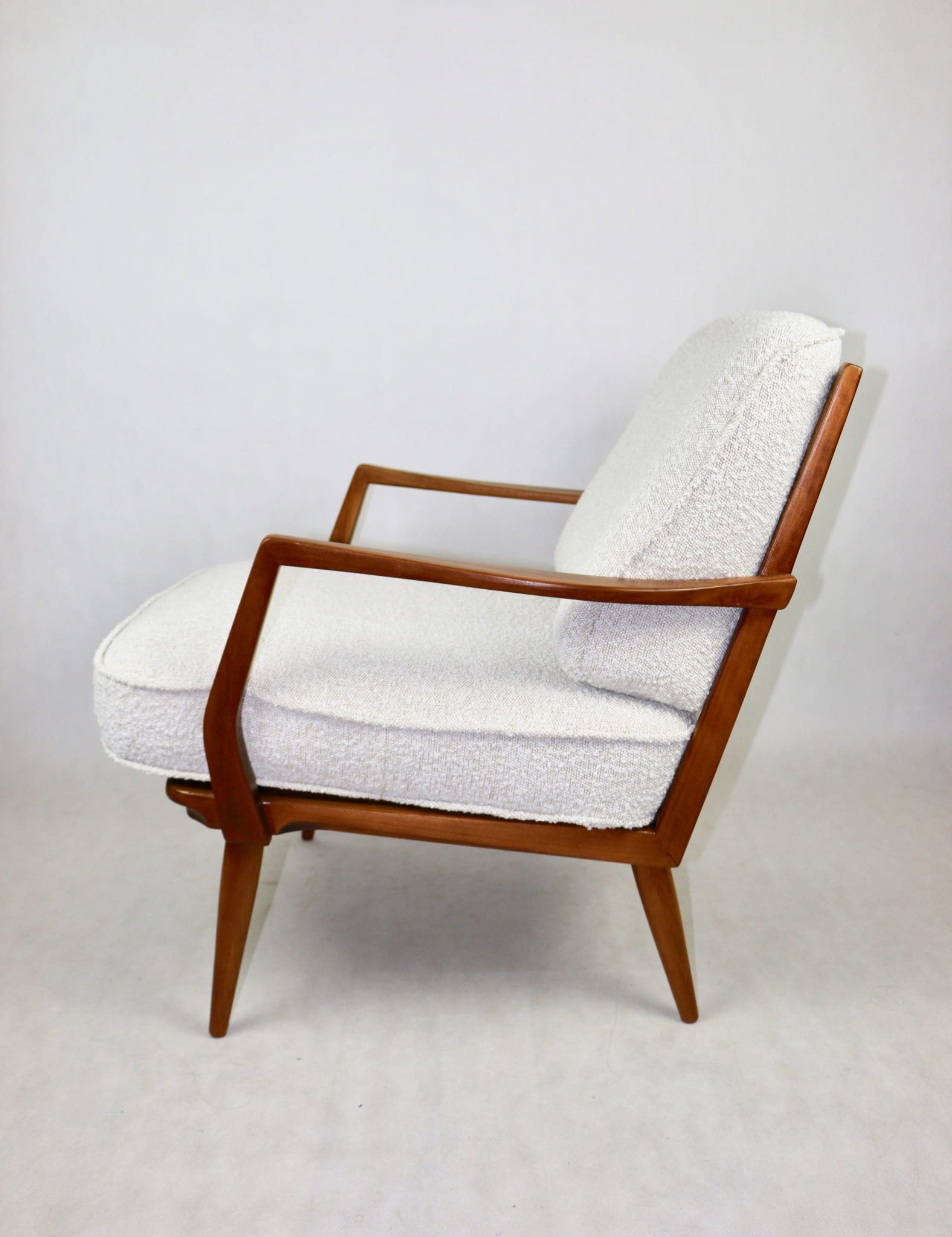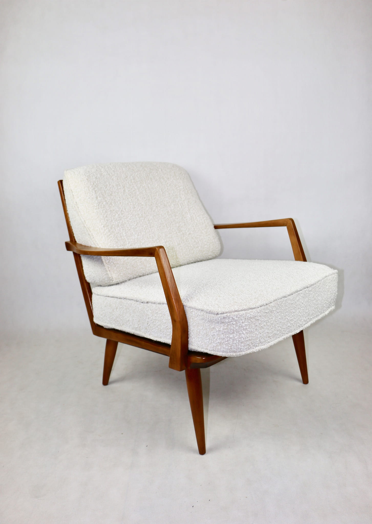 Duński fotel vintage na szczebelkach z lat 70 tych całkowicie odrestaurowany. Nowe obicie pokryte najwyższej jakości materiałem tapicerskim w kolorze kremowym z serii strukturalnych tkanin jak wełna - Boucle. Stelaż drewniany z podłokietnikami pokryty lakierem w naturalnym kolorze drewna z gatunku podobnym do teak.
