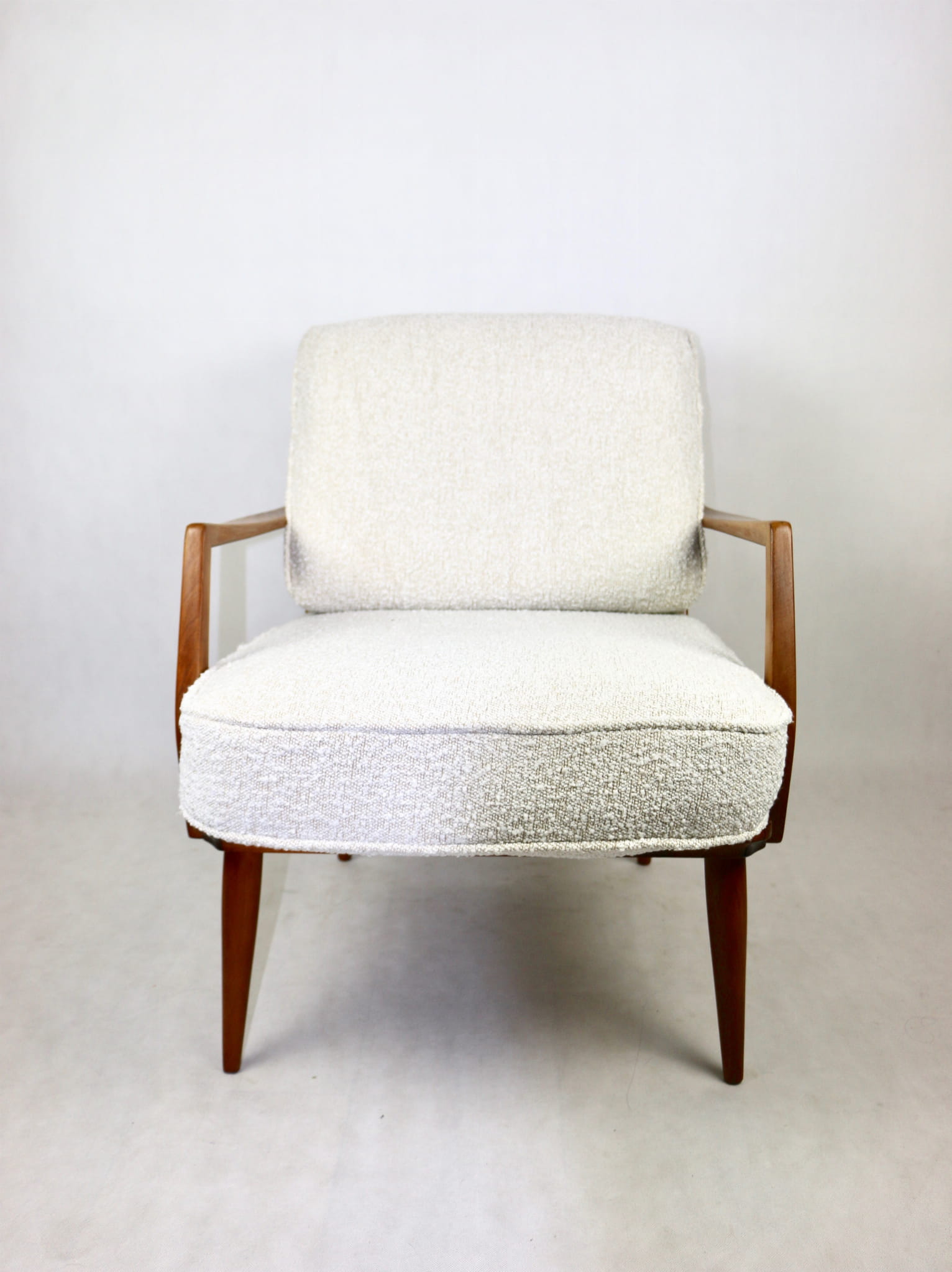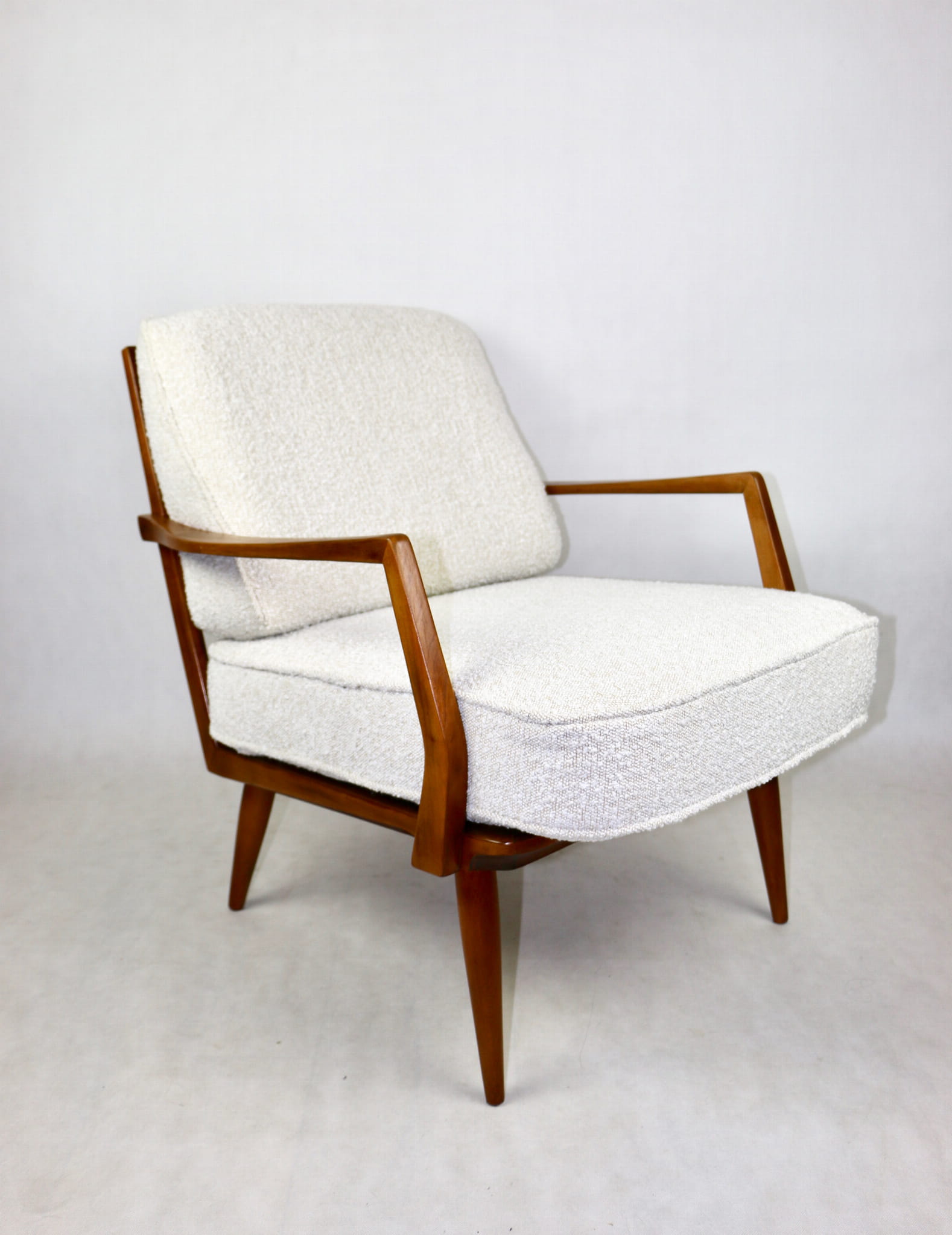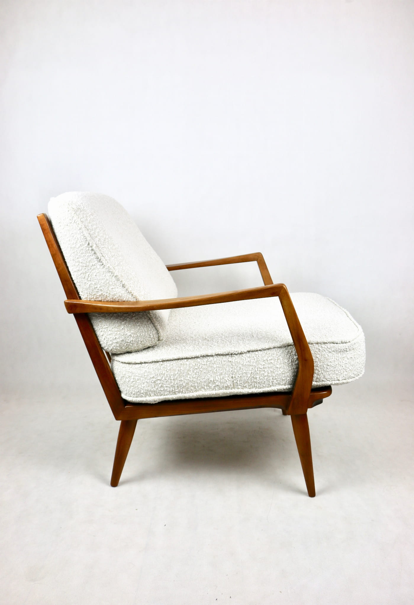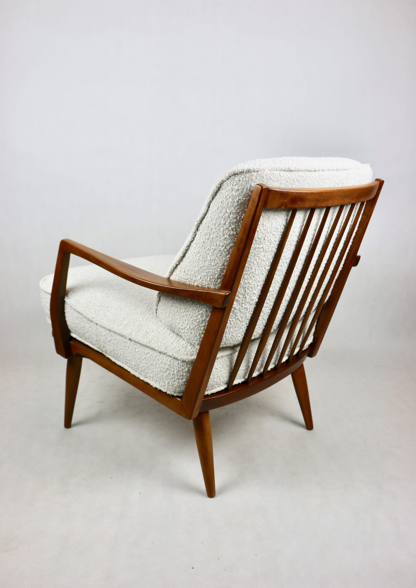 Duński fotel vintage na szczebelkach z lat 70 tych całkowicie odrestaurowany. Nowe obicie pokryte najwyższej jakości materiałem tapicerskim w kolorze kremowym z serii strukturalnych tkanin jak wełna - Boucle. Stelaż drewniany z podłokietnikami pokryty lakierem w naturalnym kolorze drewna z gatunku podobnym do teak.