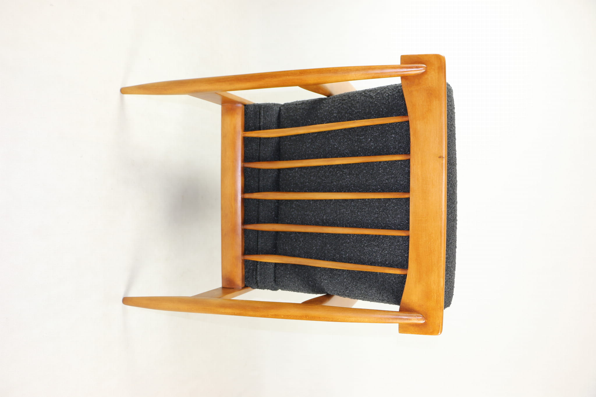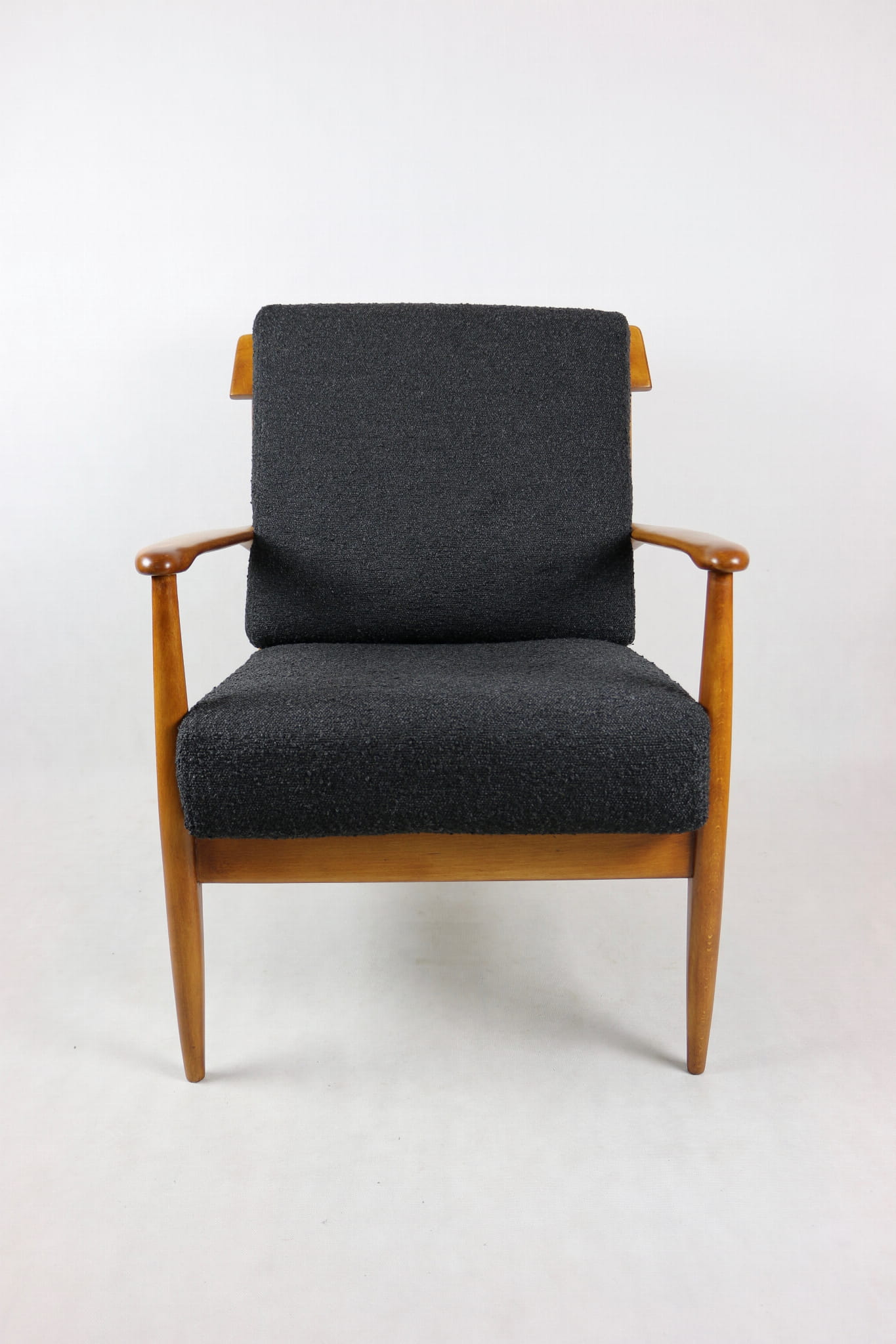 Duński fotel vintage na szczebelkach ze zdejmowanymi poduszkami z lat 70 tych całkowicie odrestaurowany. Nowe obicie pokryte najwyższej jakości materiałem tapicerskim w kolorze czarnym z serii strukturalnych tkanin jak wełna - Boucle. Stelaż drewniany z podłokietnikami pokryty lakierem w naturalnym ciemnym kolorze drewna .