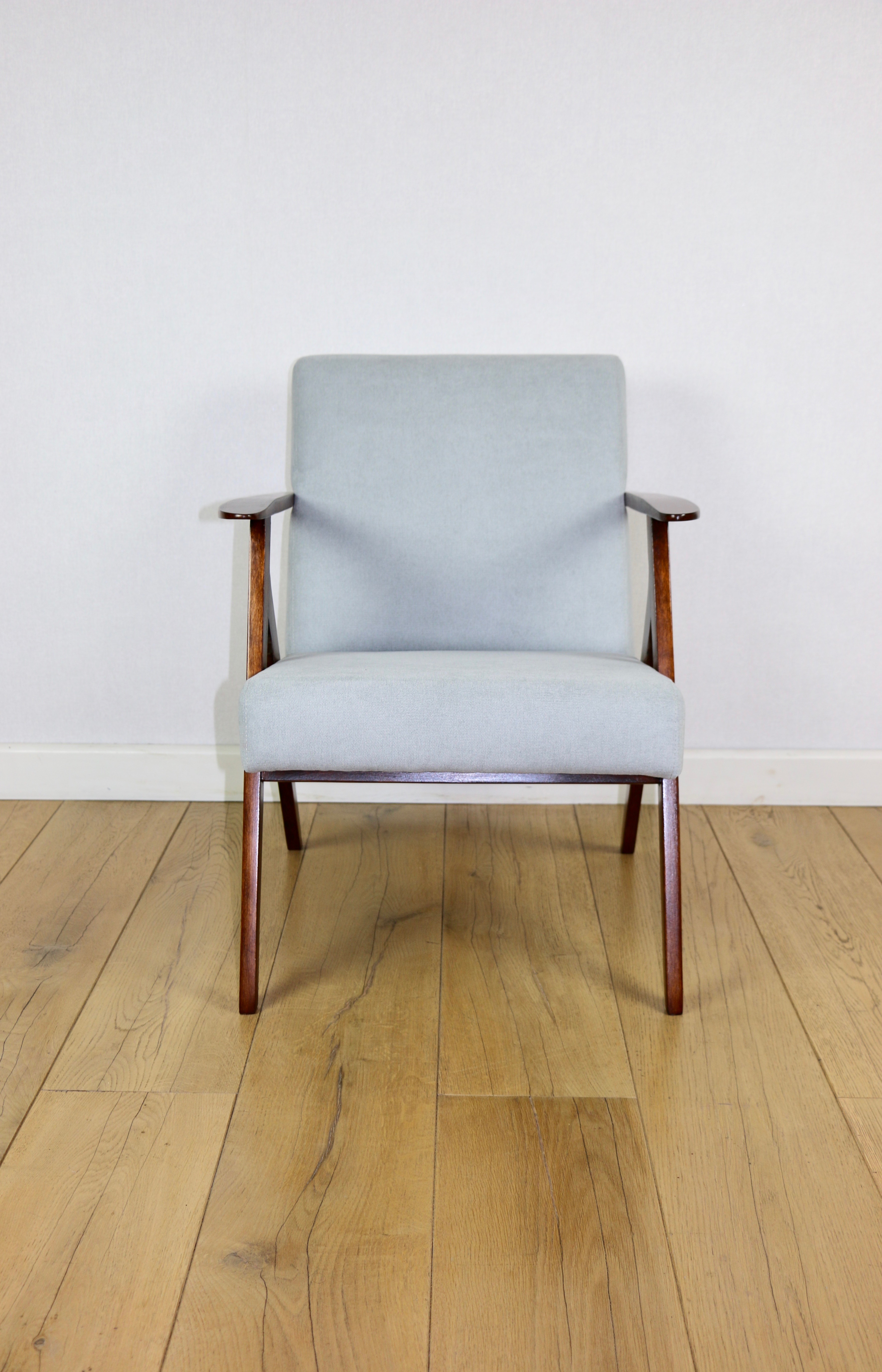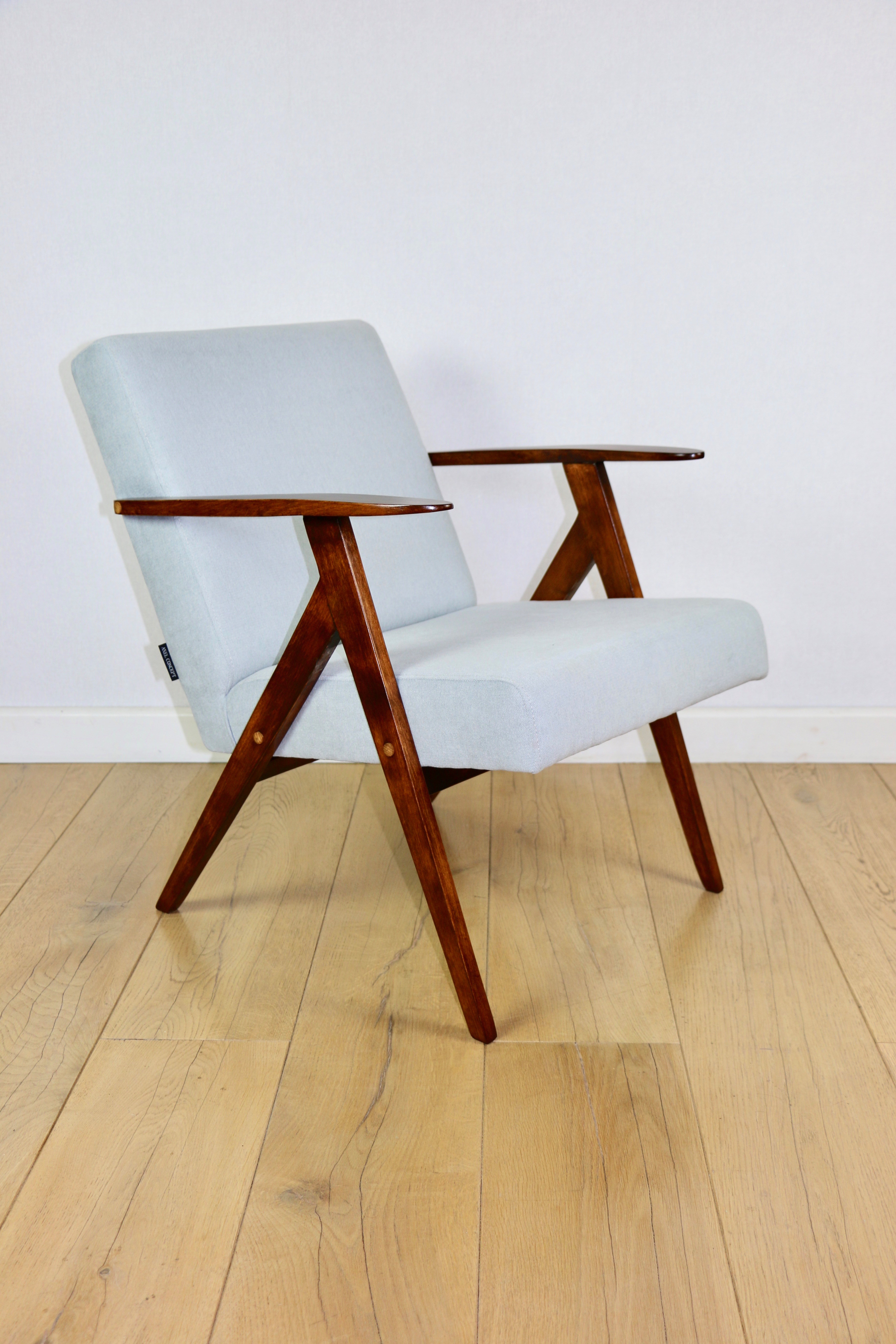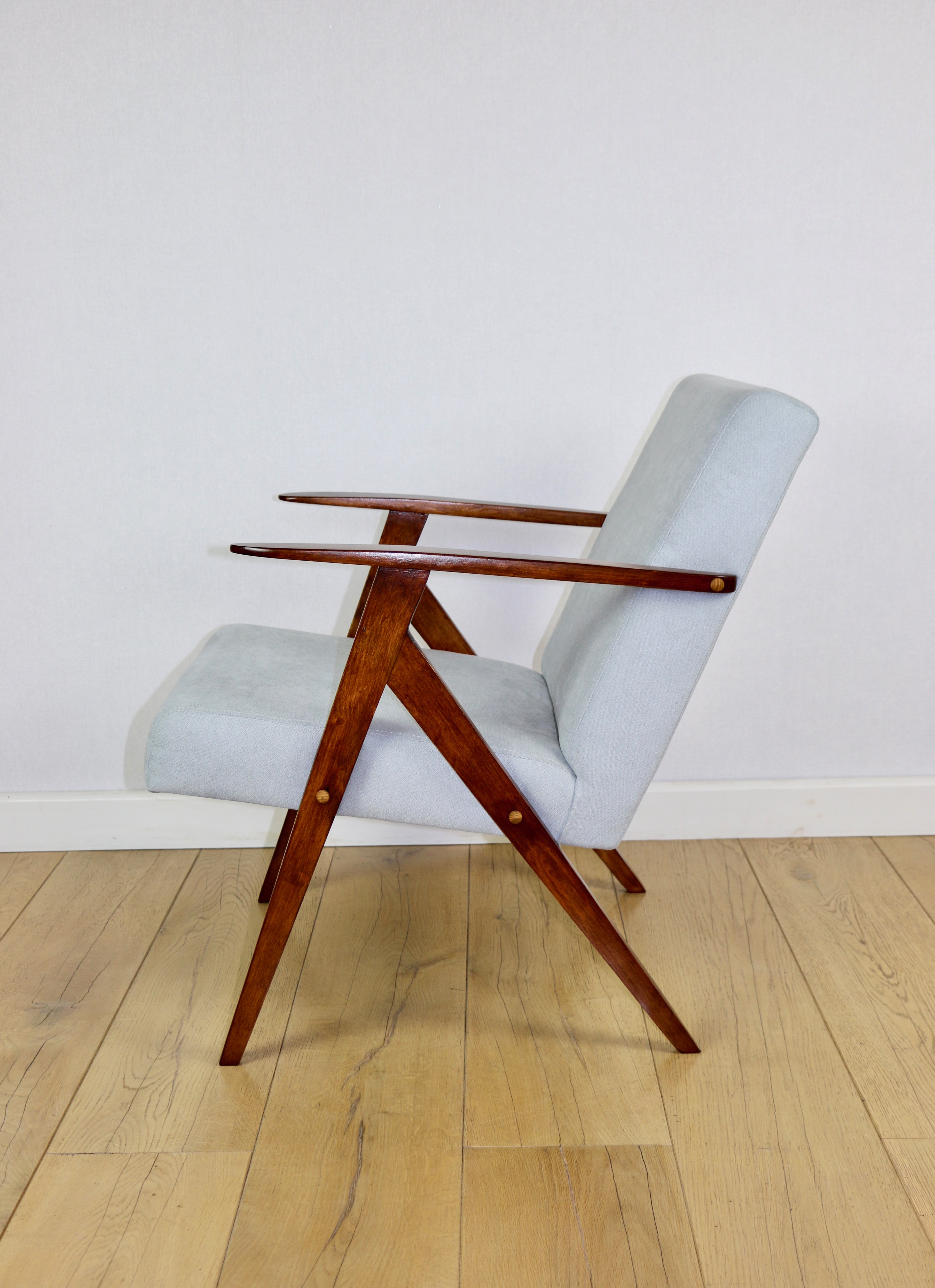 Fotel klasyczny Vintage bardzo podobny do modelu Var z lat 70 tych. Odrestaurowany, nowe obicie pokryte strukturalnym materiałem w kolorze niebiesko - turkusowym. Siedzisko bardzo wygodne, stelaż drewniany połączony z podłokietnikami w jasnej orzechowej kolorystyce drewna.