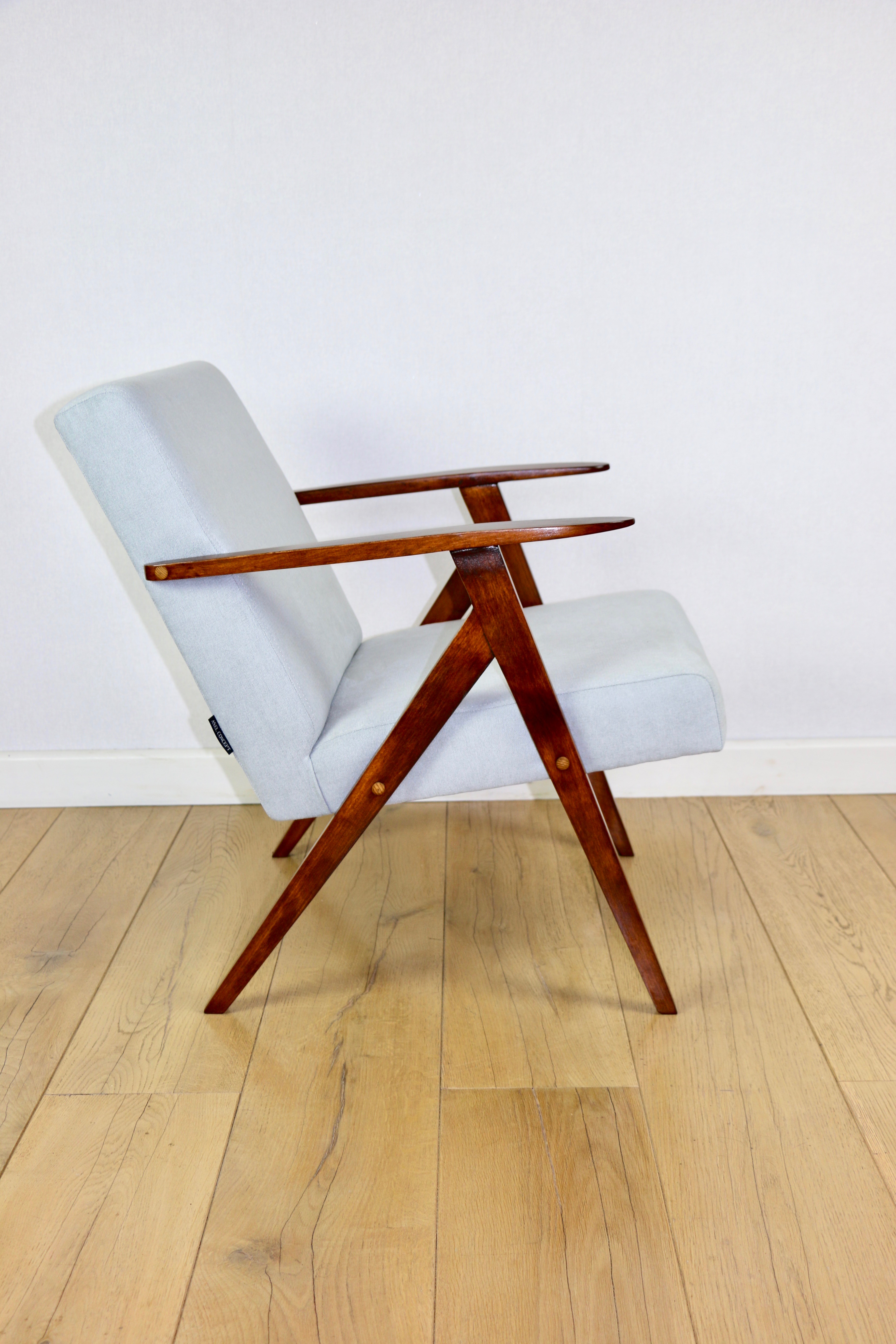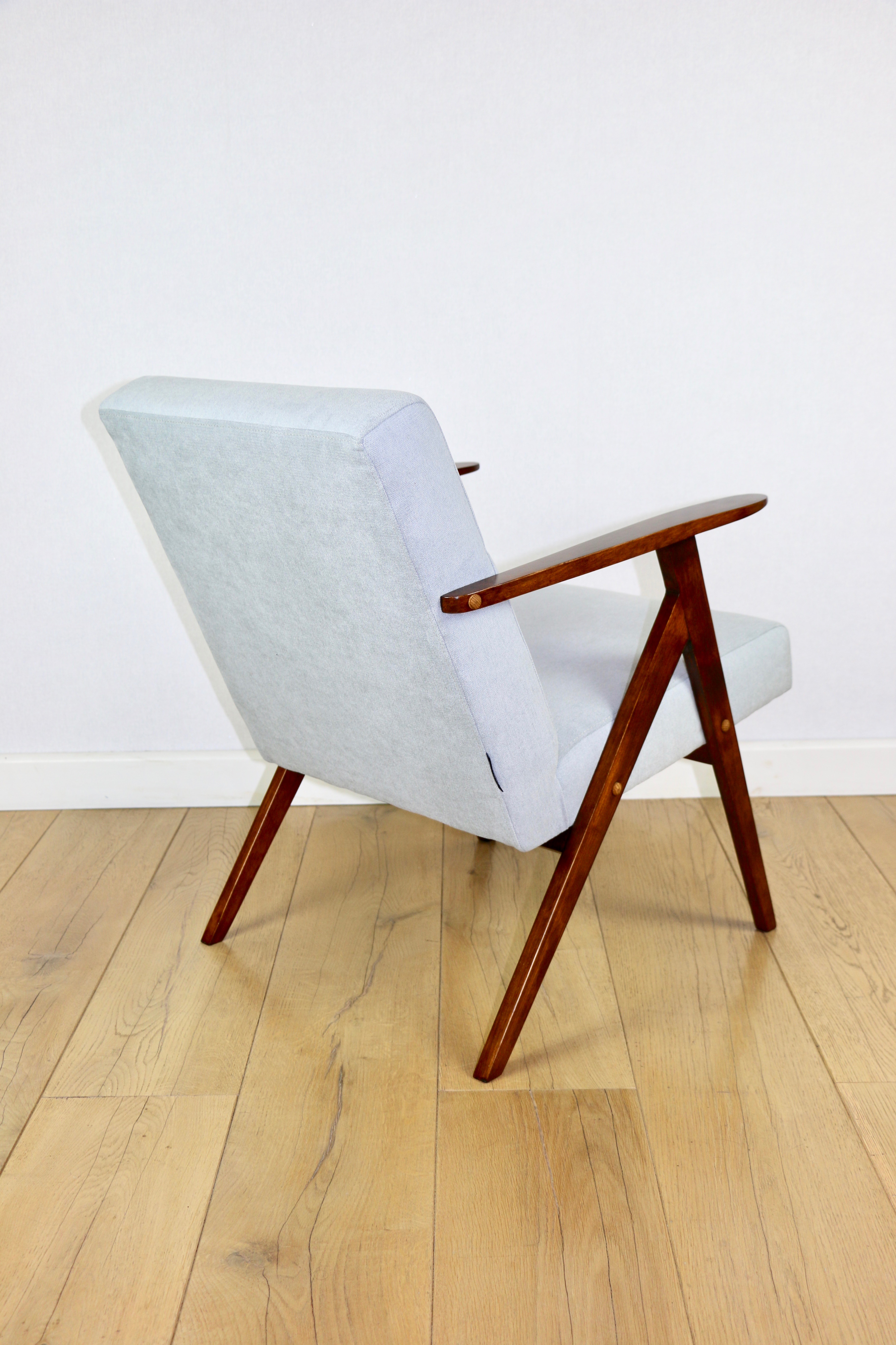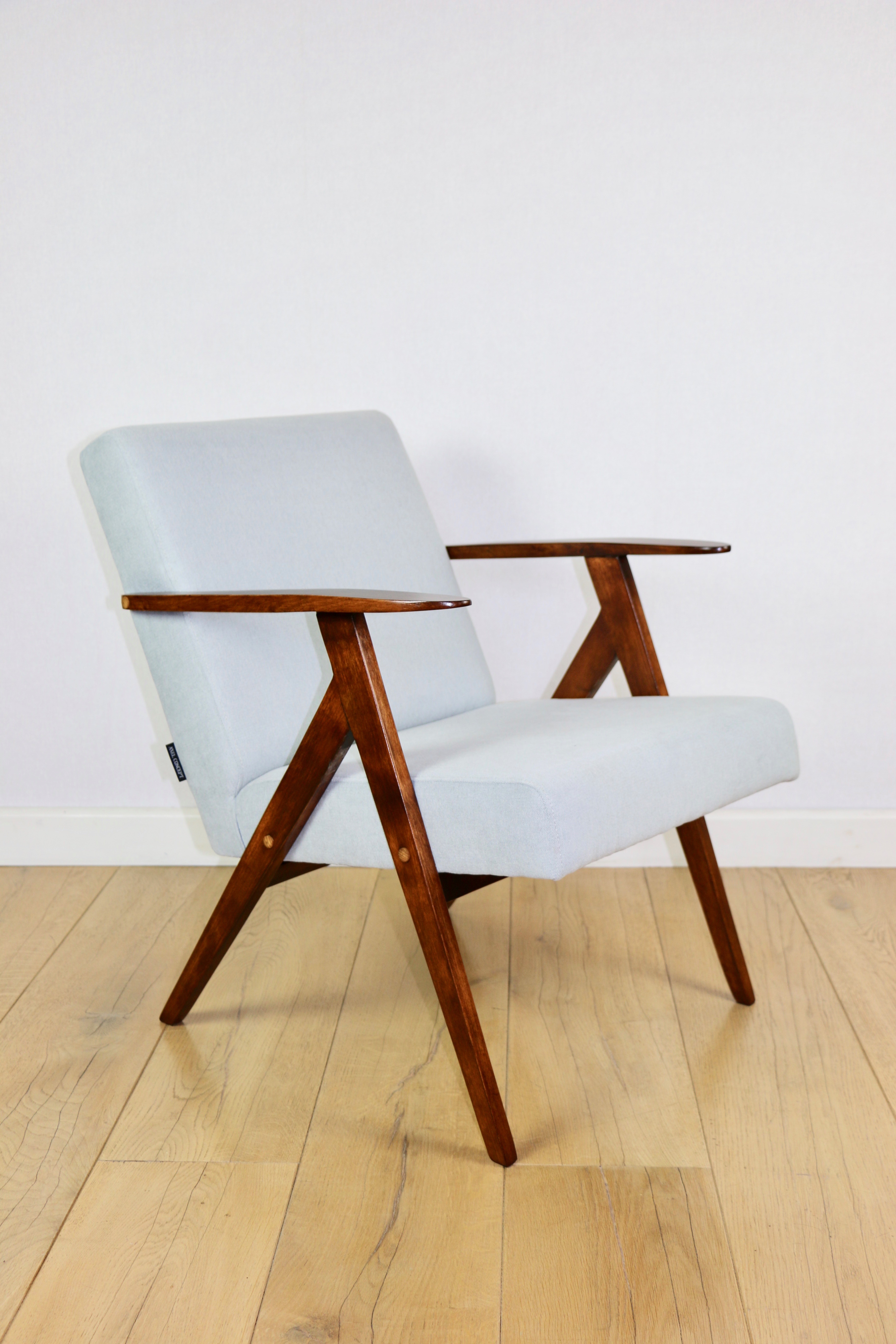 Fotel klasyczny Vintage bardzo podobny do modelu Var z lat 70 tych. Odrestaurowany, nowe obicie pokryte strukturalnym materiałem w kolorze niebiesko - turkusowym. Siedzisko bardzo wygodne, stelaż drewniany połączony z podłokietnikami w jasnej orzechowej kolorystyce drewna.