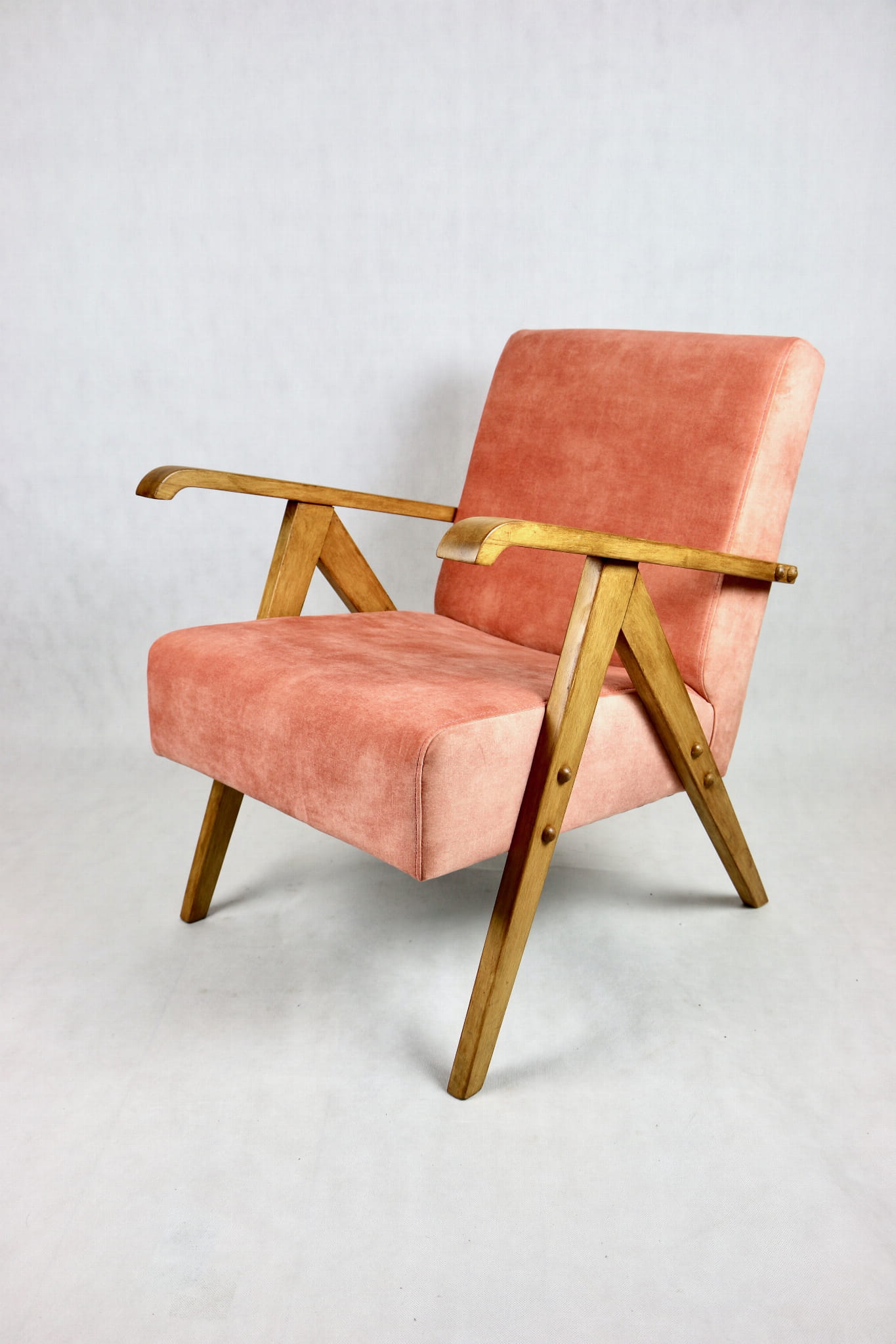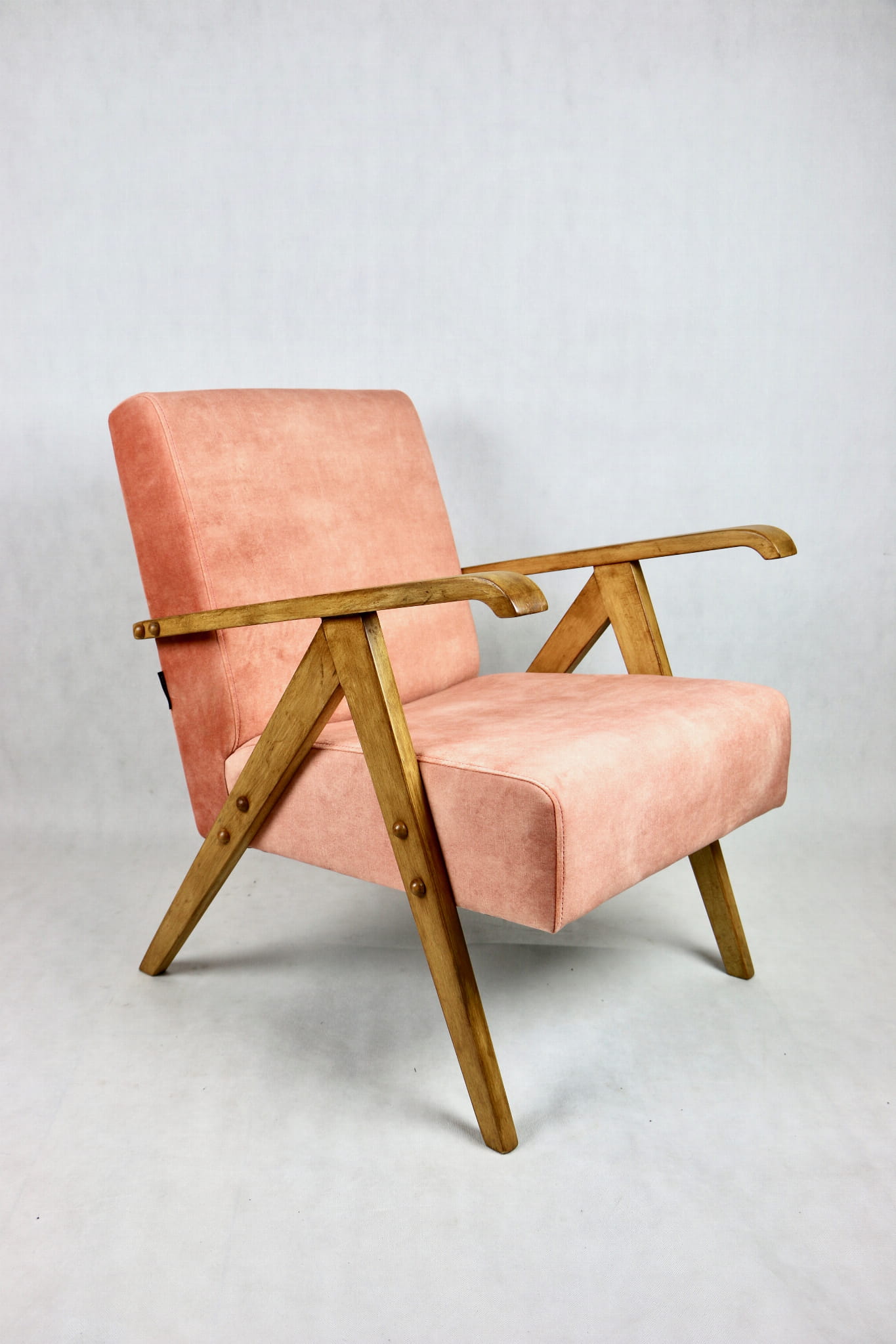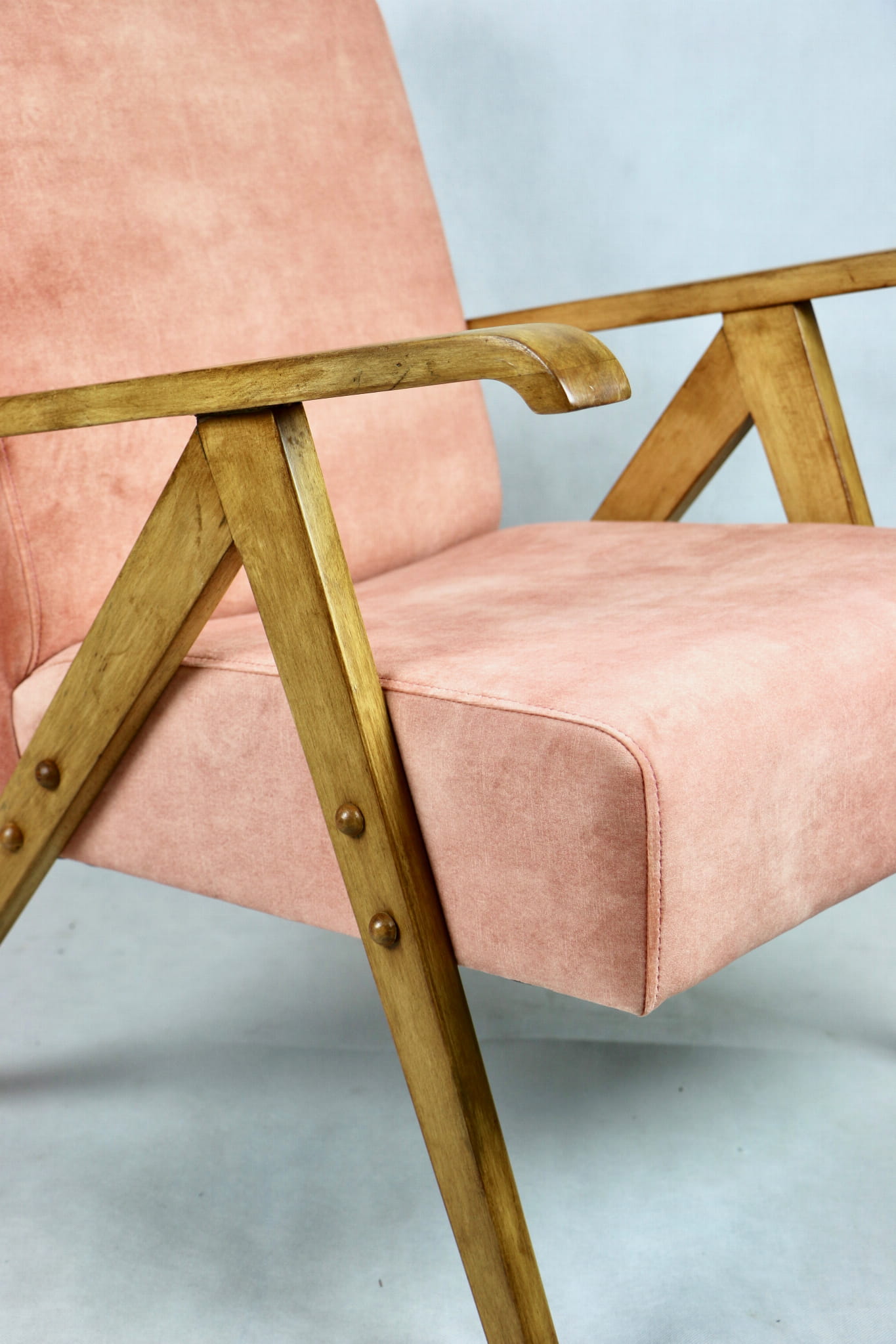 Fotel klasyczny Vintage bardzo podobny do modelu Var z lat 70 tych. Odrestaurowany, nowe obicie pokryte aksamitnym materiałem w kolorze różowym - materiał typu welwet z serii Macau. Siedzisko bardzo wygodne, stelaż drewniany połączony z podłokietnikami w jasnej naturalnej kolorystyce drewna.