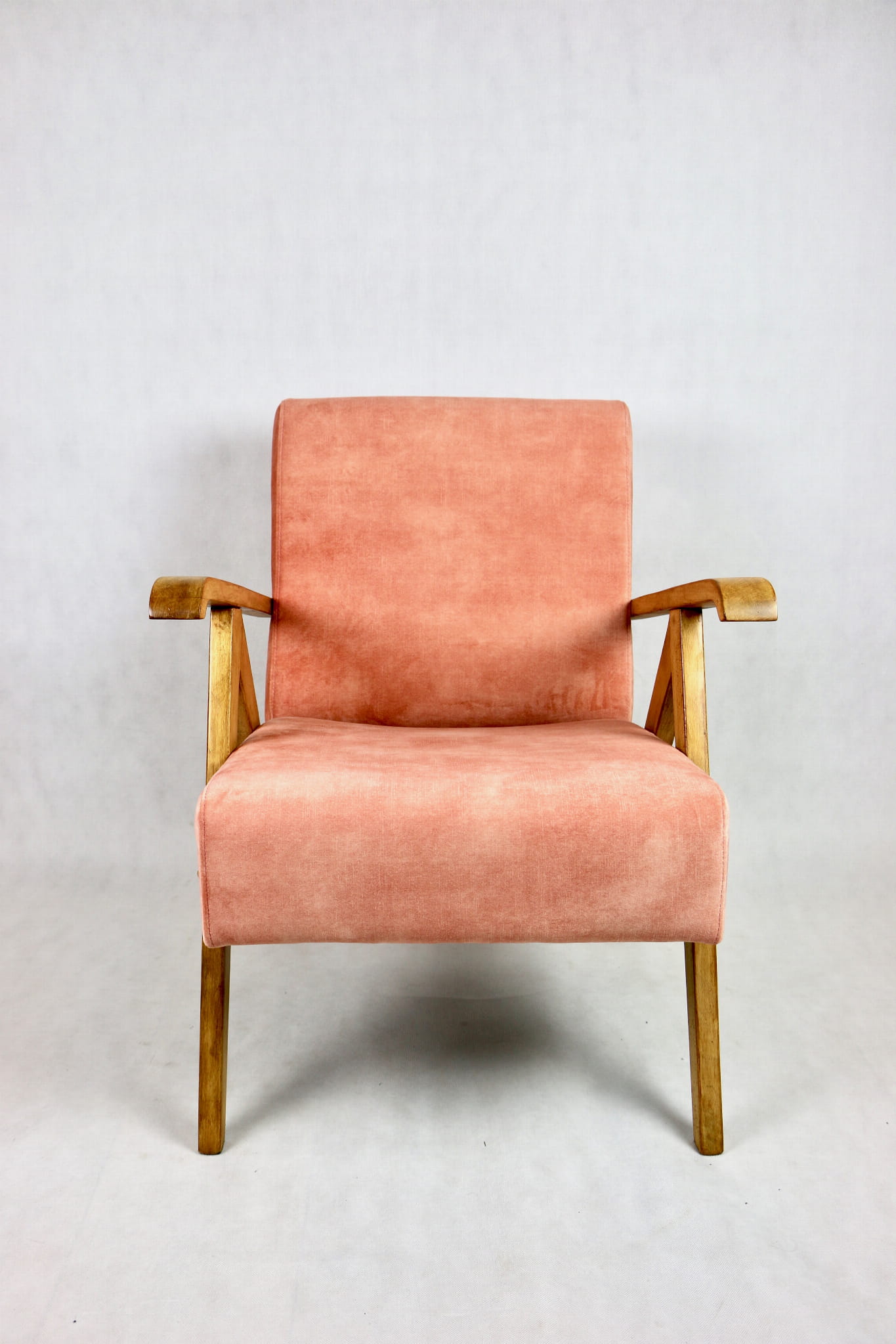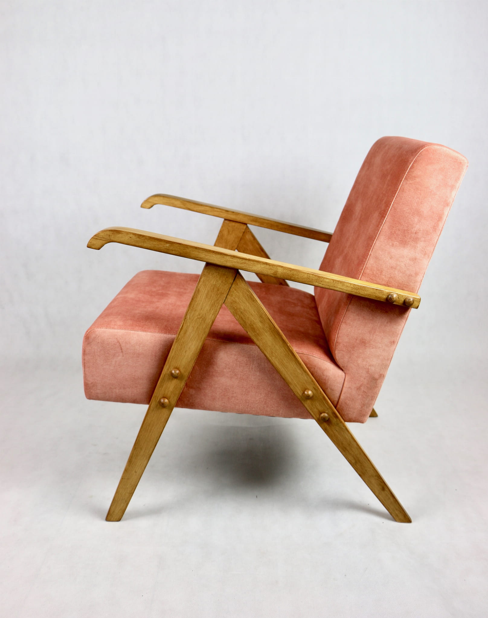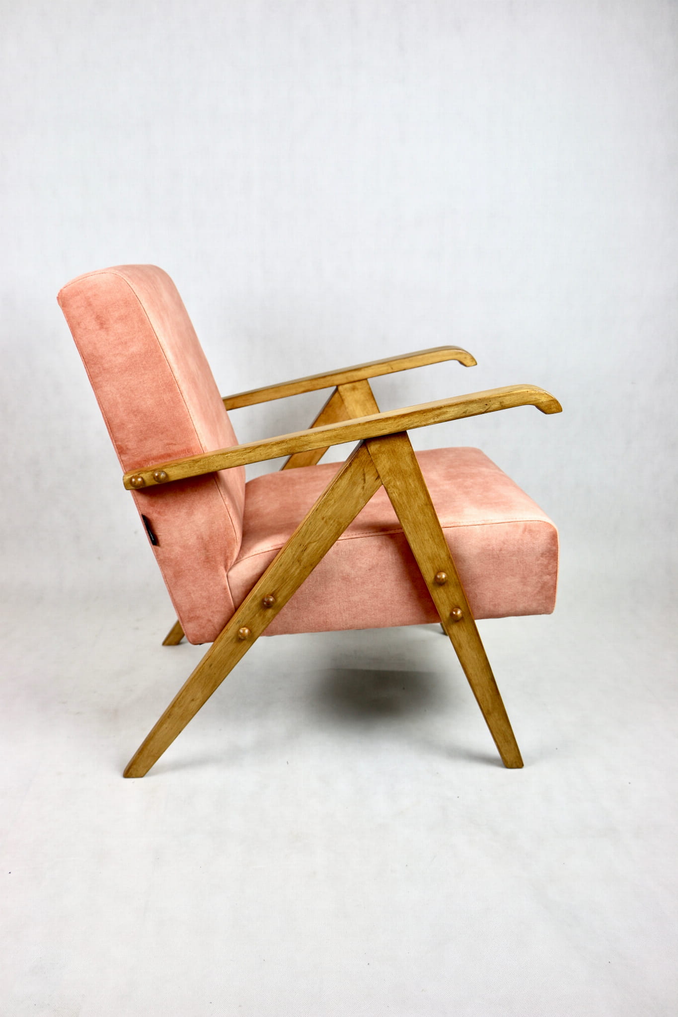 Fotel klasyczny Vintage bardzo podobny do modelu Var z lat 70 tych. Odrestaurowany, nowe obicie pokryte aksamitnym materiałem w kolorze różowym - materiał typu welwet z serii Macau. Siedzisko bardzo wygodne, stelaż drewniany połączony z podłokietnikami w jasnej naturalnej kolorystyce drewna.