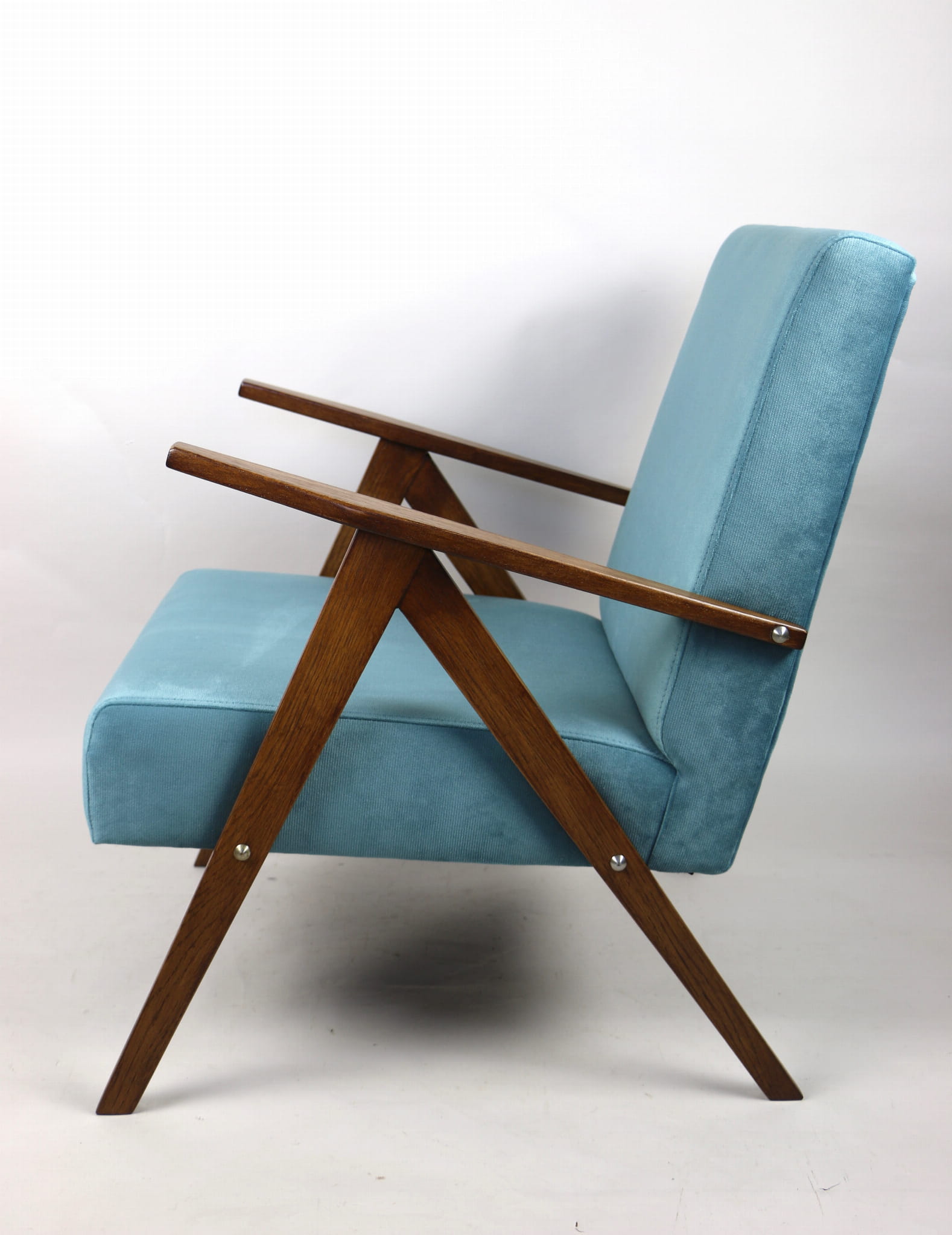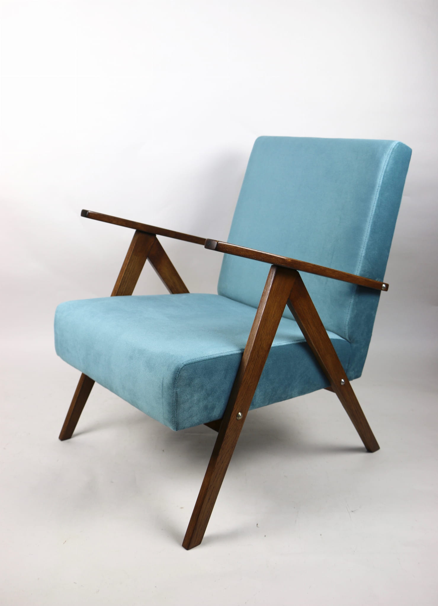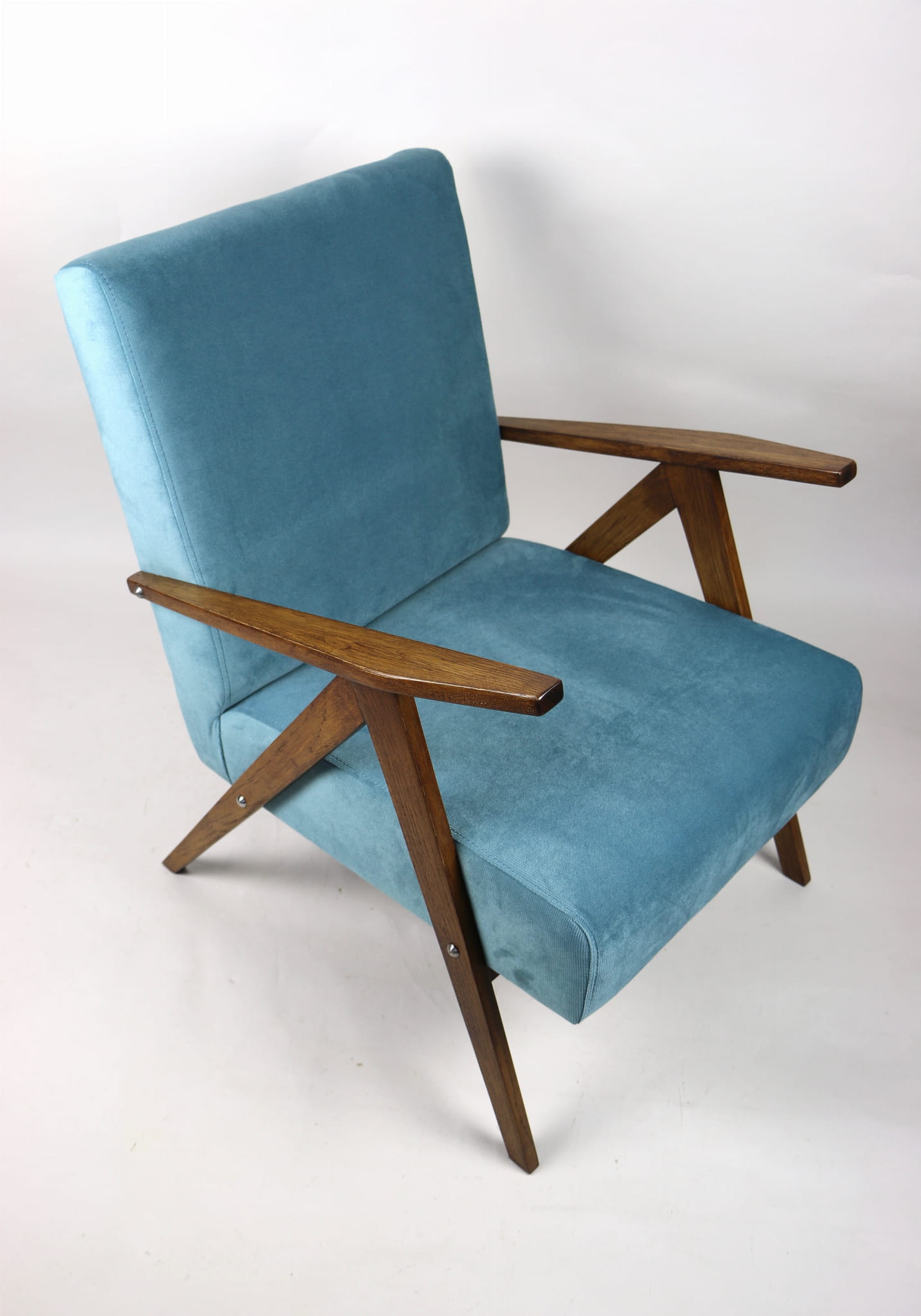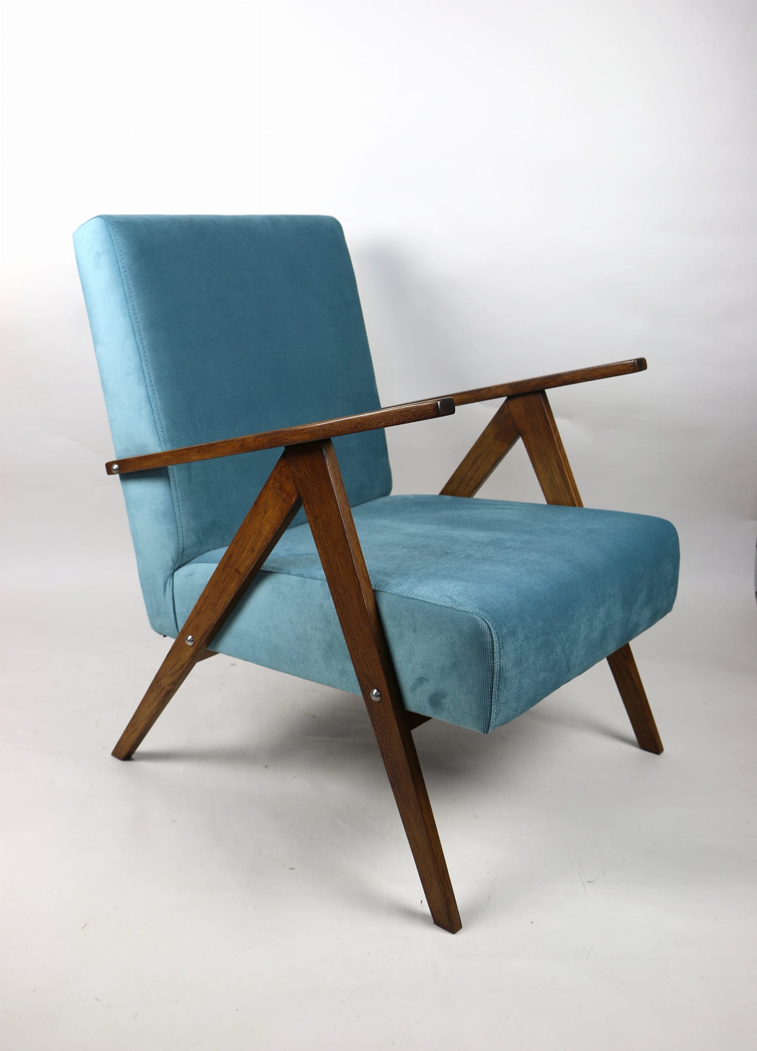 Fotel klasyczny Vintage bardzo podobny jak Var z lat 70 tych. Całkowicie odrestaurowany, nowe obicie pokryte materiałem w kolorze turkusowym - materiał welwet typu strukturalnego. Siedzisko bardzo wygodne, stelaż drewniany dębowy połączony z podłokietnikami w dębowej kolorystyce drewna.