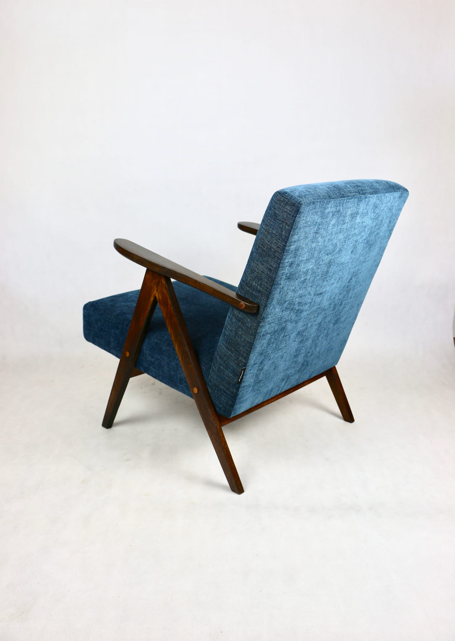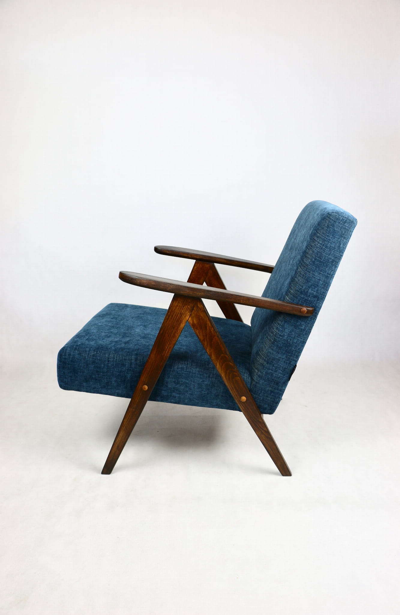 Fotel klasyczny Vintage bardzo podobny do modelu Var B-310 z lat 70 tych. Całkowicie odrestaurowany, nowe obicie pokryte materiałem w kolorze niebieskim / navy blue- jest to tkanina tapicerska typu strukturalnego, która wyglada jak jeans. Siedzisko bardzo wygodne na pasach , stelaż drewniany połączony z podłokietnikami w ciemnej kolorystyce drewna.