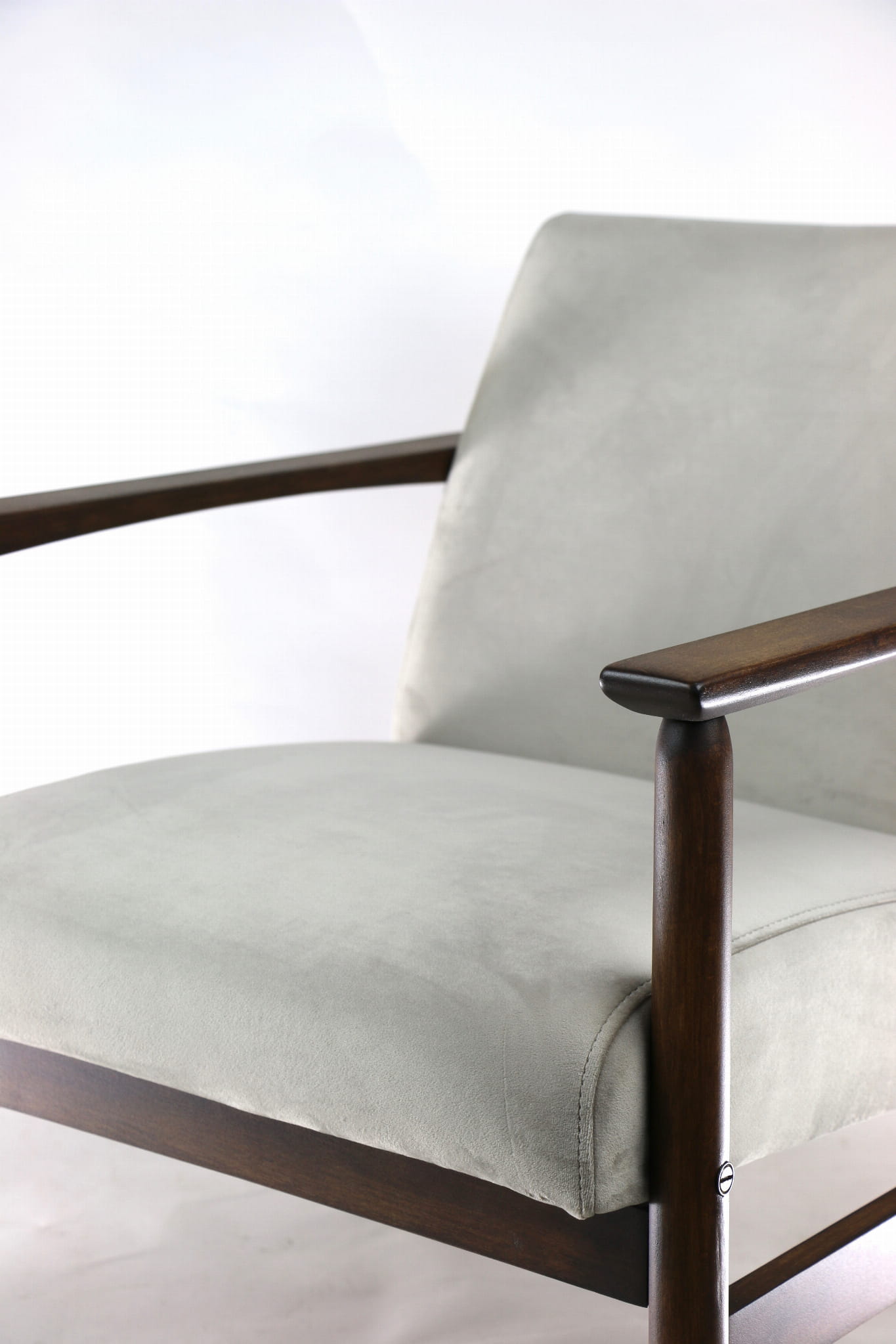 Odrestaurowany fotel Vintage z roku 1970, nowe strukturalne obicie w tkaninie typu welwet w kolorze beżowym. Stelaż drewniany połączony z podłokietnikami w ciemnej kolorystyce drewna.