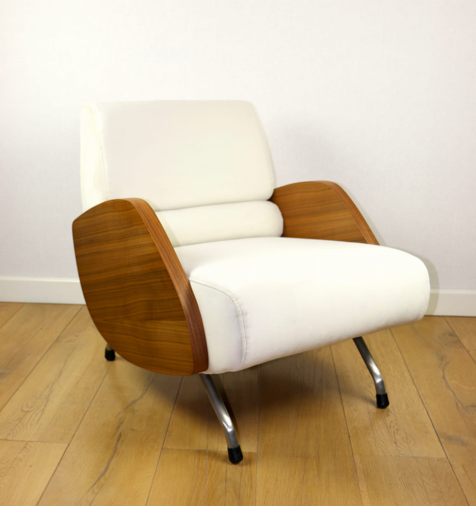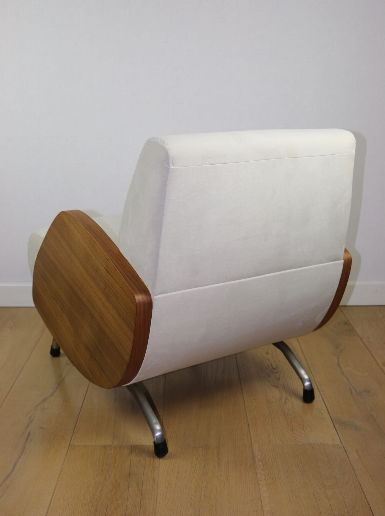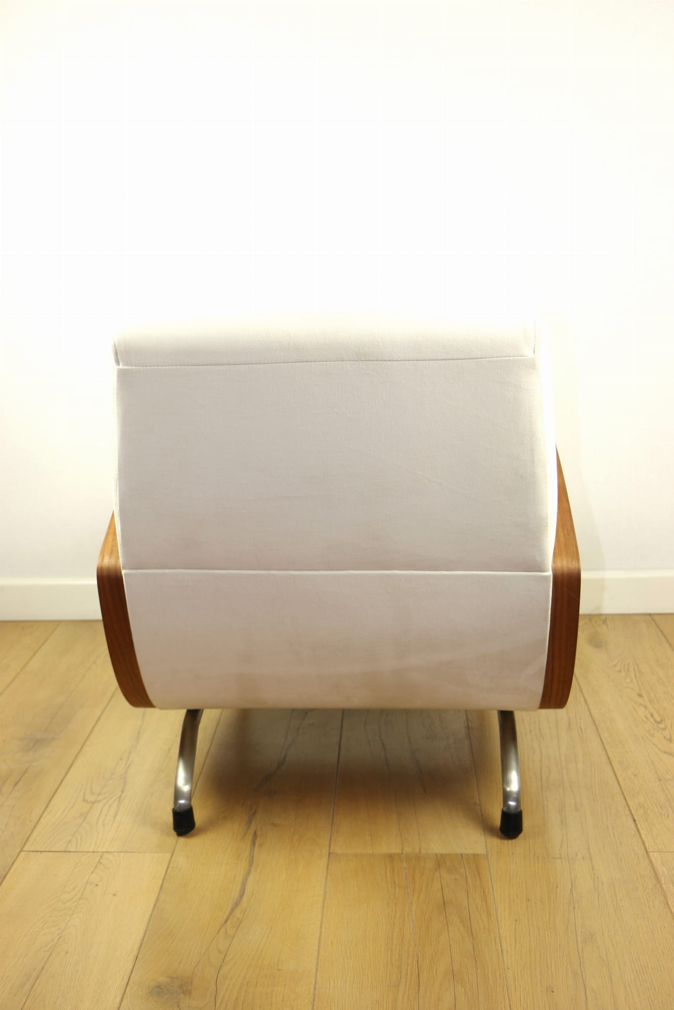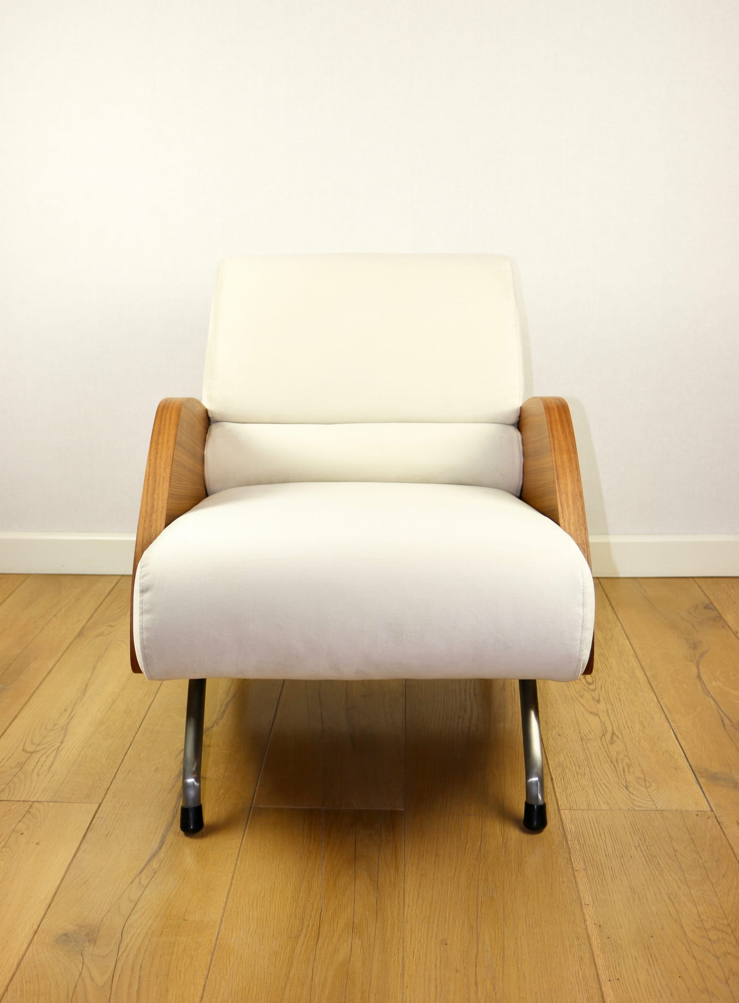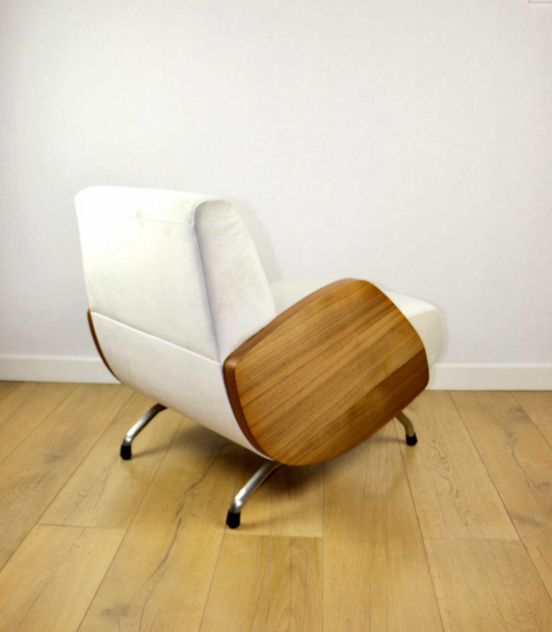 Fotel Vintage projektu Janusza Różańskiego odrestaurowany w kolorze kremowym z lat 60-tych w stylu vintage, po całkowitej renowacji - nowa tapicerka z bardzo ładnej tkaniny welwetowej w kolorze kremowym.
