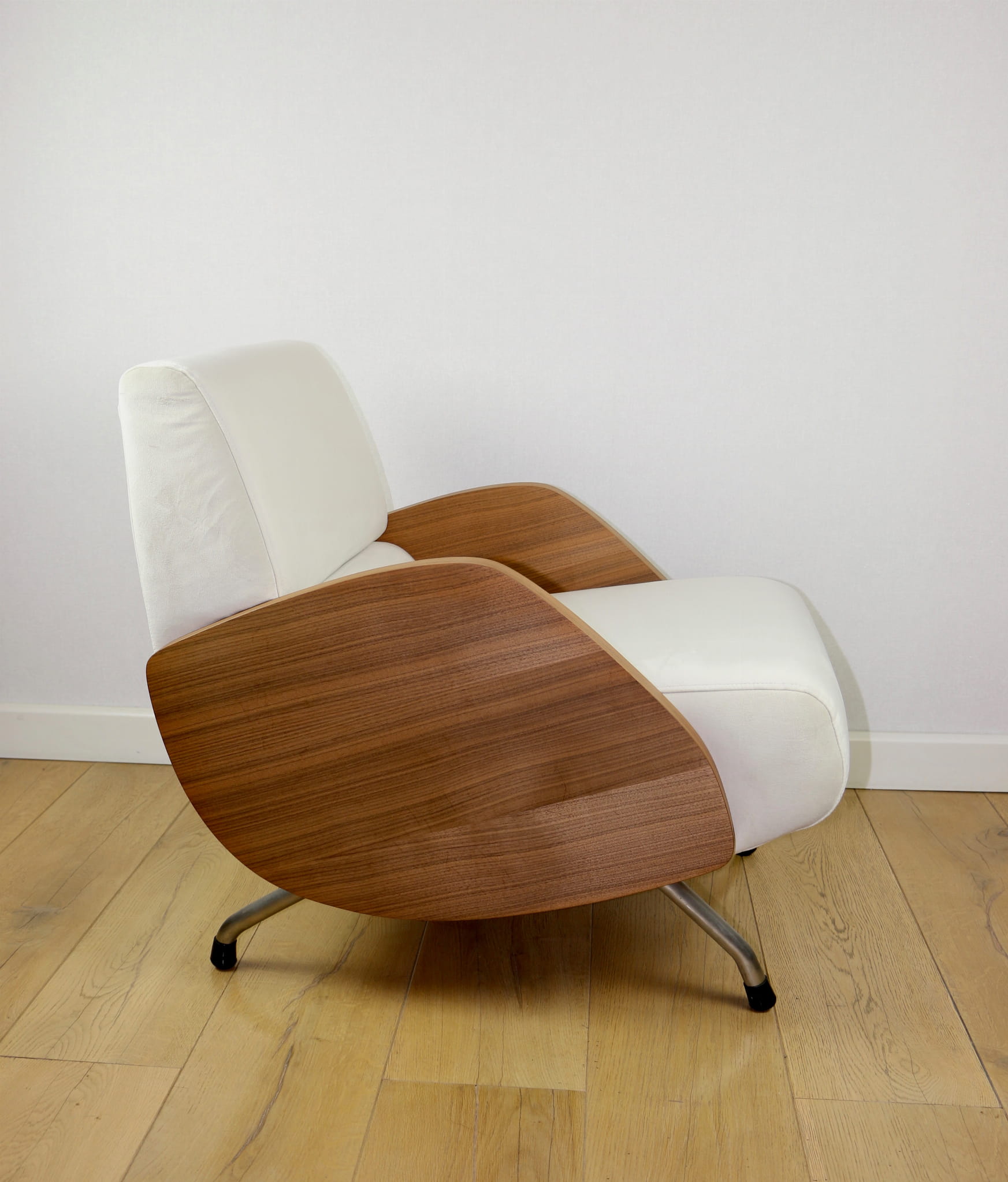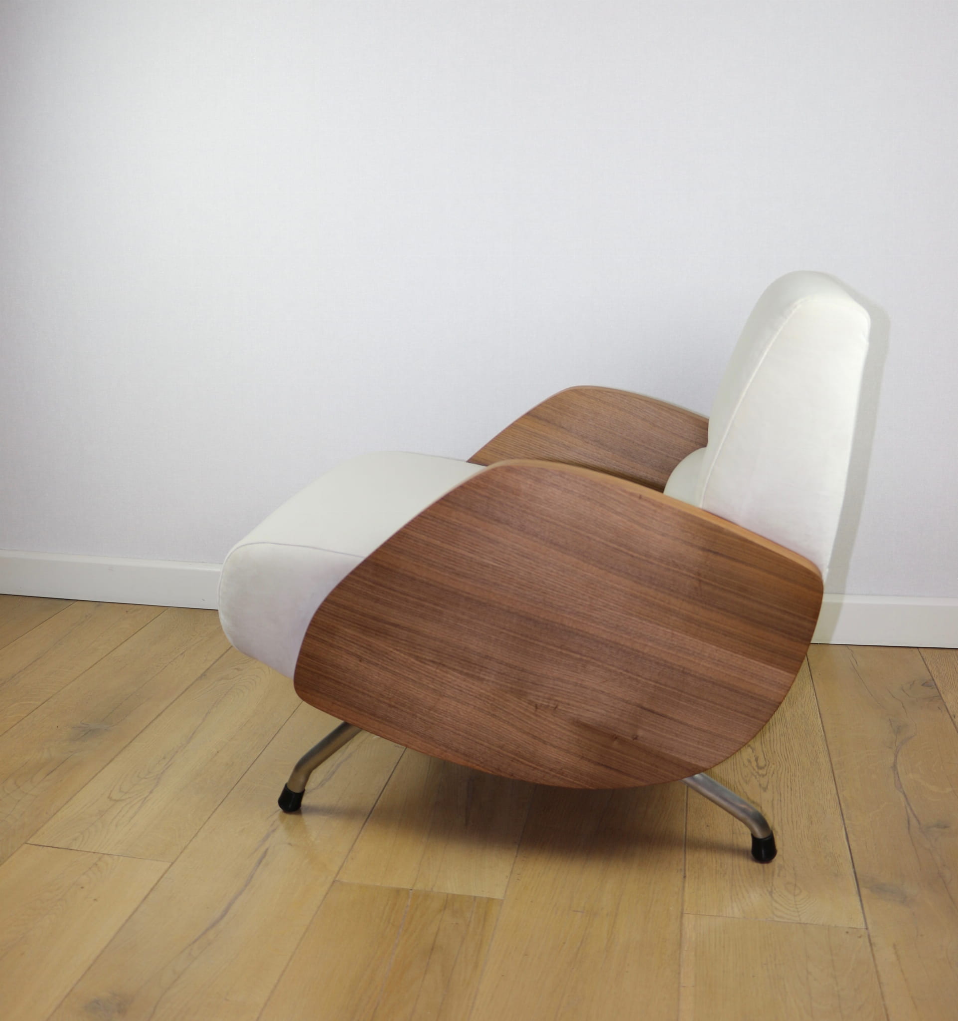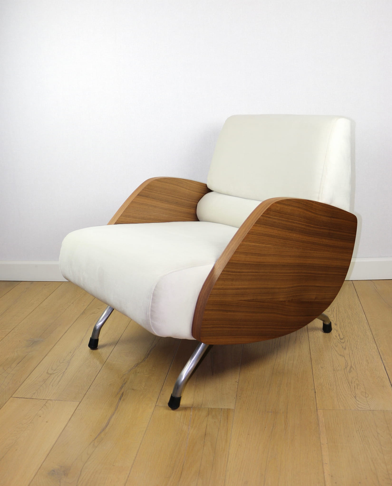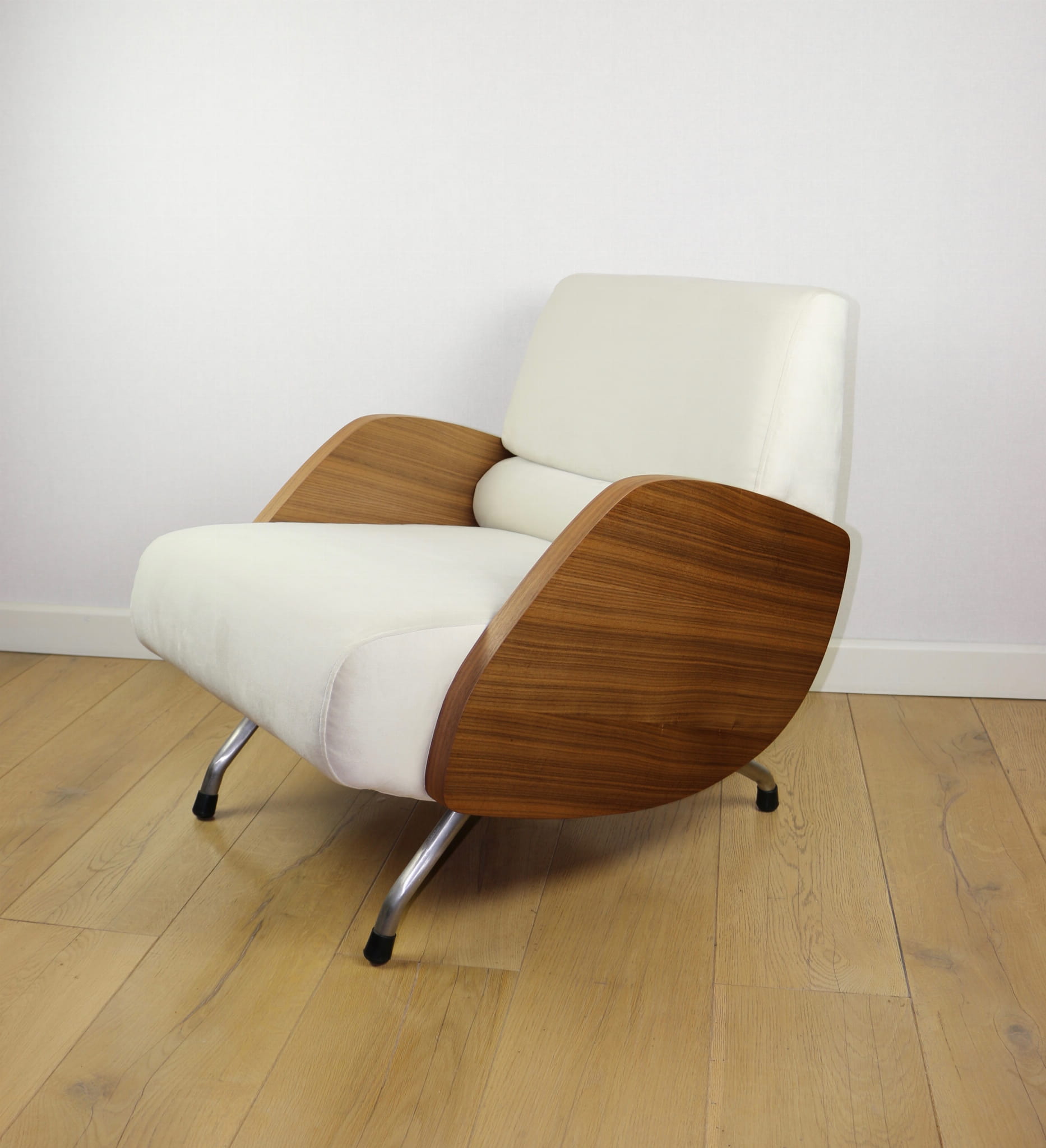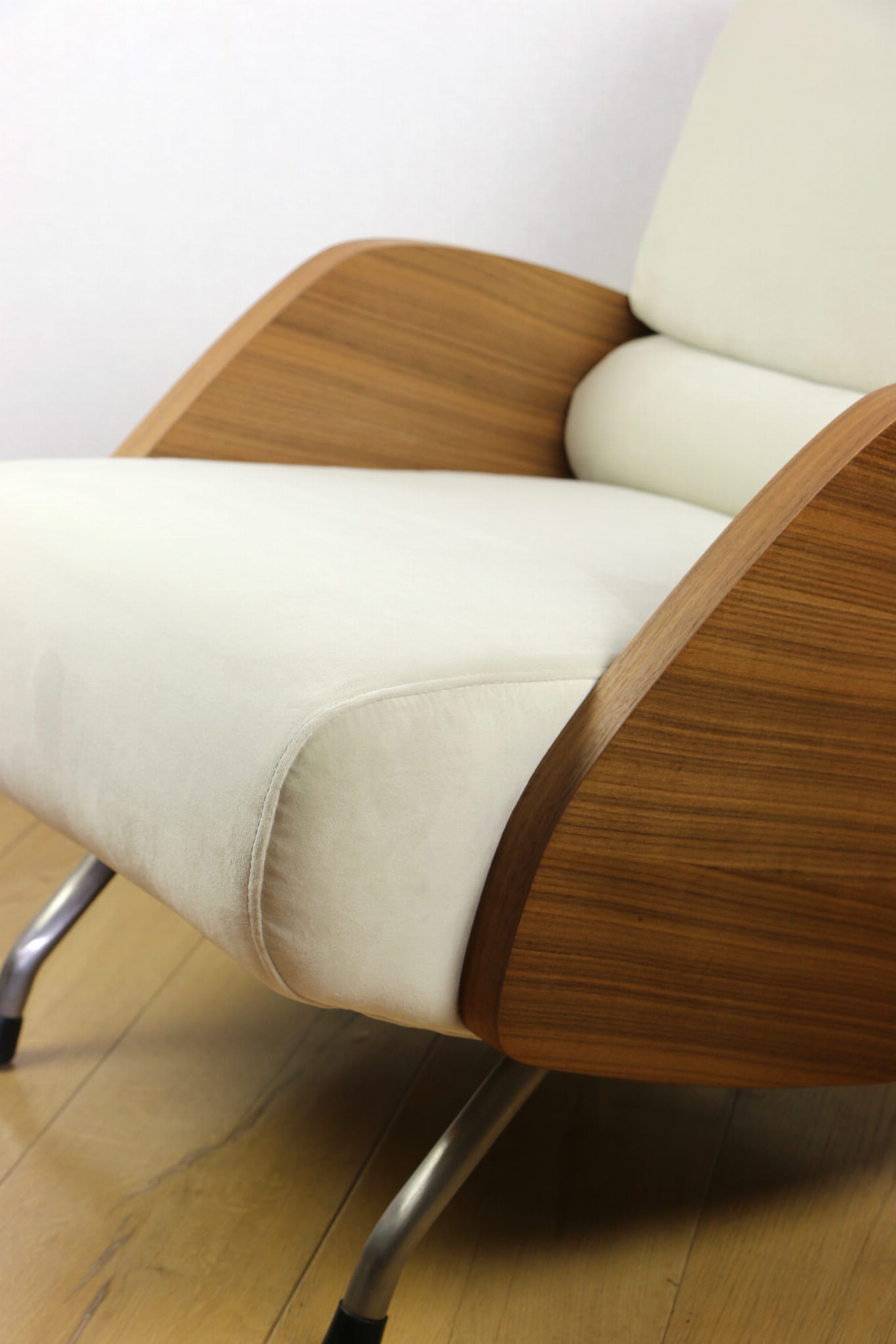Fotel Vintage projektu Janusza Różańskiego odrestaurowany w kolorze kremowym z lat 60-tych w stylu vintage, po całkowitej renowacji - nowa tapicerka z bardzo ładnej tkaniny welwetowej w kolorze kremowym.