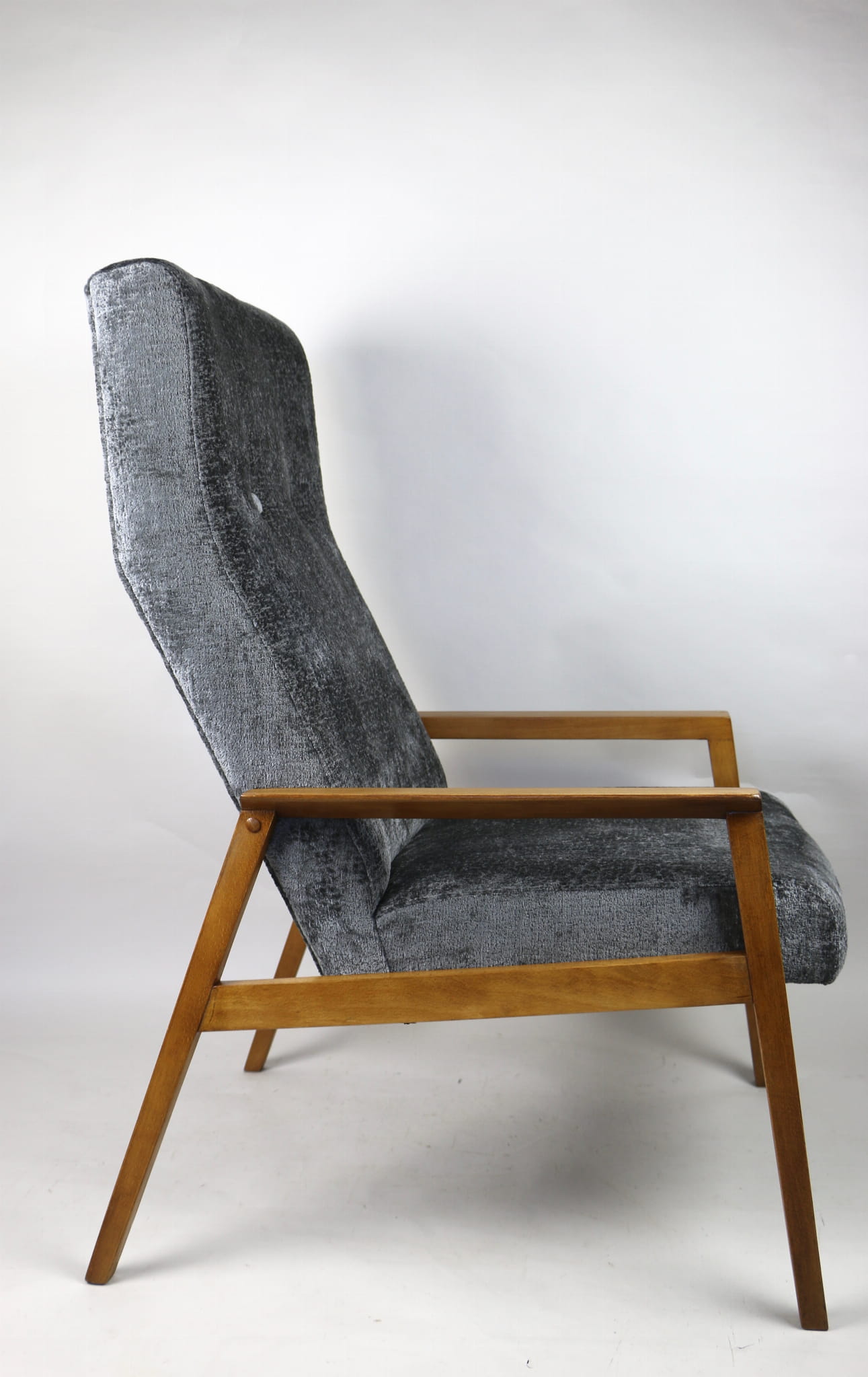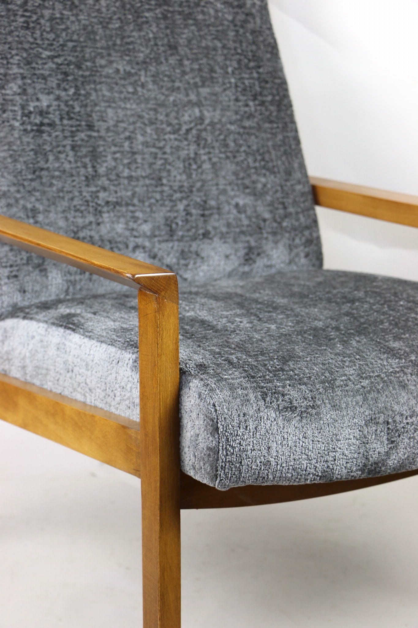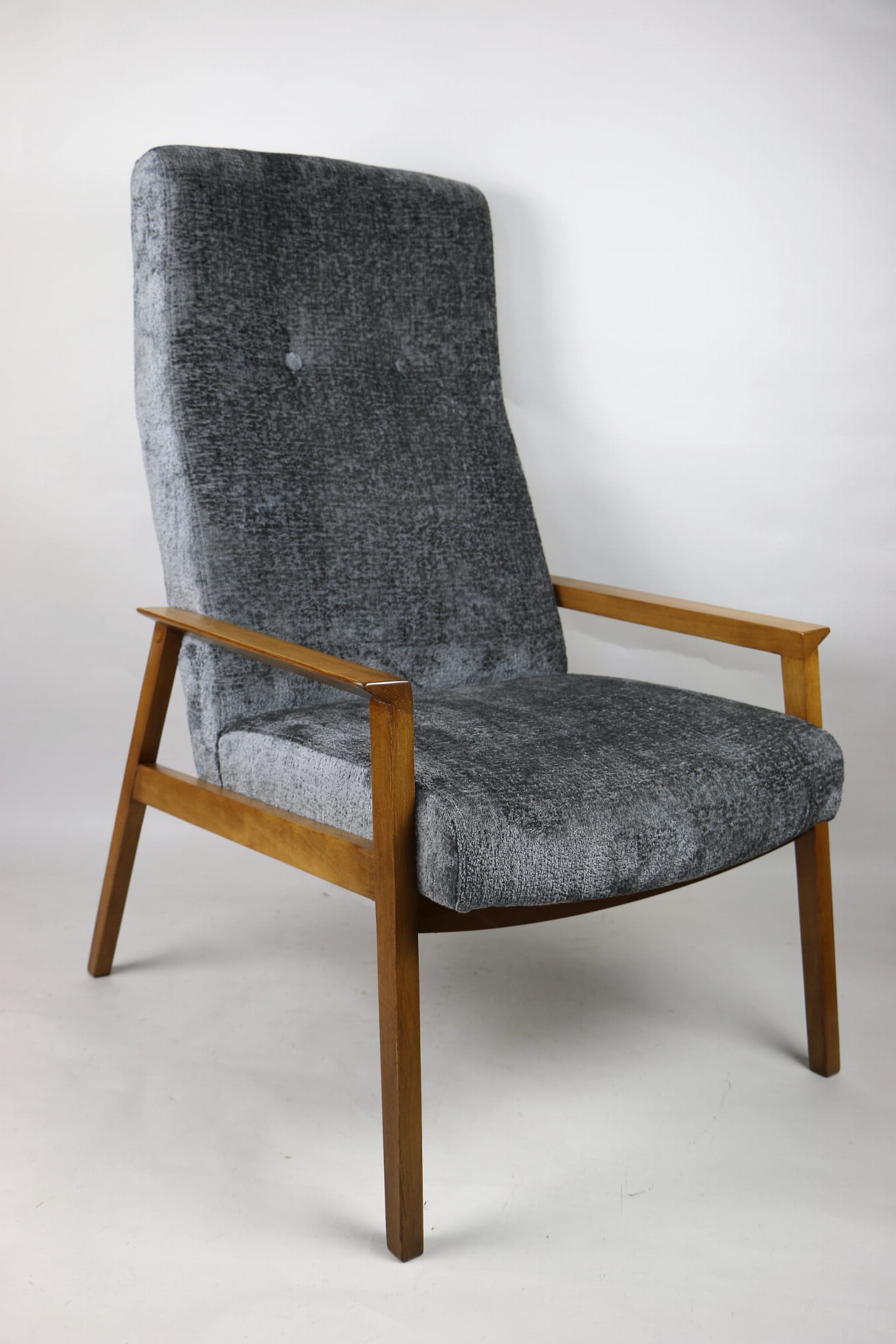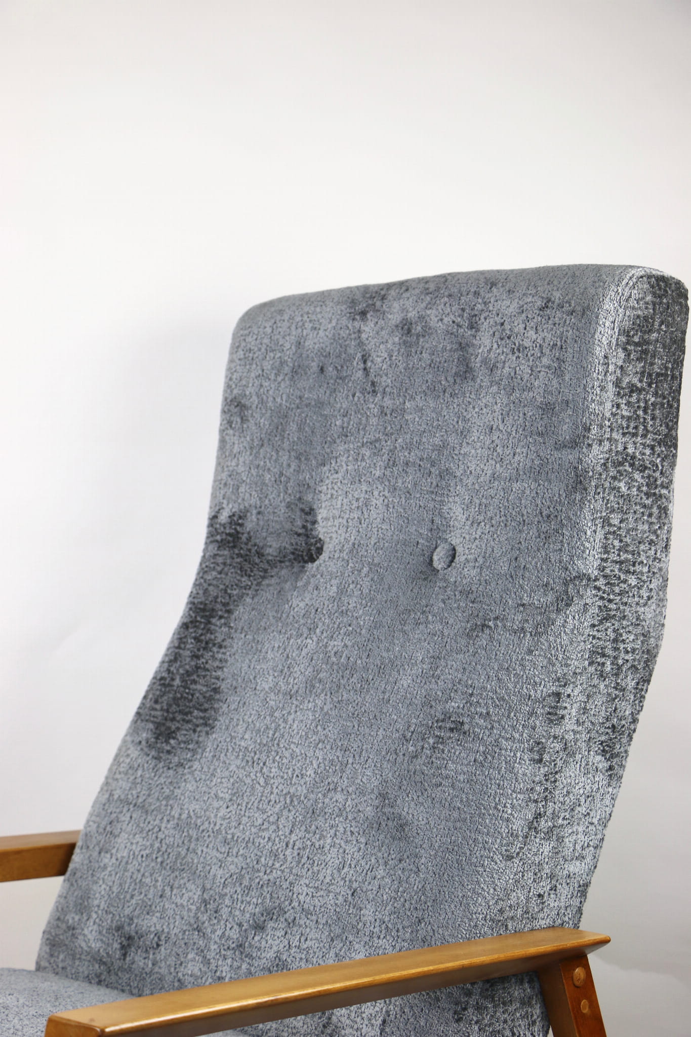 Fotel klasyczny Vintage bardzo wysoki z lat 70 tych na sprężynach. Odrestaurowane, nowe obicie pokryte aksamitnym materiałem w kolorze szarym - materiał typu welwet z serii Bergen. Siedzisko bardzo wygodne, stelaż drewniany połączony z podłokietnikami w naturalnej kolorystyce drewna.