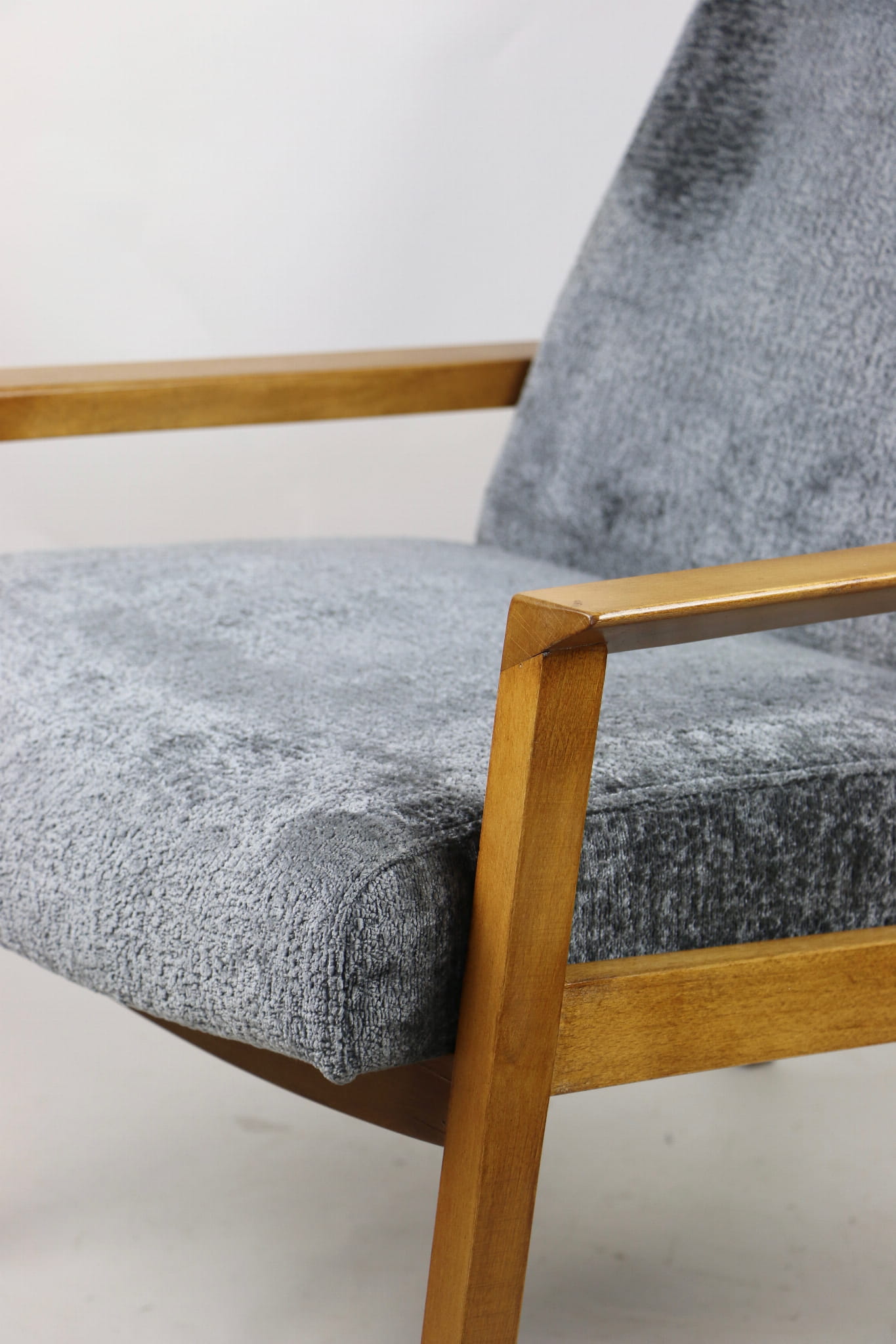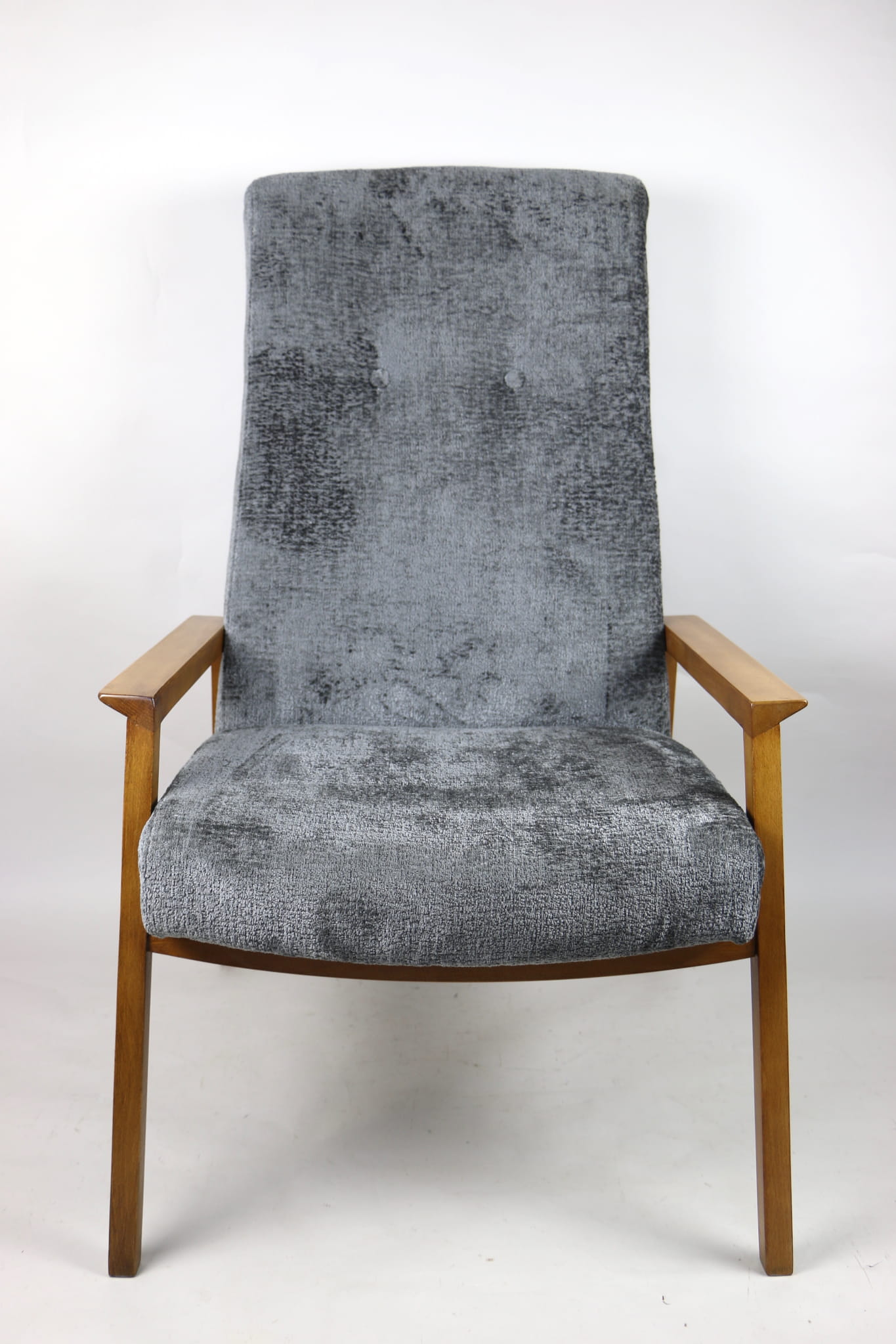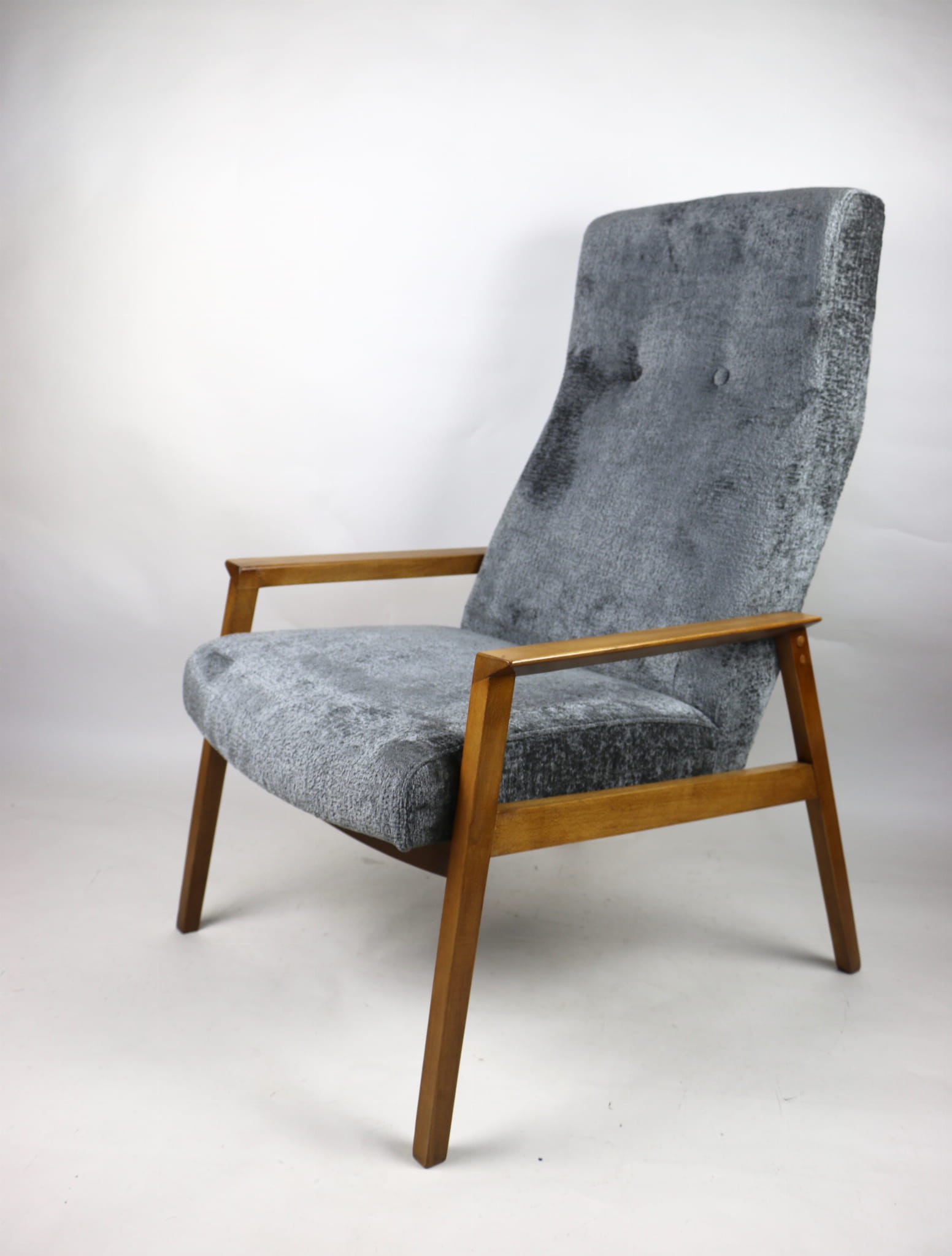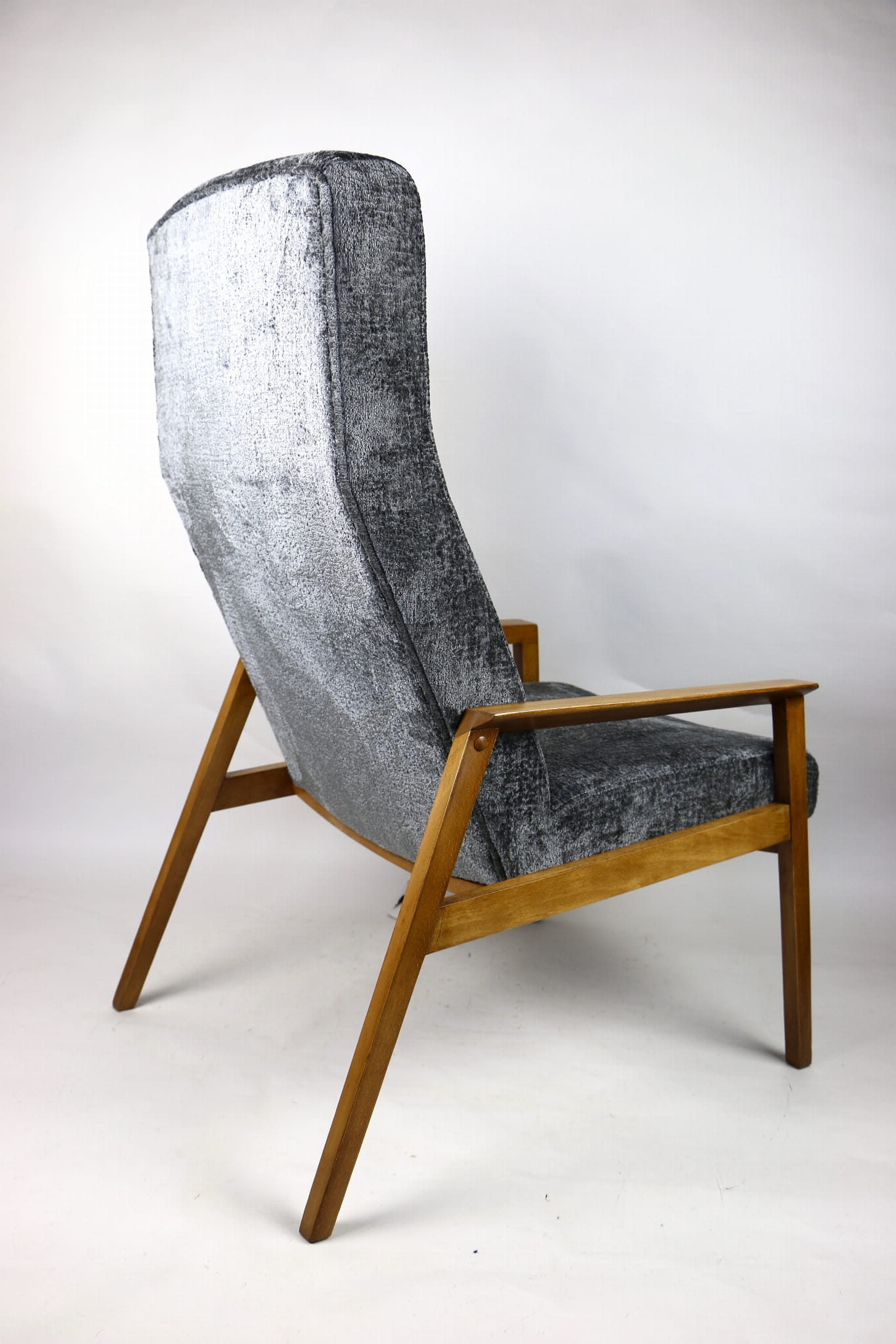 Fotel klasyczny Vintage bardzo wysoki z lat 70 tych na sprężynach. Odrestaurowane, nowe obicie pokryte aksamitnym materiałem w kolorze szarym - materiał typu welwet z serii Bergen. Siedzisko bardzo wygodne, stelaż drewniany połączony z podłokietnikami w naturalnej kolorystyce drewna.