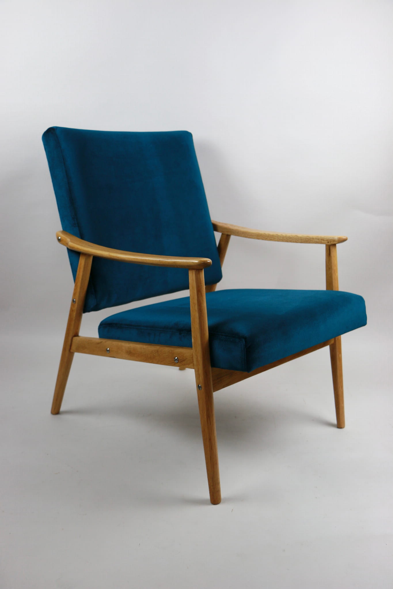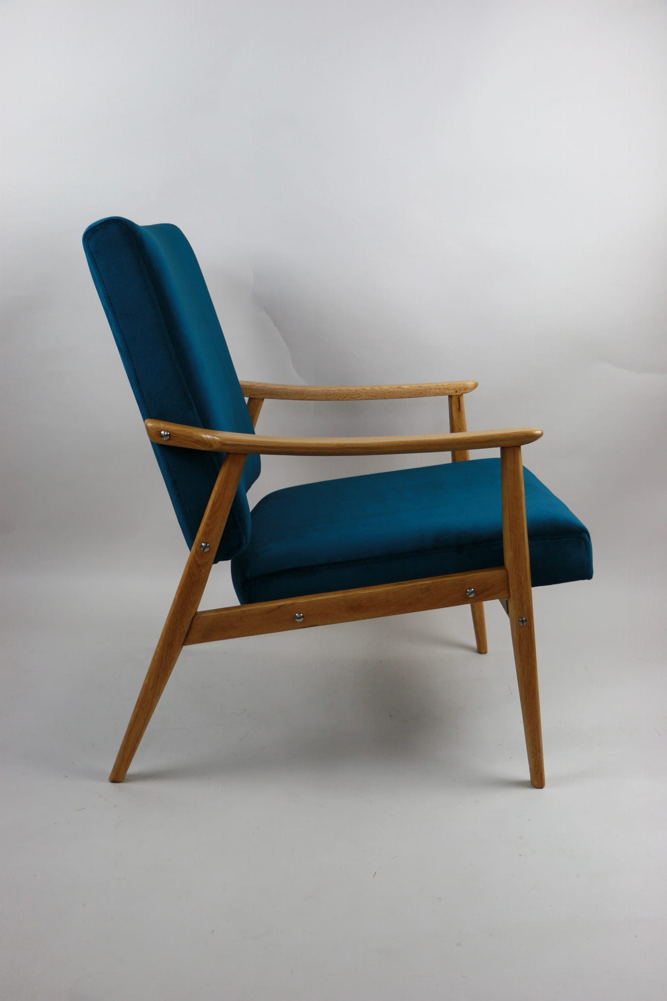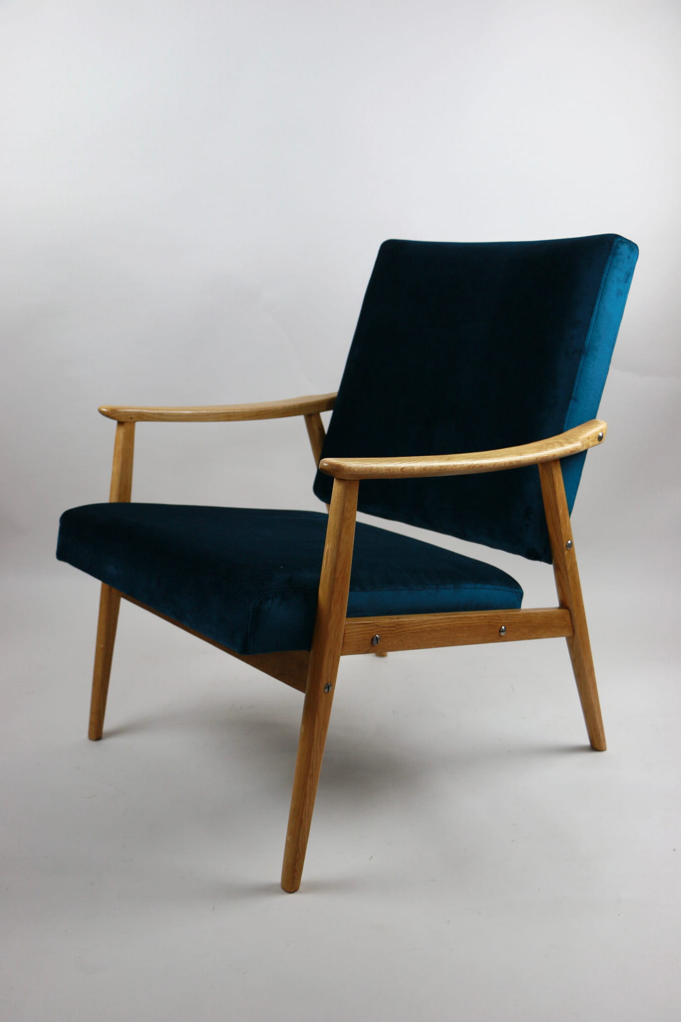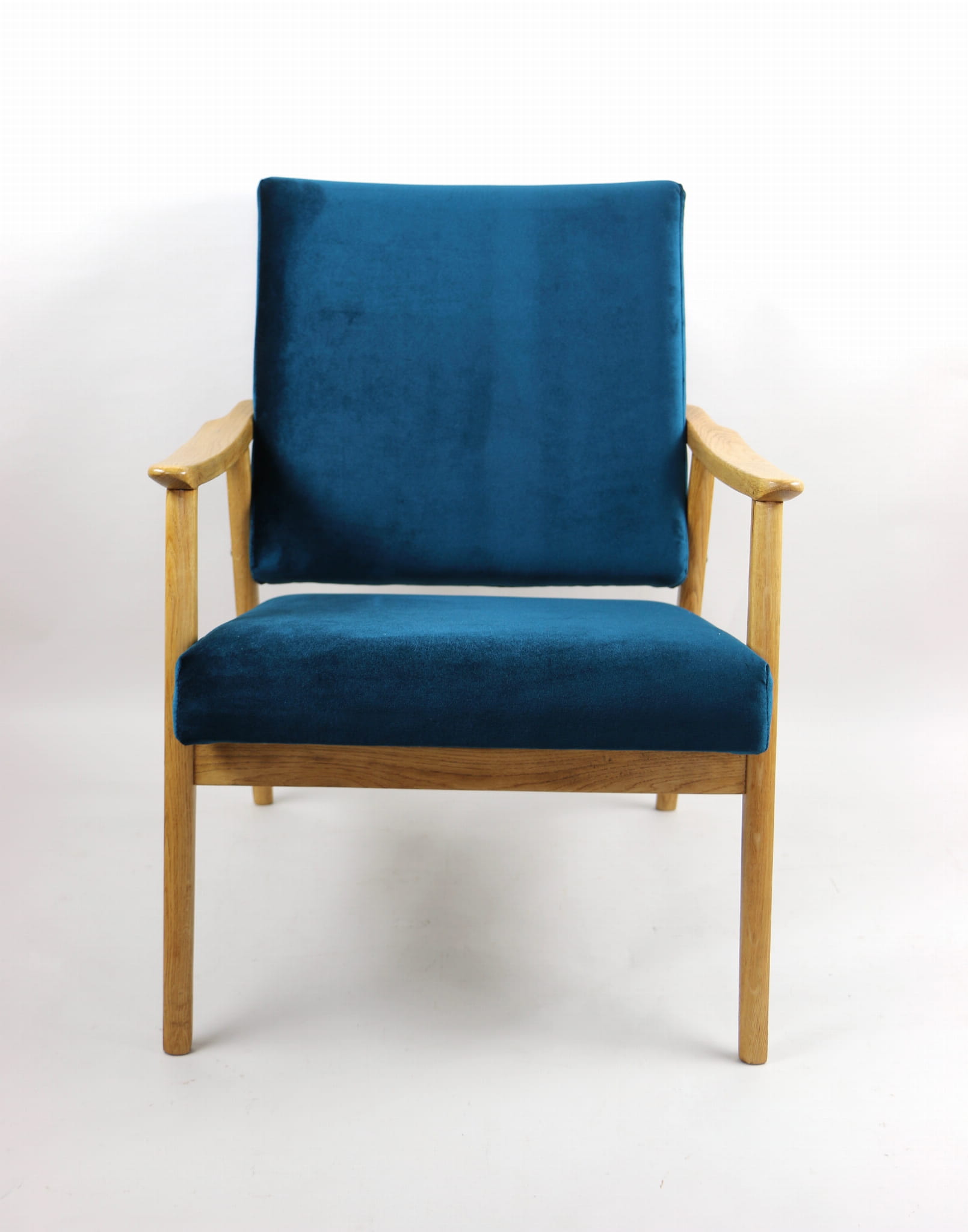 Fotel klasyczny Vintage z lat 70 tych. Odrestaurowany, nowe obicie pokryte aksamitnym materiałem w kolorze zielono- morskim - materiał typu welwet. Siedzisko bardzo wygodne, stelaż drewniany połączony z podłokietnikami w jasnej kolorystyce drewna dębowego - drewno dębowe. Wymiary wysokość : 78 cm, szerokość : 60 cm, szerokość siedziska: 47 cm, głębokość siedziska: 46 cm, głębokość mebla: 69 cm, wysokość siedziska: 37 cm, wysokość podłokietnika:51 cm