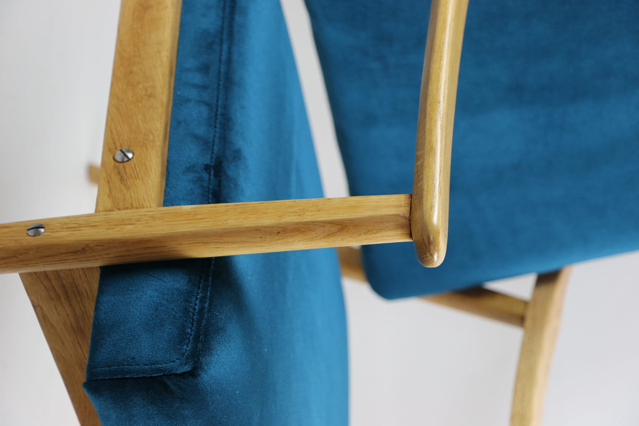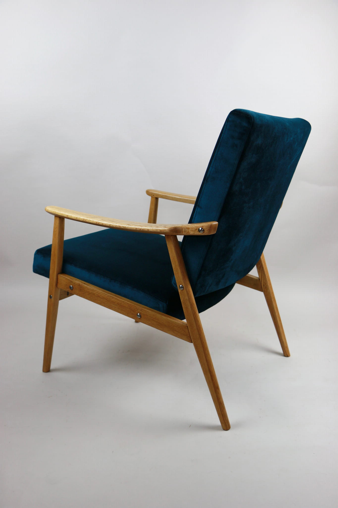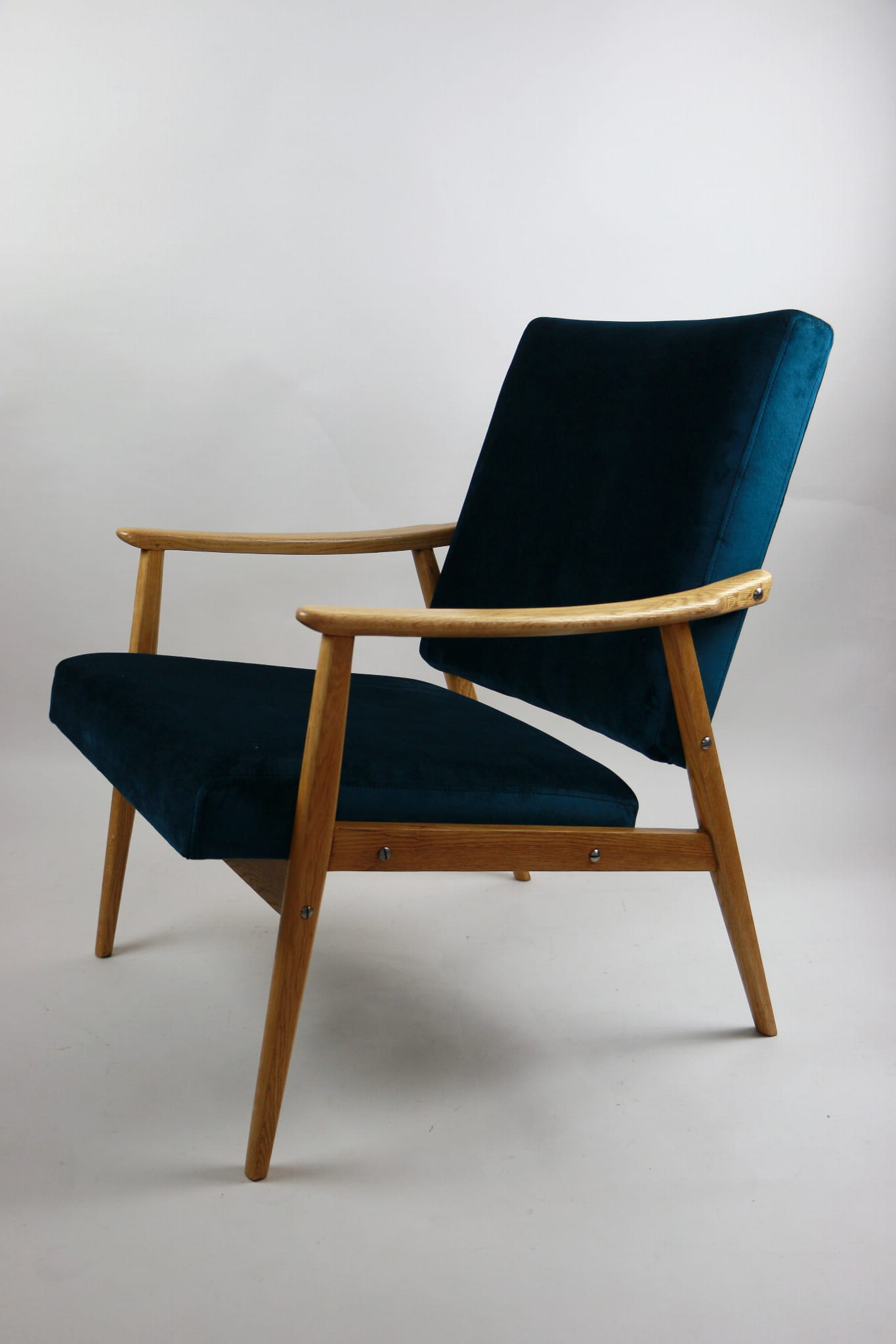 Fotel klasyczny Vintage z lat 70 tych. Odrestaurowany, nowe obicie pokryte aksamitnym materiałem w kolorze zielono- morskim - materiał typu welwet. Siedzisko bardzo wygodne, stelaż drewniany połączony z podłokietnikami w jasnej kolorystyce drewna dębowego - drewno dębowe. Wymiary wysokość : 78 cm, szerokość : 60 cm, szerokość siedziska: 47 cm, głębokość siedziska: 46 cm, głębokość mebla: 69 cm, wysokość siedziska: 37 cm, wysokość podłokietnika:51 cm