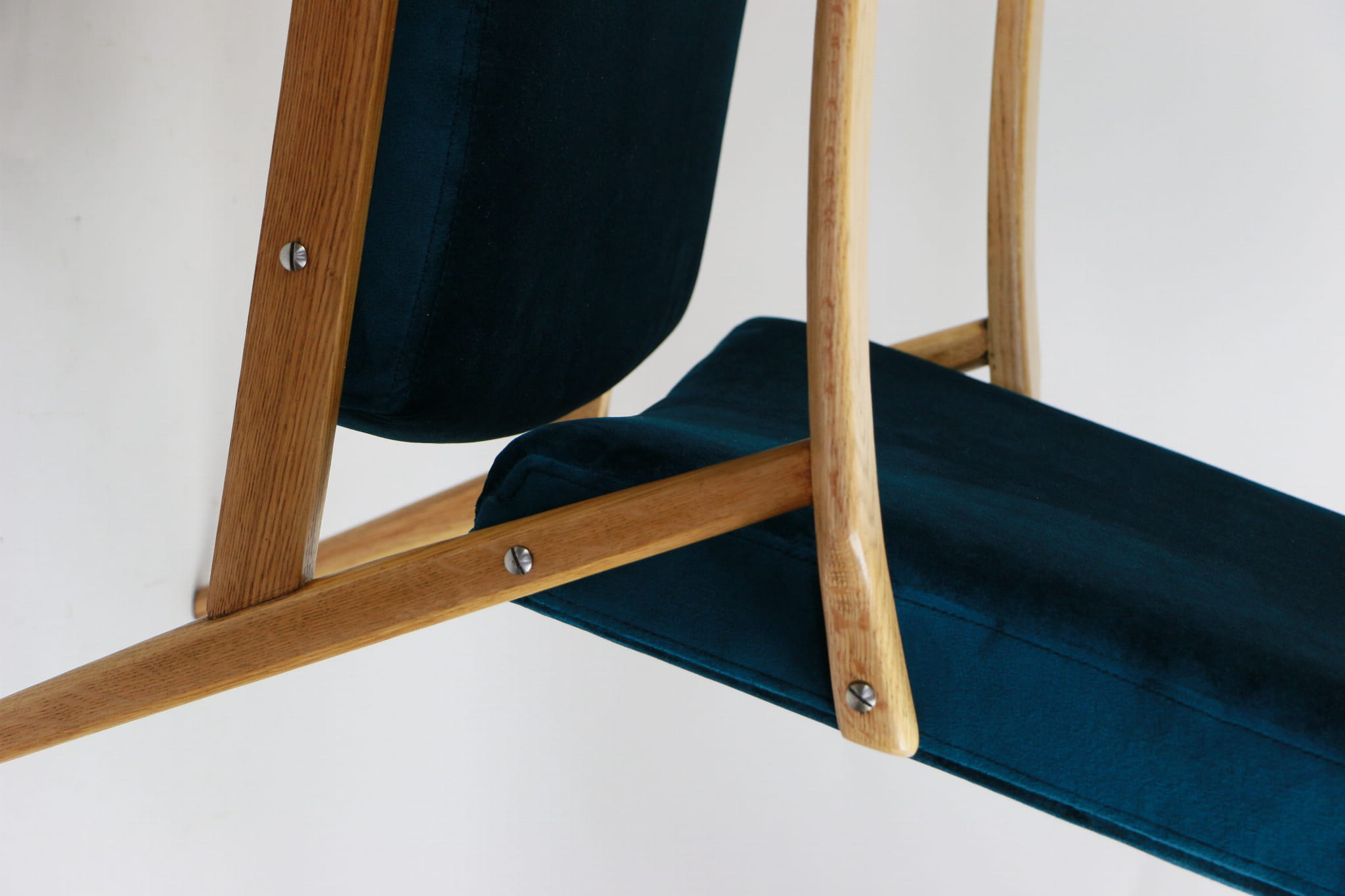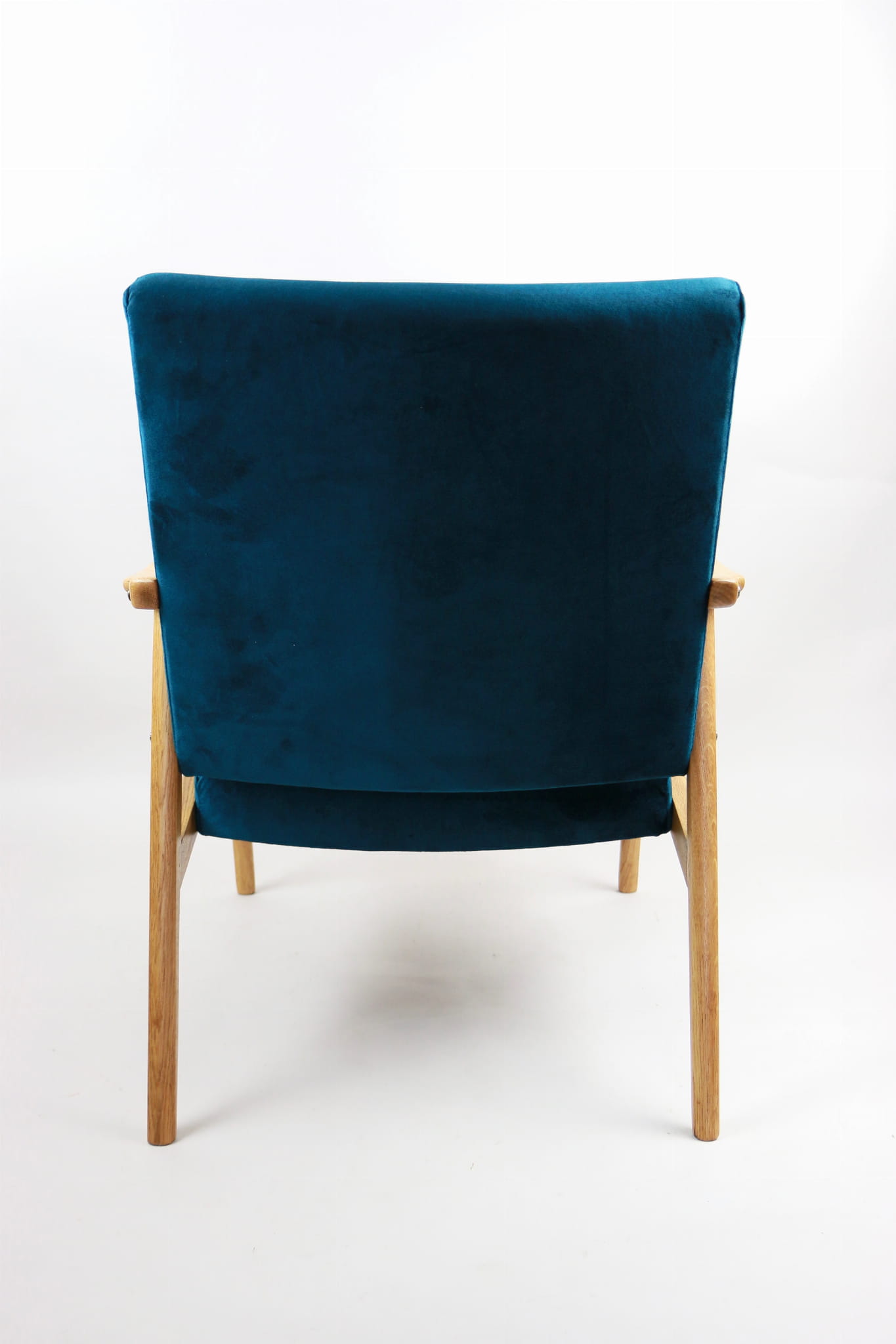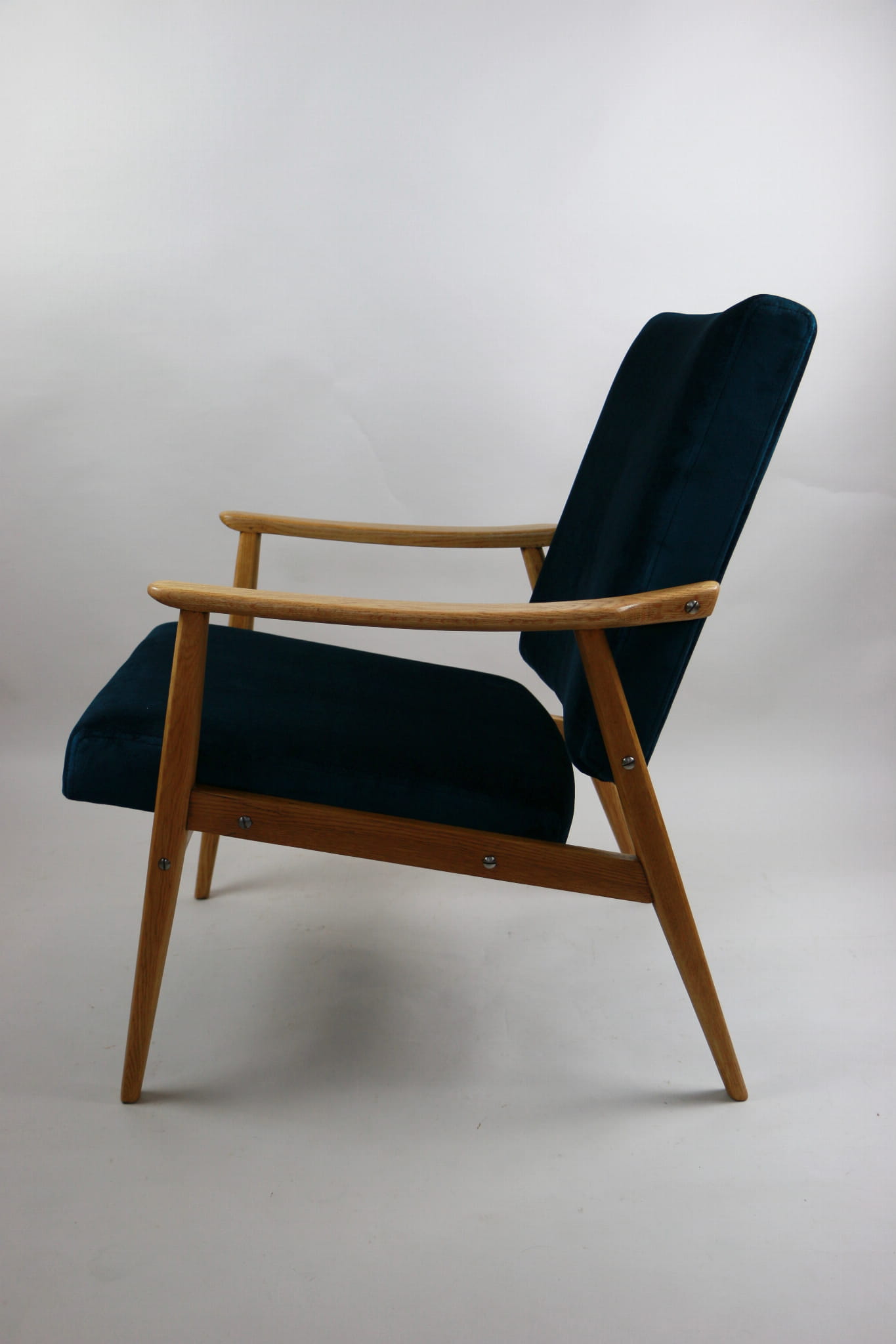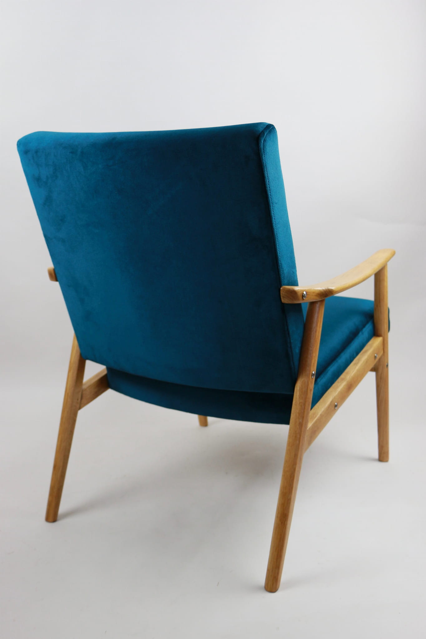 Fotel klasyczny Vintage z lat 70 tych. Odrestaurowany, nowe obicie pokryte aksamitnym materiałem w kolorze zielono- morskim - materiał typu welwet. Siedzisko bardzo wygodne, stelaż drewniany połączony z podłokietnikami w jasnej kolorystyce drewna dębowego - drewno dębowe. Wymiary wysokość : 78 cm, szerokość : 60 cm, szerokość siedziska: 47 cm, głębokość siedziska: 46 cm, głębokość mebla: 69 cm, wysokość siedziska: 37 cm, wysokość podłokietnika:51 cm