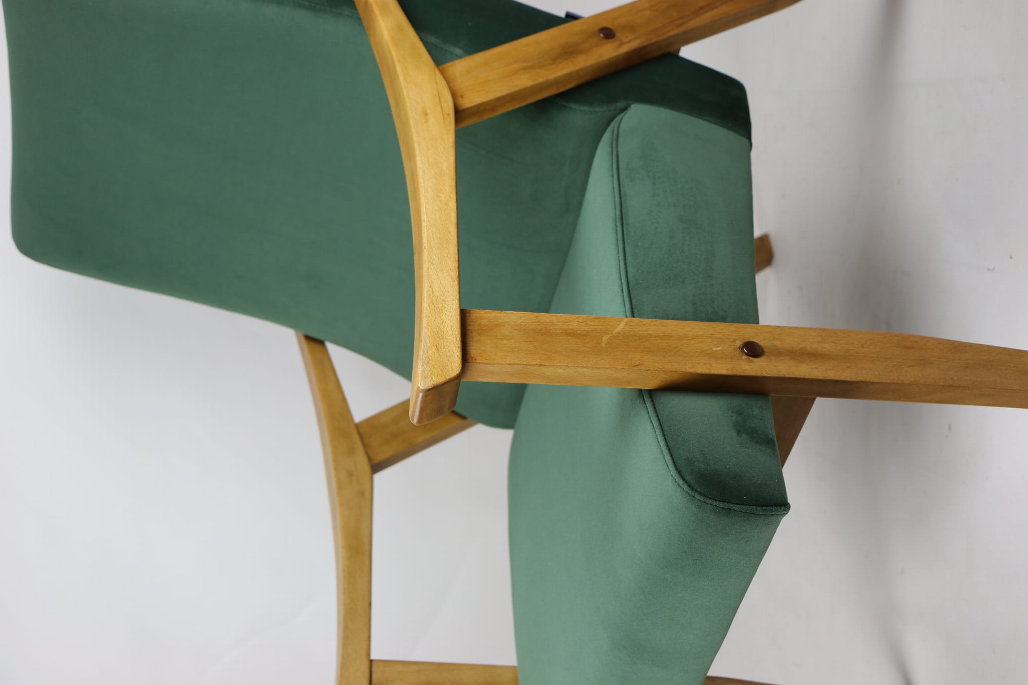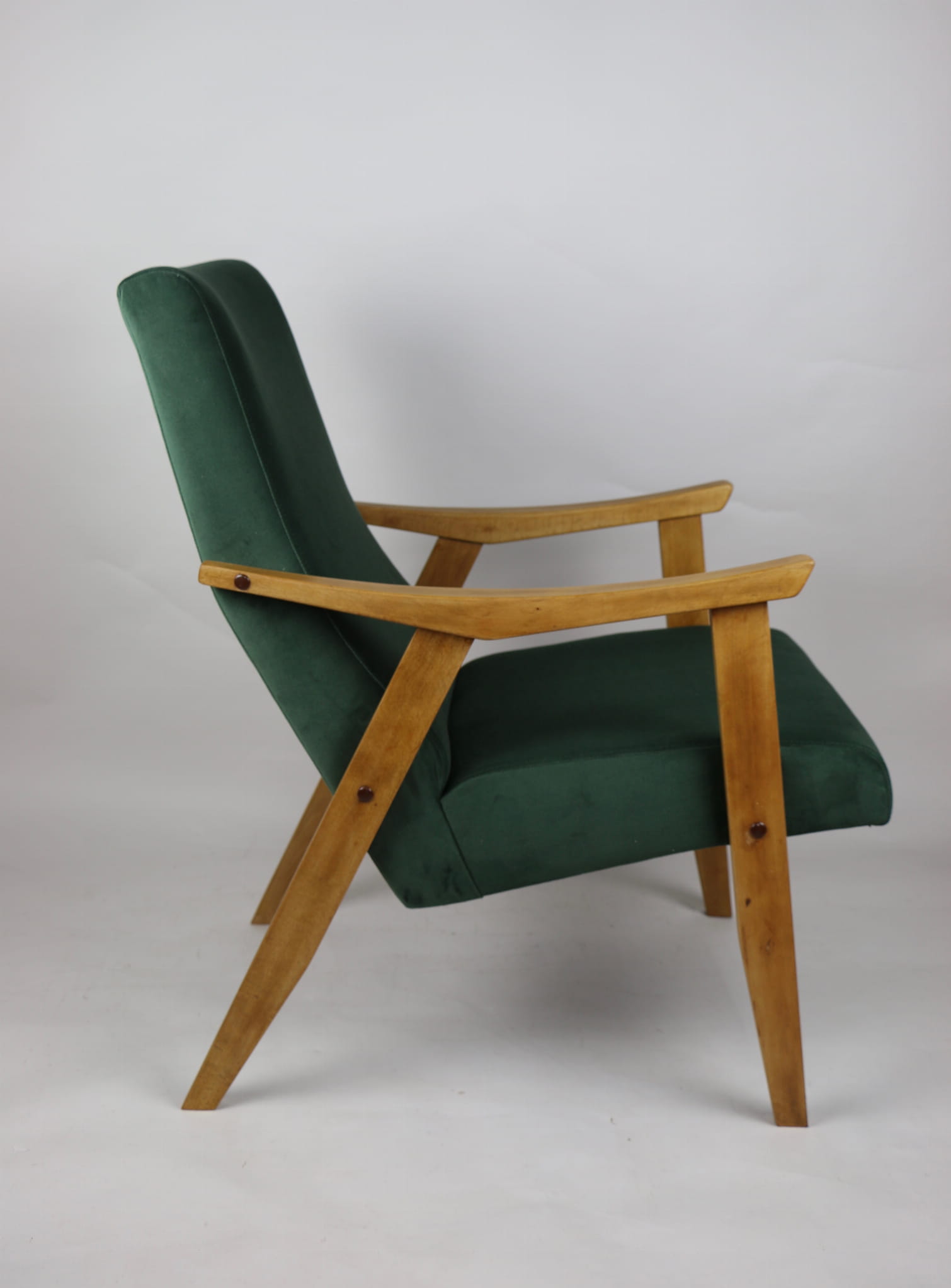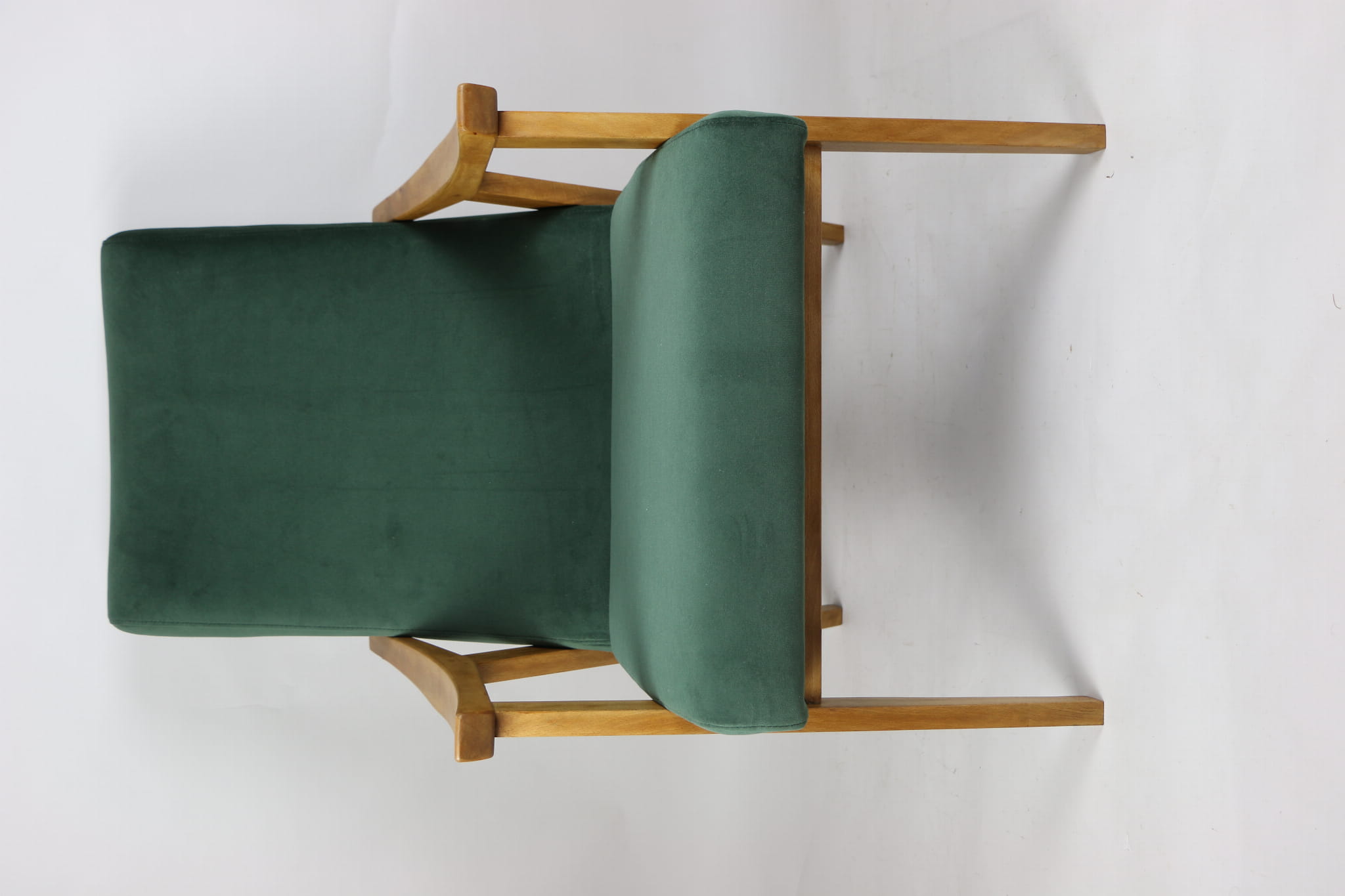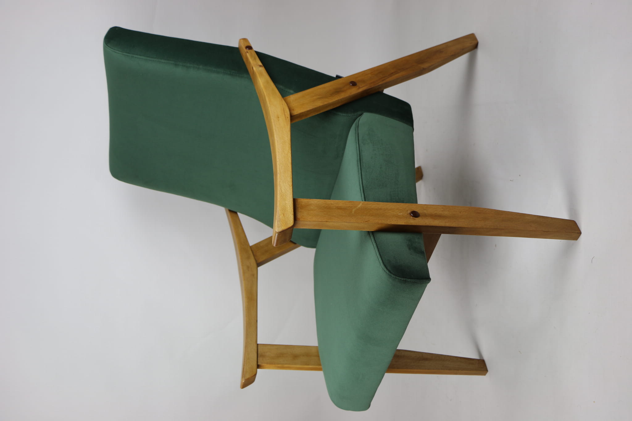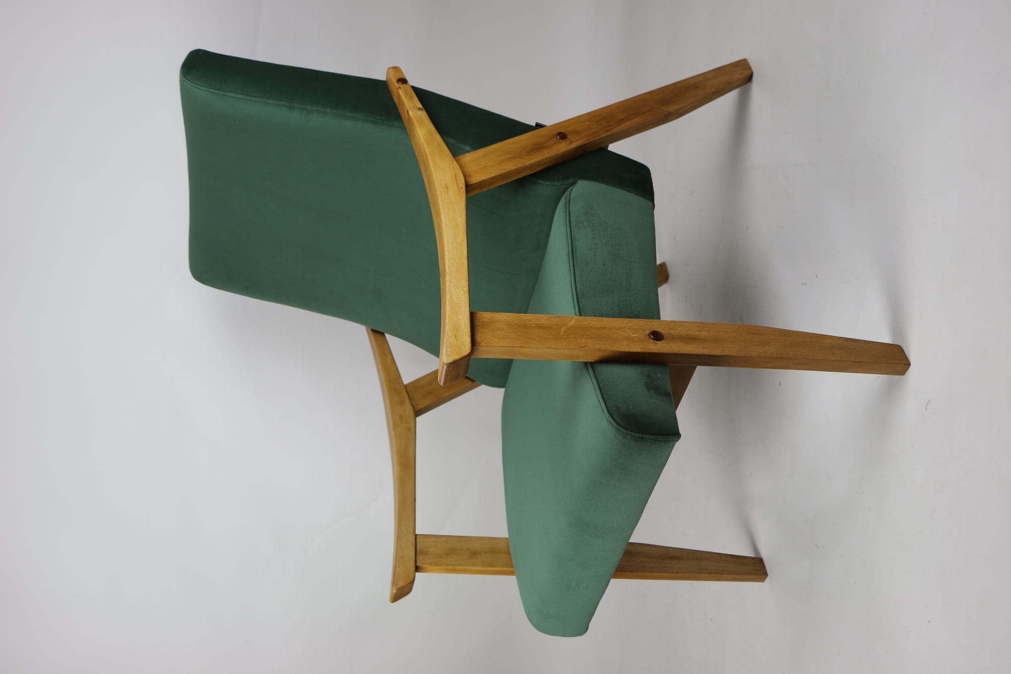 Fotel klasyczny Vintage w stylu Var z lat 70 tych. Odrestaurowany, nowe obicie pokryte aksamitnym materiałem w kolorze zielonym - materiał typu welwet z serii Jade. Siedzisko bardzo wygodne, stelaż drewniany połączony z podłokietnikami w jasnej kolorystyce drewna.