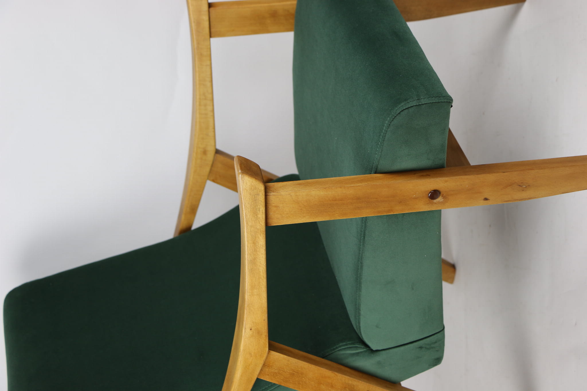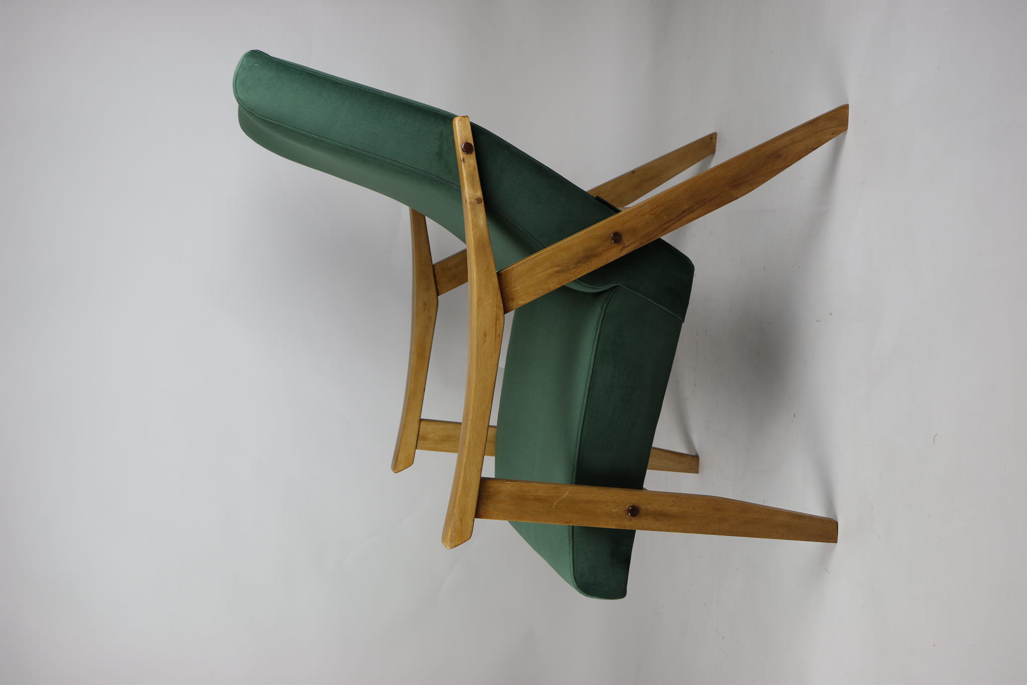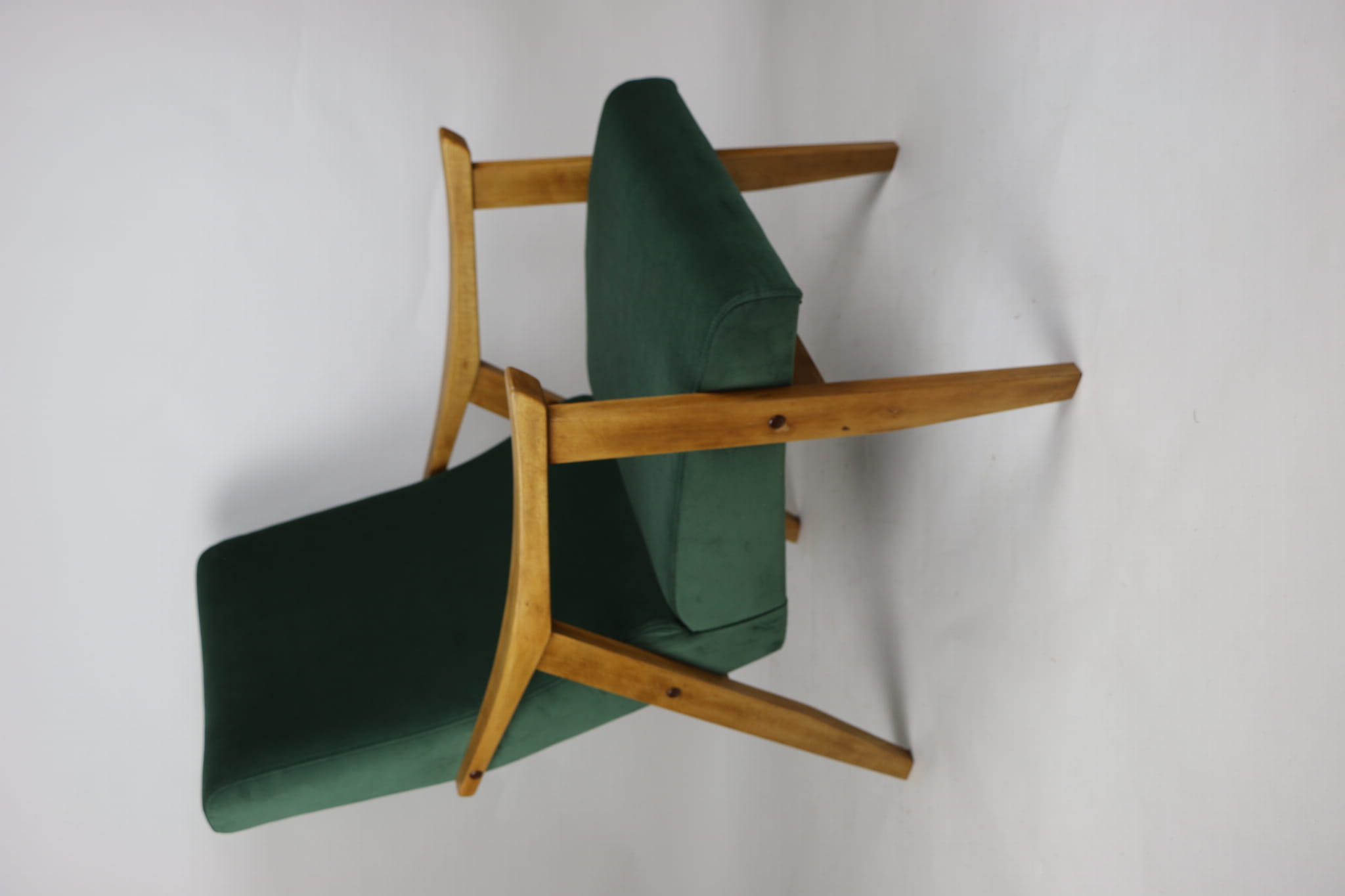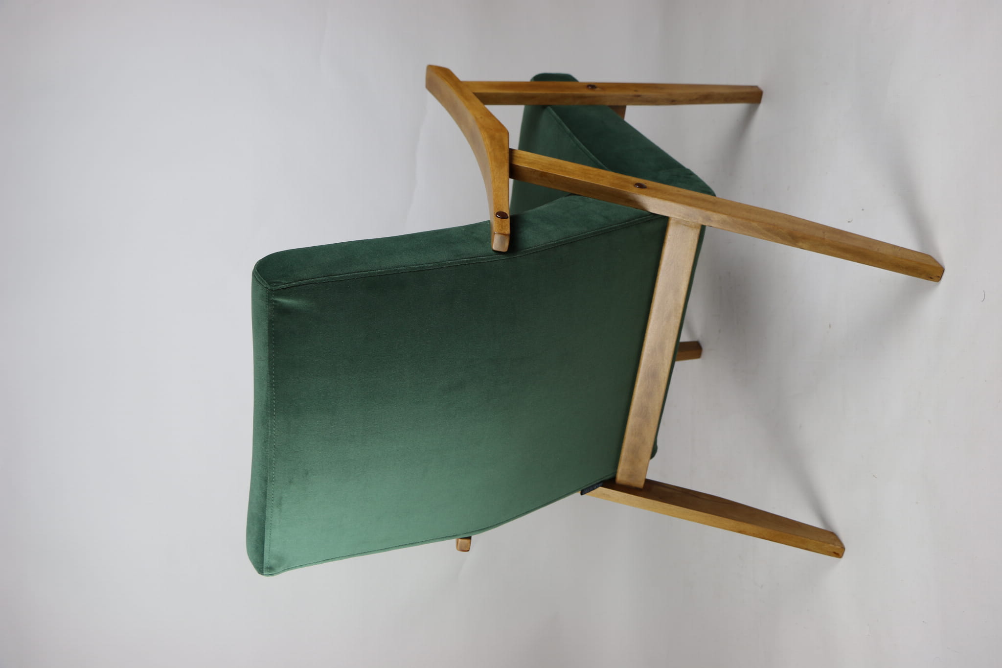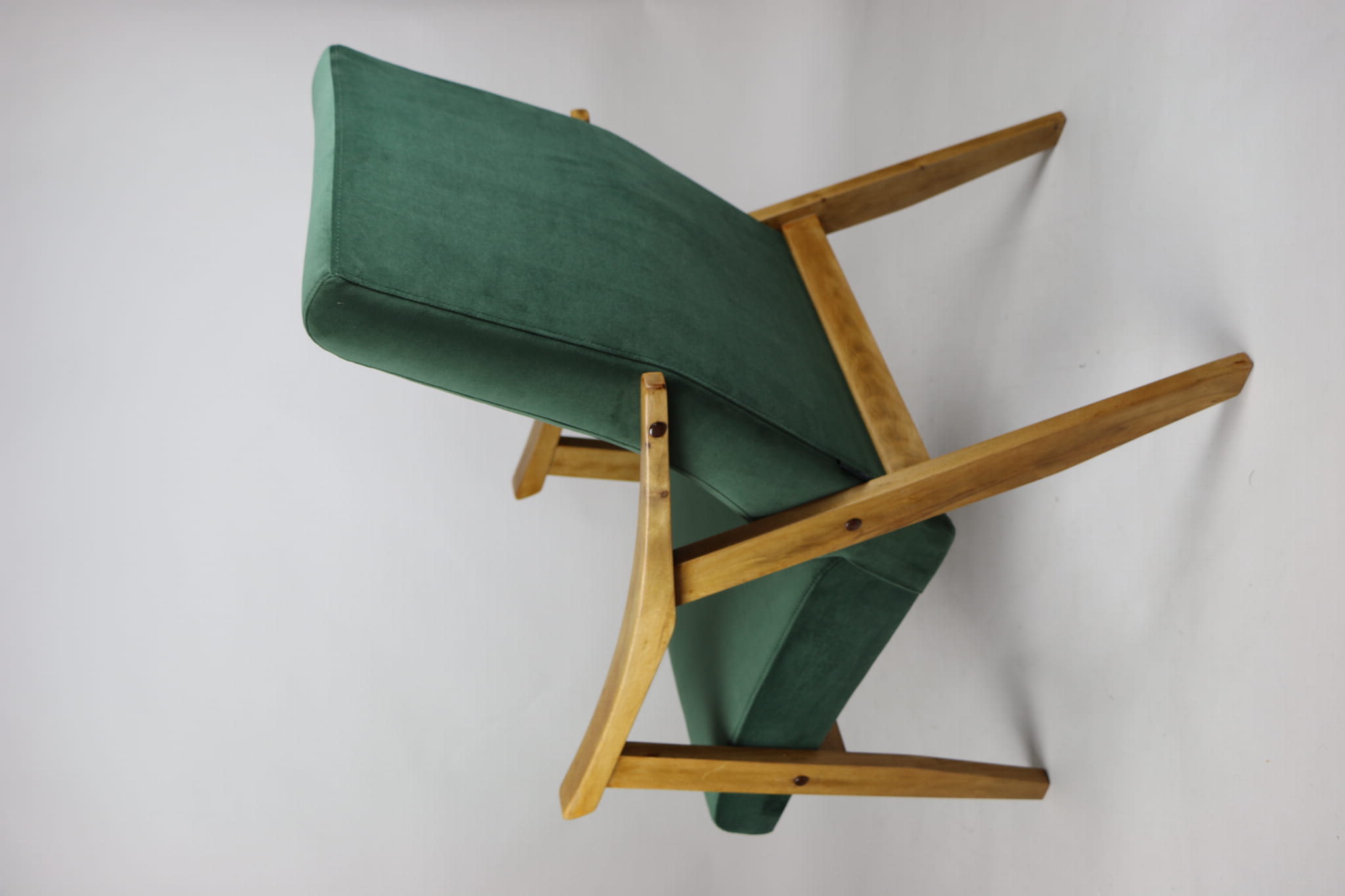 Fotel klasyczny Vintage w stylu Var z lat 70 tych. Odrestaurowany, nowe obicie pokryte aksamitnym materiałem w kolorze zielonym - materiał typu welwet z serii Jade. Siedzisko bardzo wygodne, stelaż drewniany połączony z podłokietnikami w jasnej kolorystyce drewna.