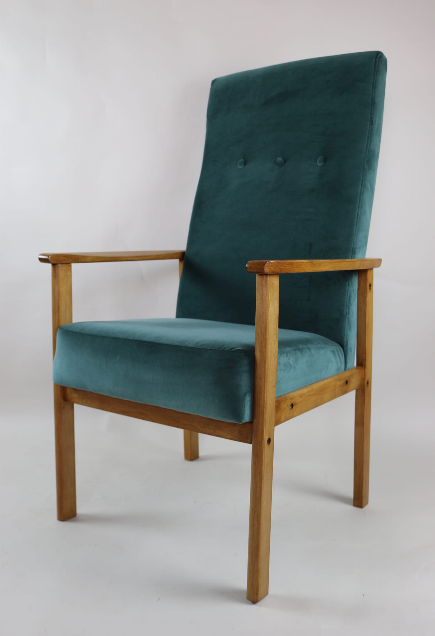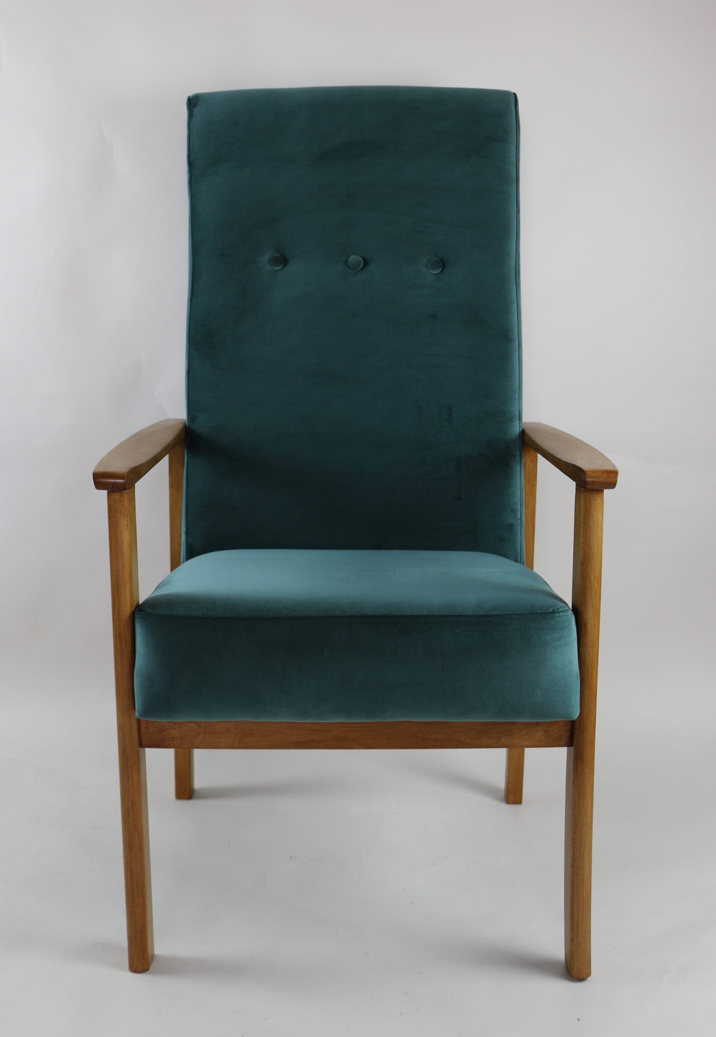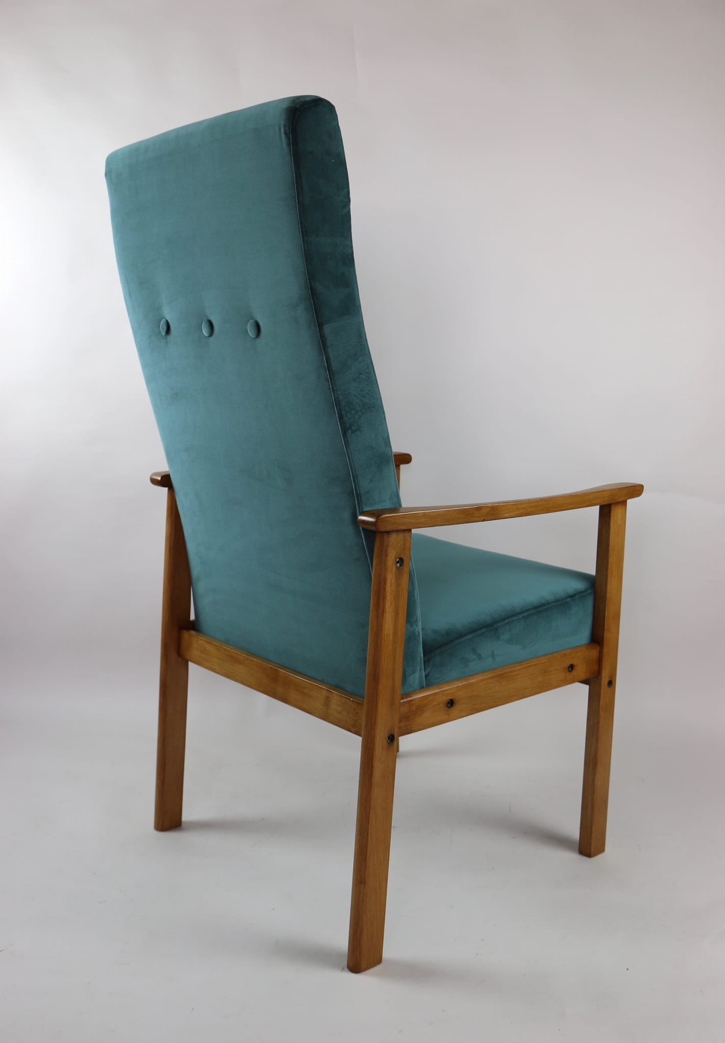 Fotel klasyczny Vintage bardzo wysoki z lat 70 tych. Odrestaurowane, nowe obicie pokryte aksamitnym materiałem w kolorze zielonym ( butelkowa zieleń) - materiał typu welwet. Siedzisko bardzo wygodne, stelaż drewniany połączony z podłokietnikami w naturalnej kolorystyce drewna. Dostępne 2 sztuki.