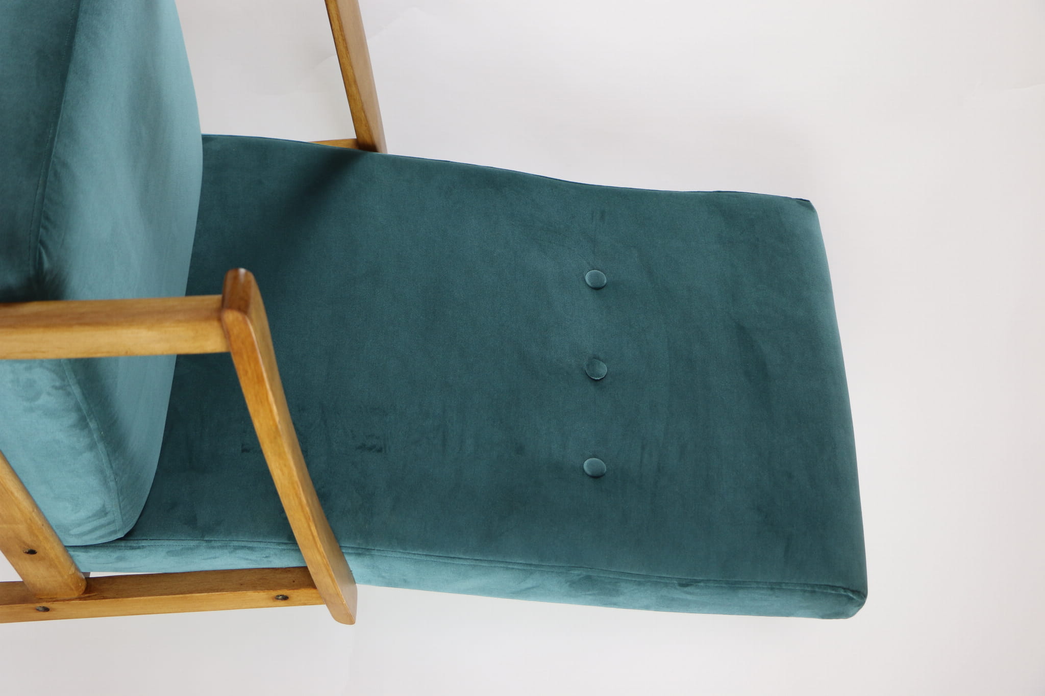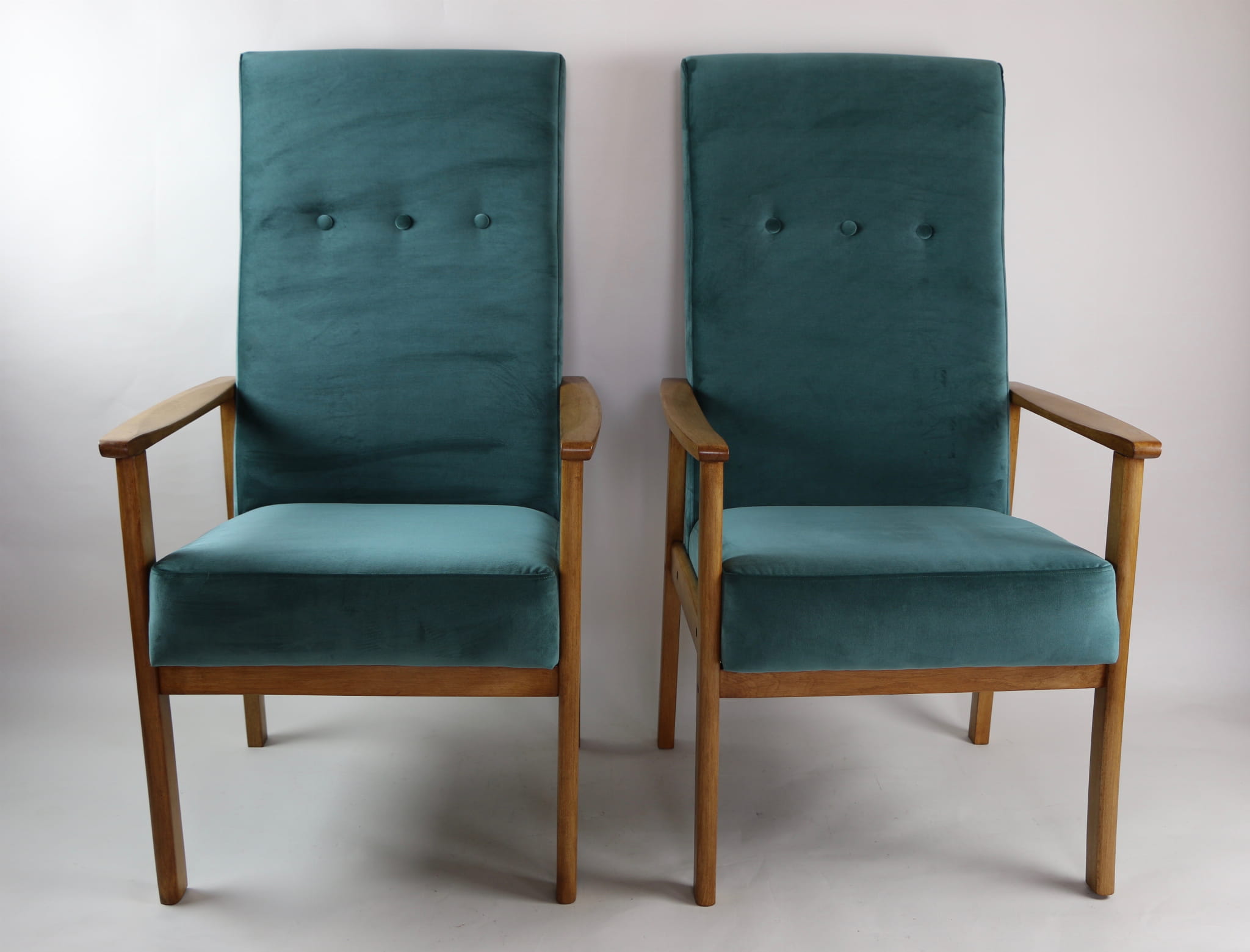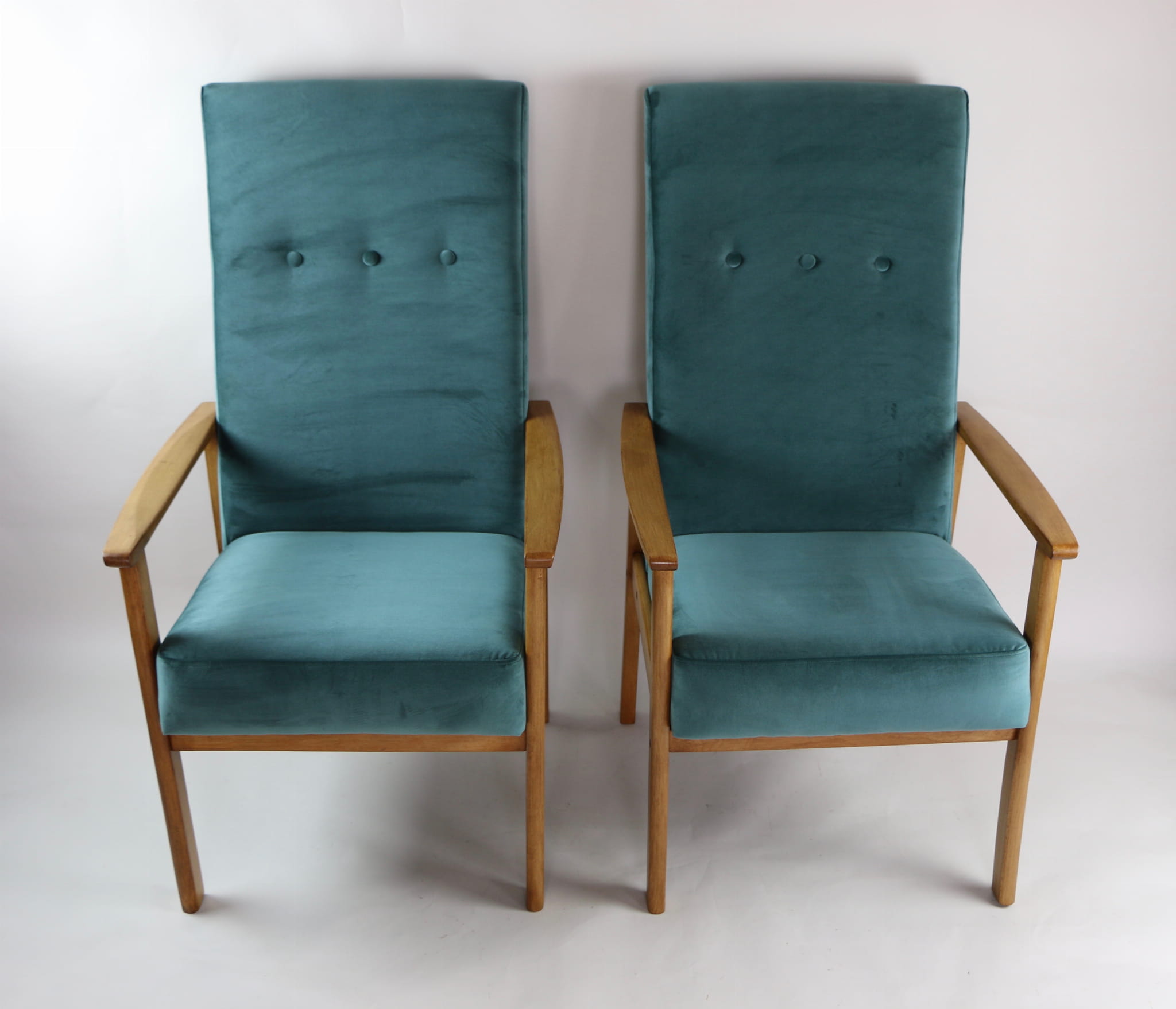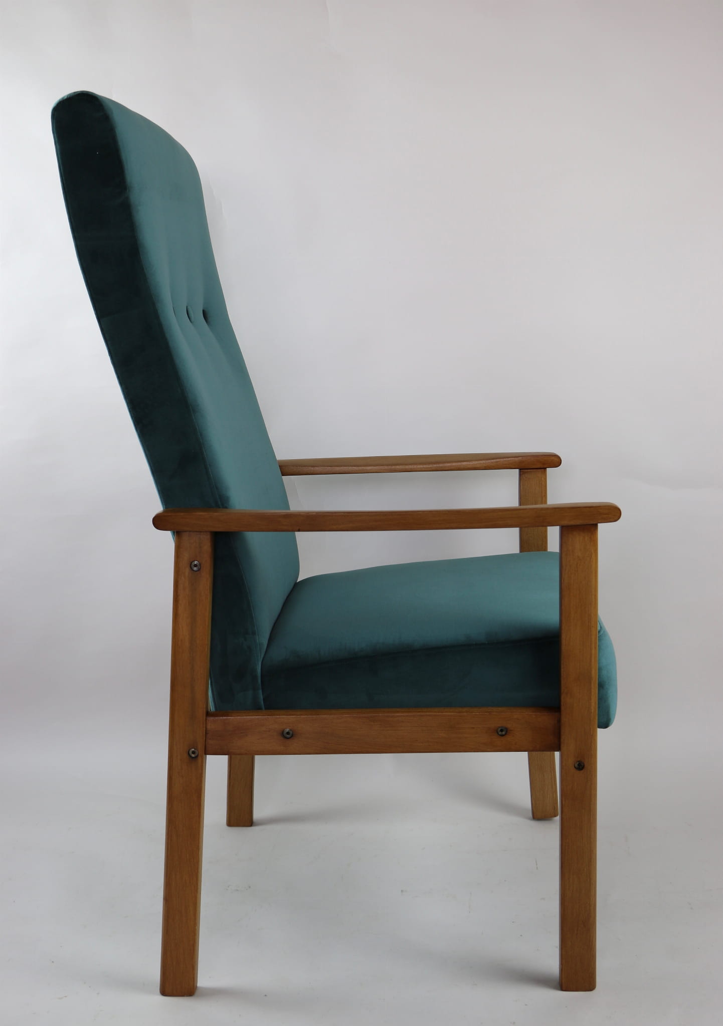 Fotel klasyczny Vintage bardzo wysoki z lat 70 tych. Odrestaurowane, nowe obicie pokryte aksamitnym materiałem w kolorze zielonym ( butelkowa zieleń) - materiał typu welwet. Siedzisko bardzo wygodne, stelaż drewniany połączony z podłokietnikami w naturalnej kolorystyce drewna. Dostępne 2 sztuki.