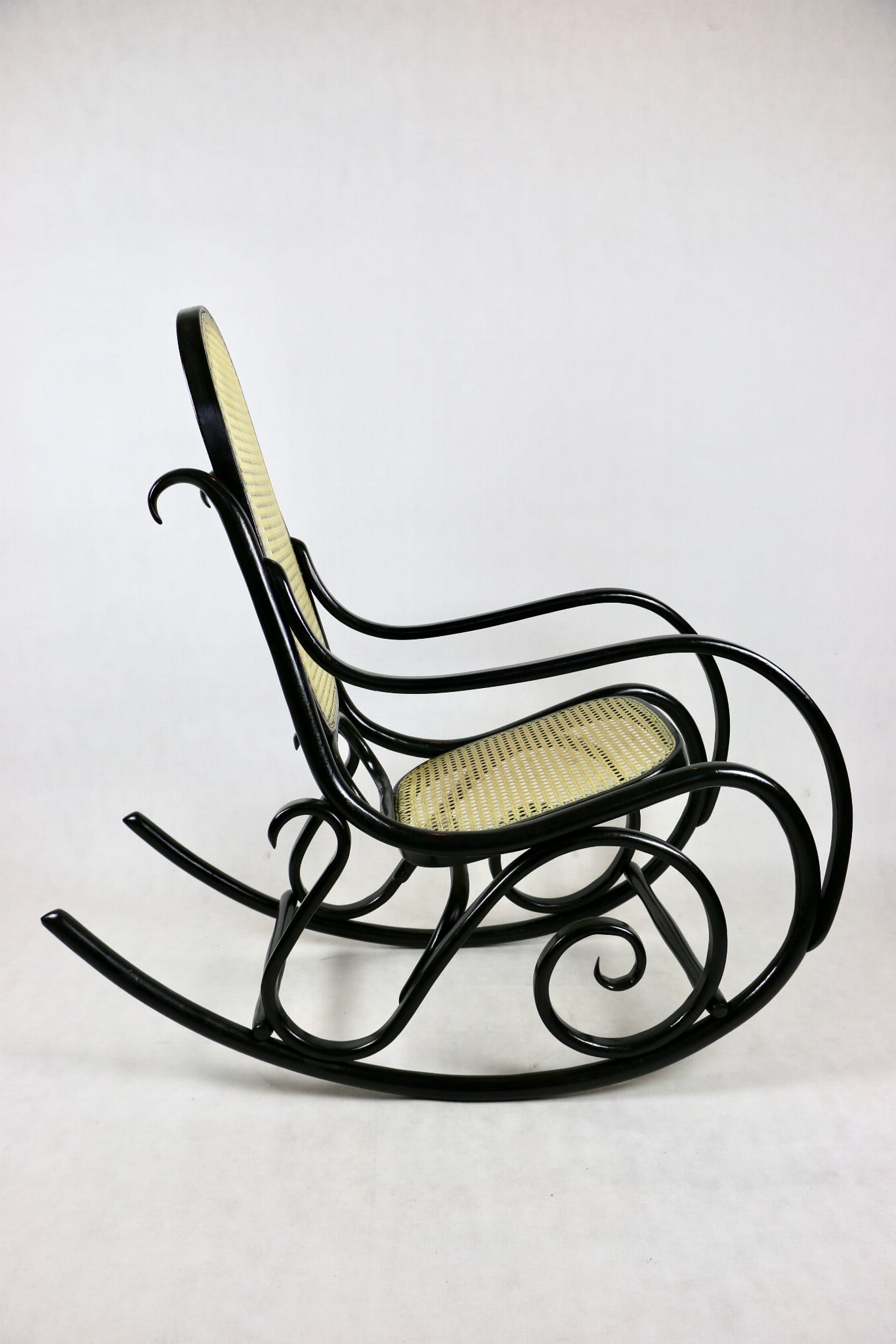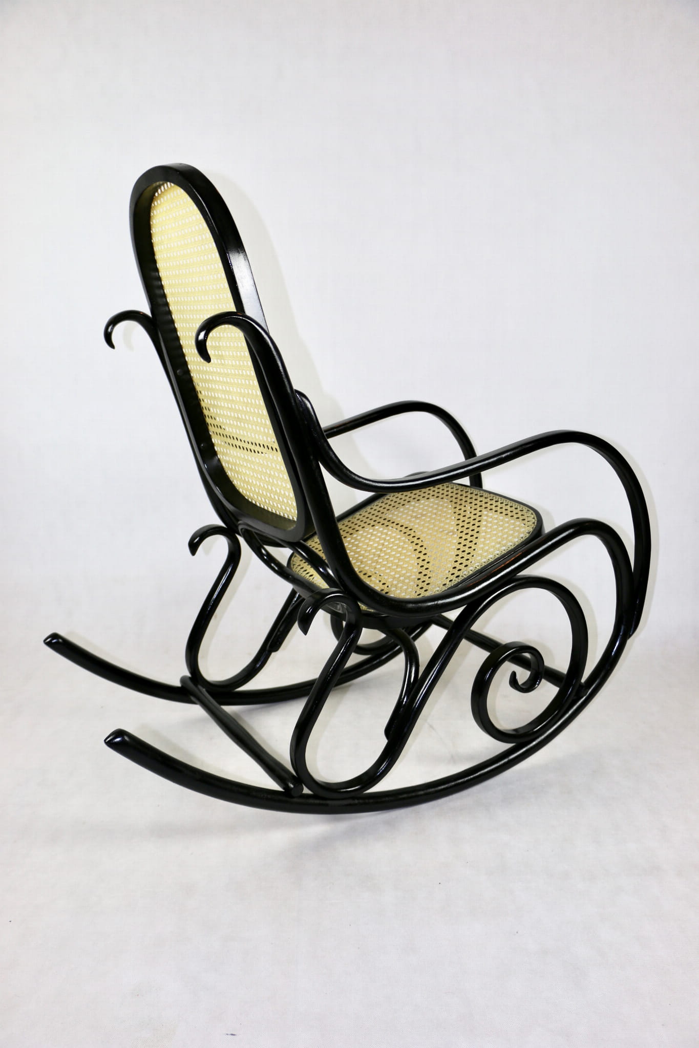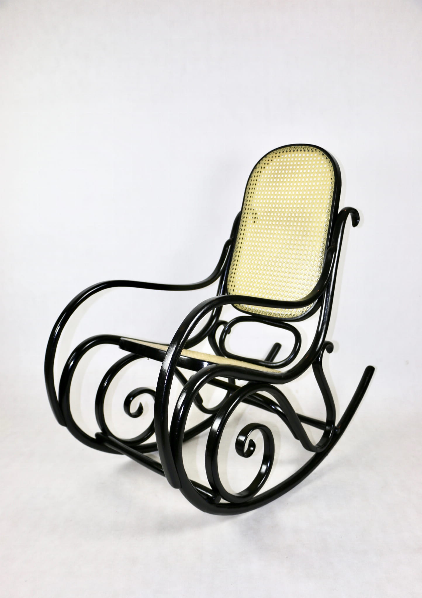 Fotel bujany Thonet na biegunach, lata 70 w kolorze czarnym. Oryginalny zachowany w idealnym stanie - stan bardzo dobry.