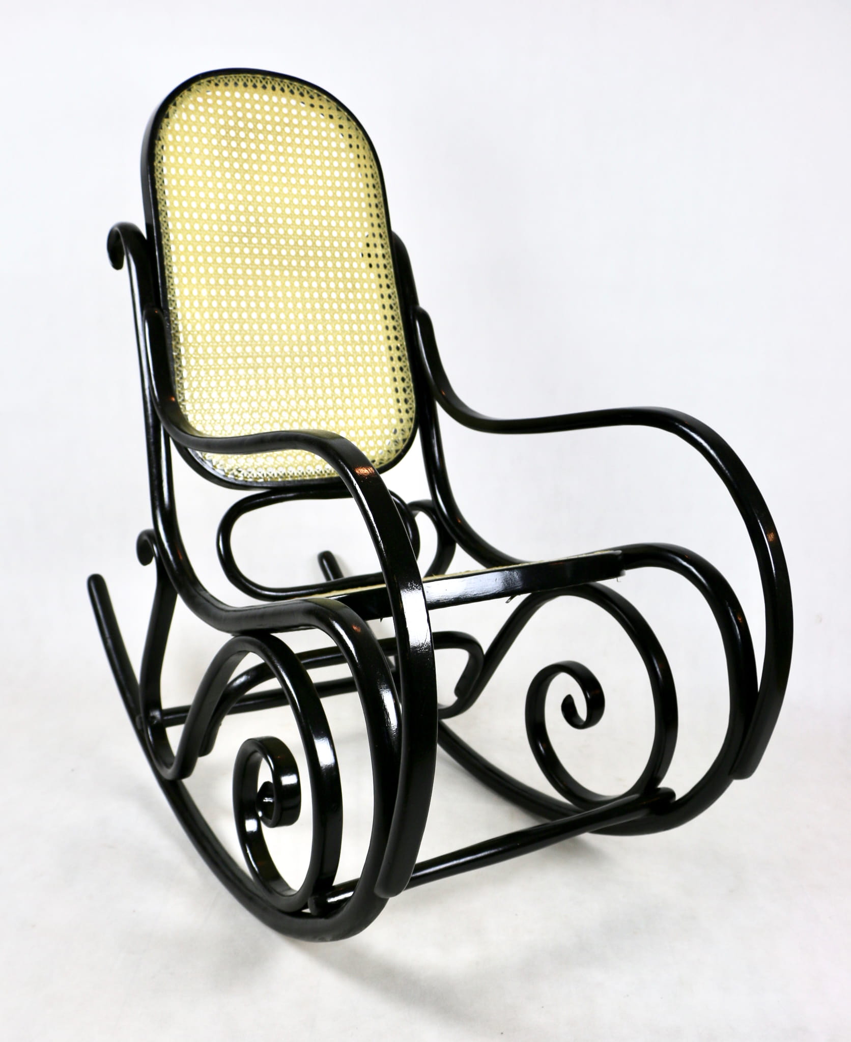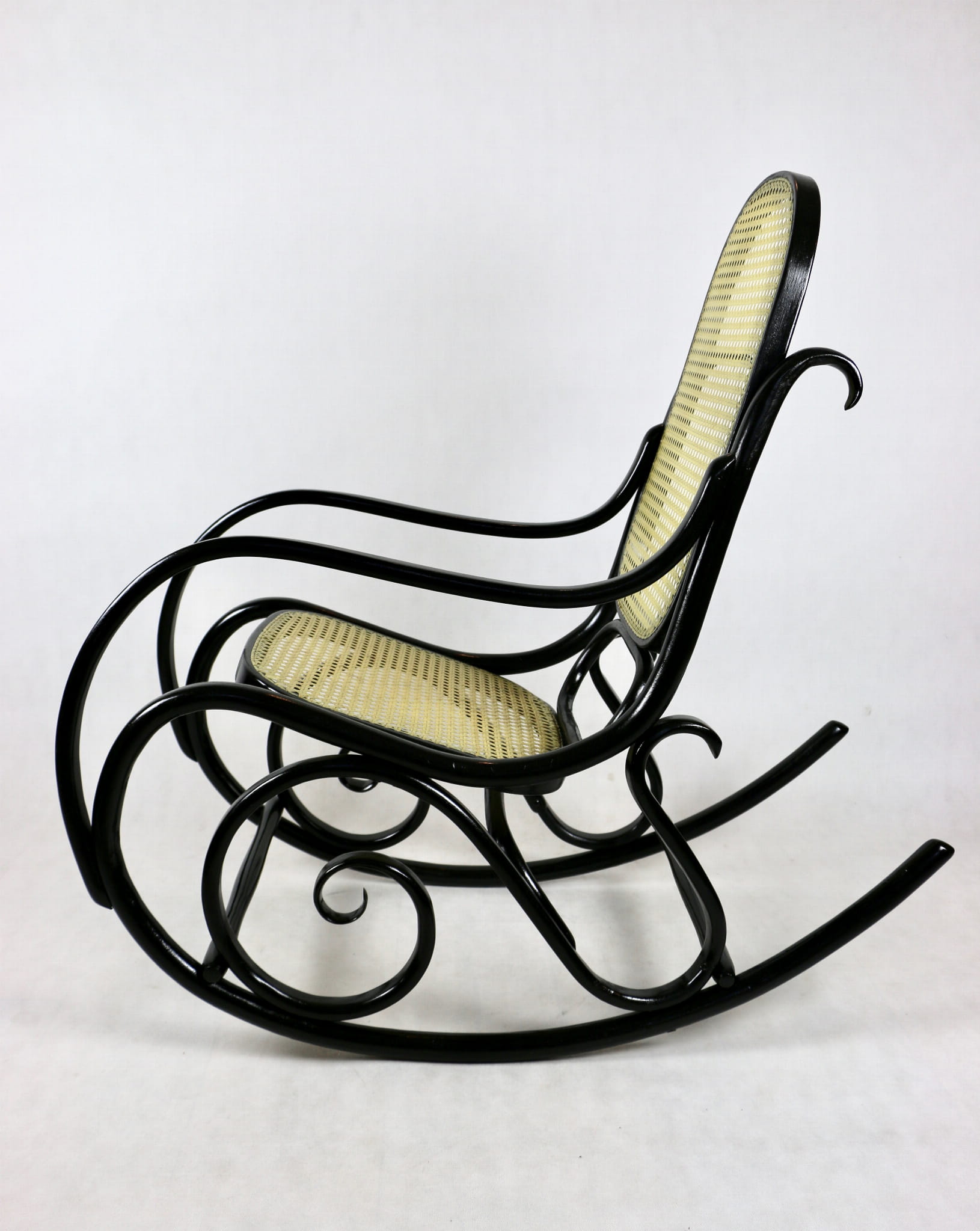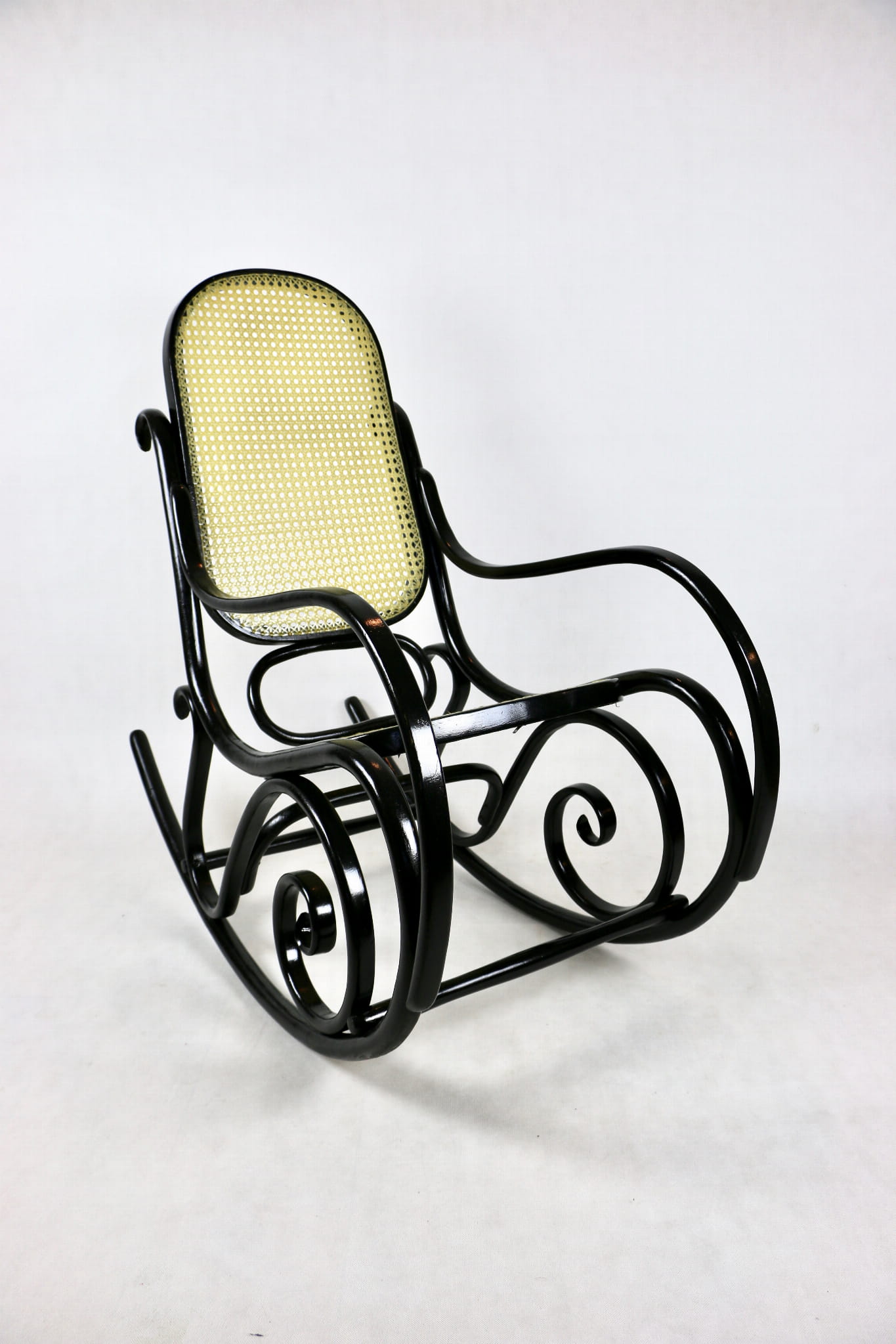 Fotel bujany Thonet na biegunach, lata 70 w kolorze czarnym. Oryginalny zachowany w idealnym stanie - stan bardzo dobry.