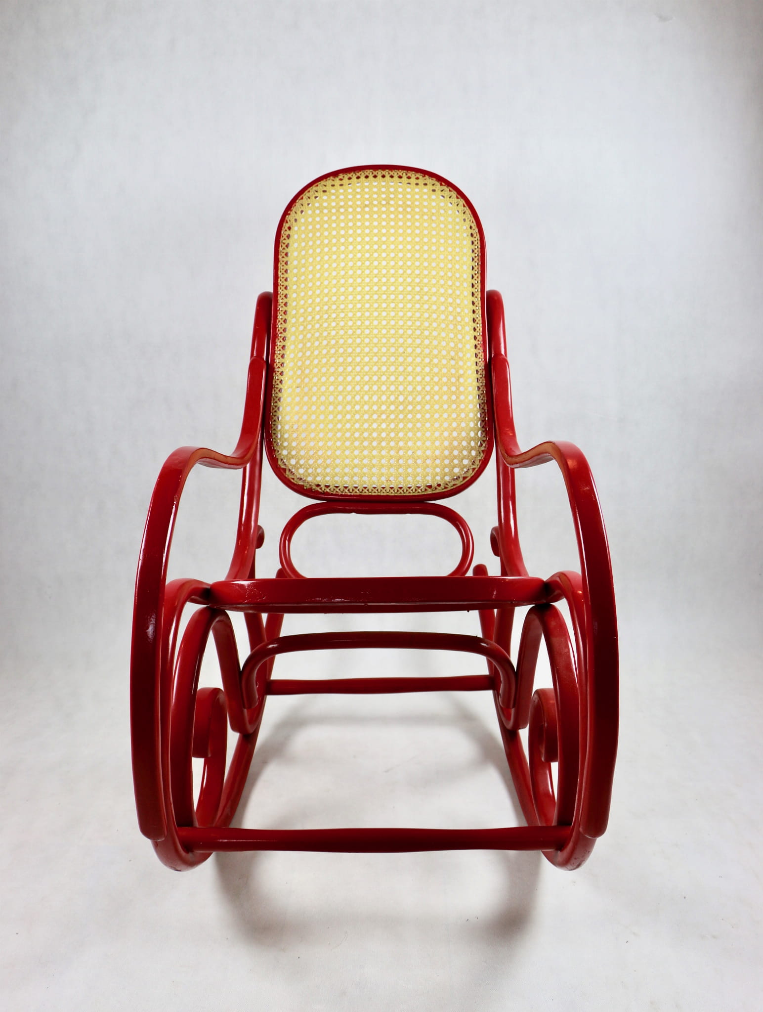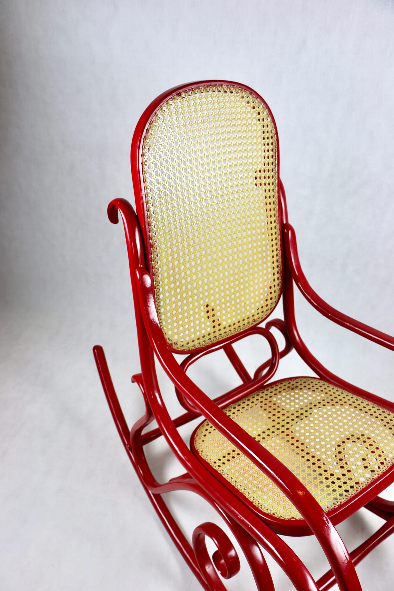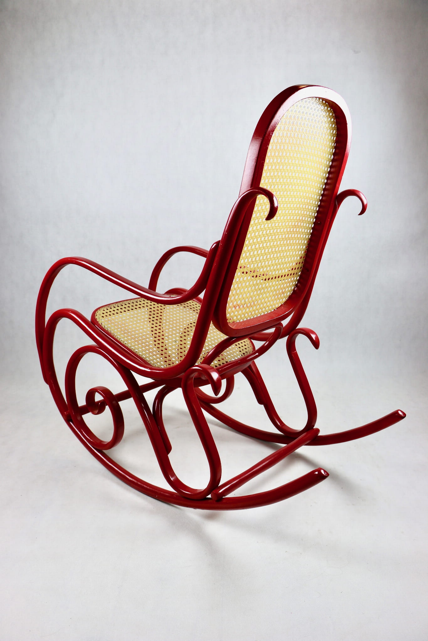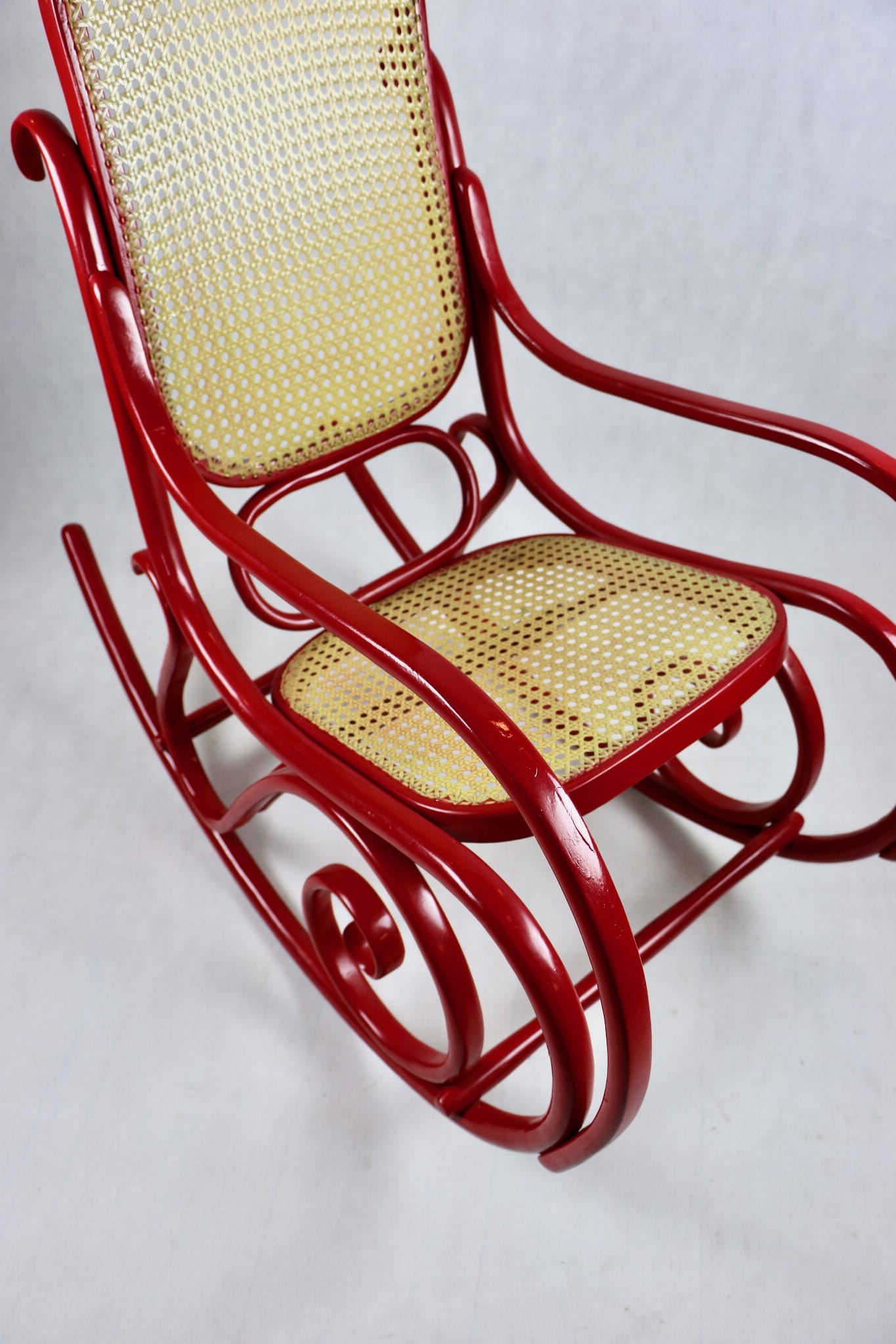 Fotel bujany Thonet na biegunach, lata 70 w kolorze czerwonym. Oryginalny zachowany w bardzo dobrym stanie - bardzo drobne ślady użytkowania . Siedzisko i oparcie wykonane z techno ratanu.