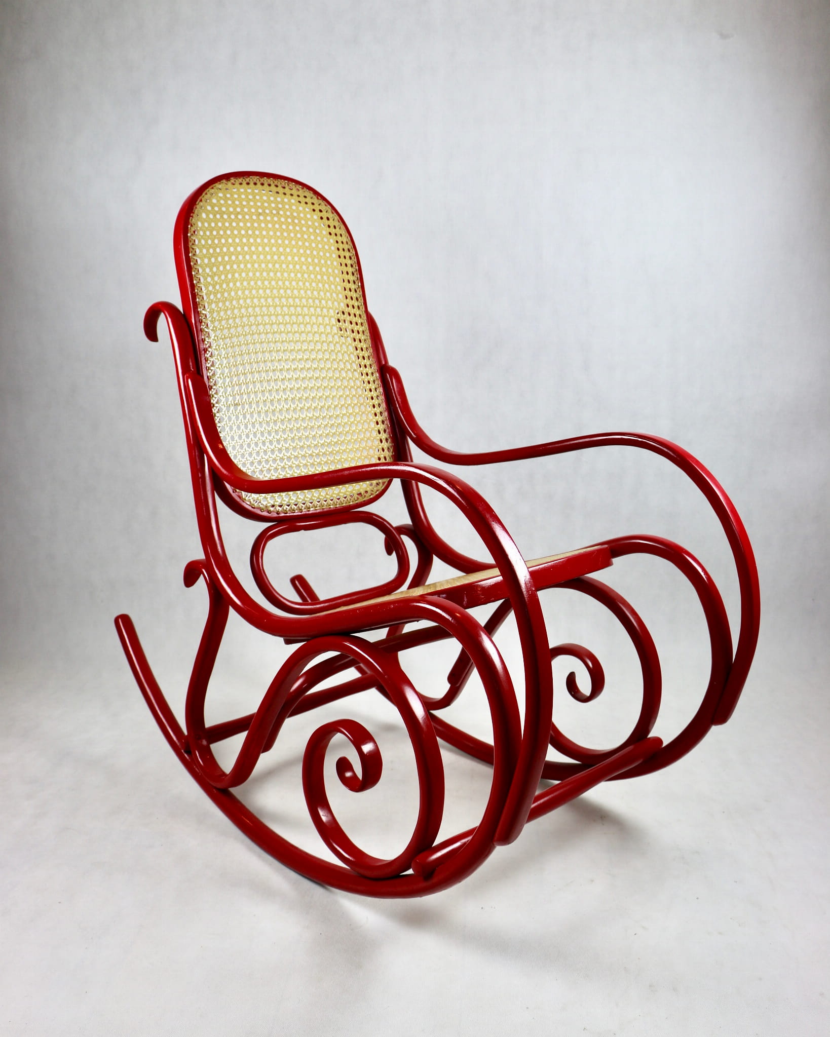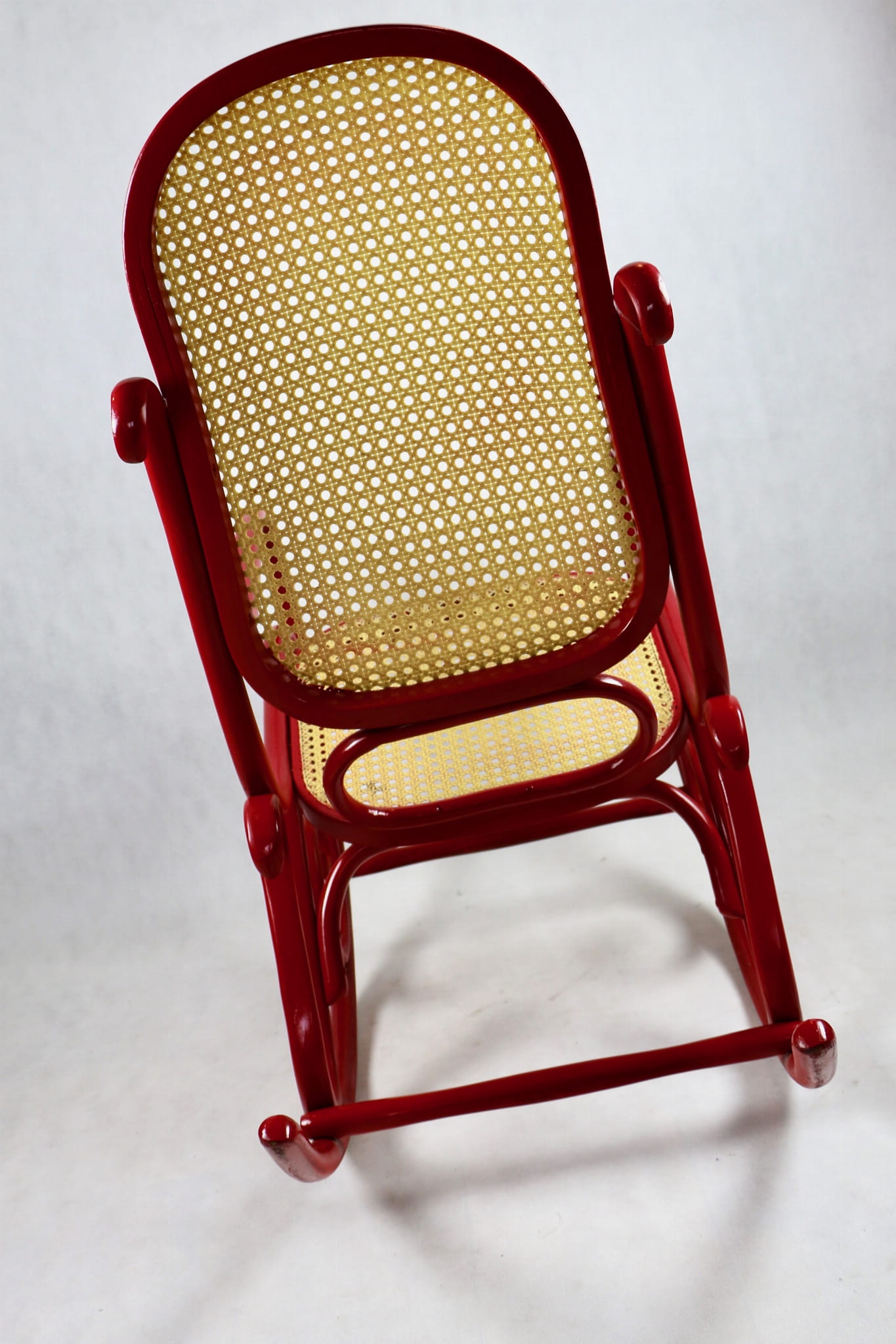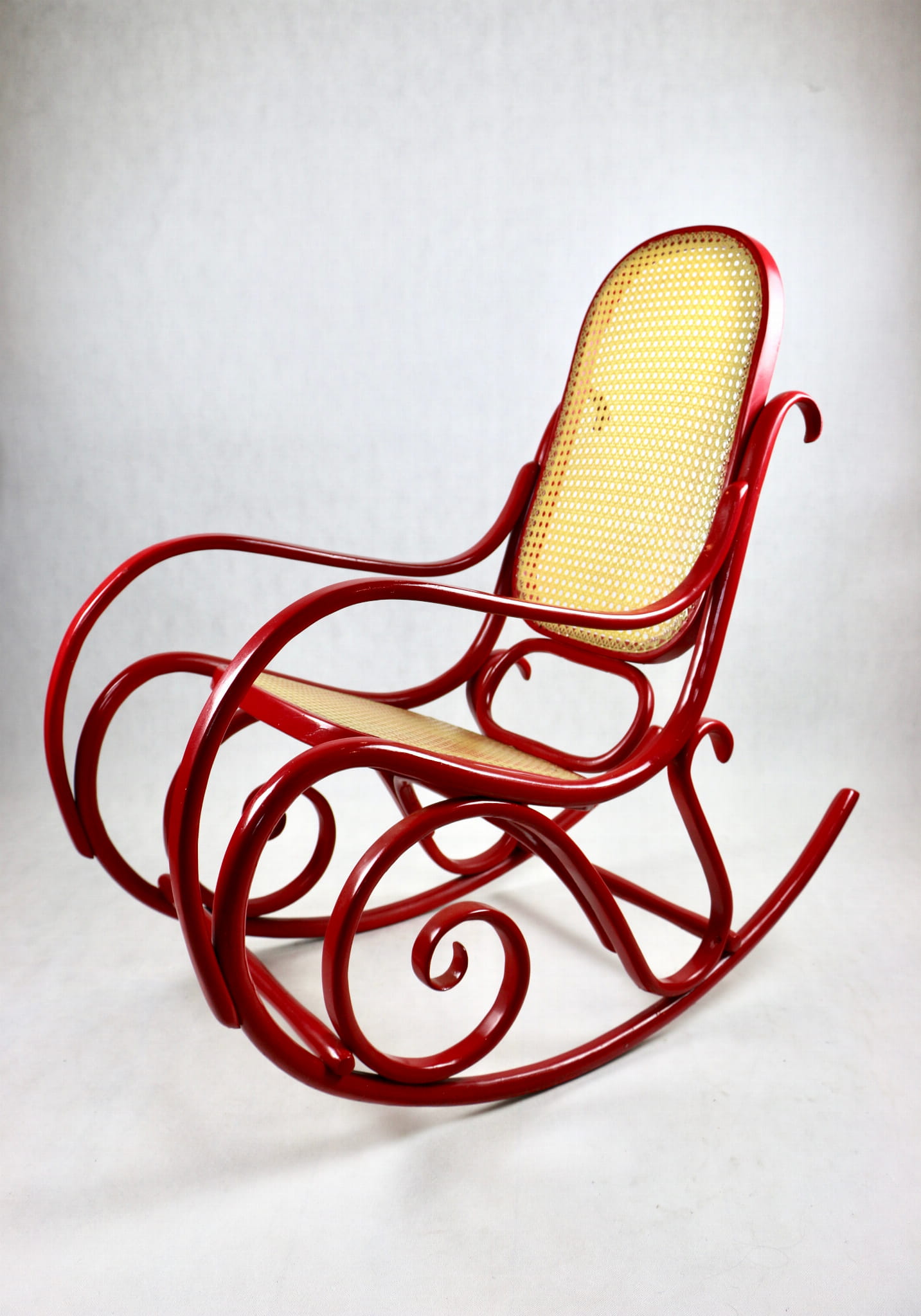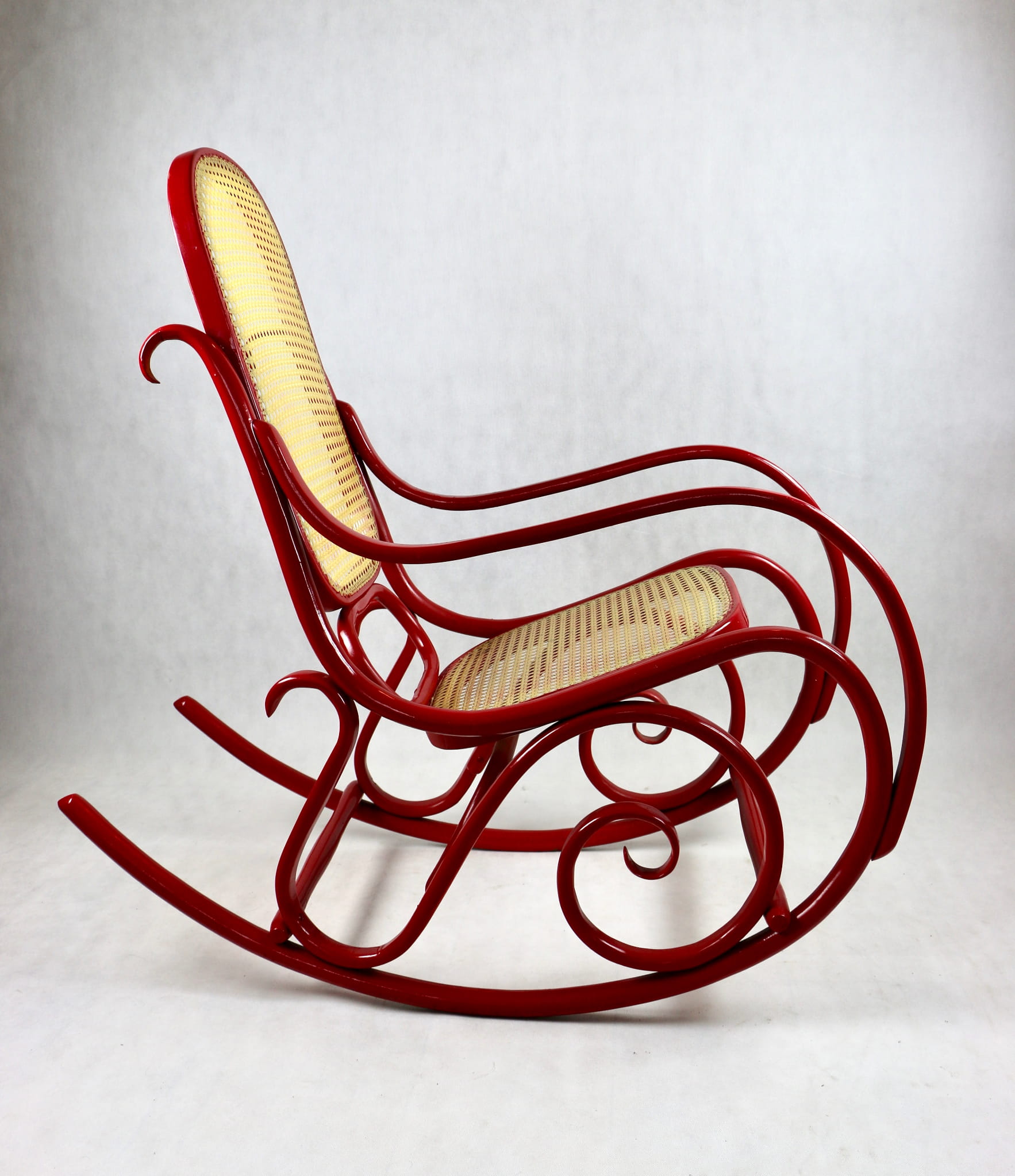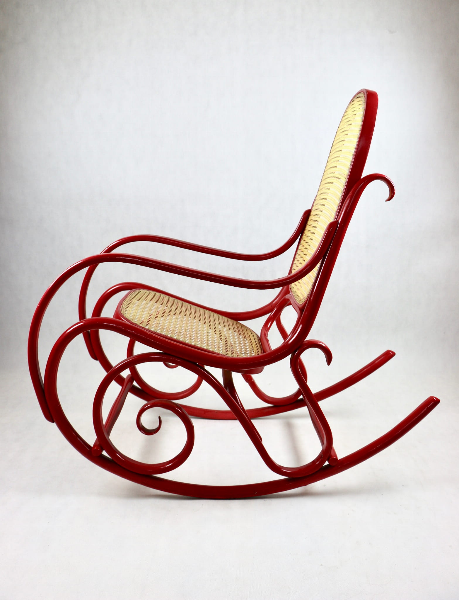 Fotel bujany Thonet na biegunach, lata 70 w kolorze czerwonym. Oryginalny zachowany w bardzo dobrym stanie - bardzo drobne ślady użytkowania . Siedzisko i oparcie wykonane z techno ratanu.