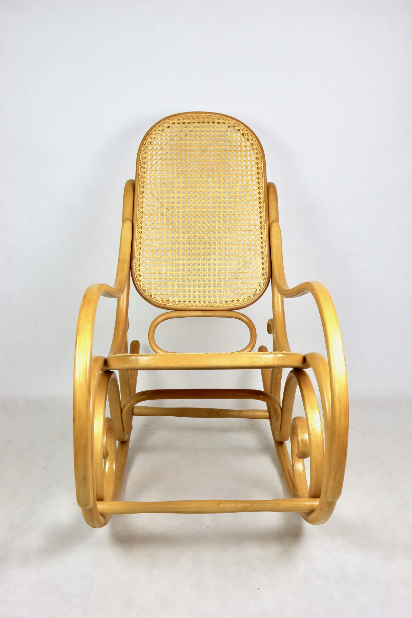 Fotel bujany na biegunach, lata 70 w kolorze jasnym - bukowym. Oryginalny zachowany w idealnym stanie - siatka z naturalnej rafii. Drewno bukowe odświeżone w naturalnym kolorze - ponownie przelakierowane.