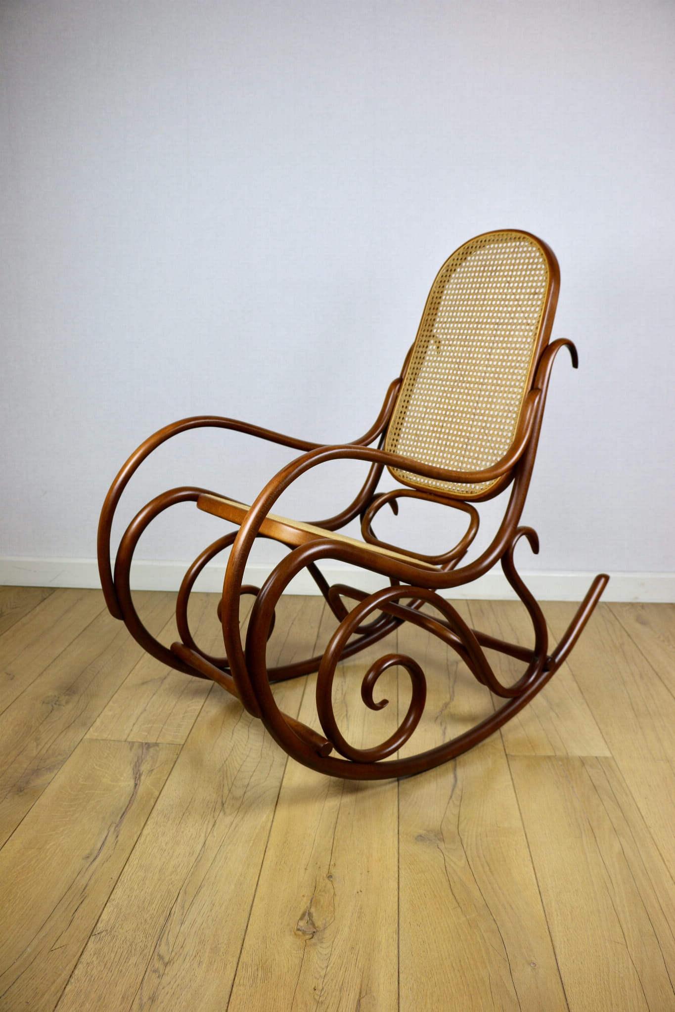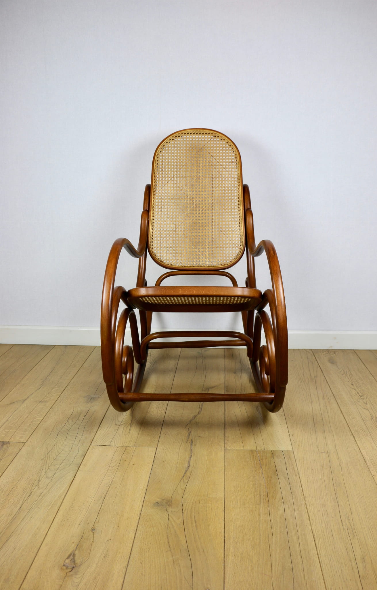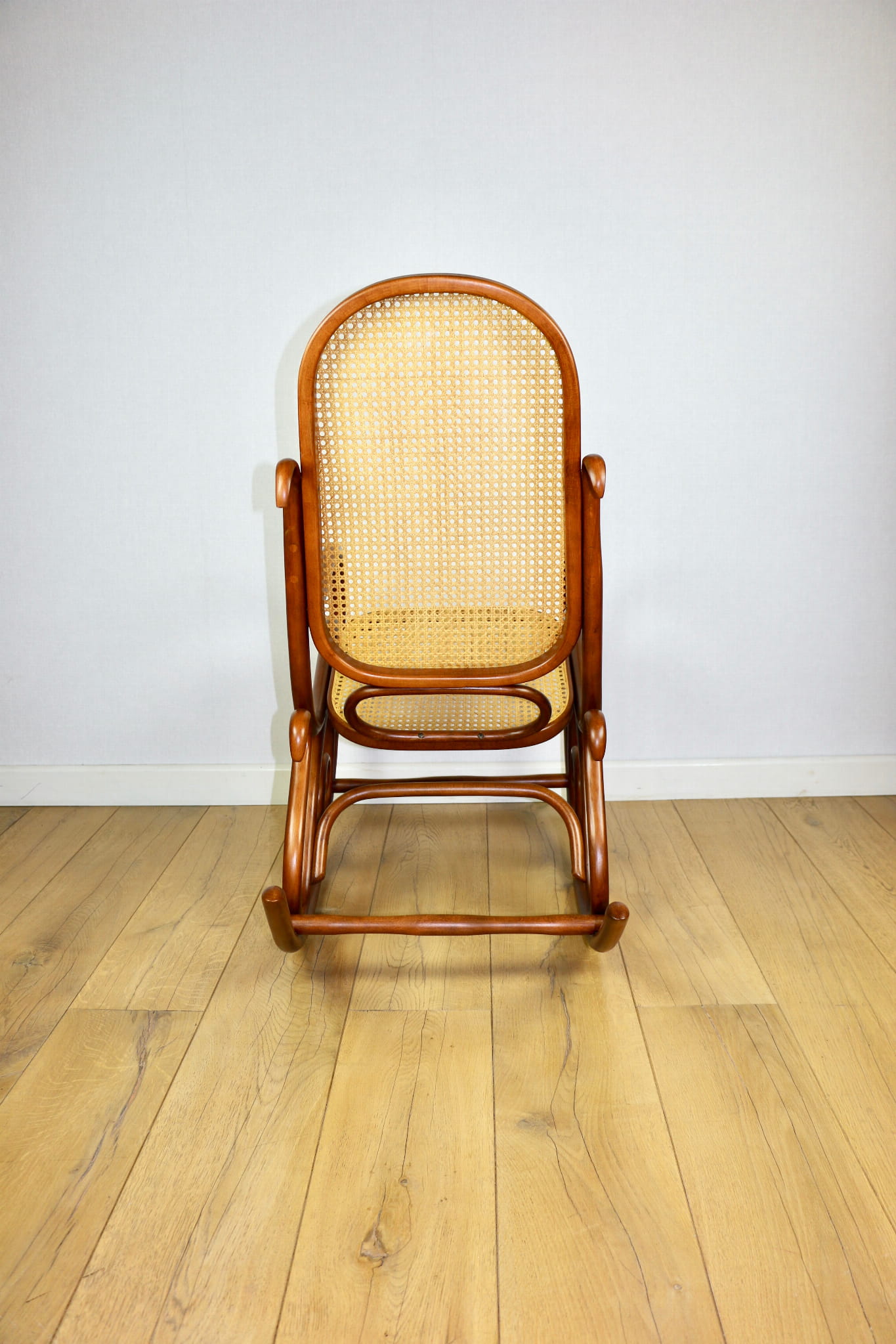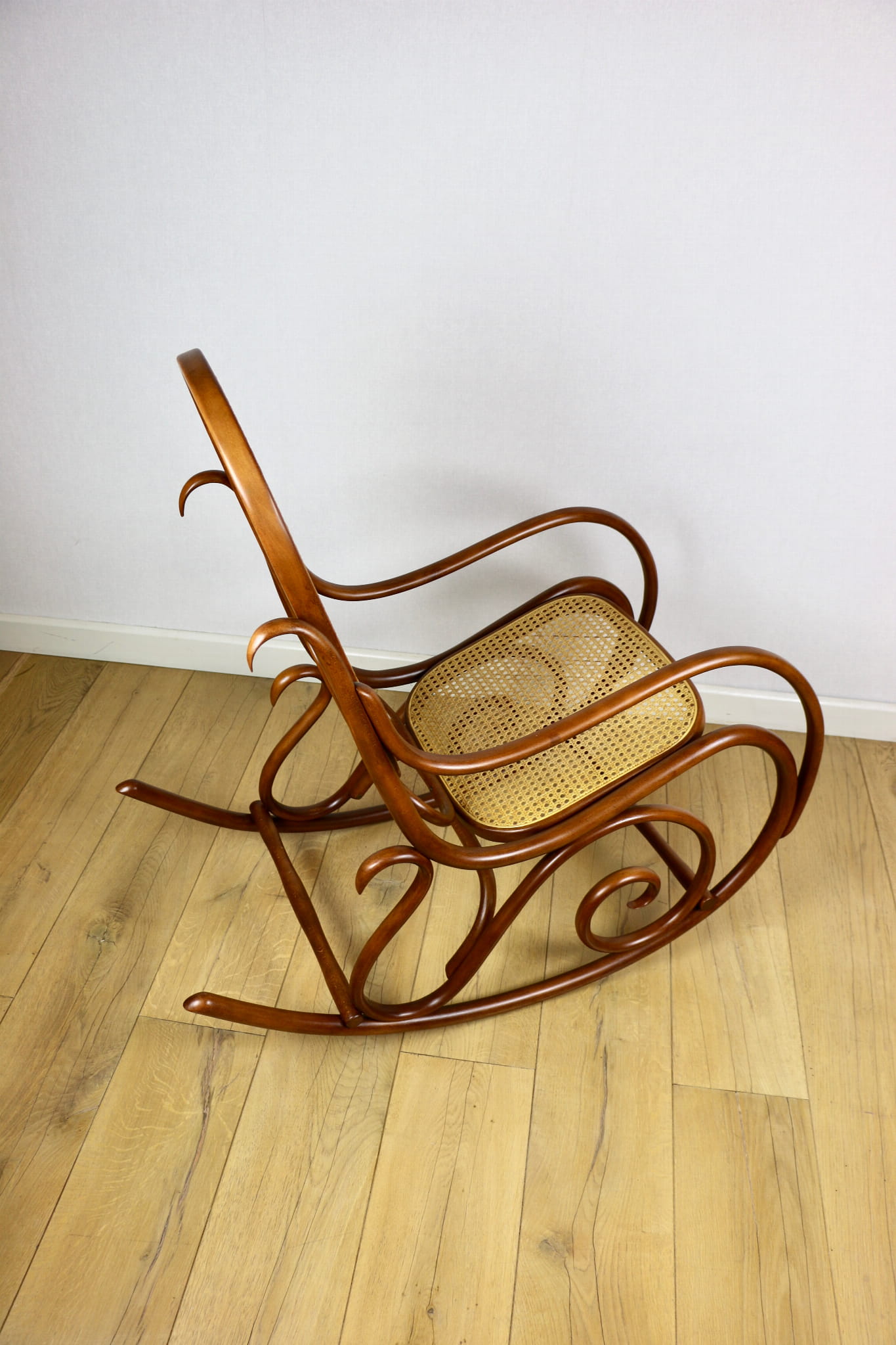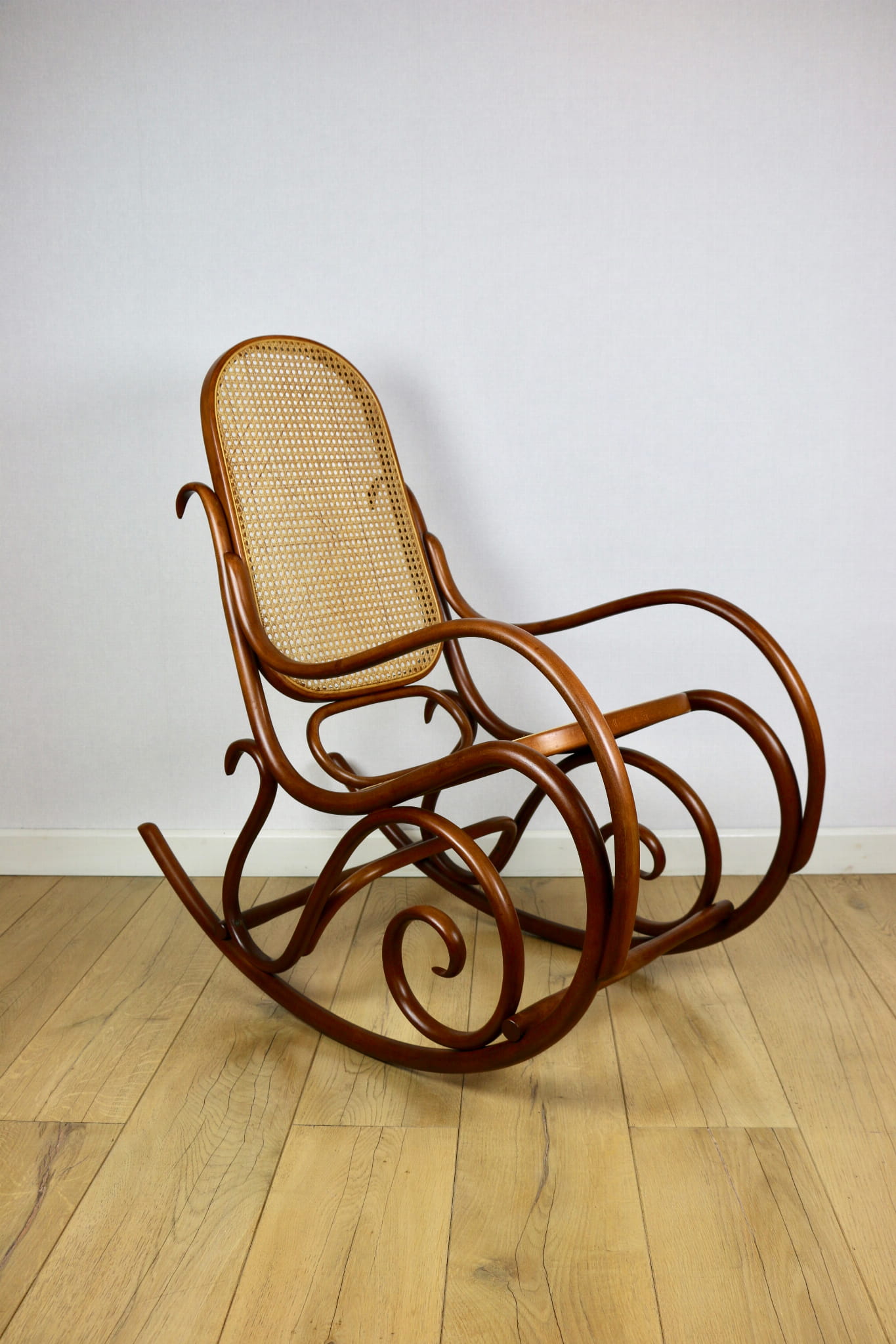 Fotel bujany na biegunach, lata 70 w kolorze brązowym. Oryginalny zachowany w idealnym w stanie. Siatka w oryginalnym stanie z naturalnej rafii. Drewno lakierowane po odświeżeniu. Przepiękny stan i kolor.