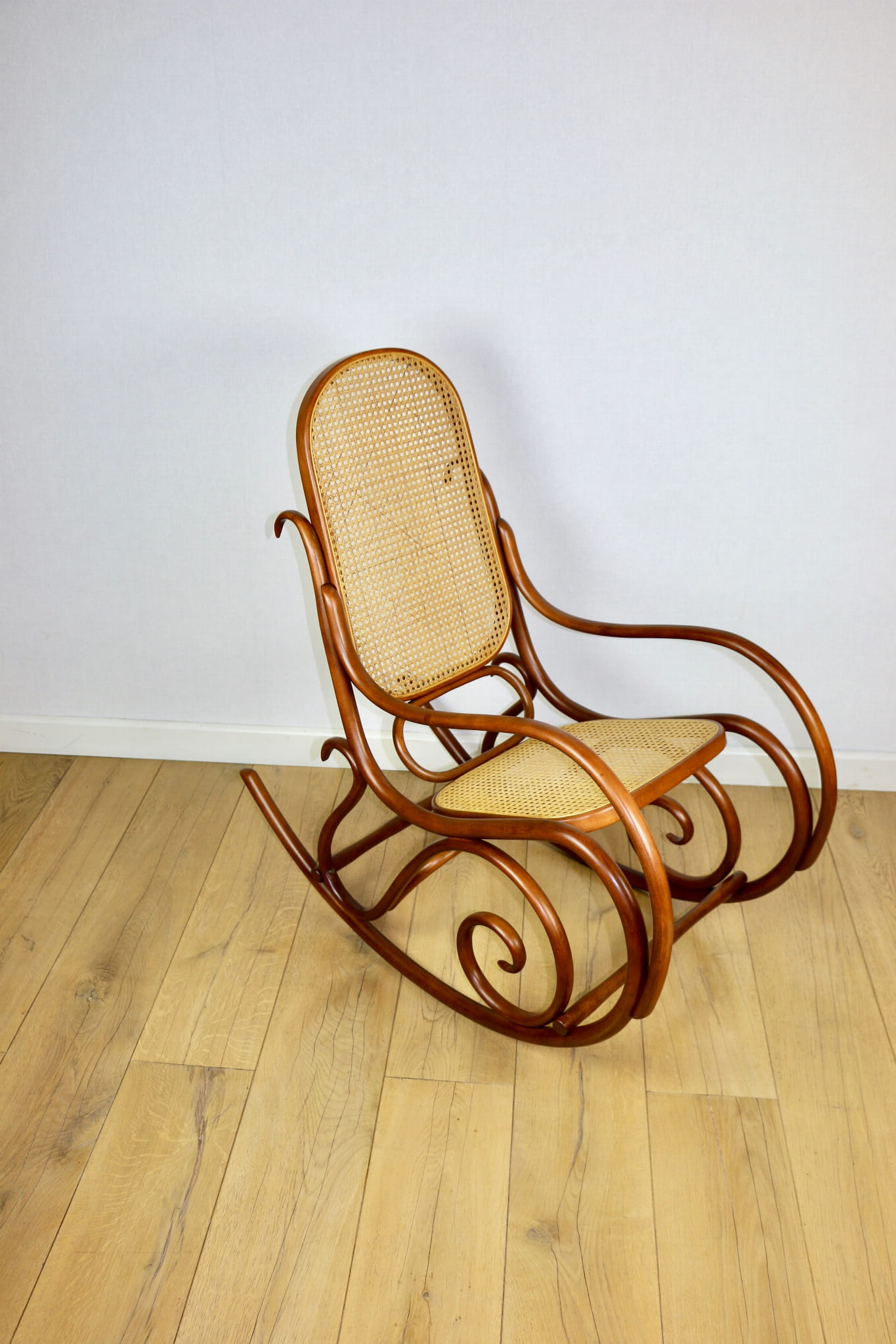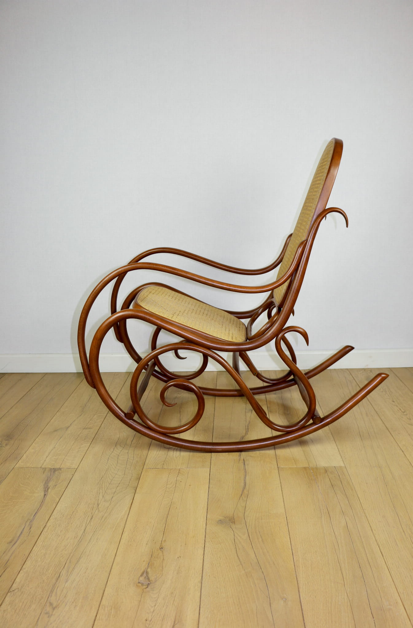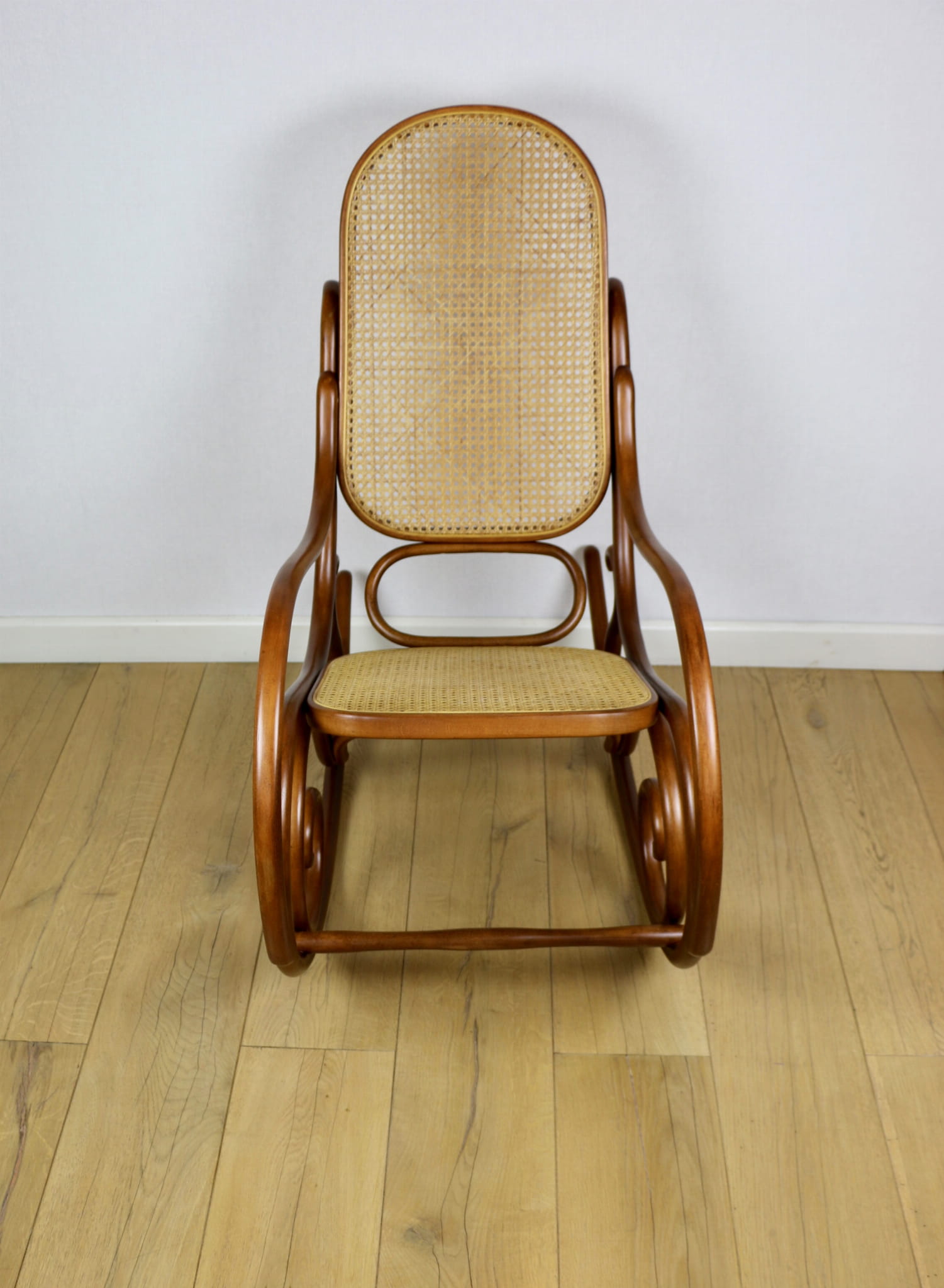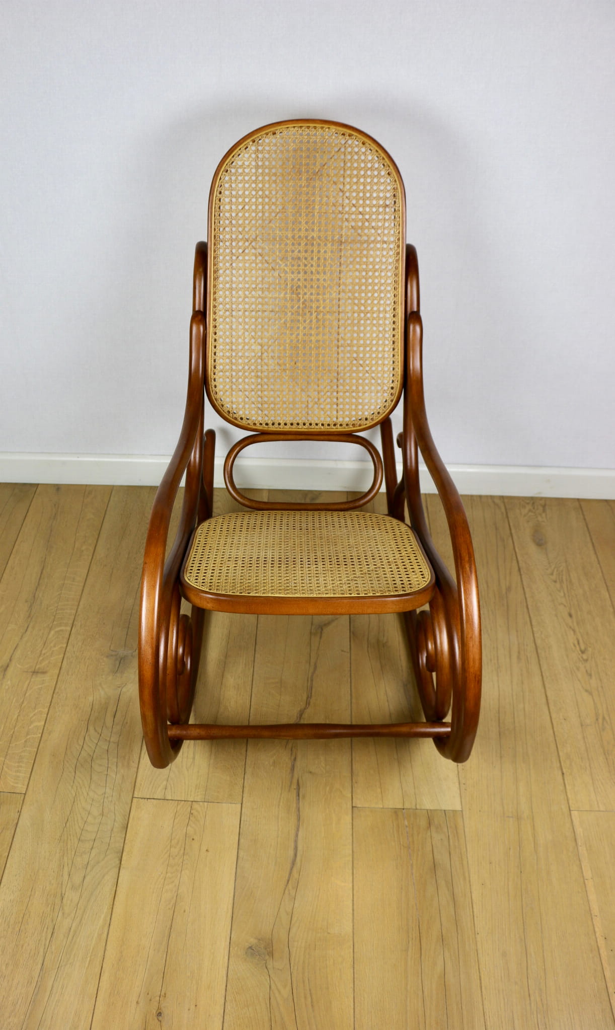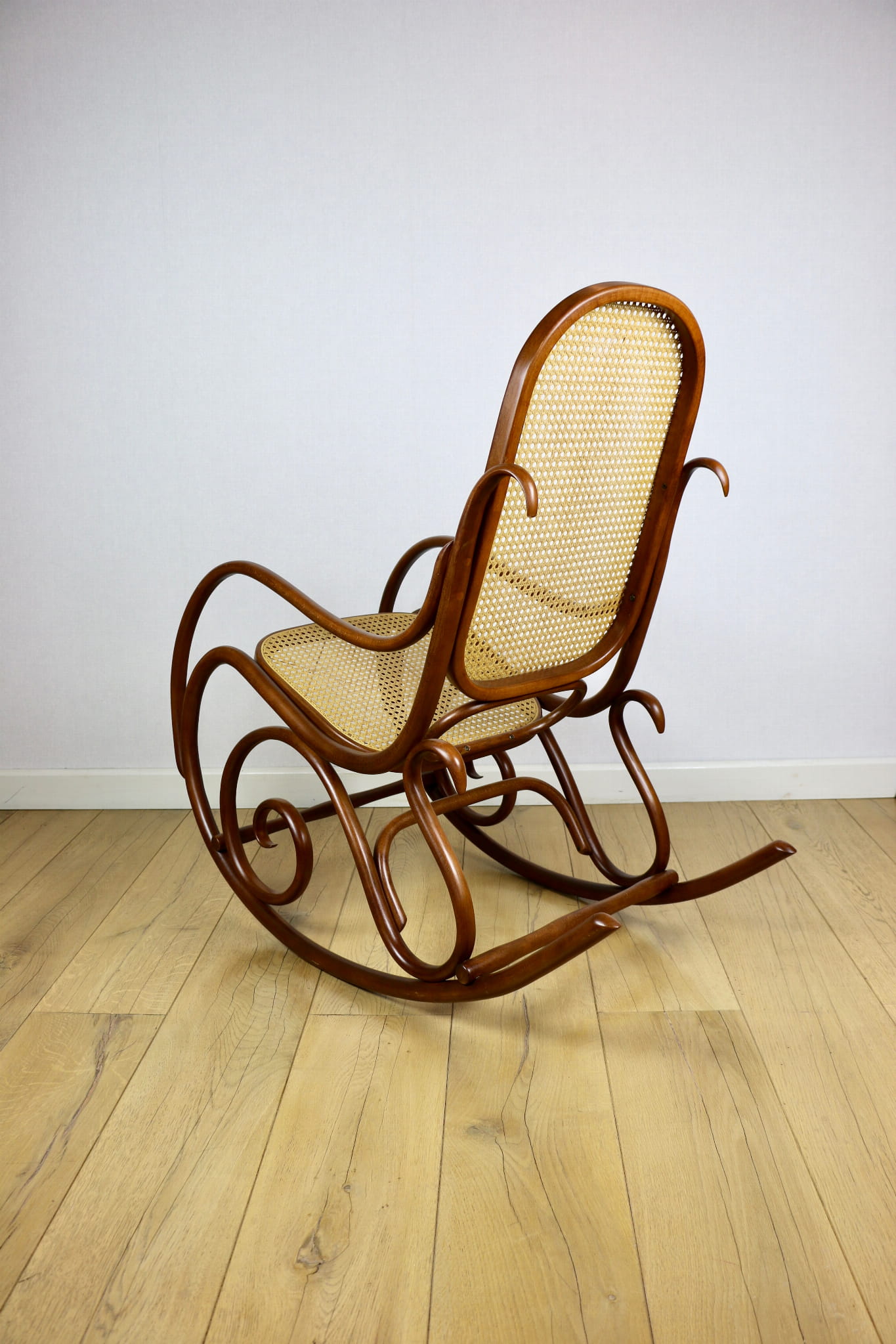 Fotel bujany na biegunach, lata 70 w kolorze brązowym. Oryginalny zachowany w idealnym w stanie. Siatka w oryginalnym stanie z naturalnej rafii. Drewno lakierowane po odświeżeniu. Przepiękny stan i kolor.