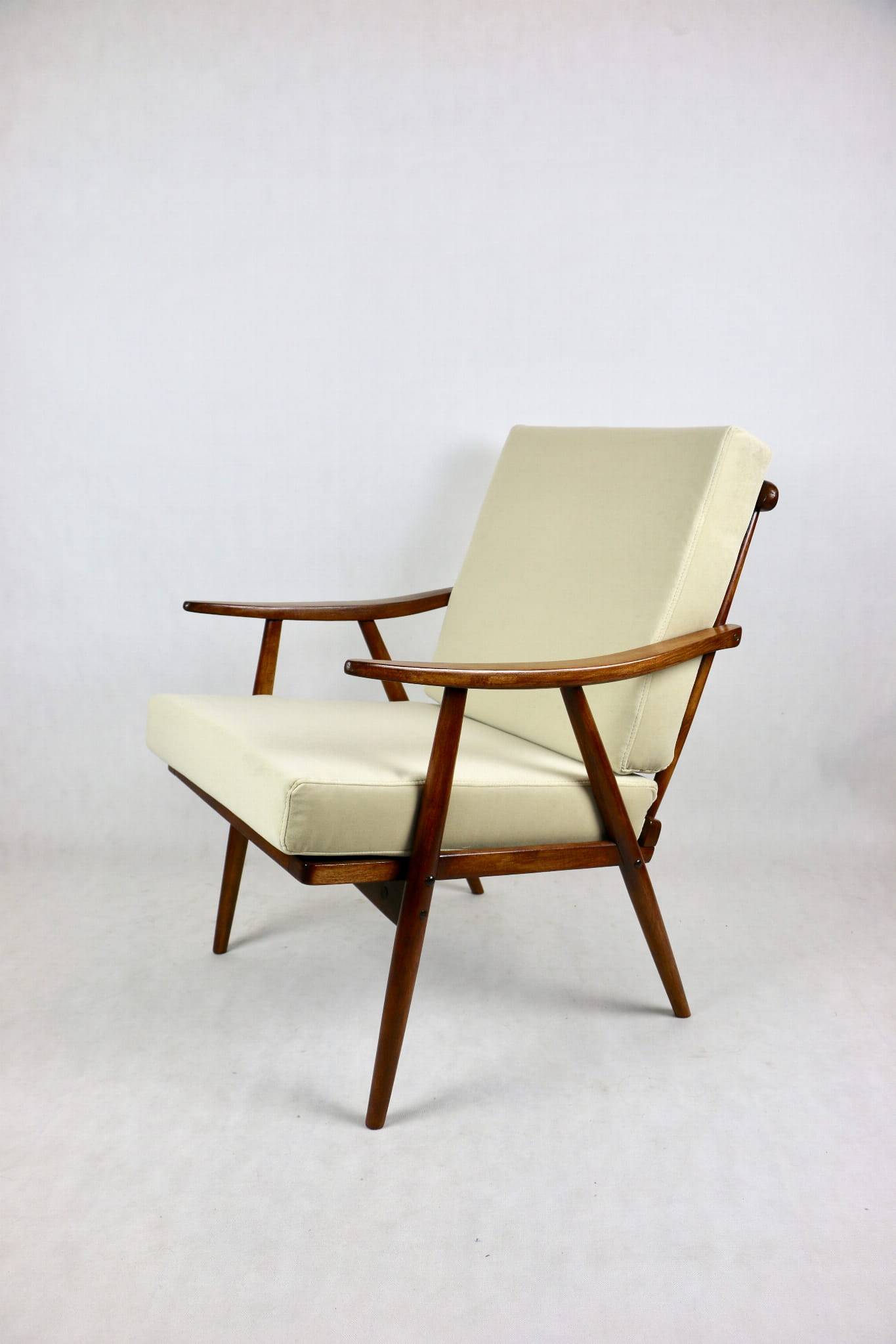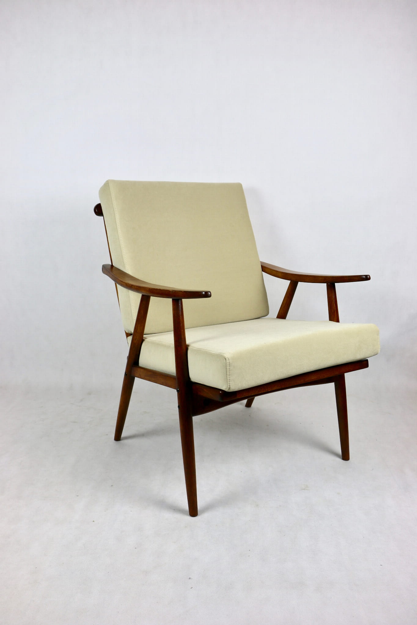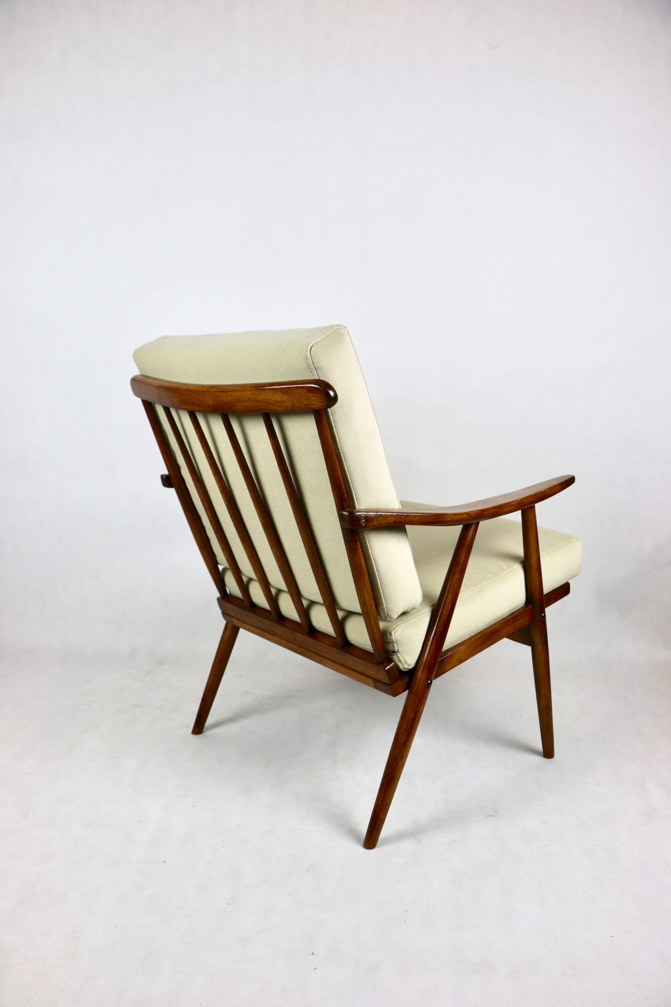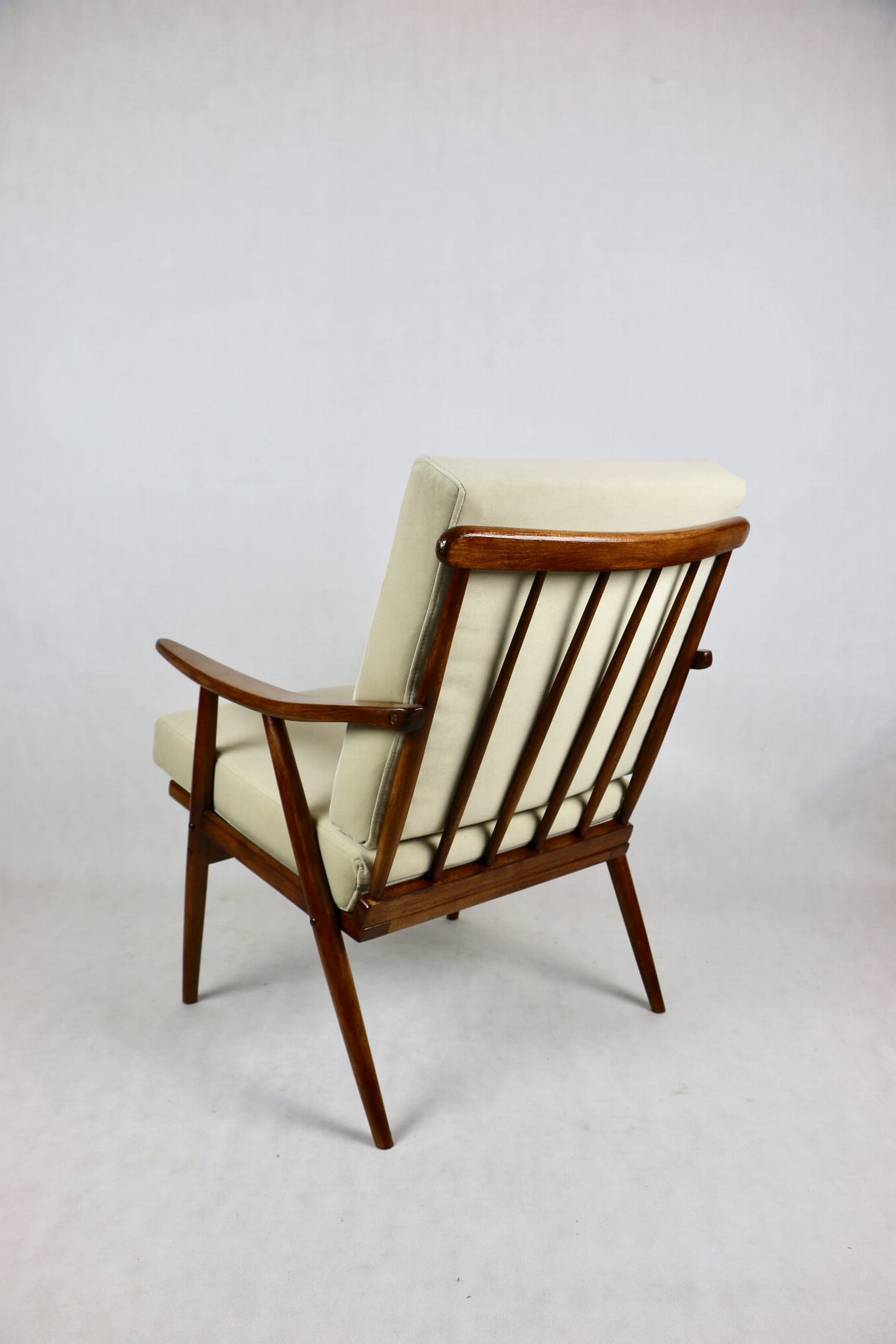 Przepiękny czeski fotel ze szczebelkami, kompletnie odrestaurowany. Nowa tapicerka wraz z wypełnieniem. Oparcie wraz z siedziskiem pokryte aksamitnym materiałem typu velvet z kolekcji Jade w kolorze beżowym - easy to clean.