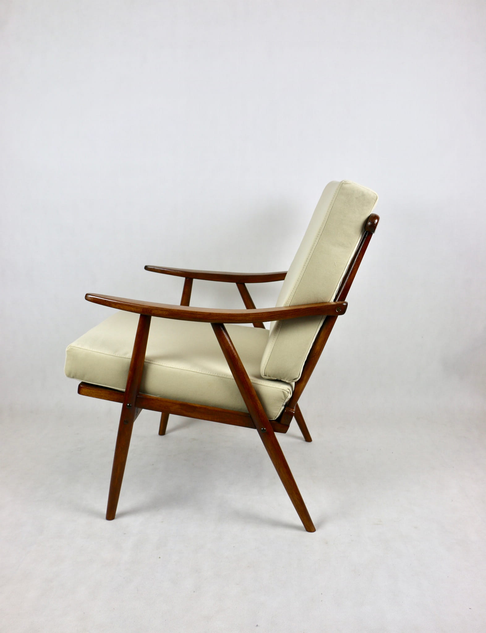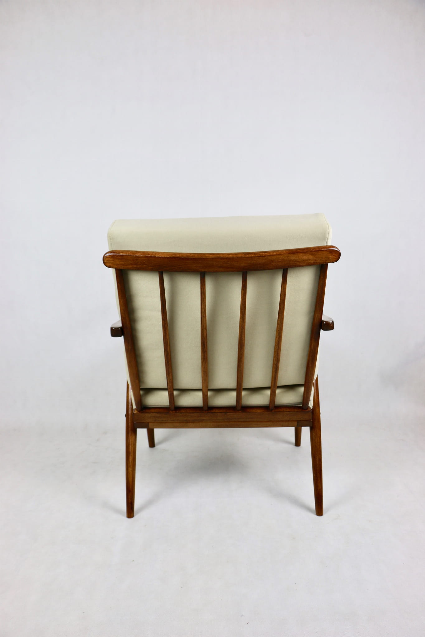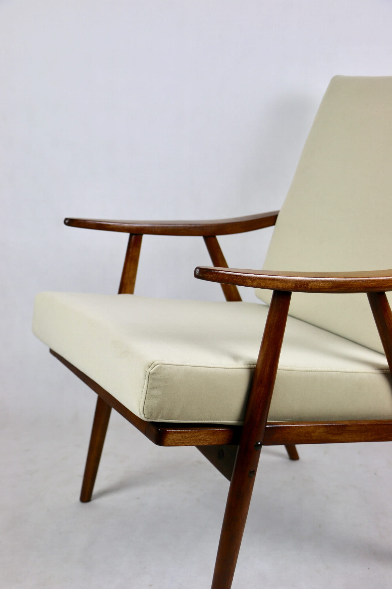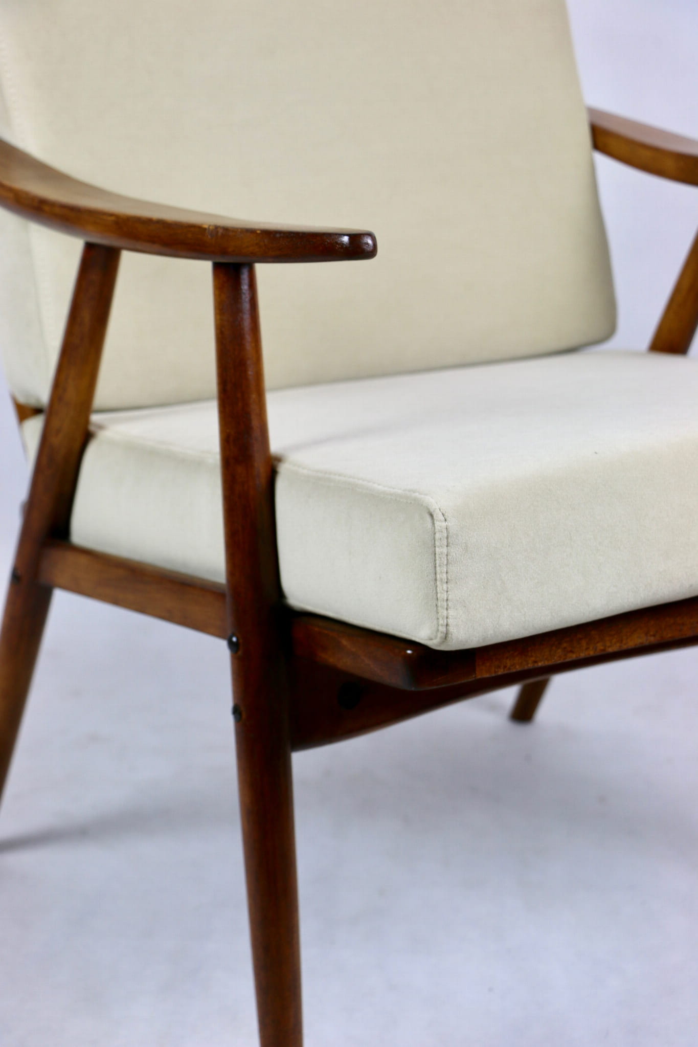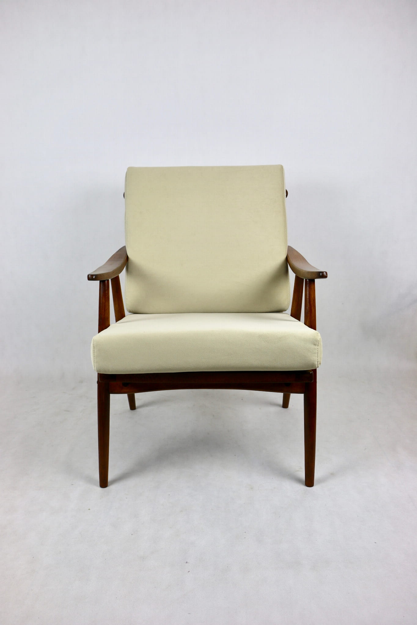 Przepiękny czeski fotel ze szczebelkami, kompletnie odrestaurowany. Nowa tapicerka wraz z wypełnieniem. Oparcie wraz z siedziskiem pokryte aksamitnym materiałem typu velvet z kolekcji Jade w kolorze beżowym - easy to clean.