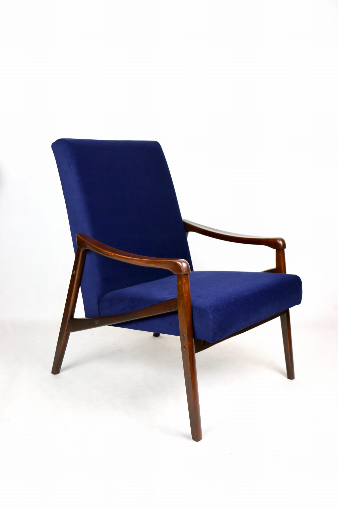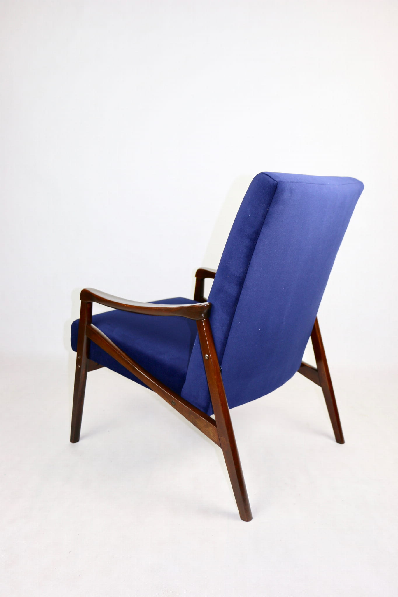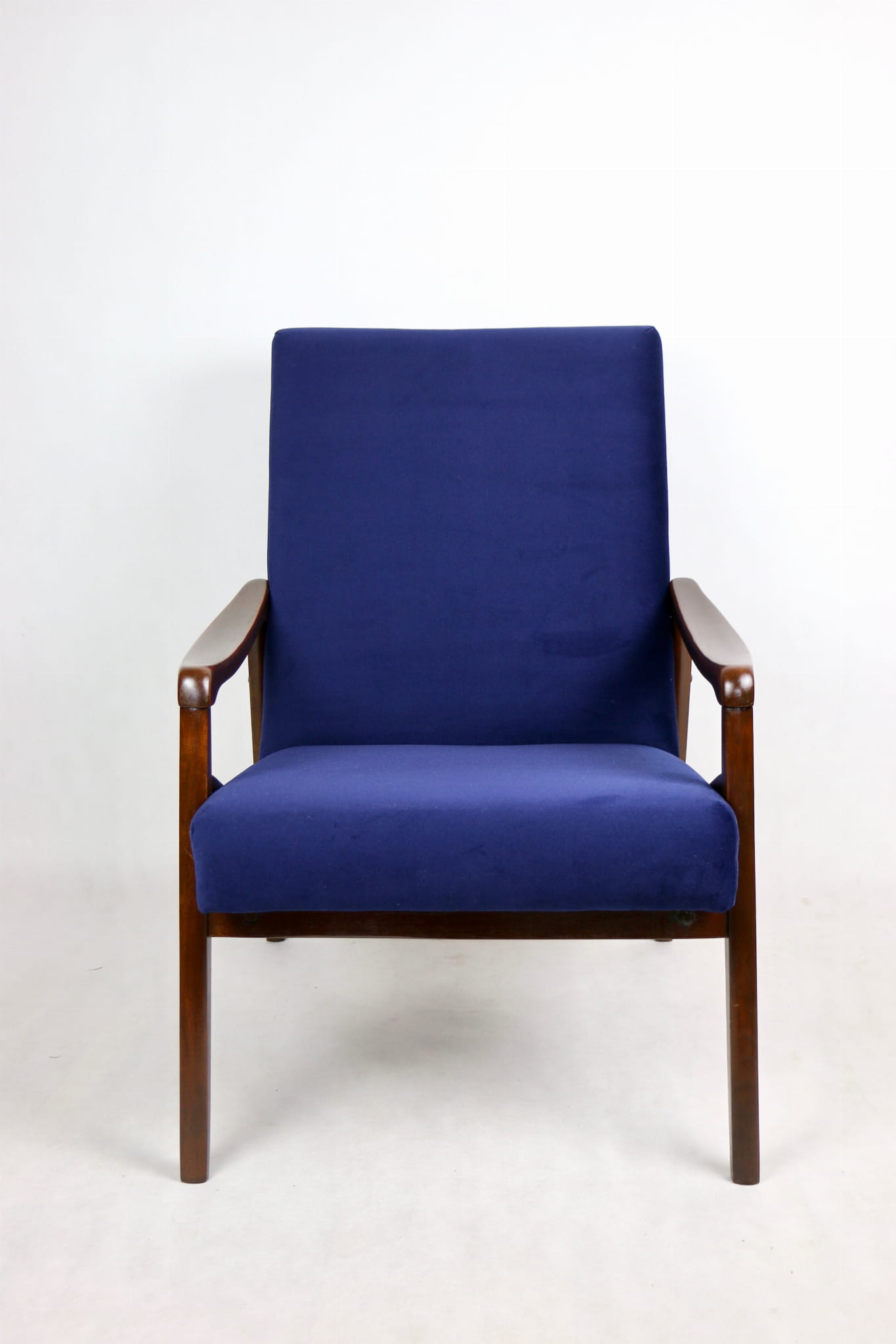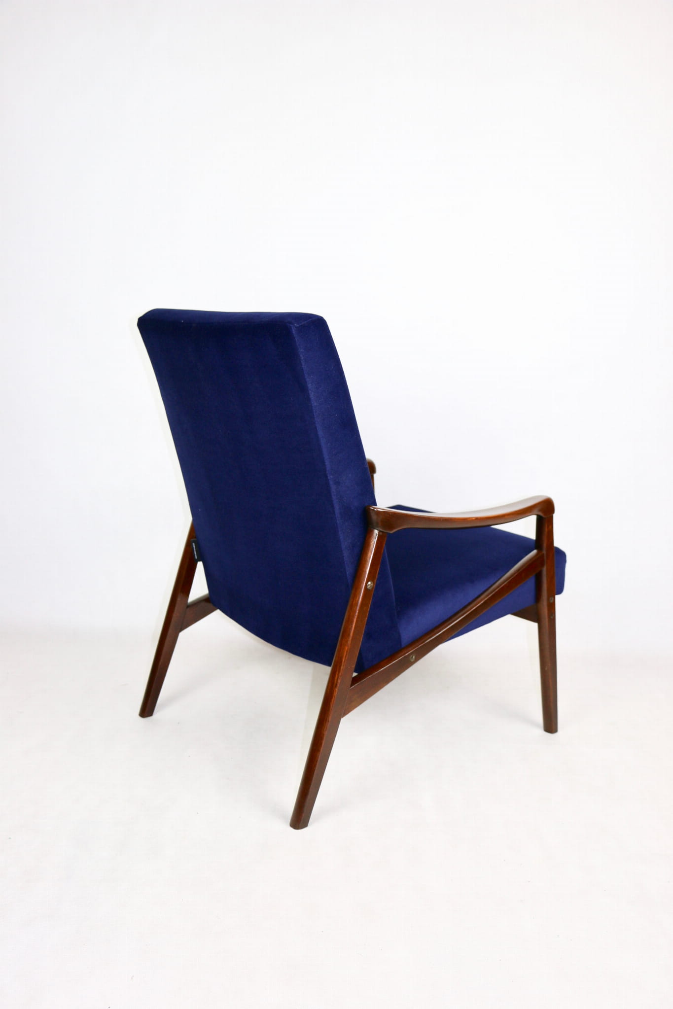 Przepiękny czeski fotel w stylu Vintage zaprojektowany przez Jiri Jiroutek, kompletnie odrestaurowany. Nowa tapicerka wraz z wypełnieniem. Oparcie wraz z siedziskiem pokryte aksamitnym materiałem typu velvet z kolekcji Jade w kolorze granatowym - navy blue.