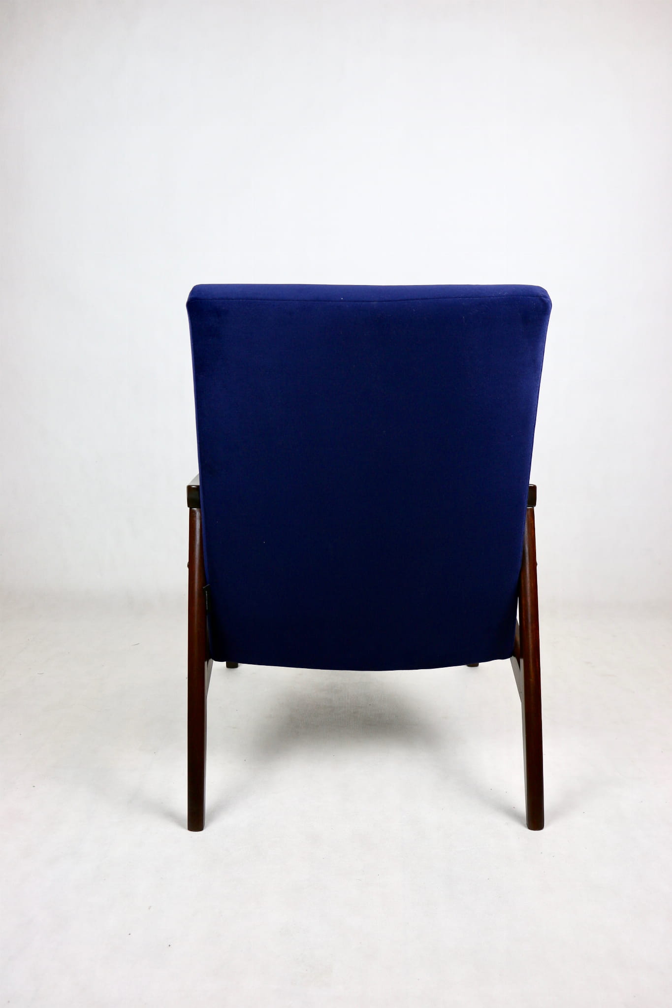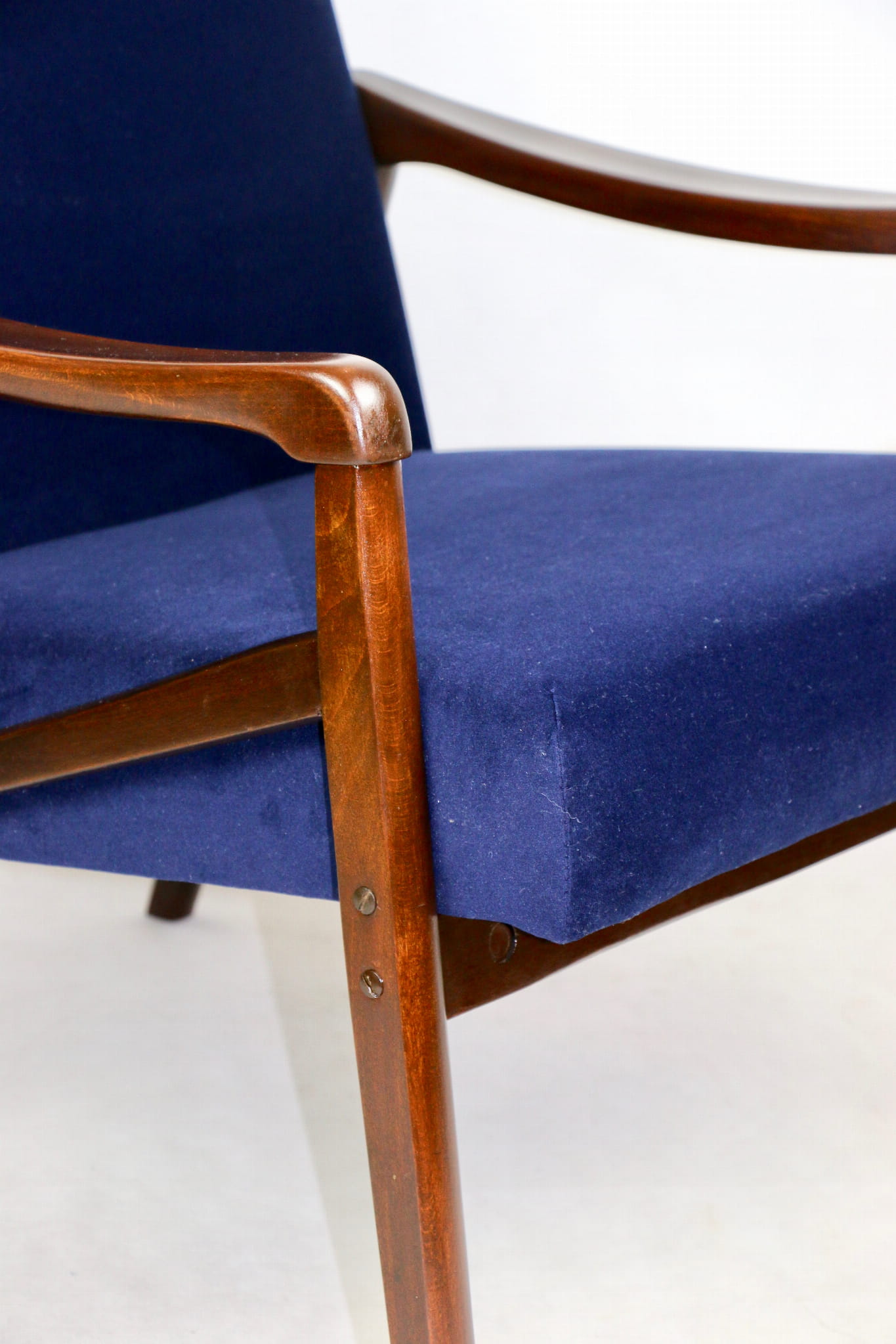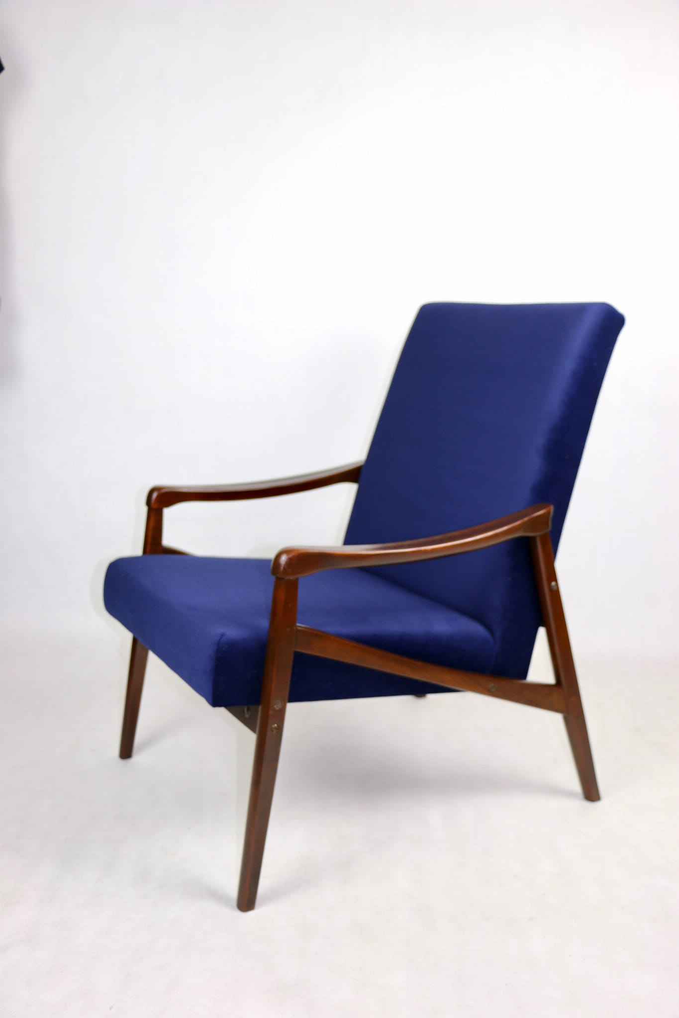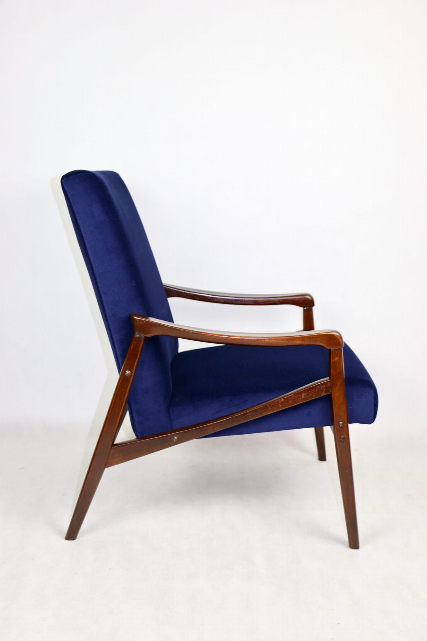 Przepiękny czeski fotel w stylu Vintage zaprojektowany przez Jiri Jiroutek, kompletnie odrestaurowany. Nowa tapicerka wraz z wypełnieniem. Oparcie wraz z siedziskiem pokryte aksamitnym materiałem typu velvet z kolekcji Jade w kolorze granatowym - navy blue.