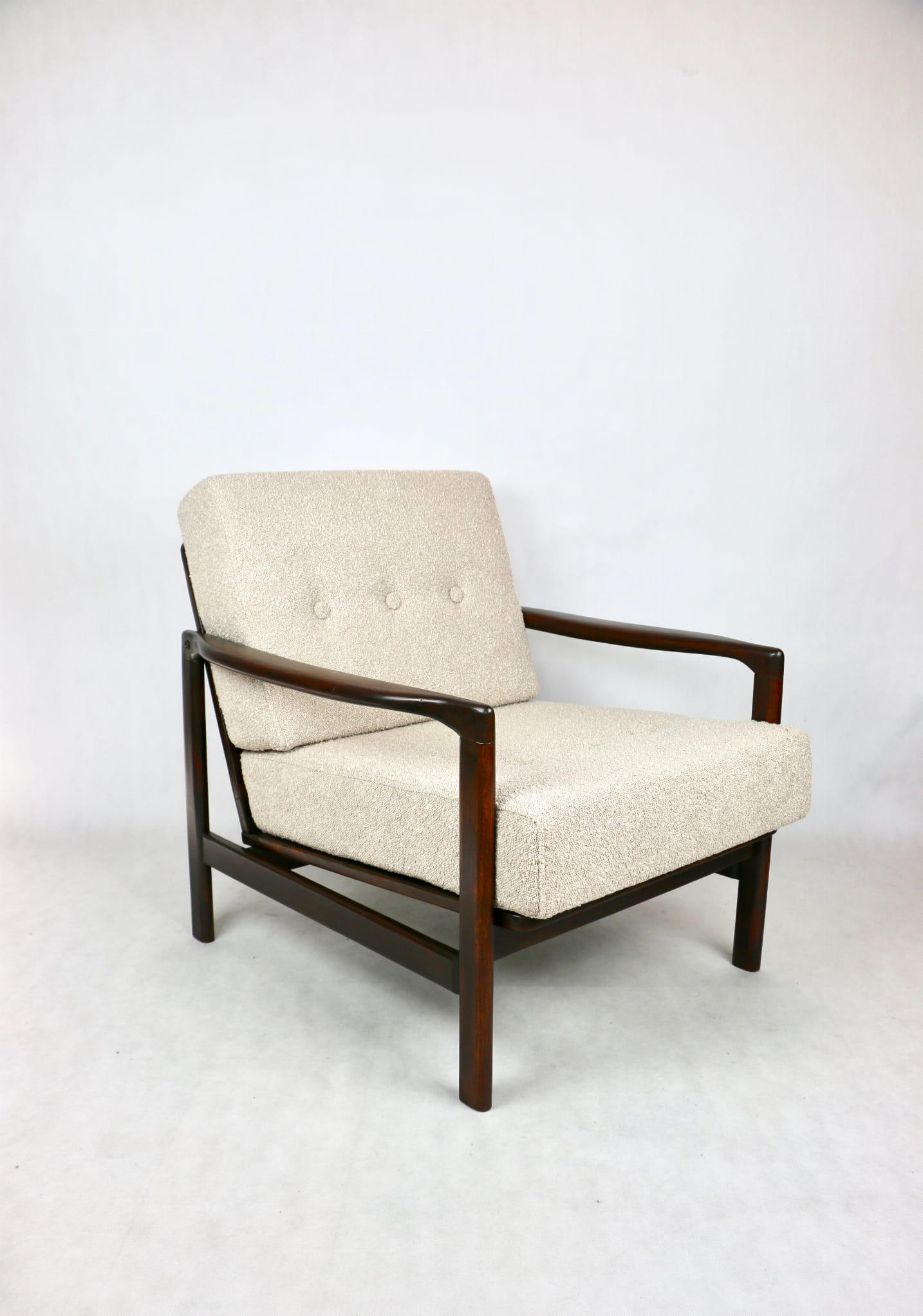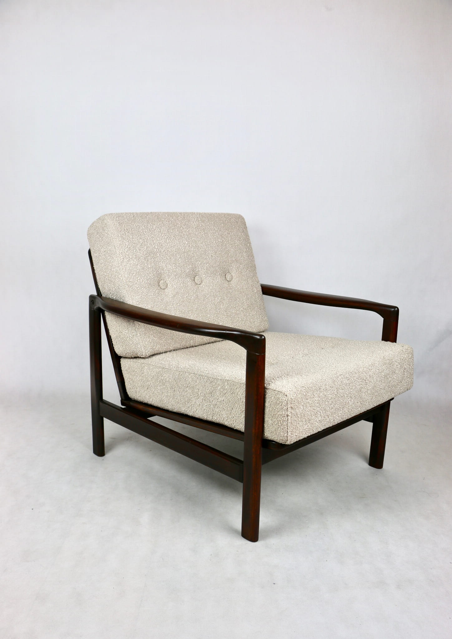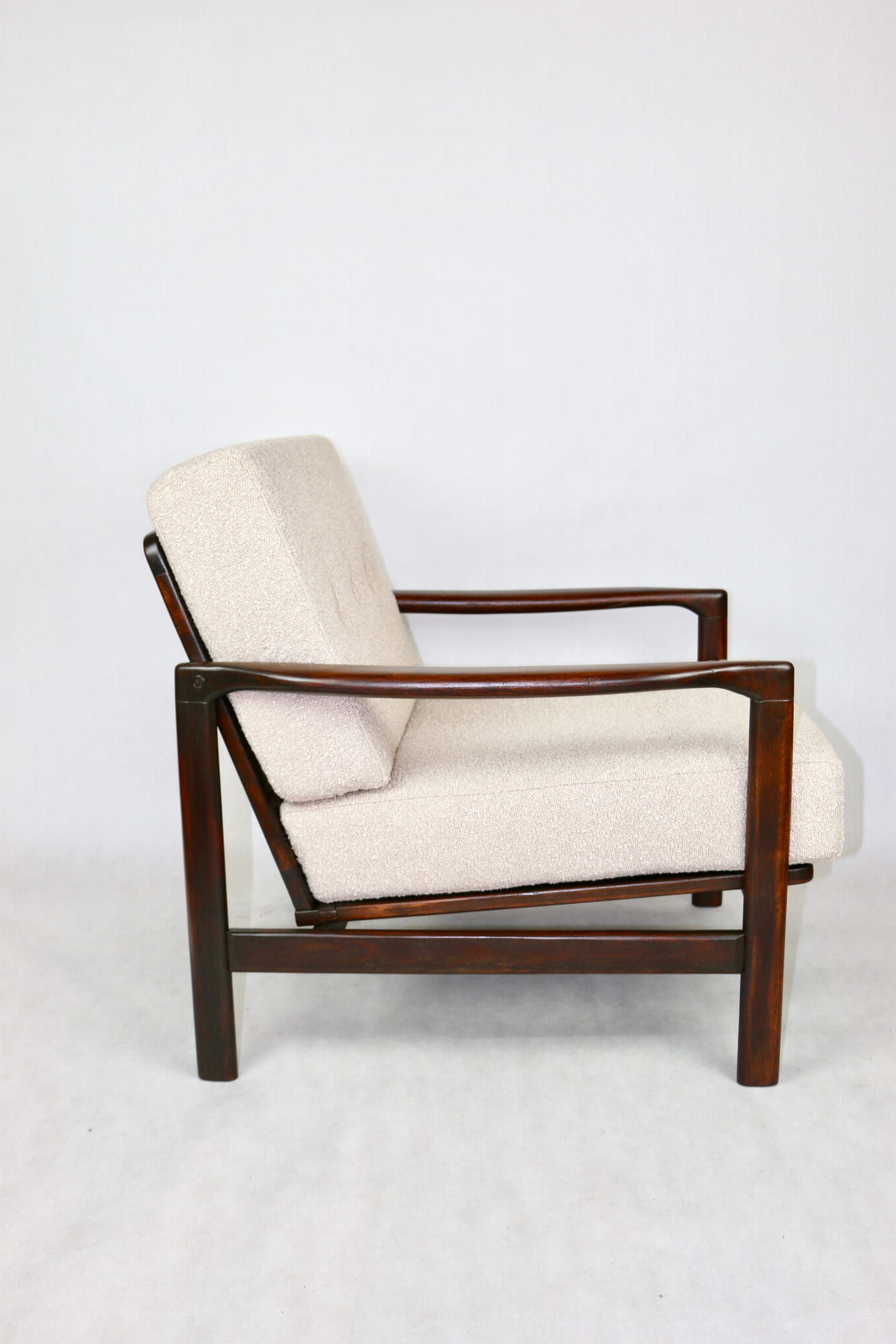 Fotel drewniany Projektu Zenona Bączyk - brąz Vintage beżowy boucle