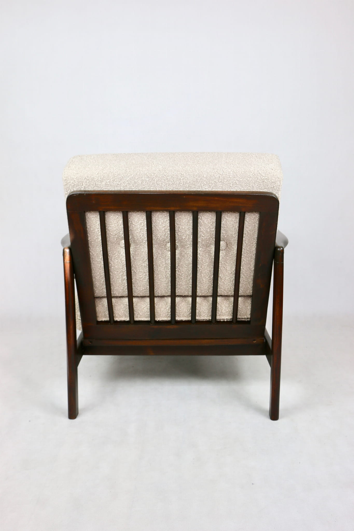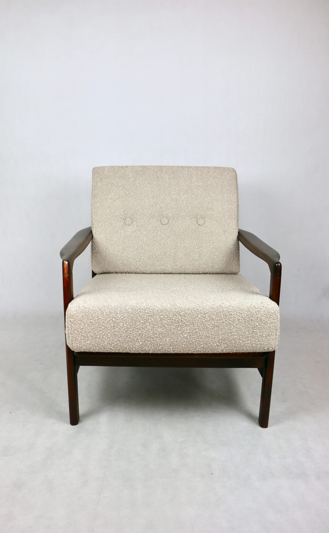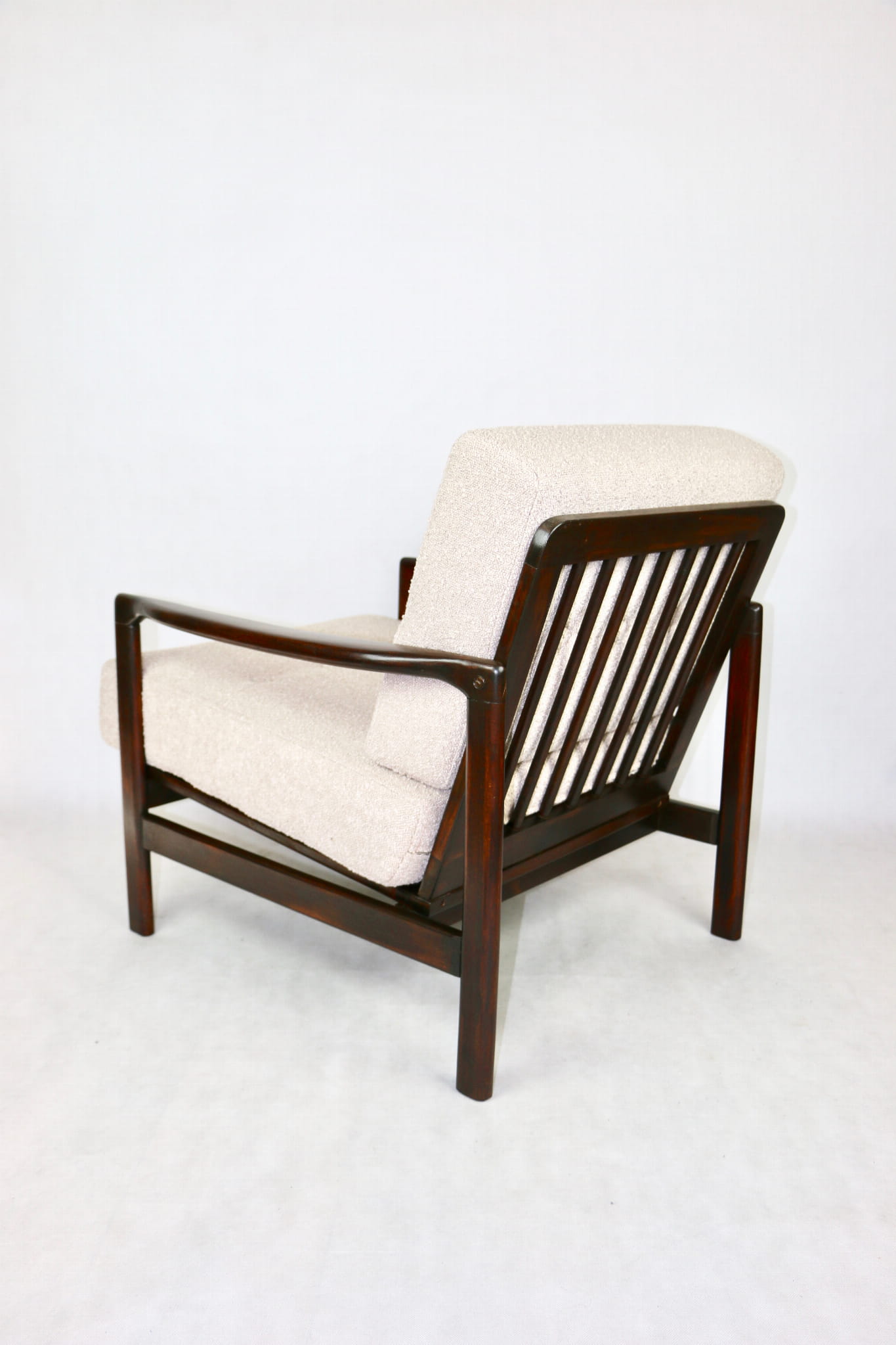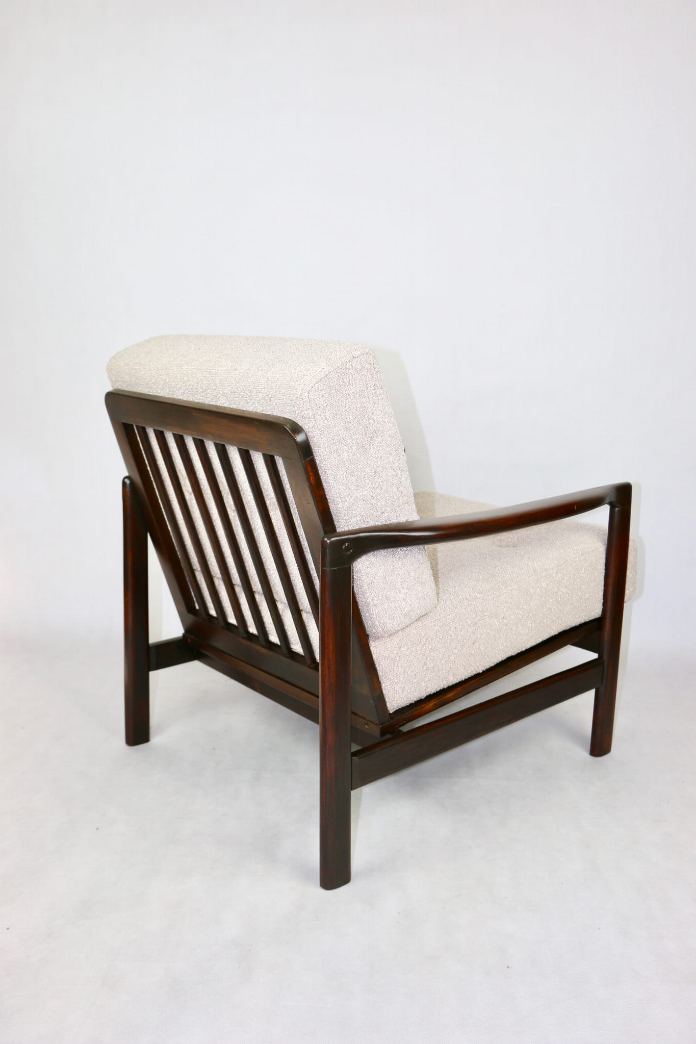 Fotel drewniany Projektu Zenona Bączyk - brąz Vintage beżowy boucle