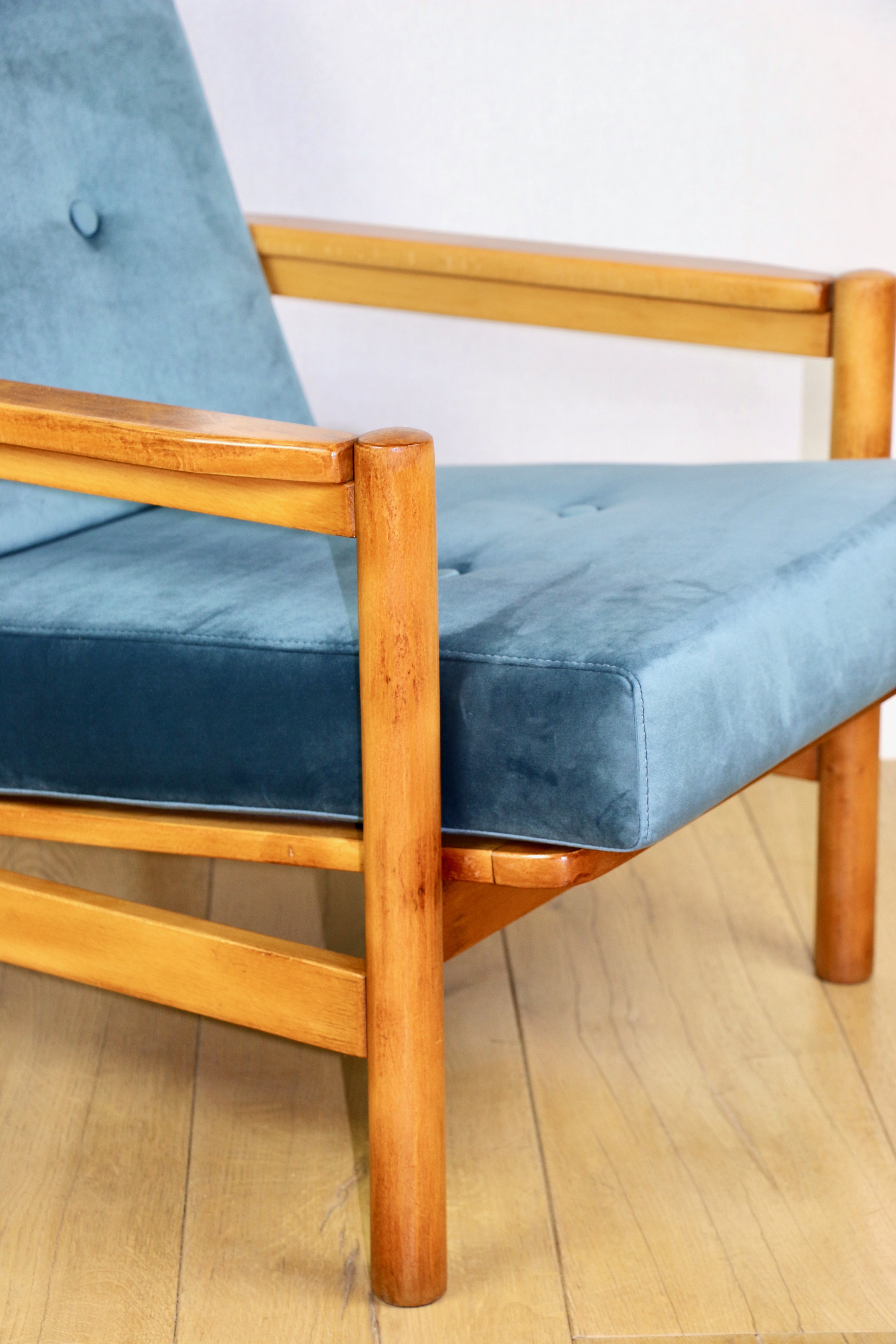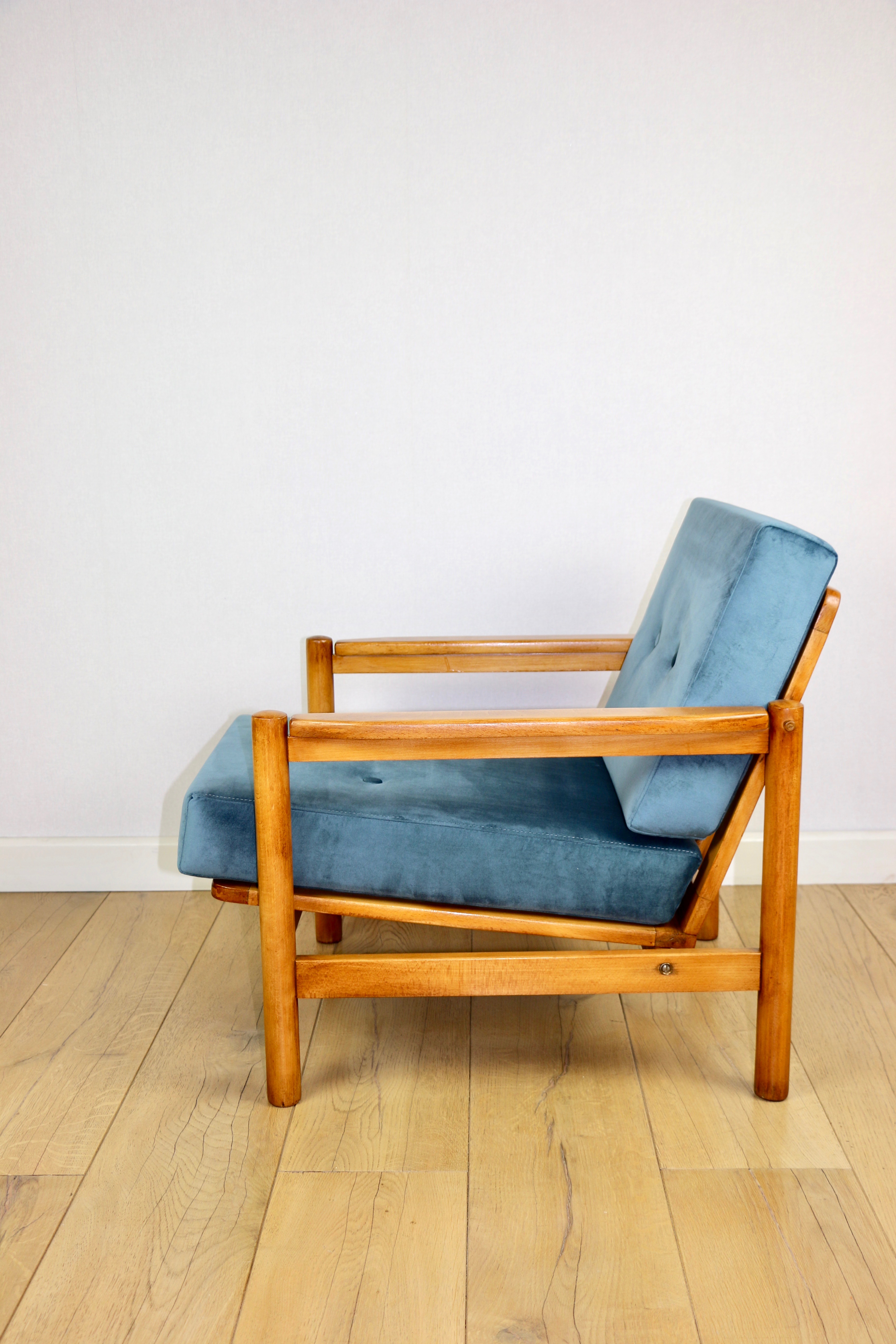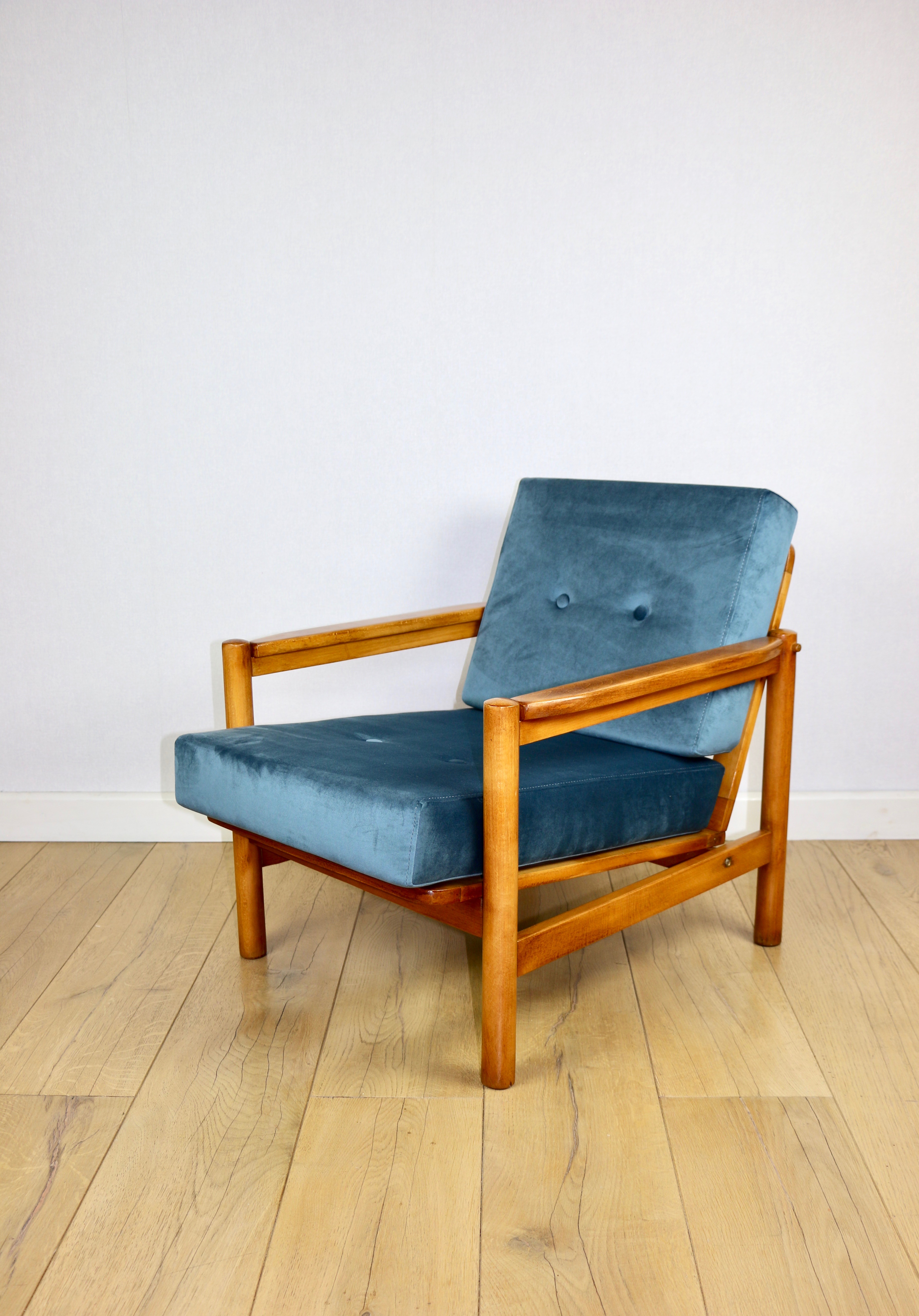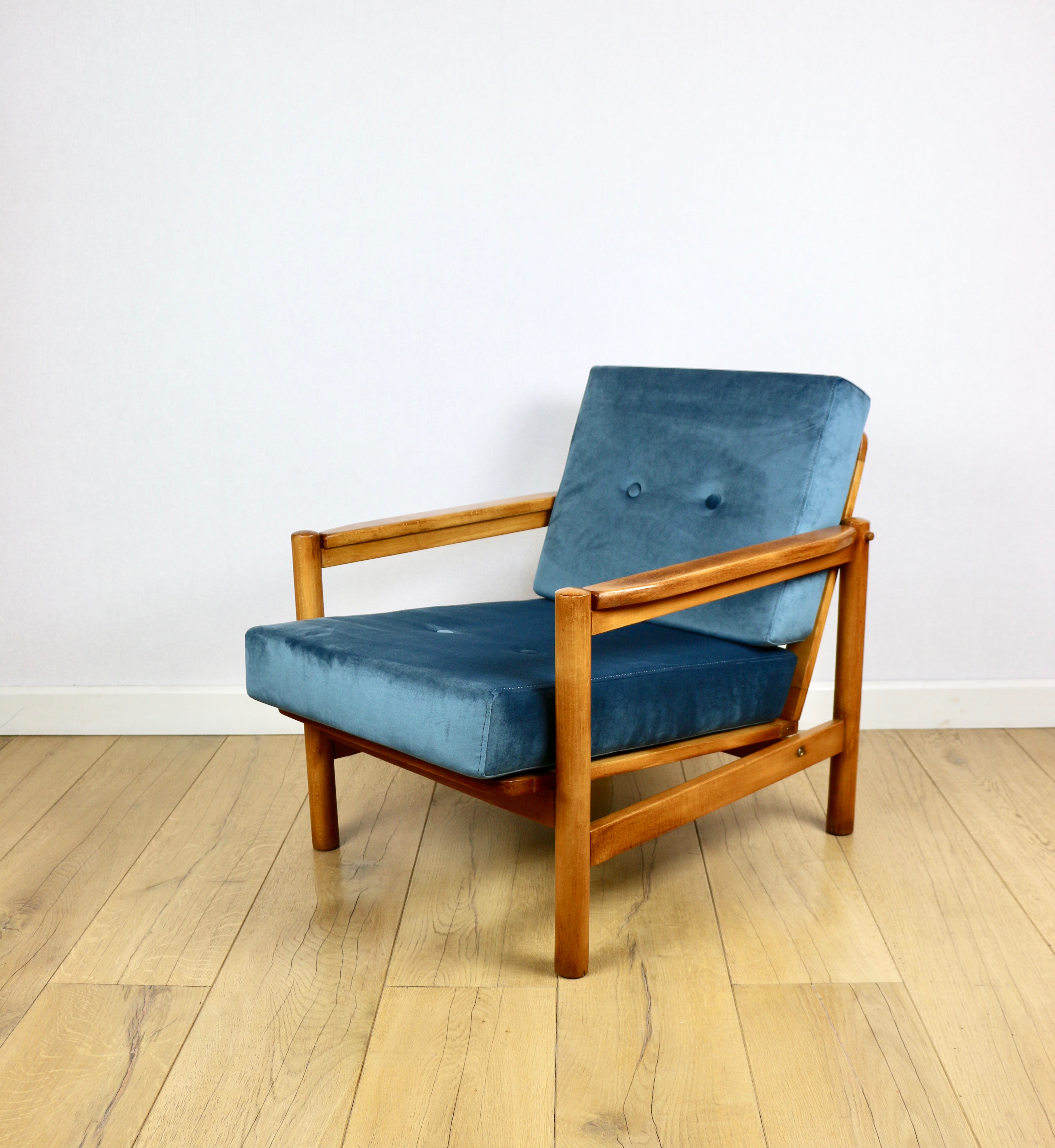 Fotel lata 70 Projektu Z. Bączyk na zdejmowanych poduchach. Kompletnie odrestaurowany. Nowe grube siedzisko wraz z oparciem pokryte najwyższej jakości materiałem tapicerskim typu welwet w kolorze morskim. Stelaż drewniany połączony z podłokietnikami w jasnym kolorze drewna bukowego.