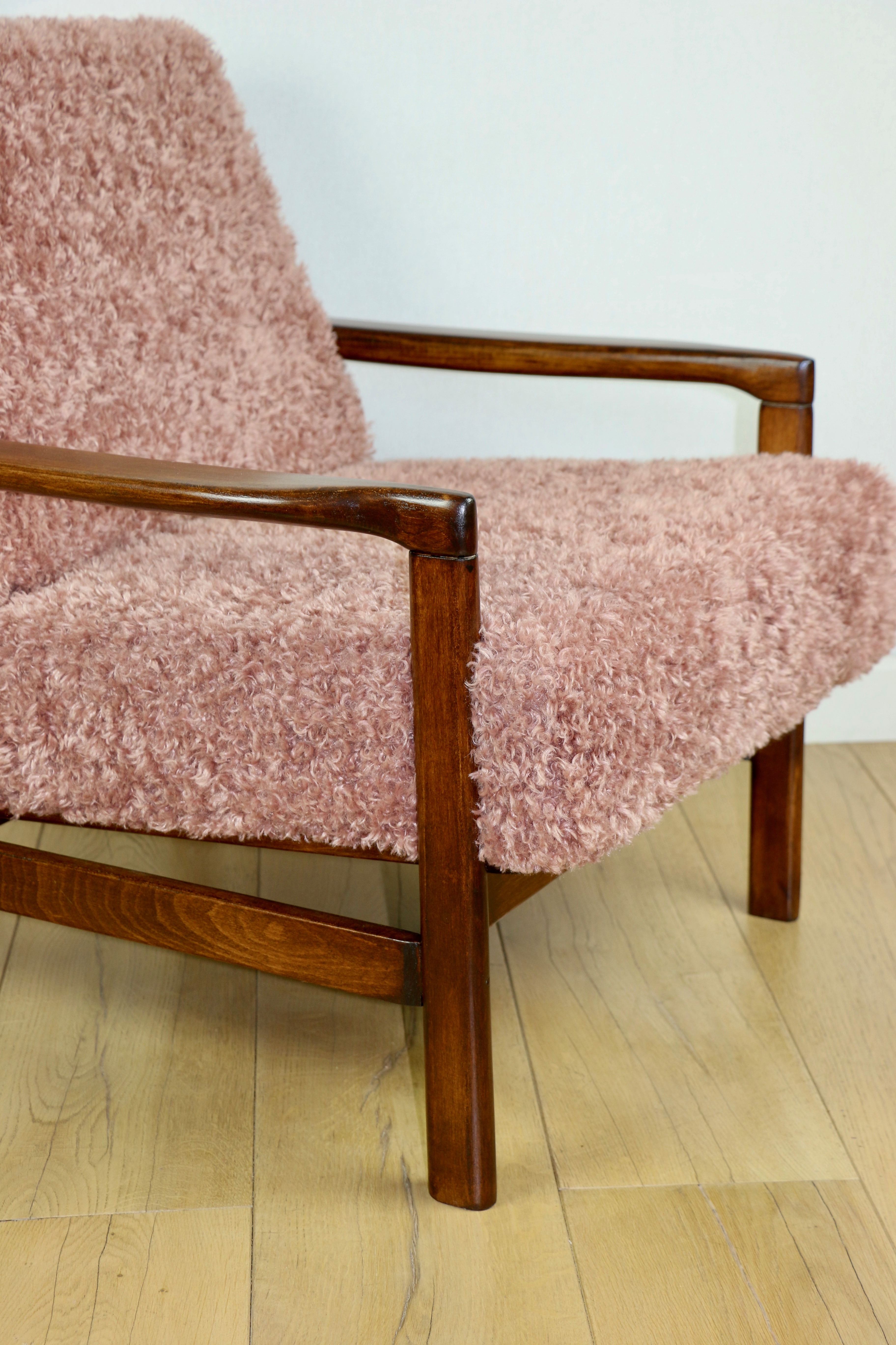 Fotel z lat 70 projektu Z. Bączyk na zdejmowanych poduchach. Kompletnie odrestaurowany. Nowe grube siedzisko wraz z oparciem pokryte najwyższej jakości materiałem tapicerskim o długim włosiu w kolorze różu - różowym. Stelaż drewniany połączony z podłokietnikami w kolorze brązu - orzecha.