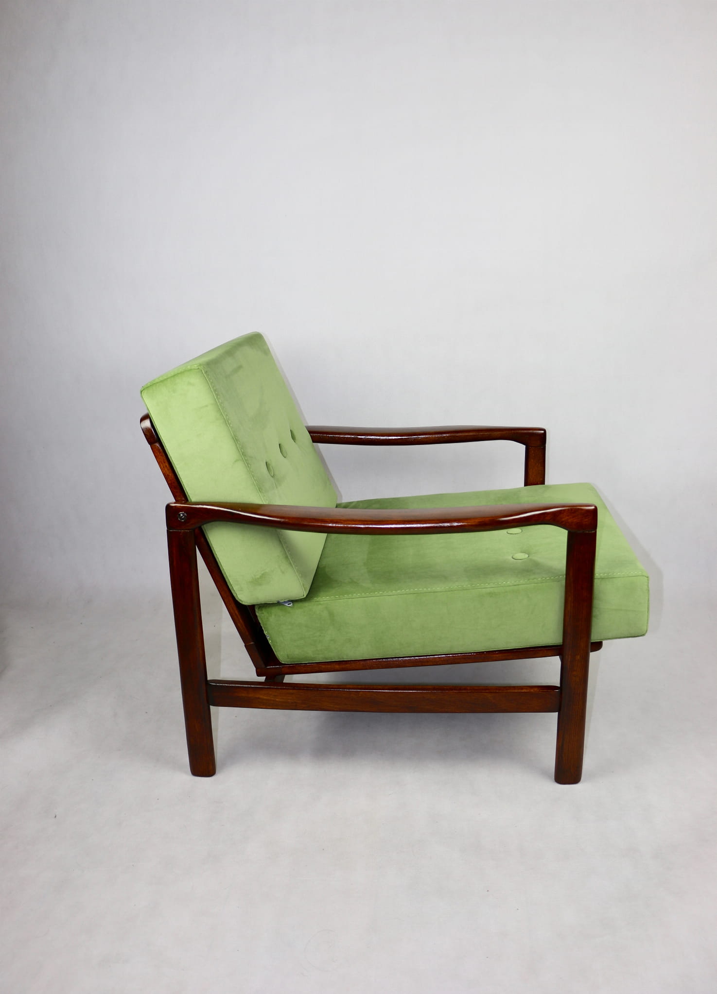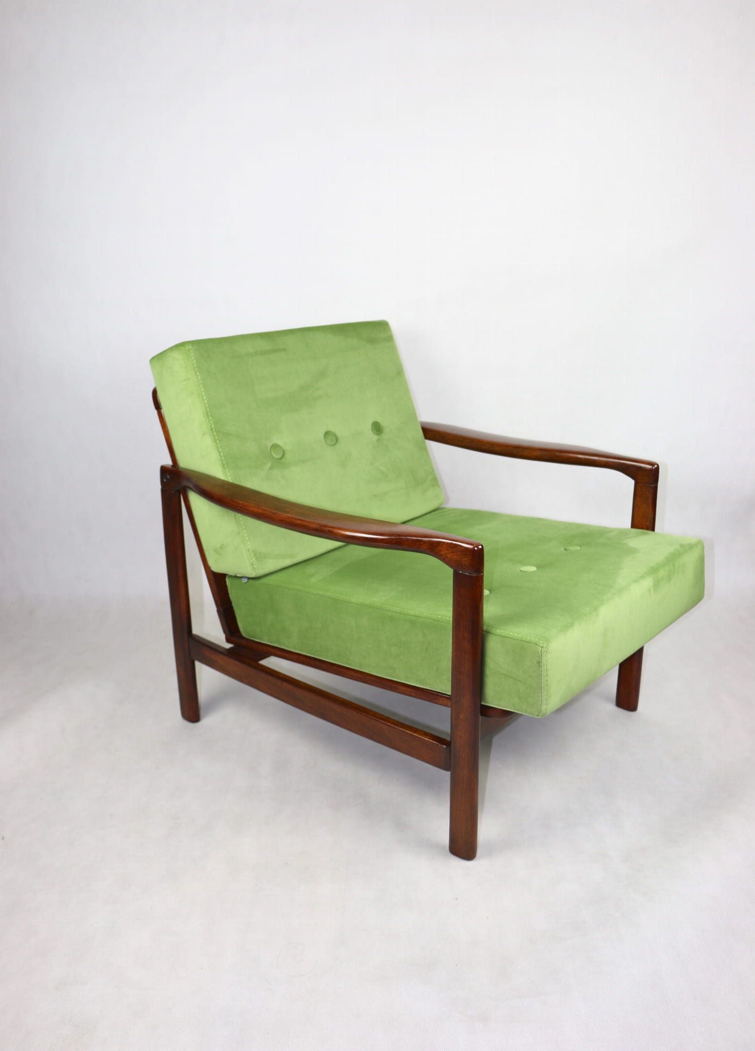 Fotel z lat 70 projektu Z. Bączyk na zdejmowanych poduchach. Kompletnie odrestaurowany. Nowe grube siedzisko wraz z oparciem pokryte najwyższej jakości materiałem tapicerskim typu welwet w kolorze zielonym groszkowym - seria Paris. Stelaż drewniany połączony z podłokietnikami w kolorze brązu.