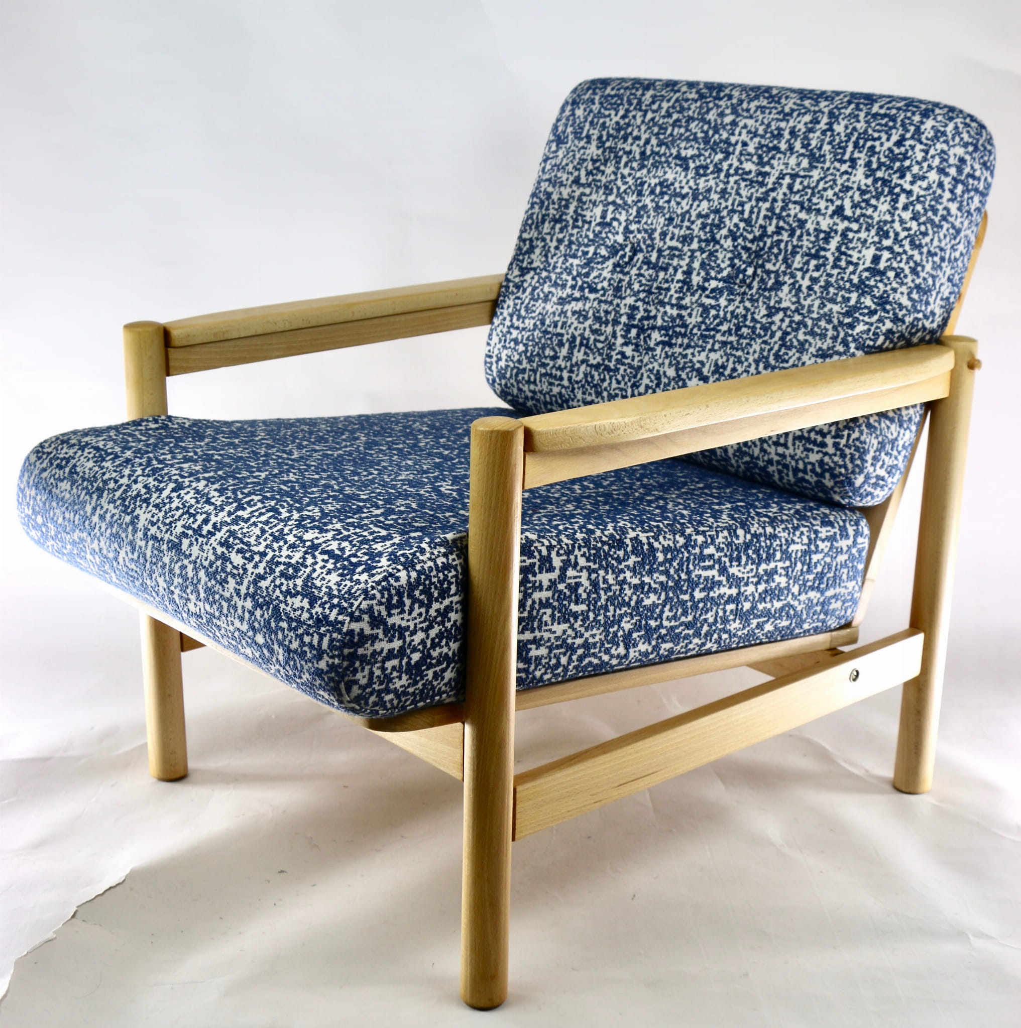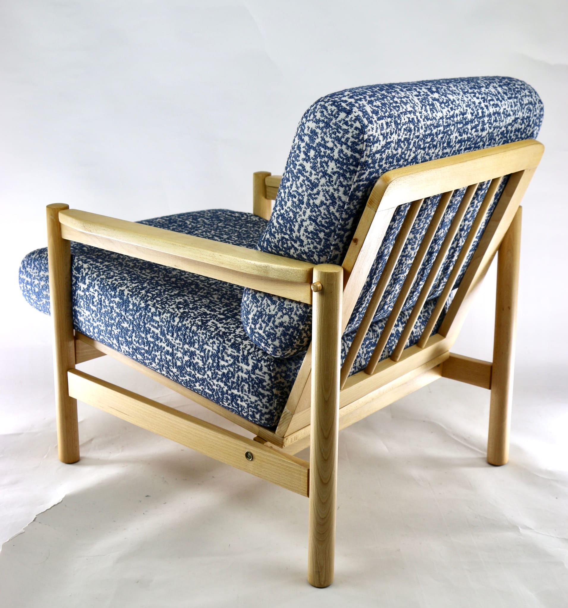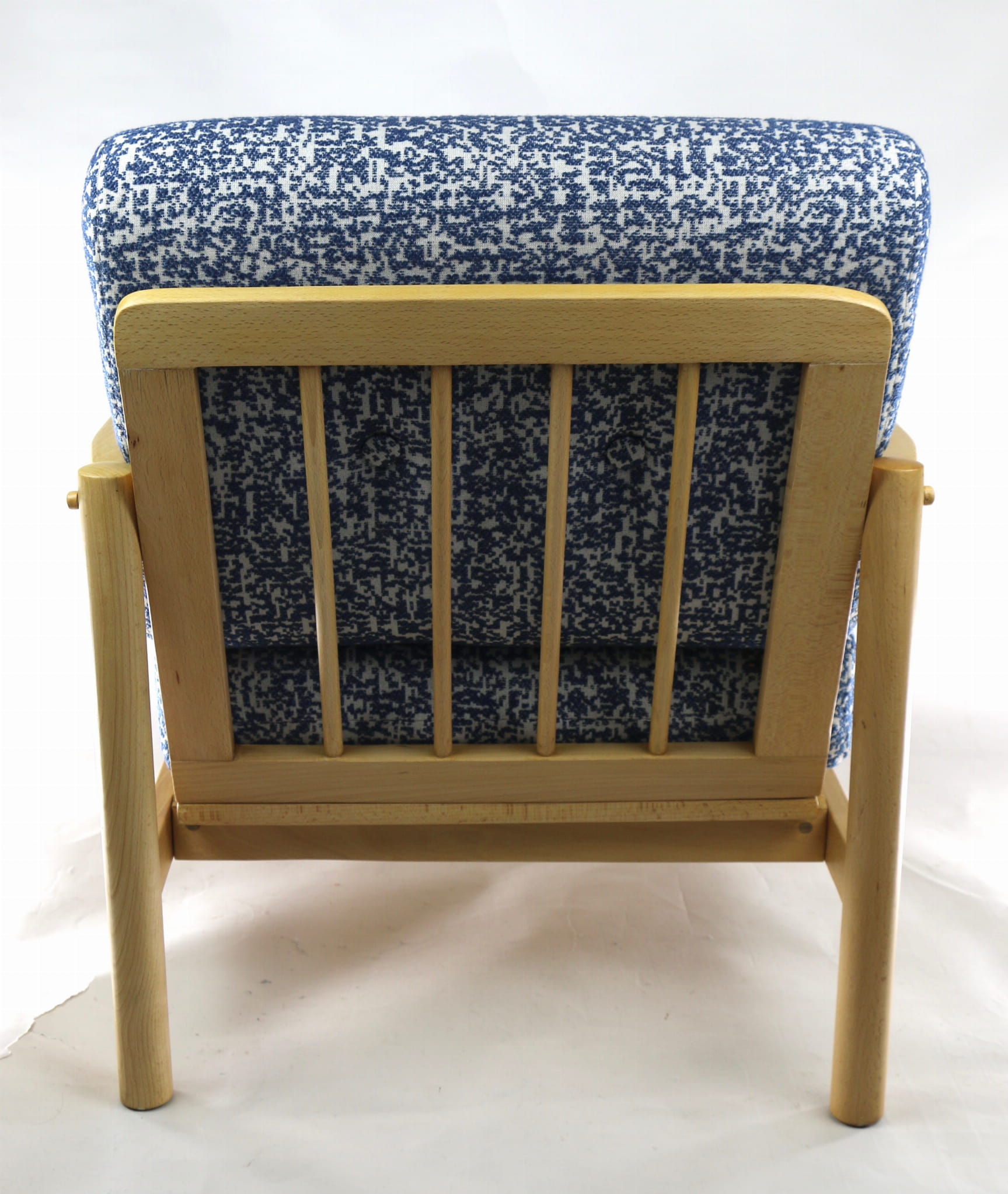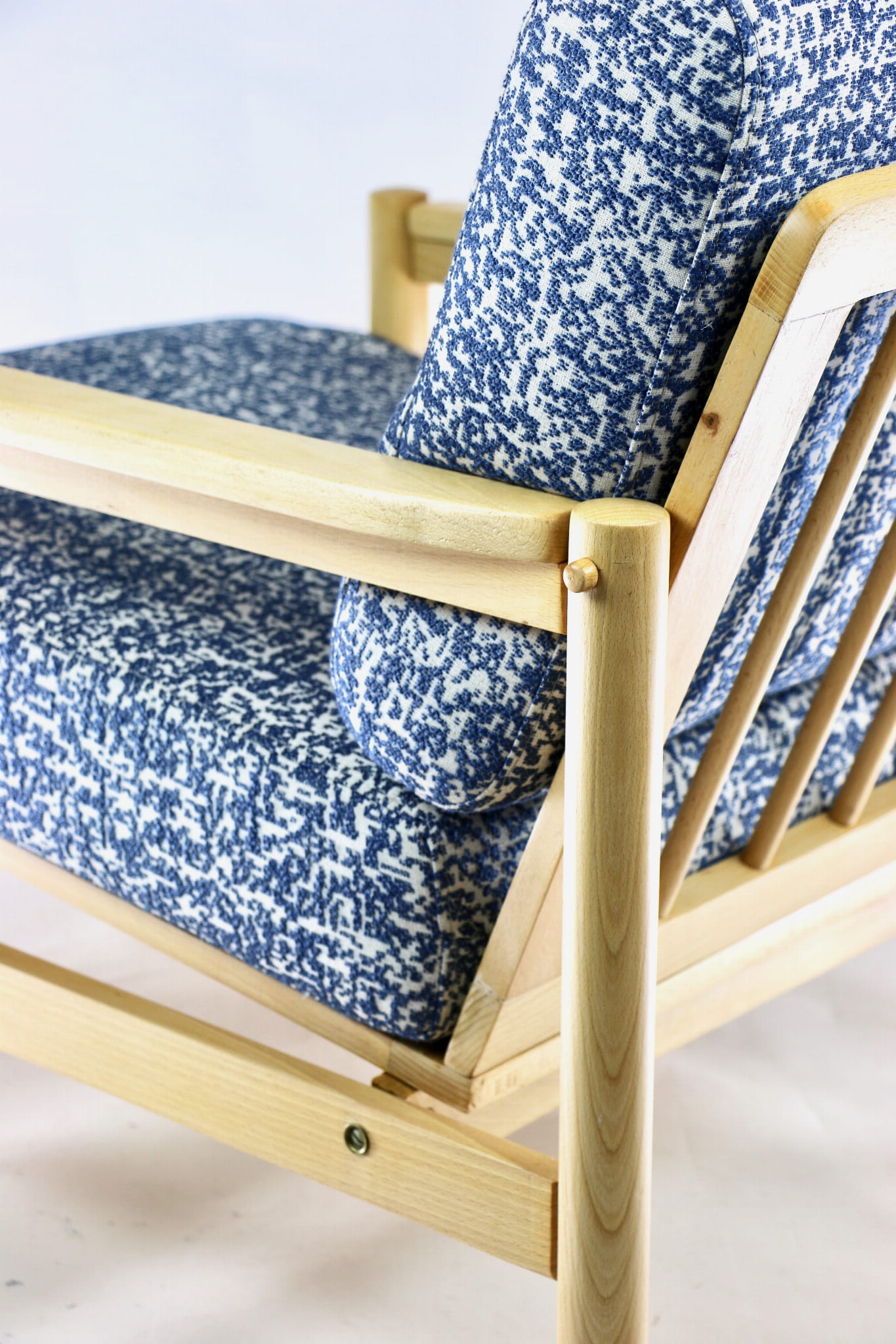 Fotel lata 70 na zdejmowanych poduchach. Kompletnie odrestaurowany. Nowe grube siedzisko wraz z oparciem pokryte najwyższej jakości naturalnym materiałem tapicerskim w kolorze granatowo -białym. Stelaż drewniany połączony z podłokietnikami w kolorze naturalnego jasnego buku. Wymiary: wysokość: 73 cm | szerokość : 61 cm | głębokość: 80 cm | głębokość siedziska: 50 cm | szerokość siedziska: 48 cm | wysokość siedziska: 40 cm | wysokość podłokietnika: 52 cm
