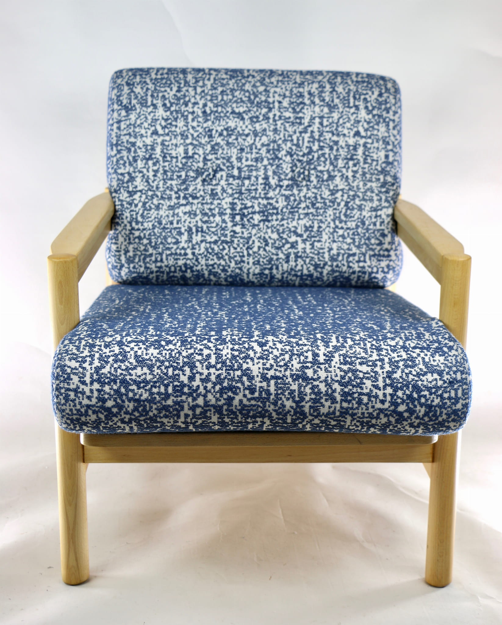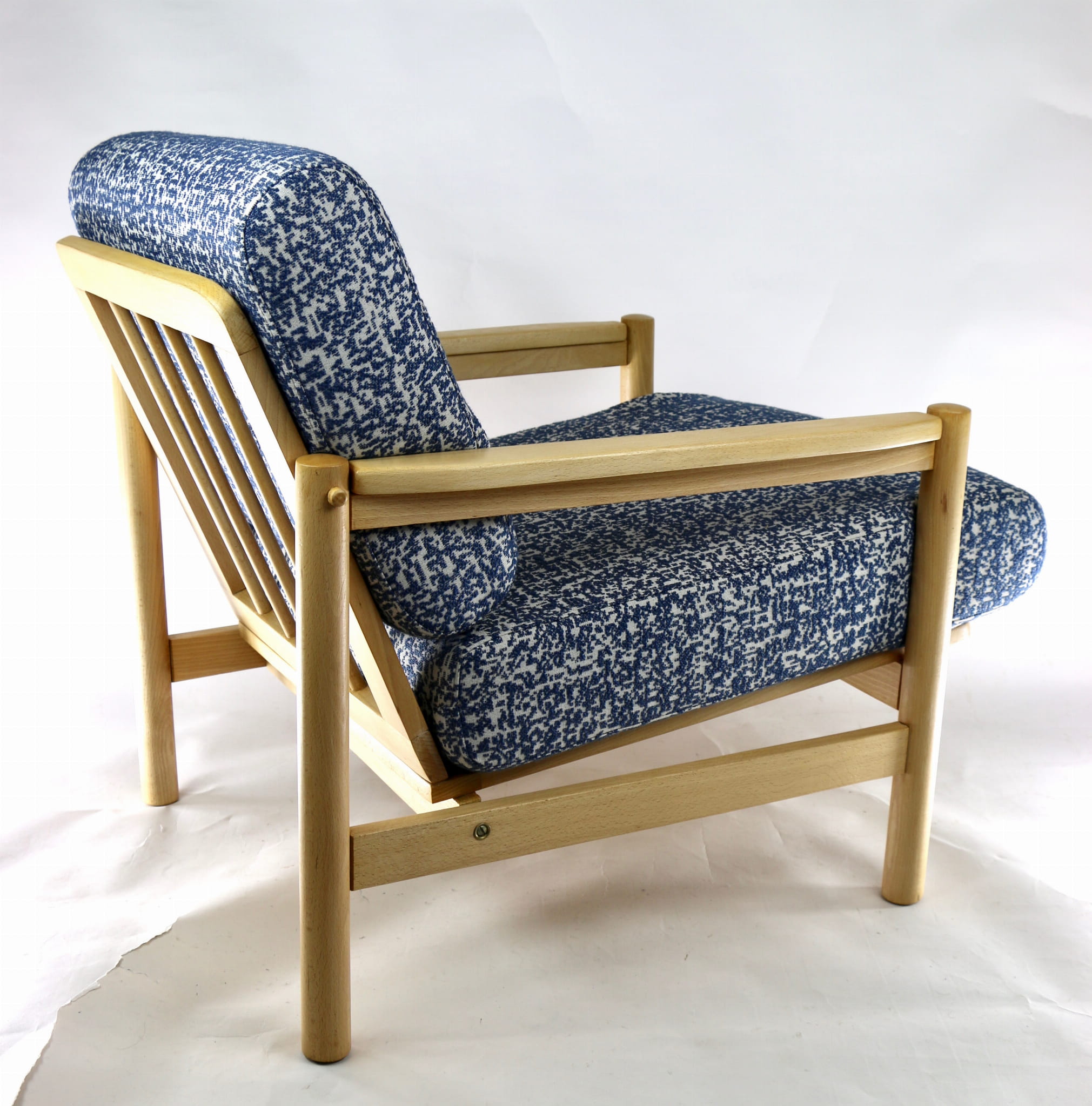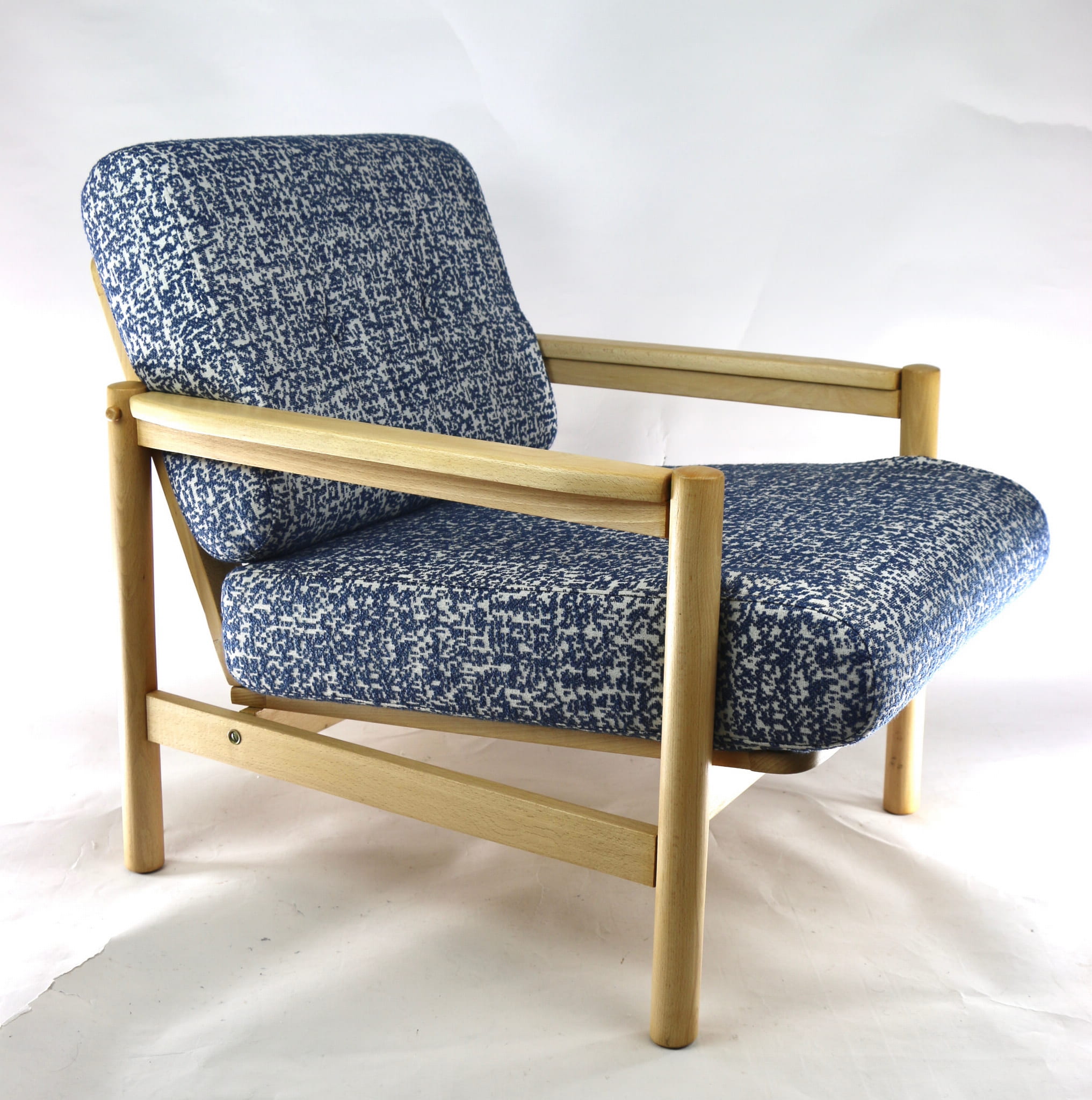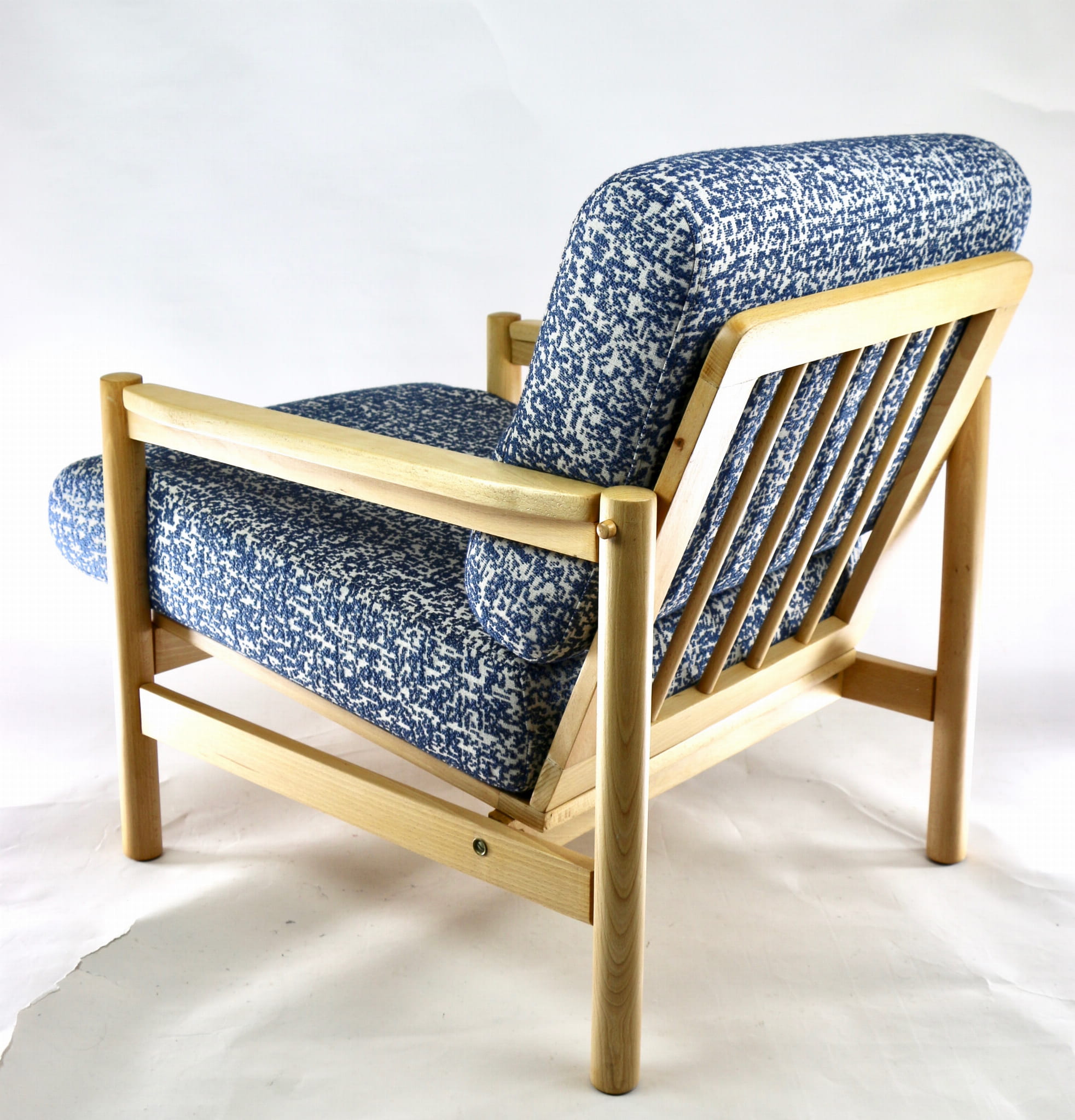 Fotel lata 70 na zdejmowanych poduchach. Kompletnie odrestaurowany. Nowe grube siedzisko wraz z oparciem pokryte najwyższej jakości naturalnym materiałem tapicerskim w kolorze granatowo -białym. Stelaż drewniany połączony z podłokietnikami w kolorze naturalnego jasnego buku. Wymiary: wysokość: 73 cm | szerokość : 61 cm | głębokość: 80 cm | głębokość siedziska: 50 cm | szerokość siedziska: 48 cm | wysokość siedziska: 40 cm | wysokość podłokietnika: 52 cm