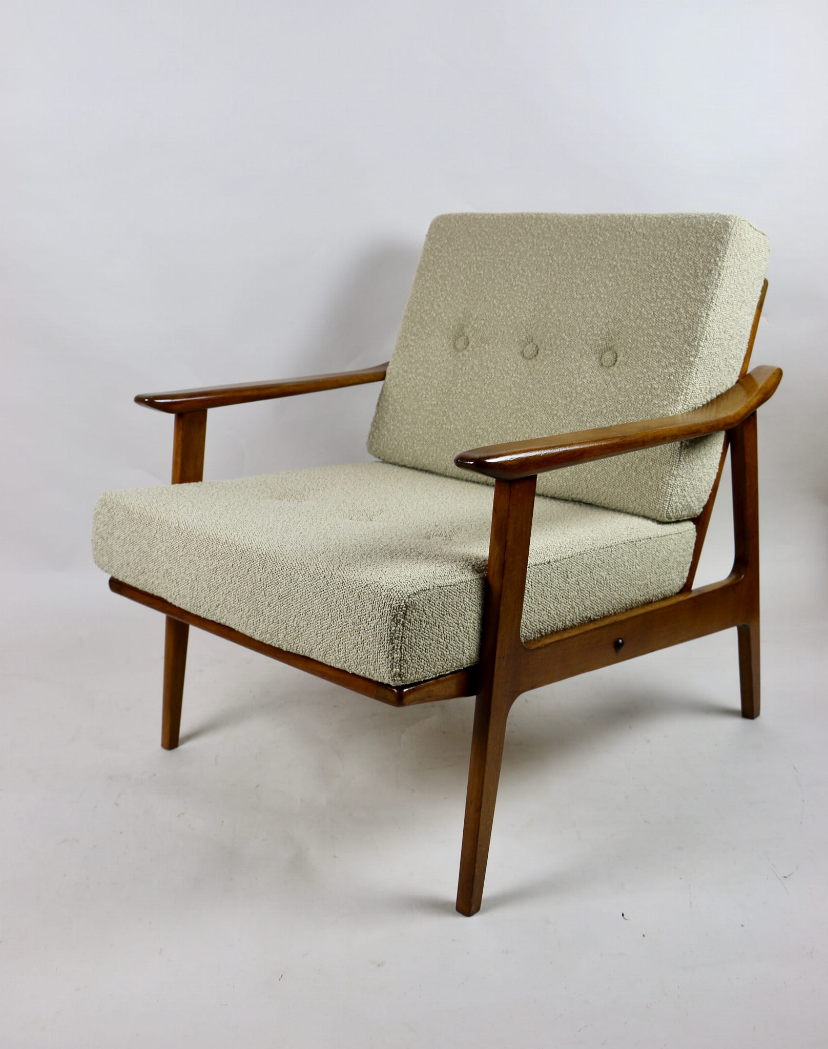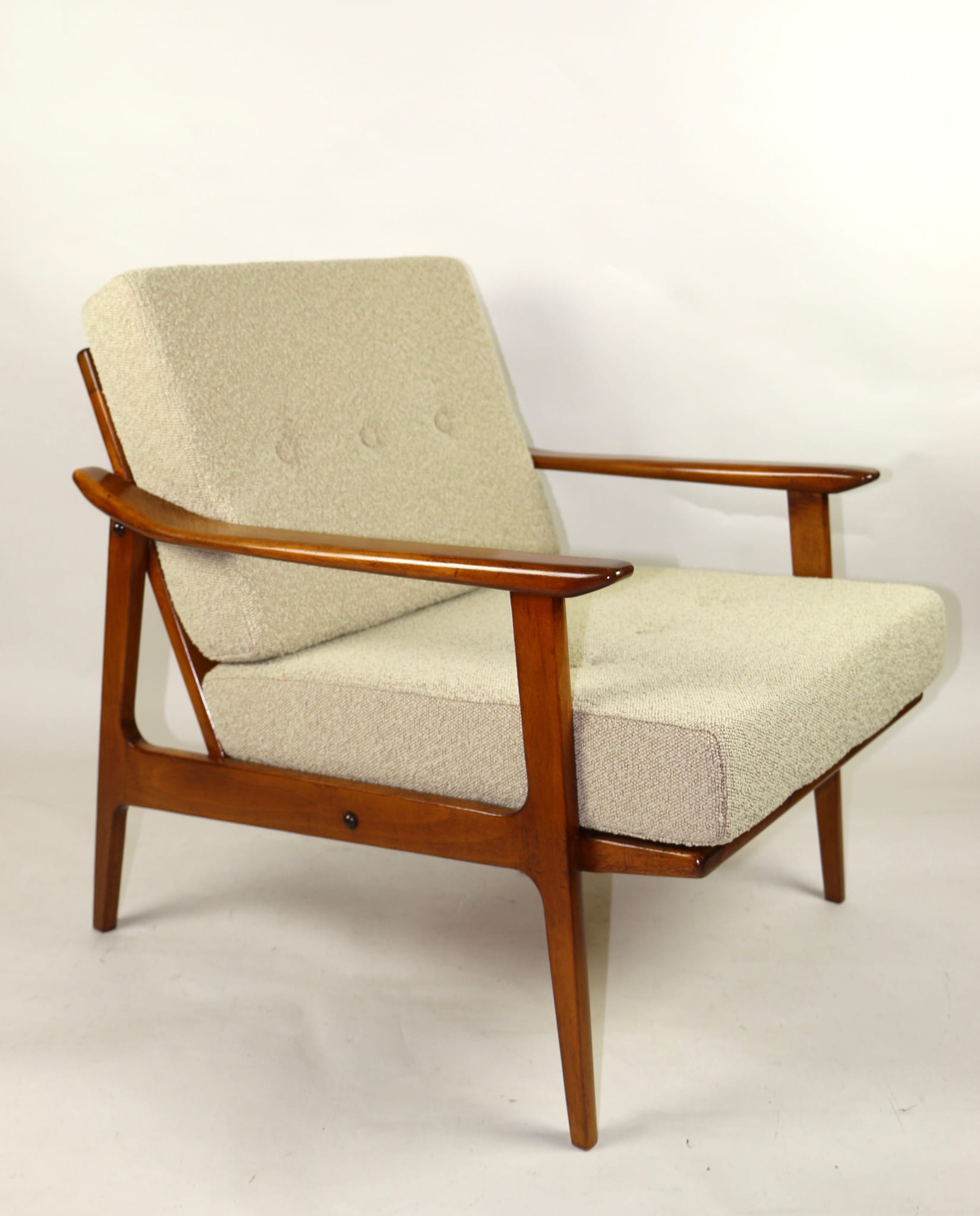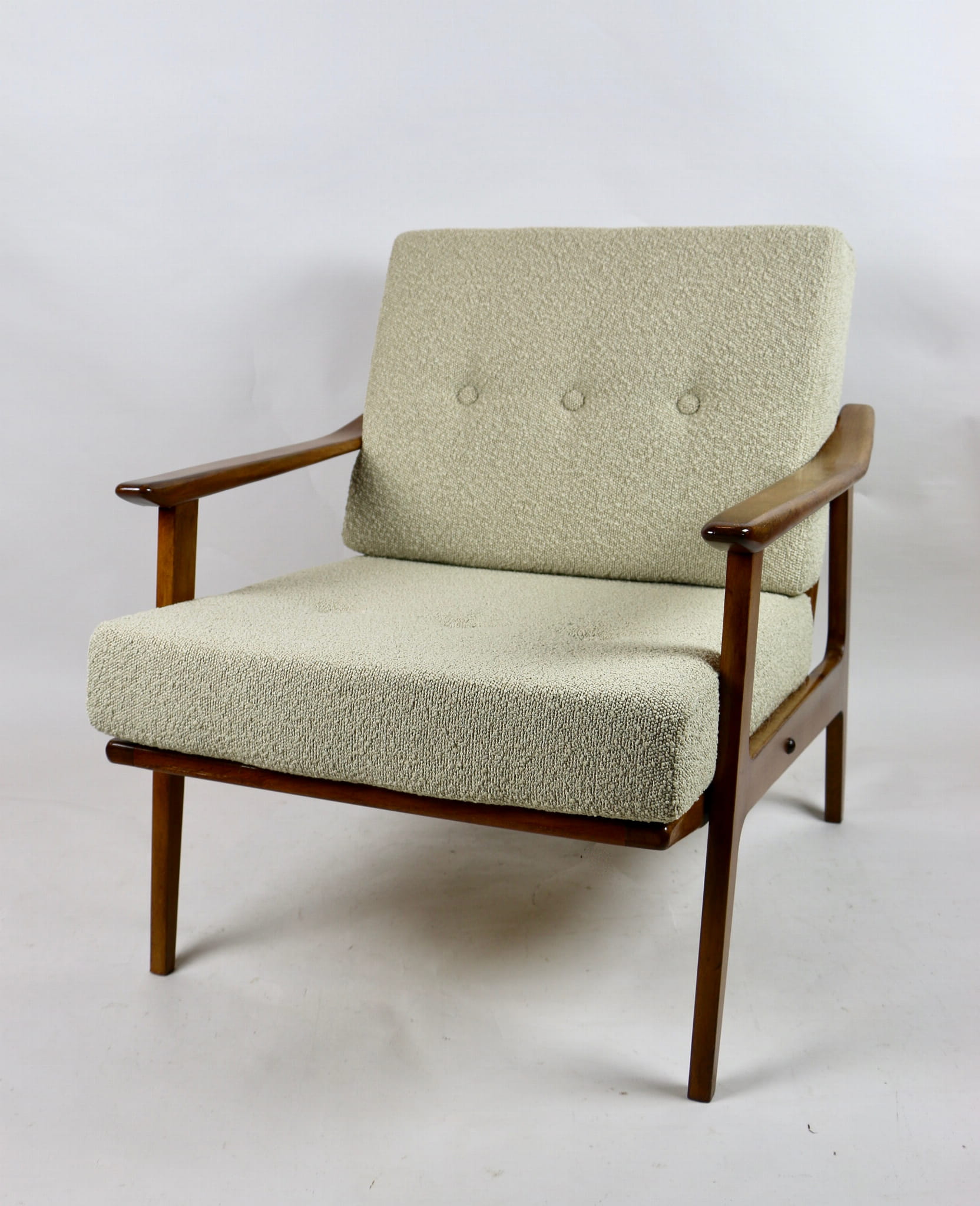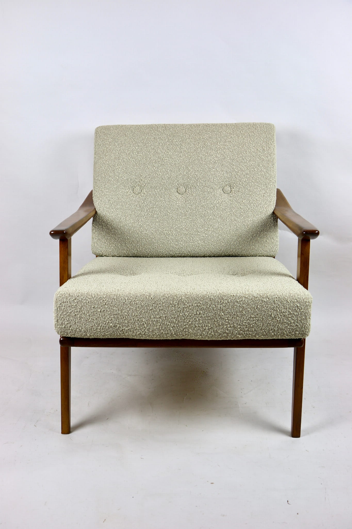 Fotel niemiecki z lat 80 na zdejmowanych poduchach. Kompletnie odrestaurowany. Nowe grube siedzisko wraz z oparciem pokryte najwyższej jakości materiałem tapicerskim strukturalnym w kolorze beżowym - materiał boucle. Stelaż drewniany połączony z podłokietnikami w kolorze ciemnego buku.