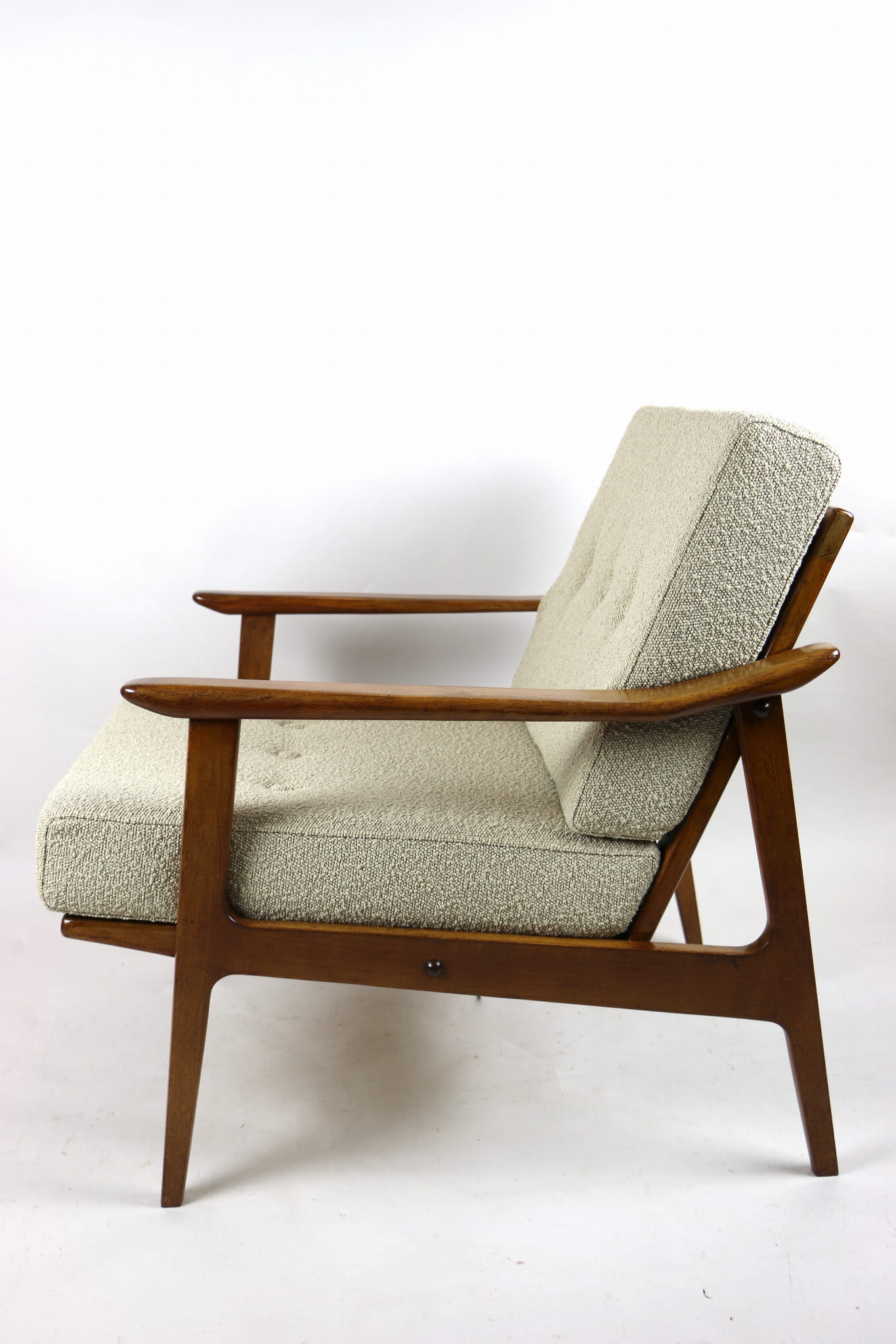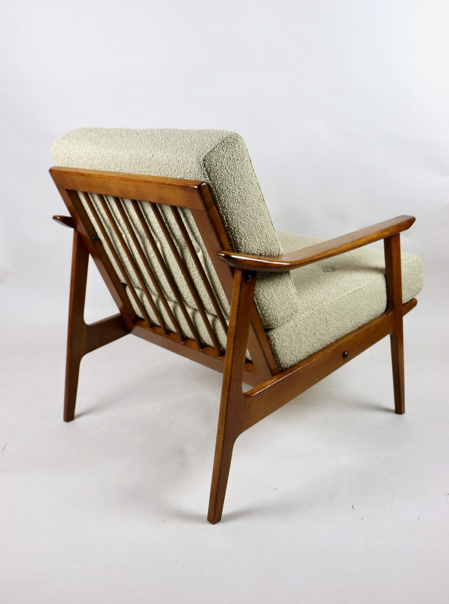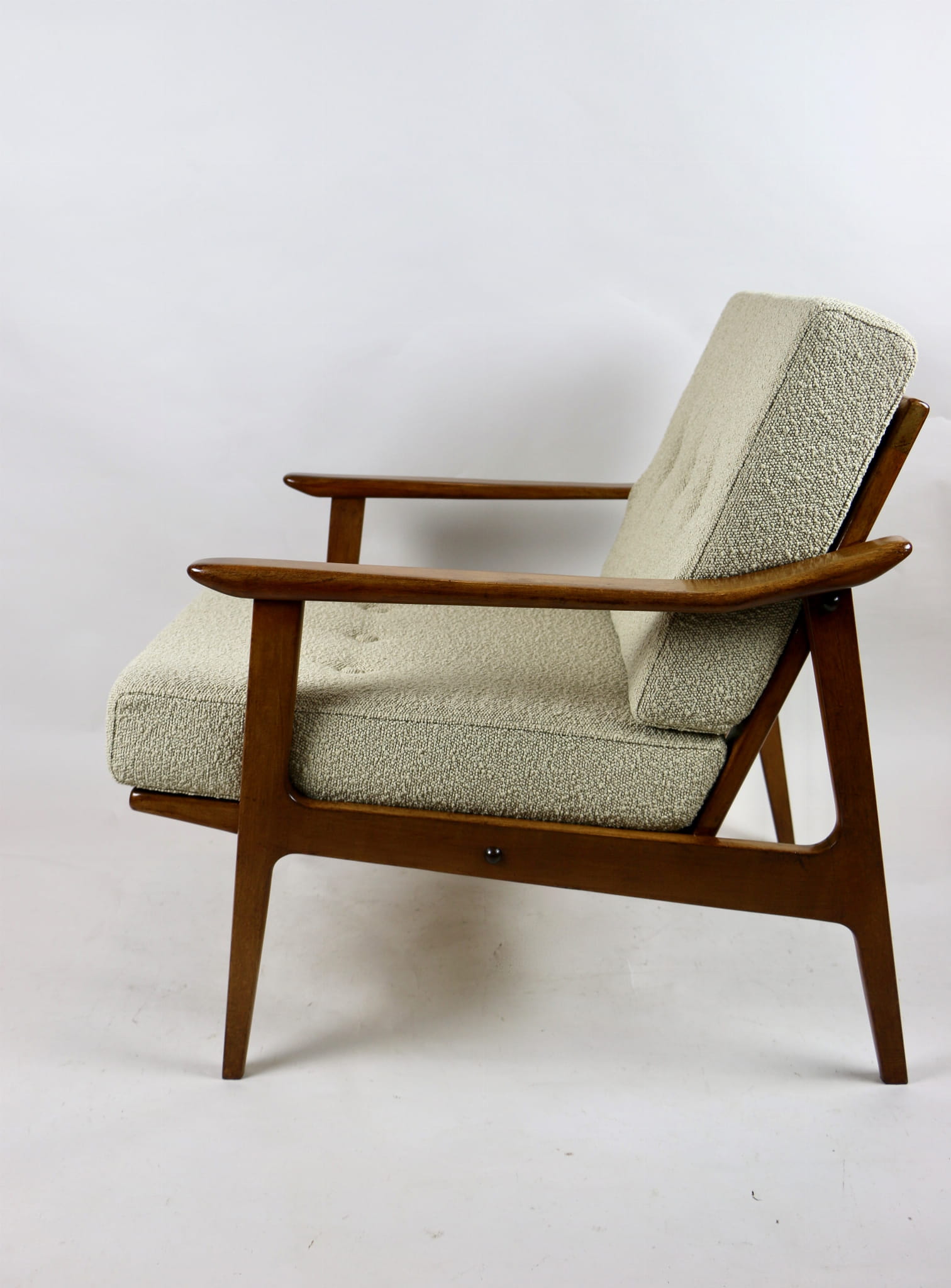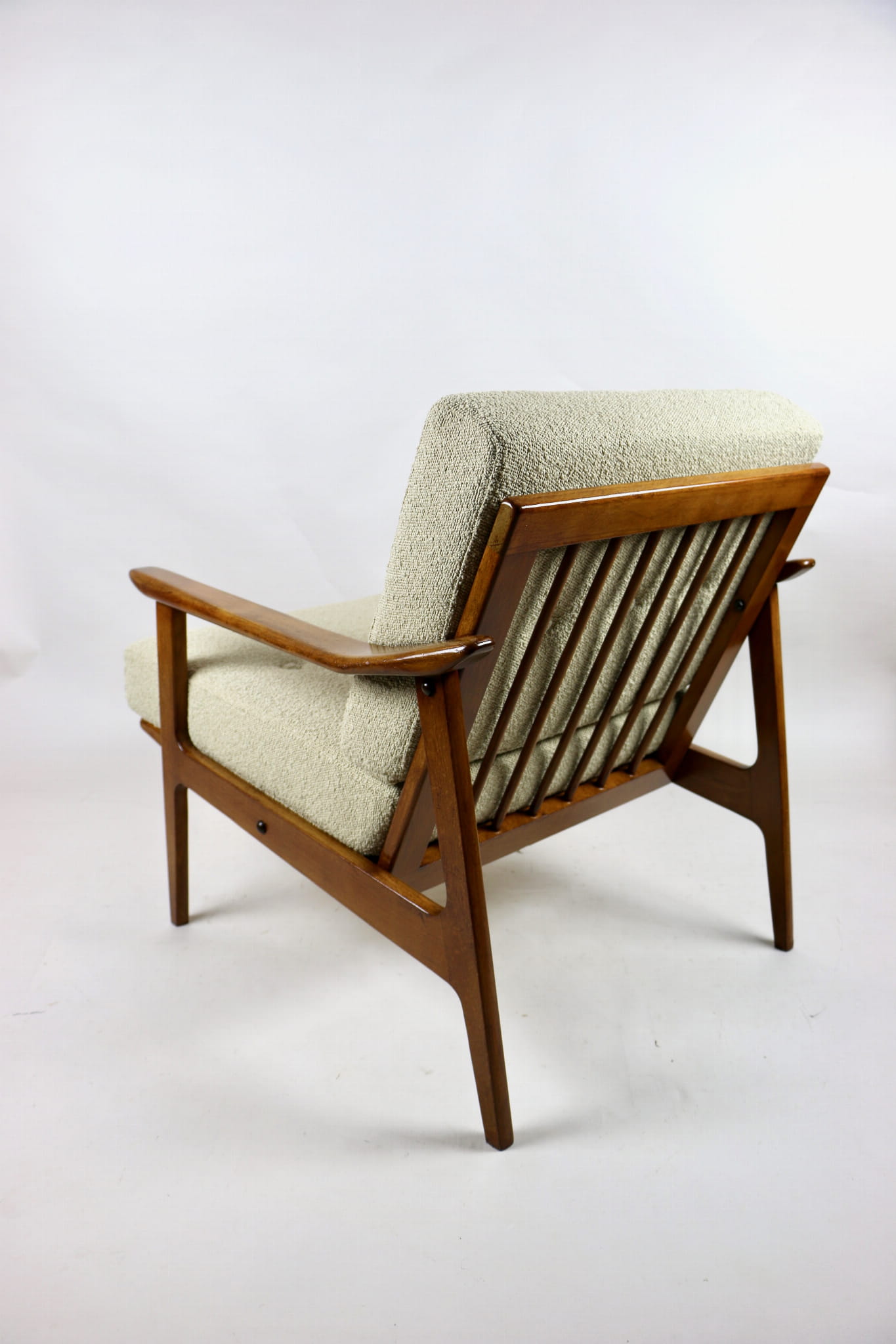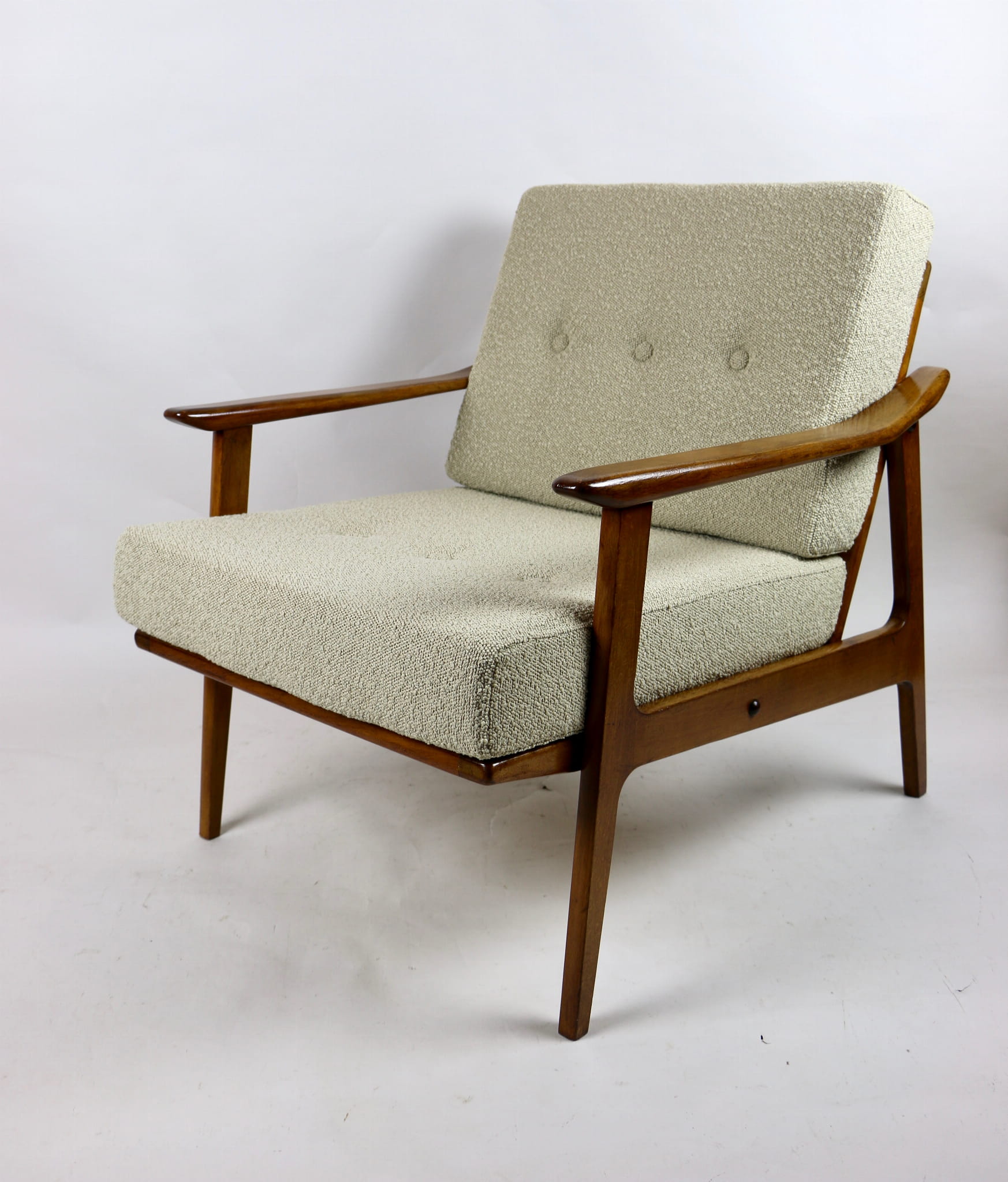 Fotel niemiecki z lat 80 na zdejmowanych poduchach. Kompletnie odrestaurowany. Nowe grube siedzisko wraz z oparciem pokryte najwyższej jakości materiałem tapicerskim strukturalnym w kolorze beżowym - materiał boucle. Stelaż drewniany połączony z podłokietnikami w kolorze ciemnego buku.