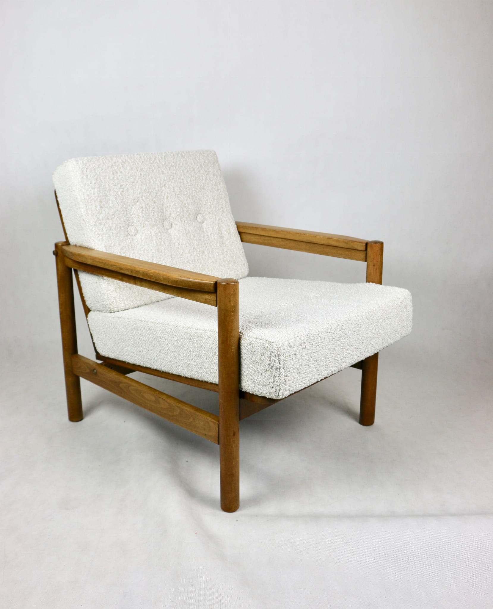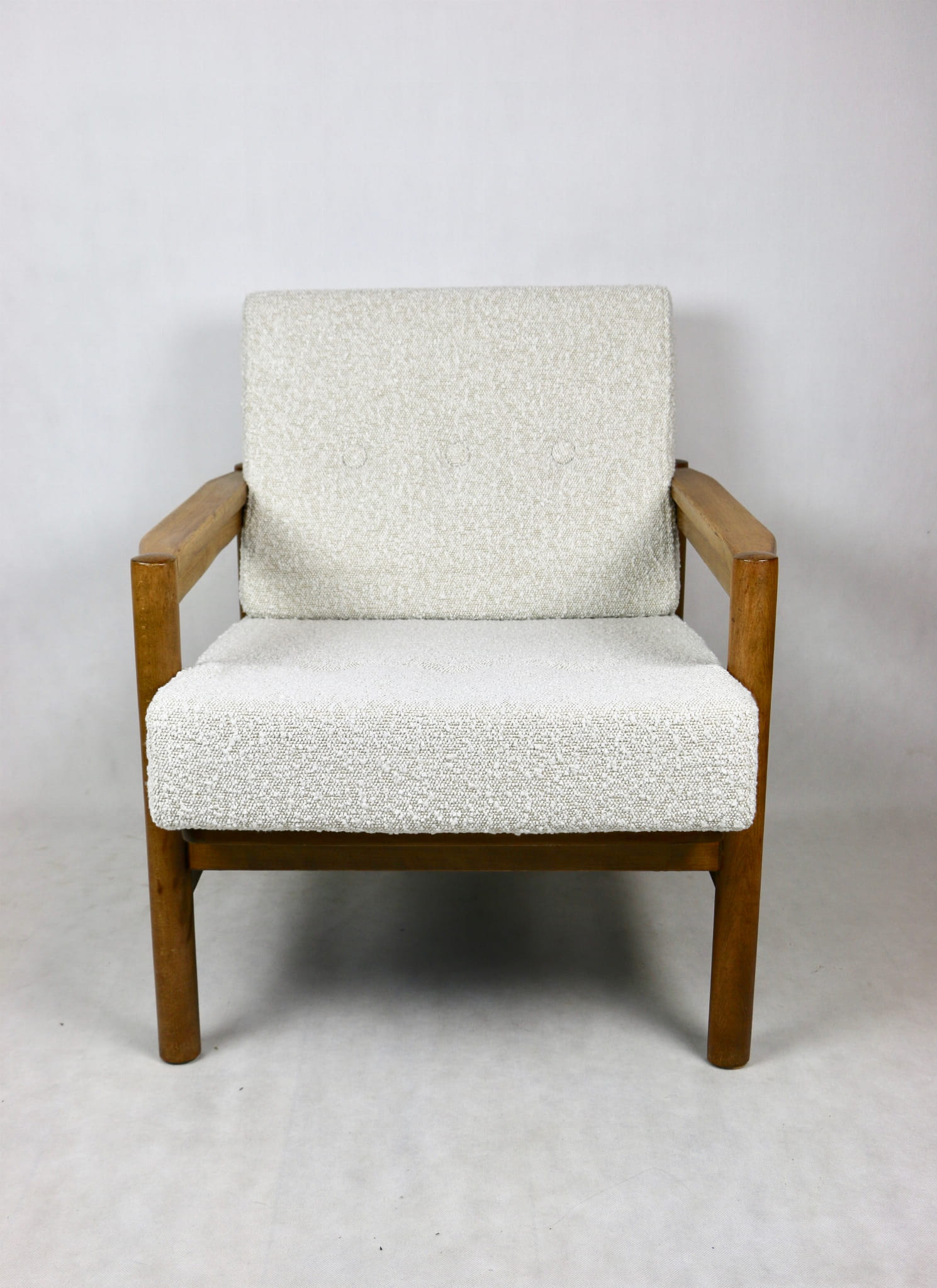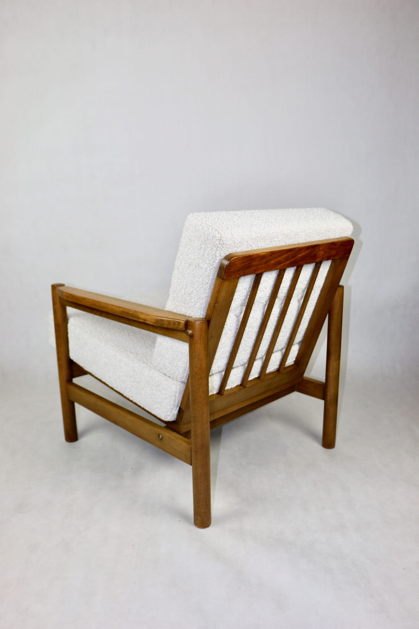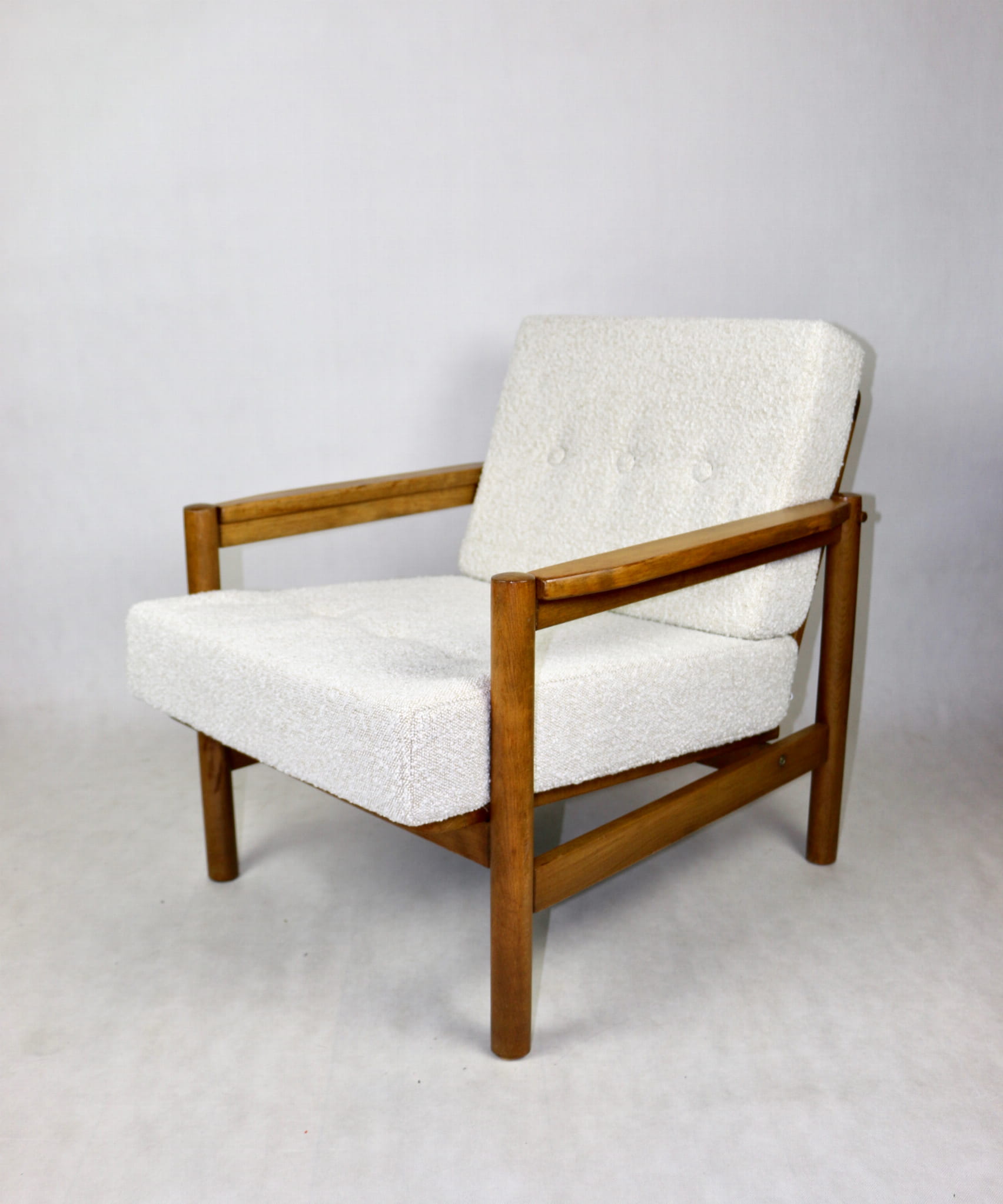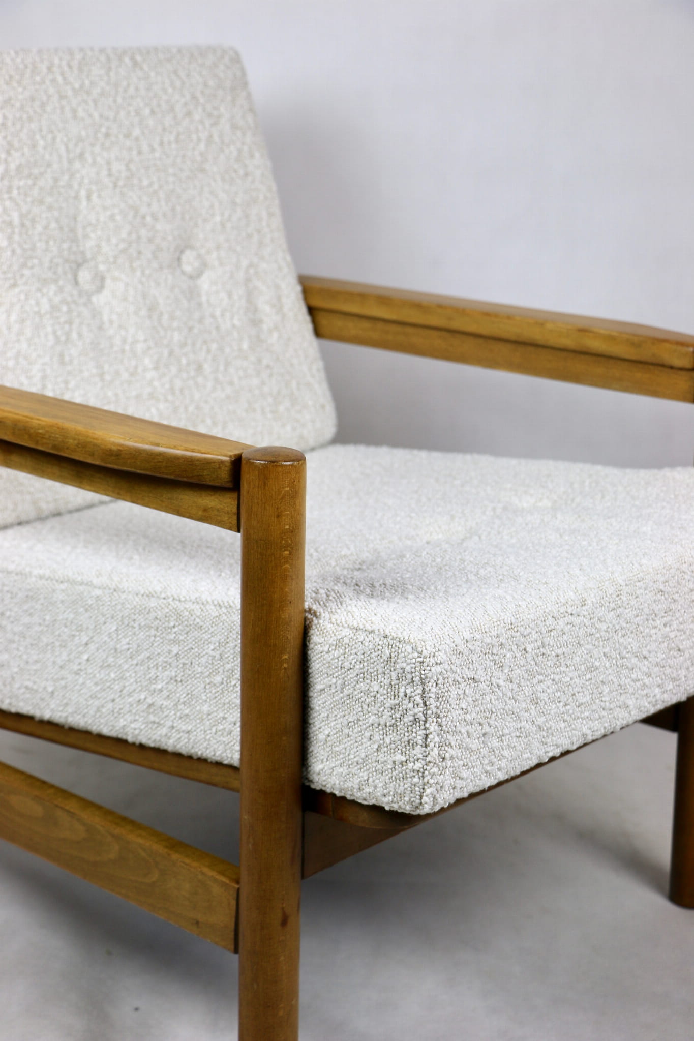 Fotel drewniany projektu Z. Baczyk naturalny buk Vintage boucle biały - kremowy