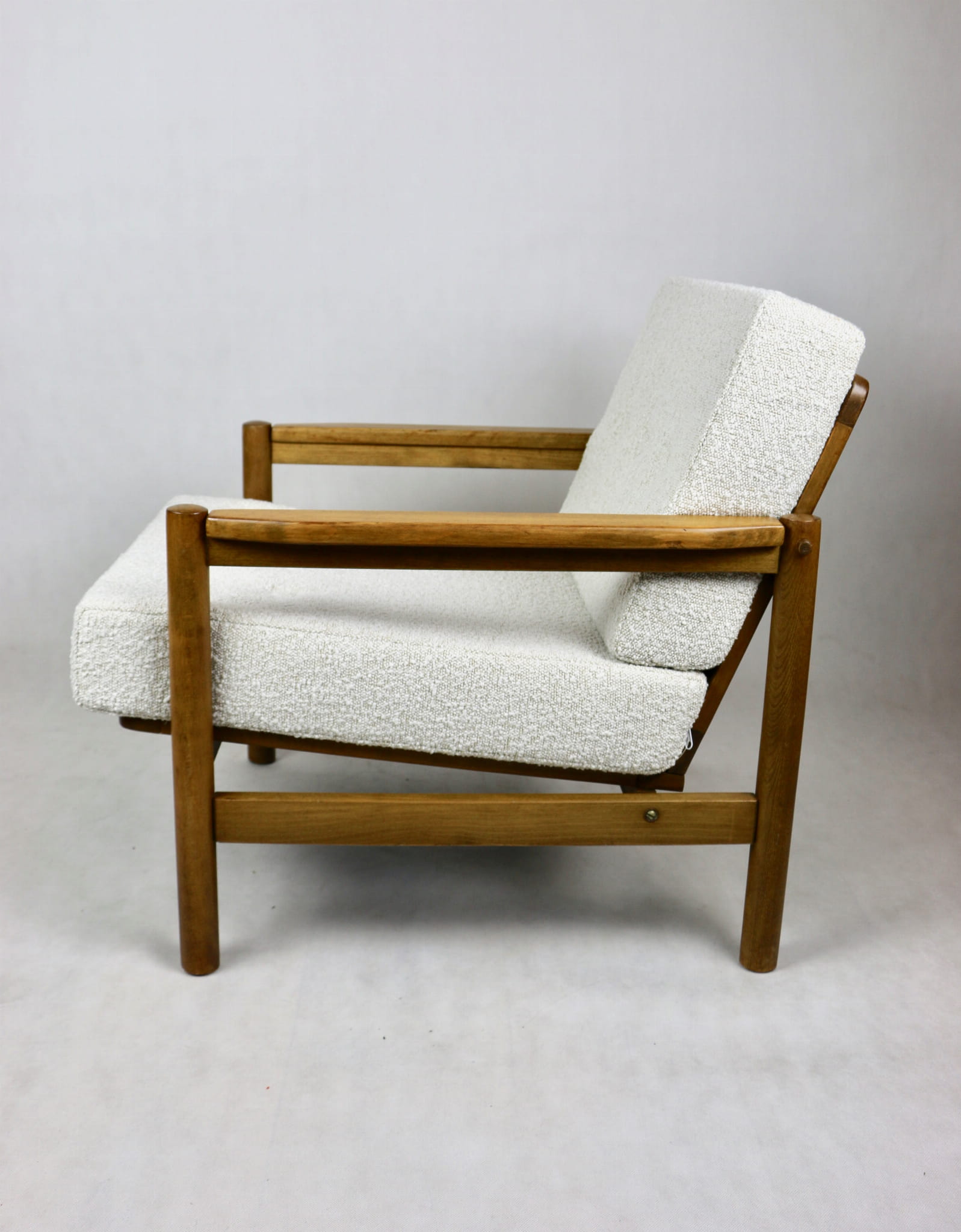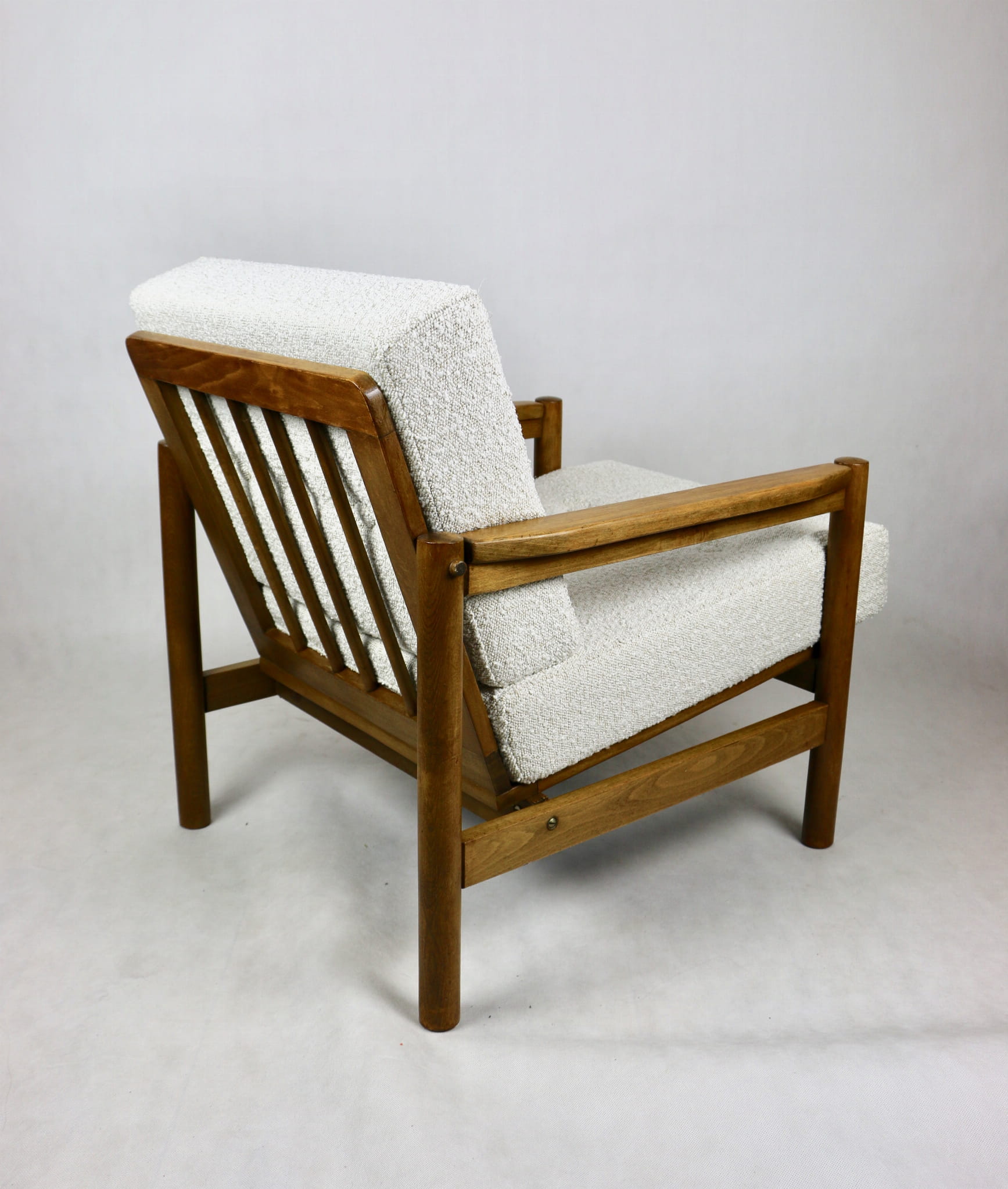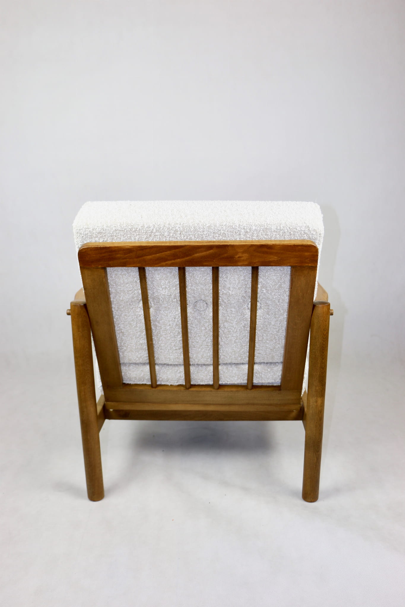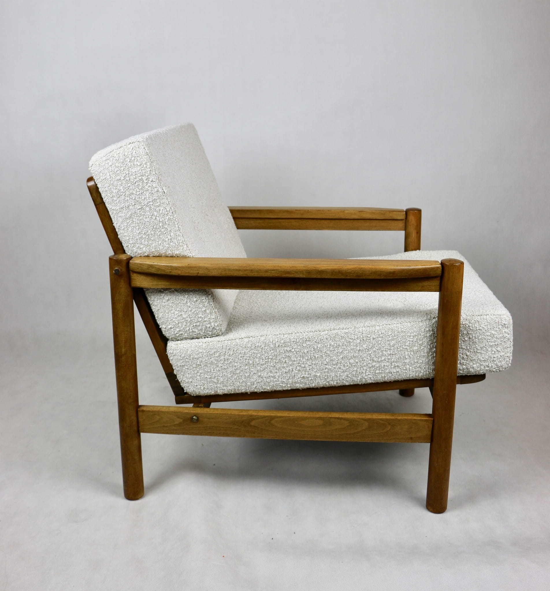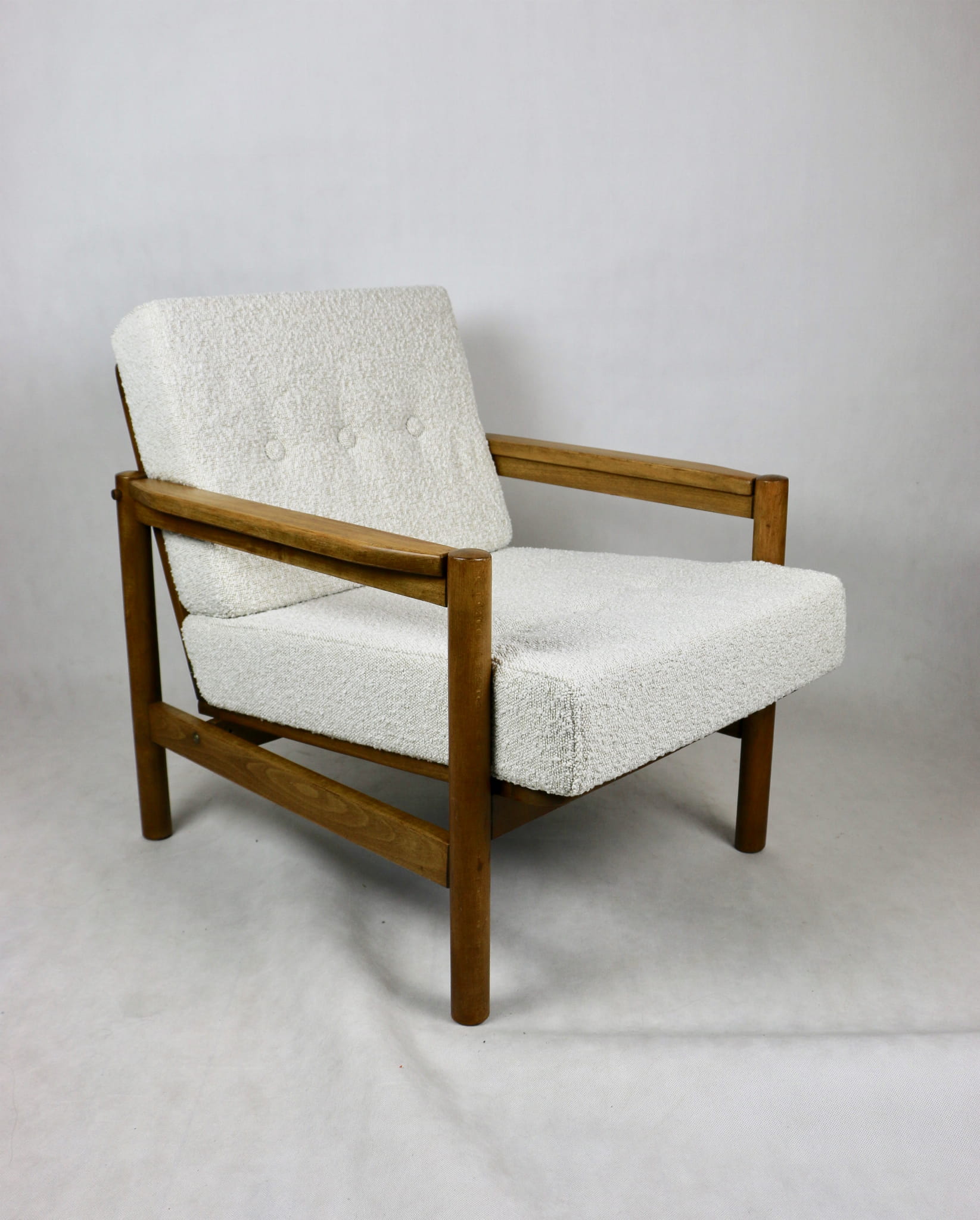 Fotel drewniany projektu Z. Baczyk naturalny buk Vintage boucle biały - kremowy