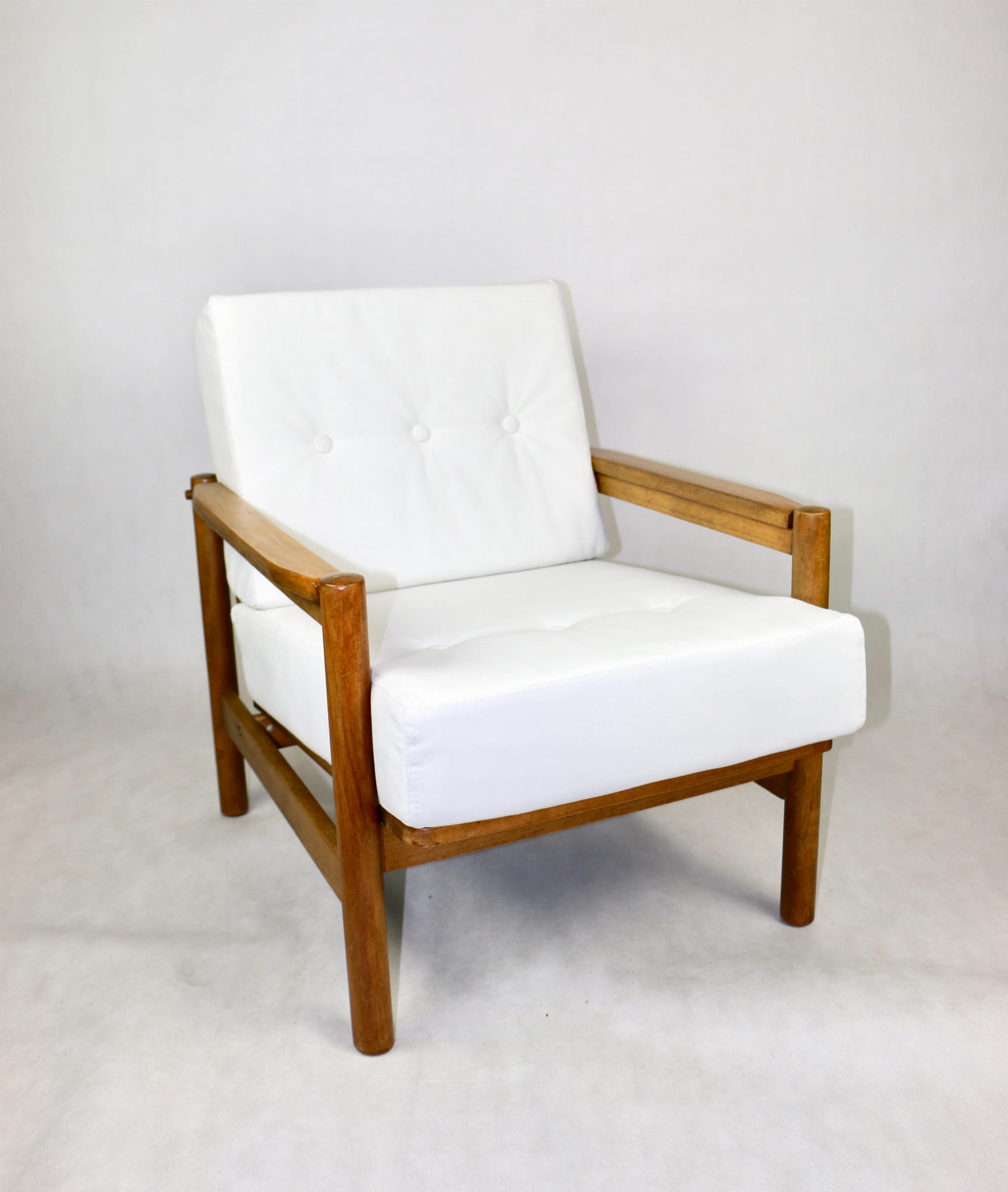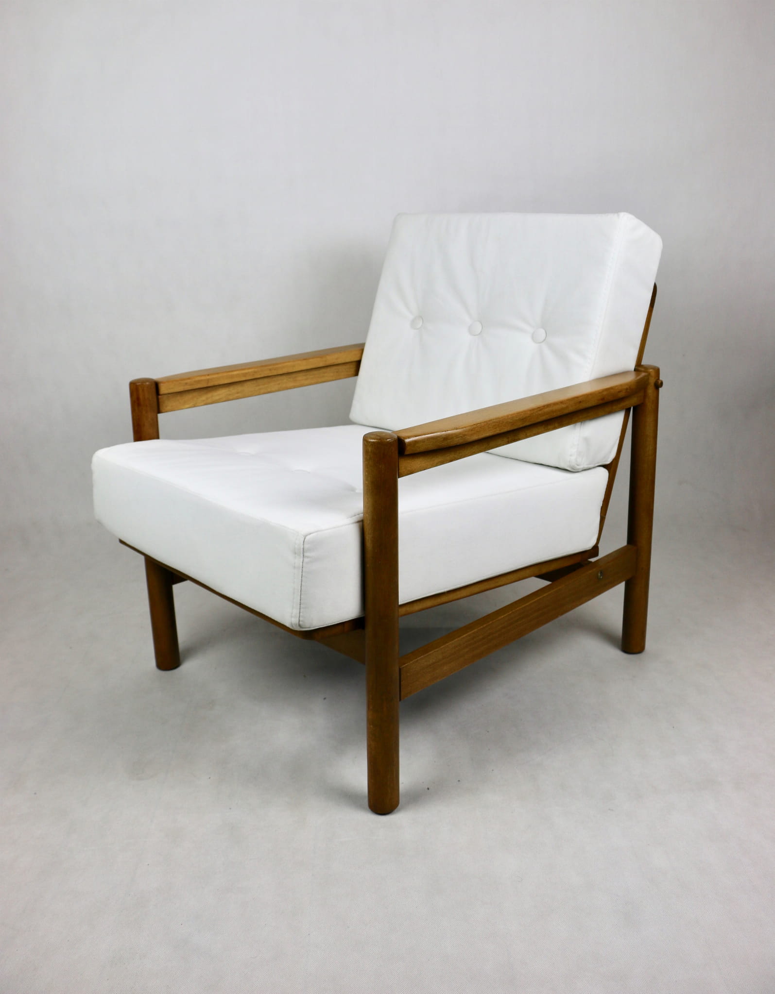Fotel lata 70 na zdejmowanych poduchach. Kompletnie odrestaurowany. Nowe grube siedzisko wraz z oparciem pokryte najwyższej jakości materiałem tapicerskim typu welwet w kolorze białym z serii Jade - easy to clean. Stelaż drewniany połączony z podłokietnikami w kolorze jasnego buku.