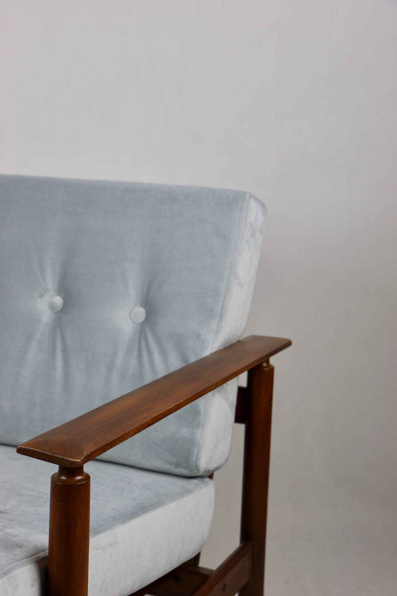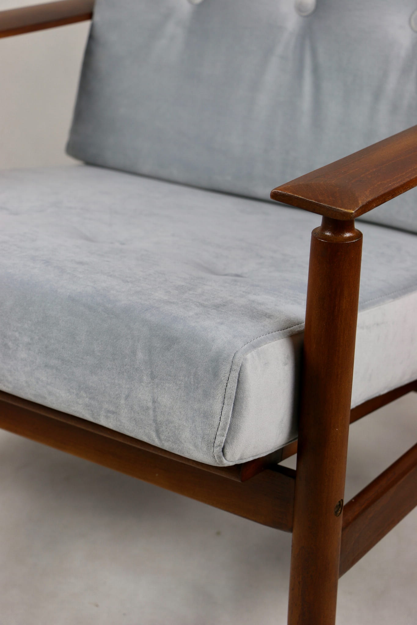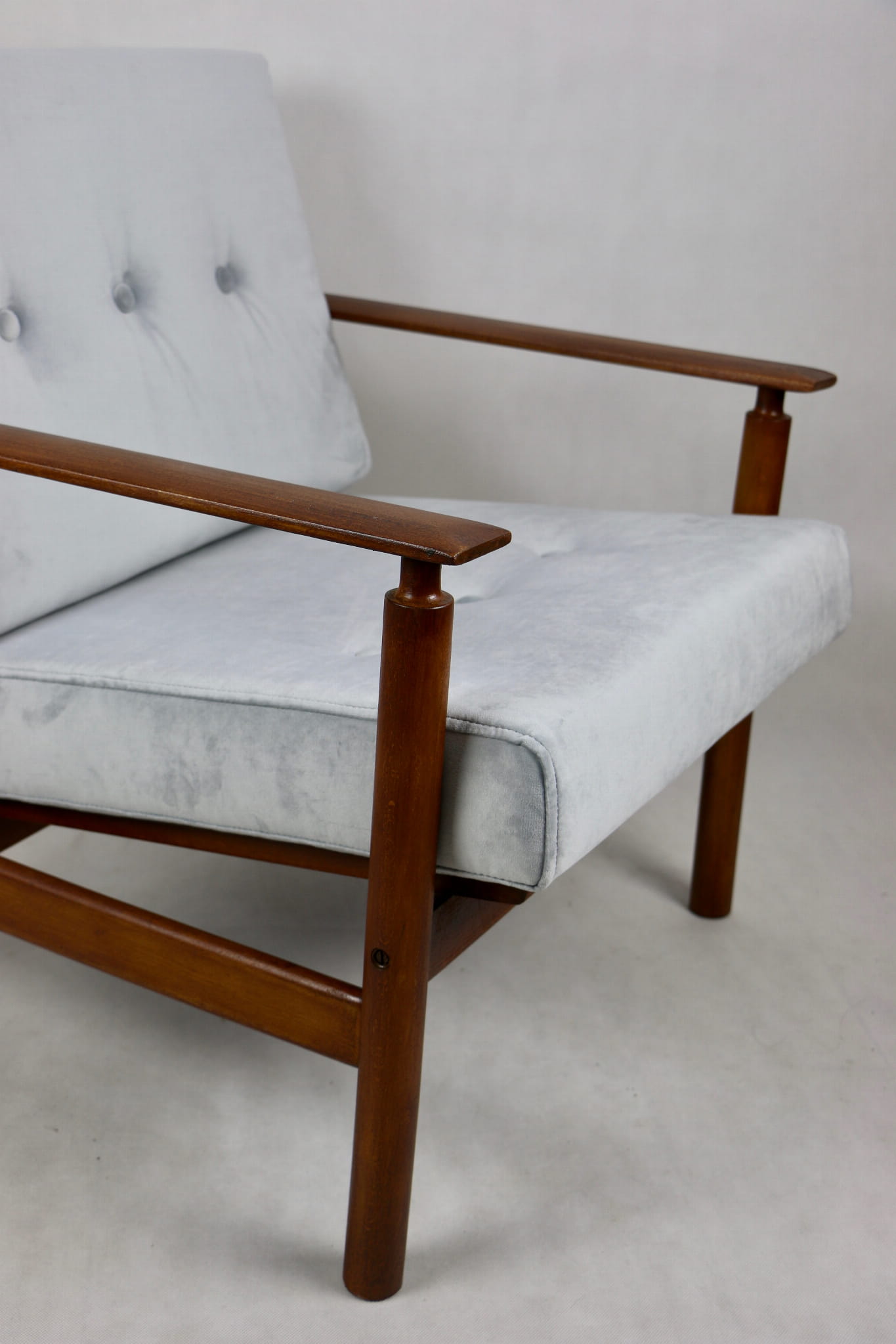 Fotel lata 70 na zdejmowanych poduchach. Kompletnie odrestaurowany. Nowe grube siedzisko wraz ze składanym oparciem pokryte najwyższej jakości materiałem tapicerskim typu welwet w kolorze srebrnym - material z serii Paris. Stelaż drewniany połączony z podłokietnikami w kolorze ciemnego drewna.