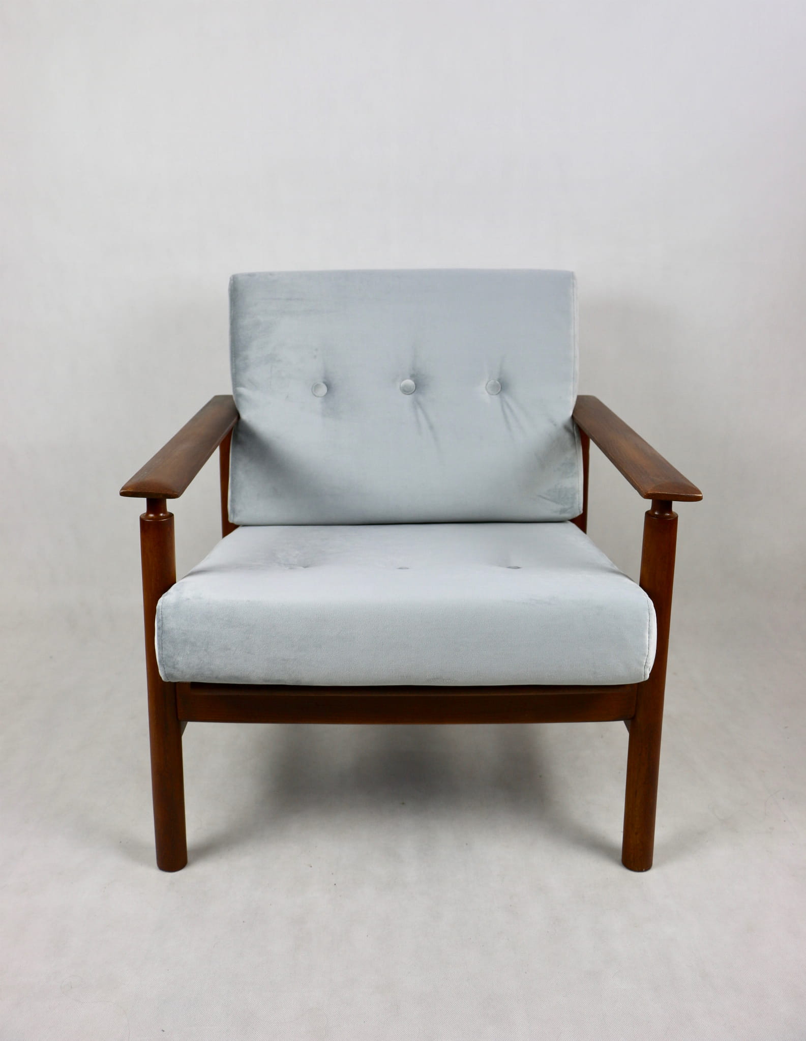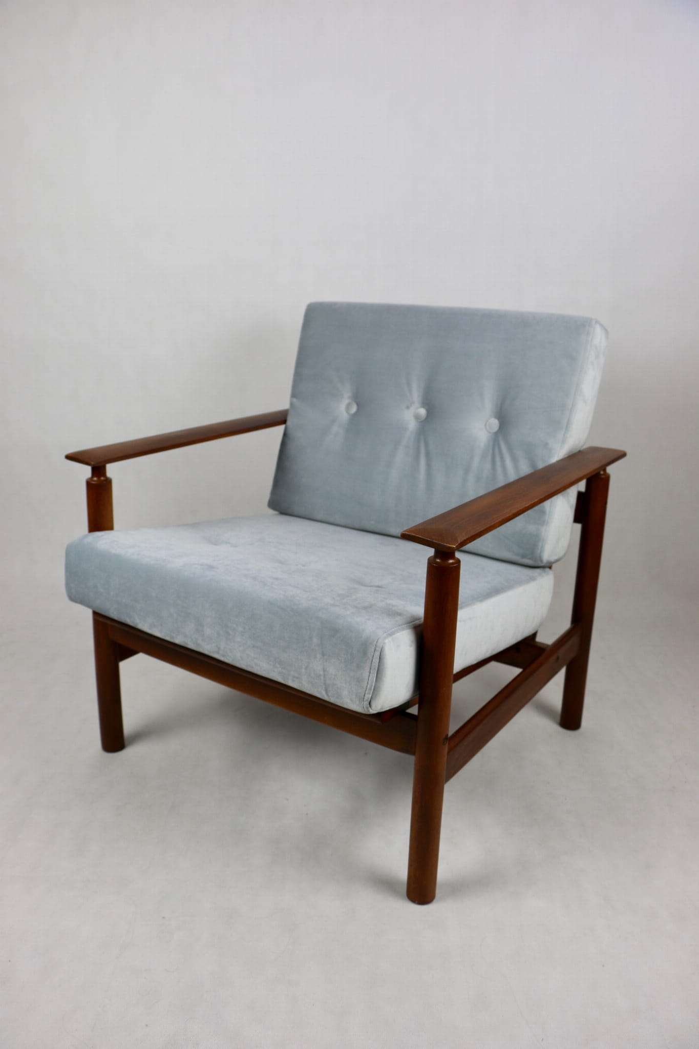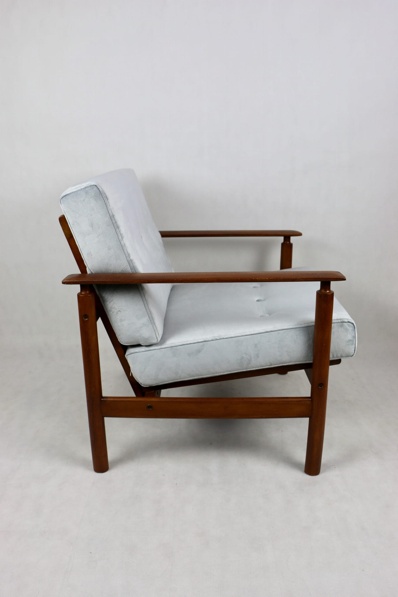 Fotel lata 70 na zdejmowanych poduchach. Kompletnie odrestaurowany. Nowe grube siedzisko wraz ze składanym oparciem pokryte najwyższej jakości materiałem tapicerskim typu welwet w kolorze srebrnym - material z serii Paris. Stelaż drewniany połączony z podłokietnikami w kolorze ciemnego drewna.