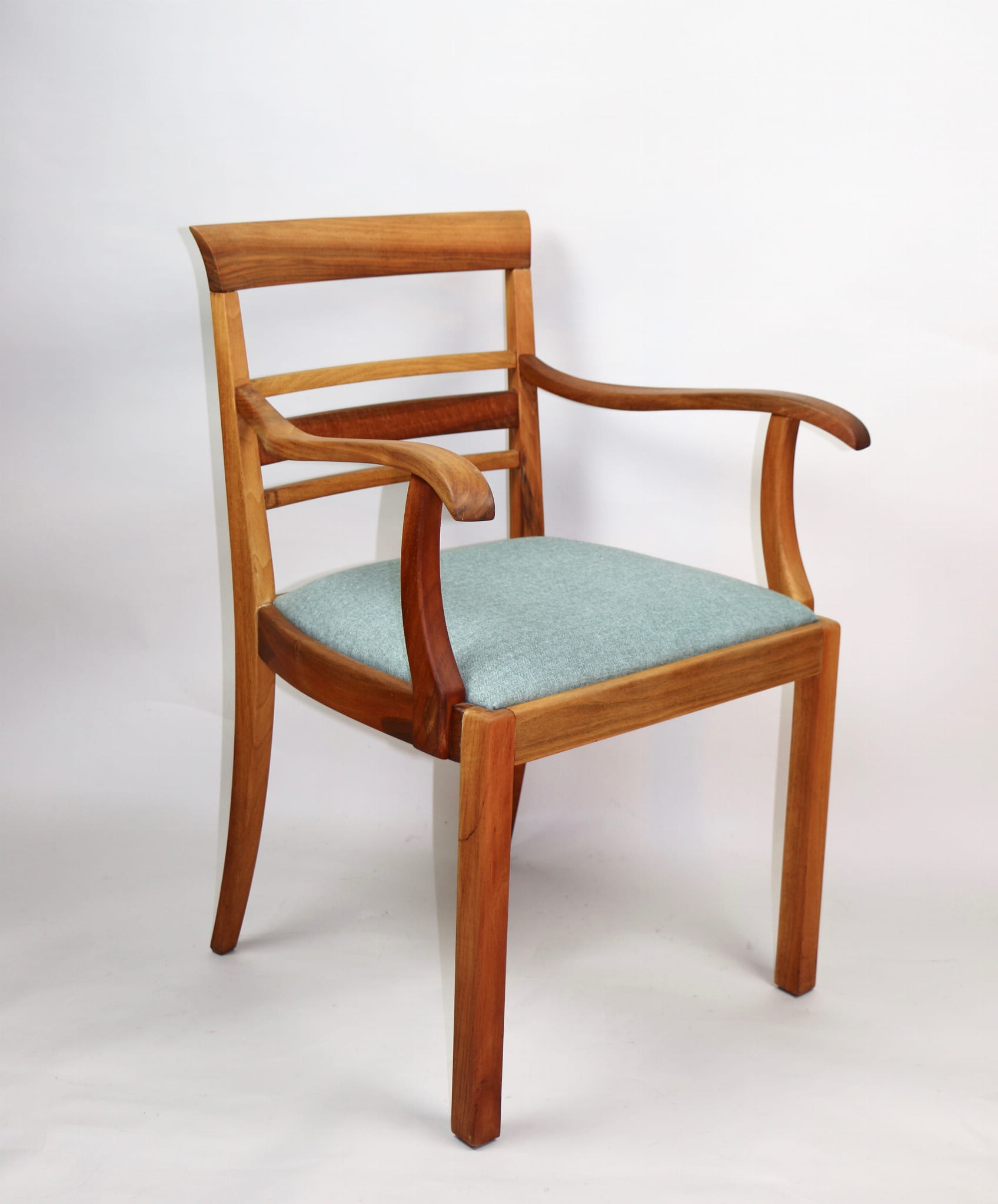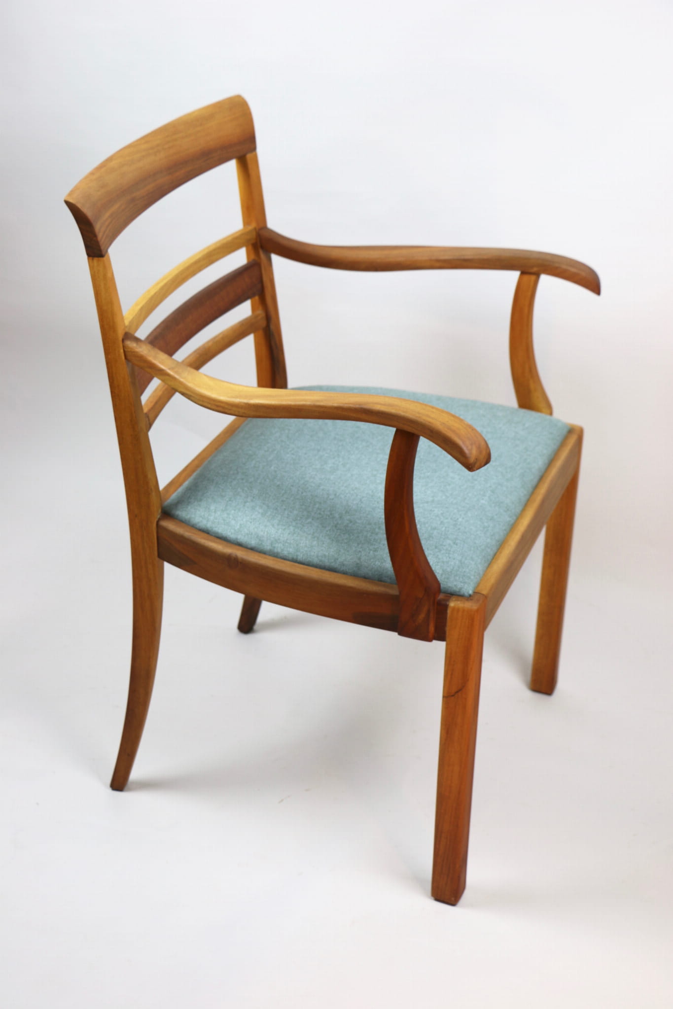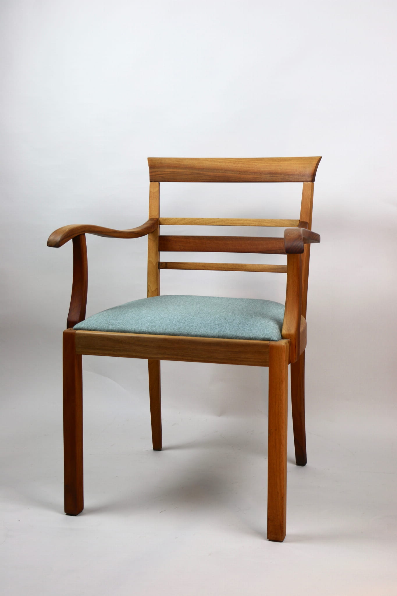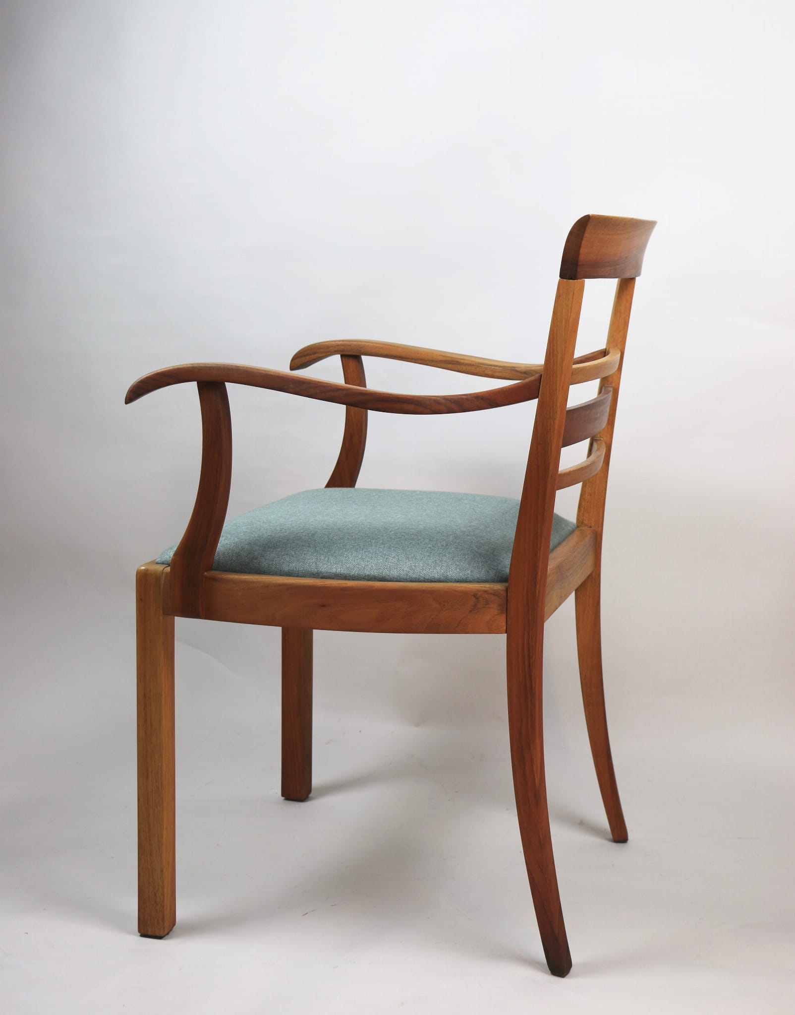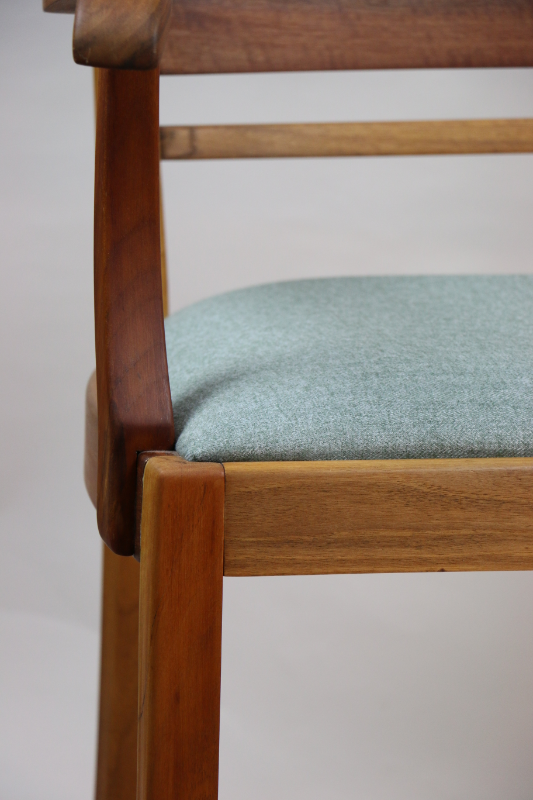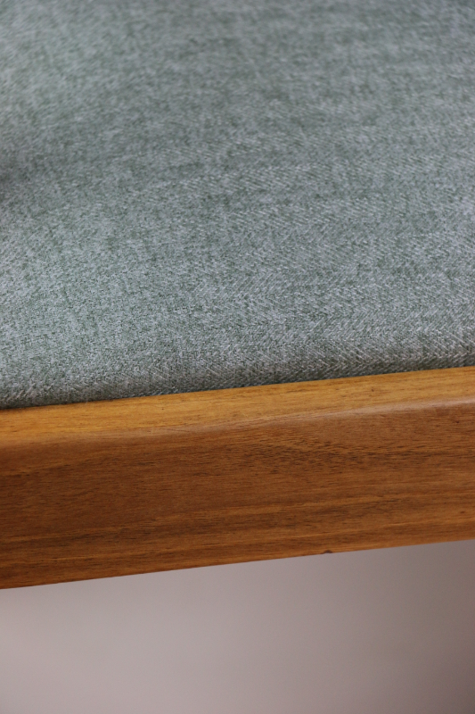 Fotel gabinetowy z lat 60. Odrestaurowany, nowe obicie pokryte najwyższej jakości materiałem tapicerskim w szaro zielonym kolorze typu jodełka. Stelaż drewniany połączony z podłokietnikami w naturalnym kolorze orzecha.