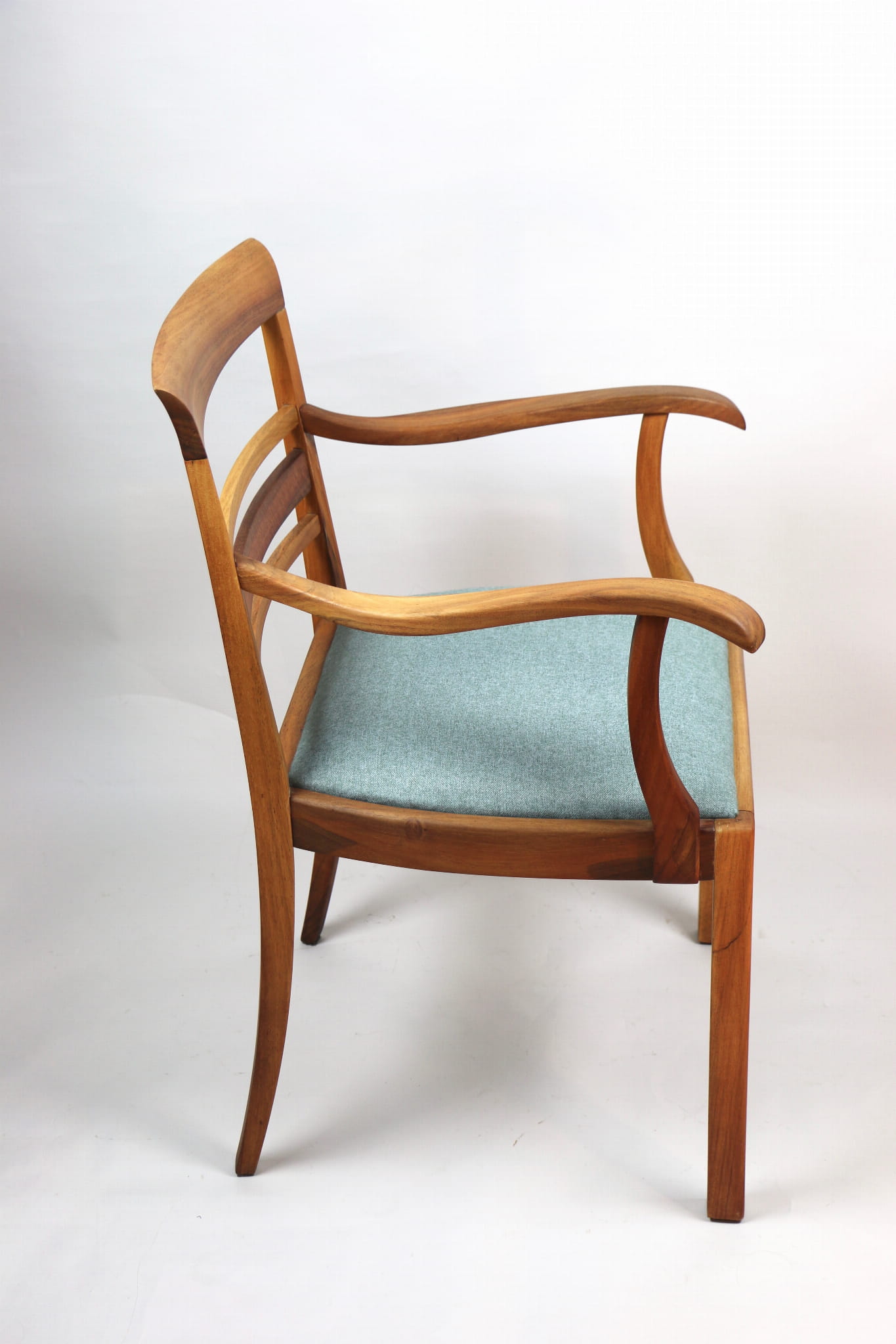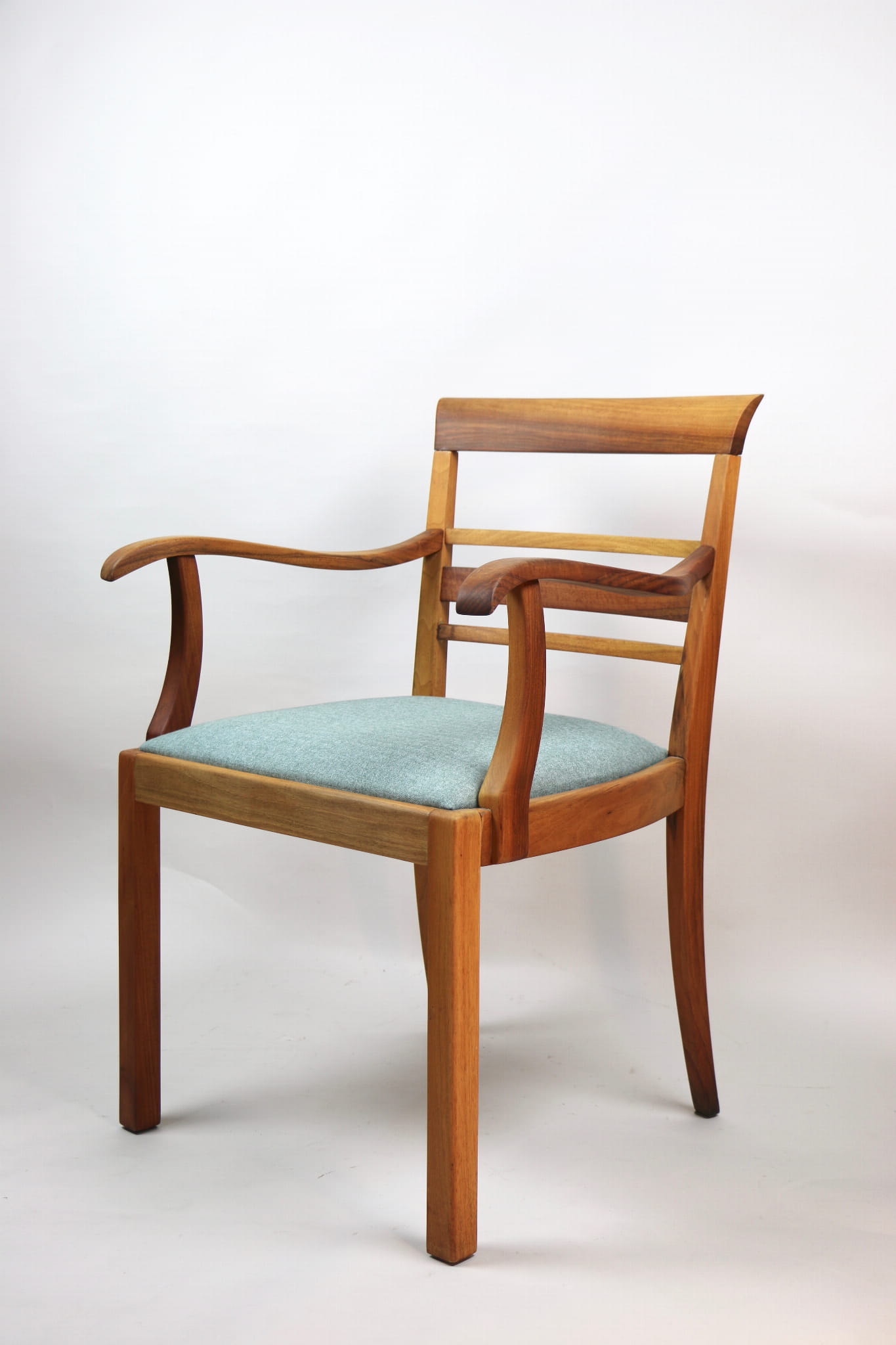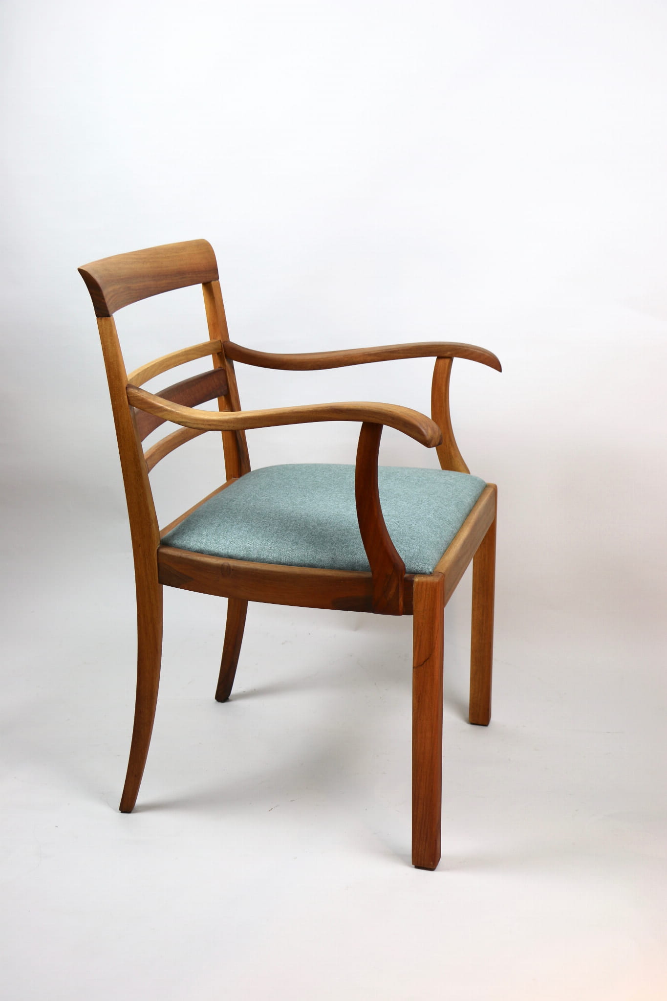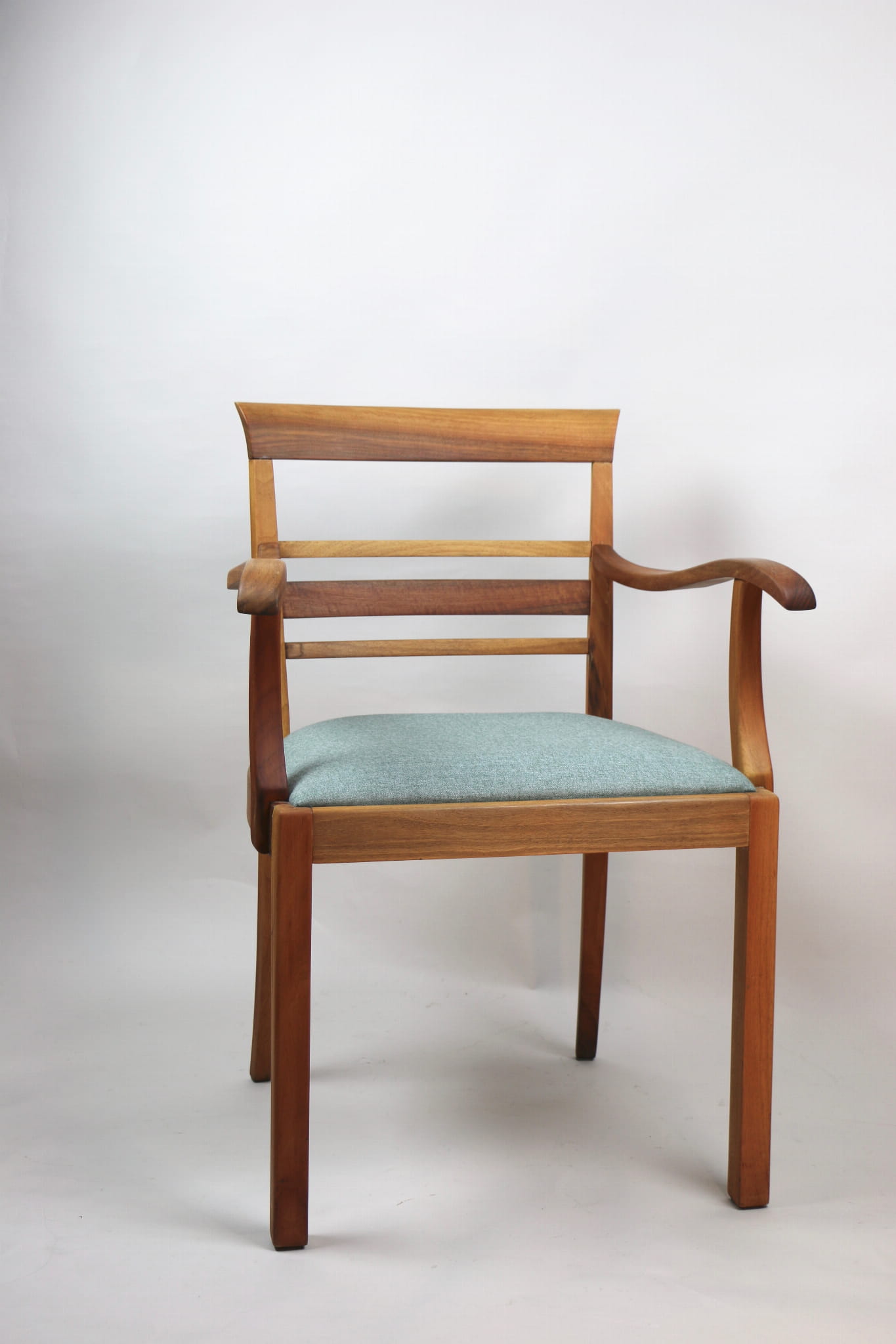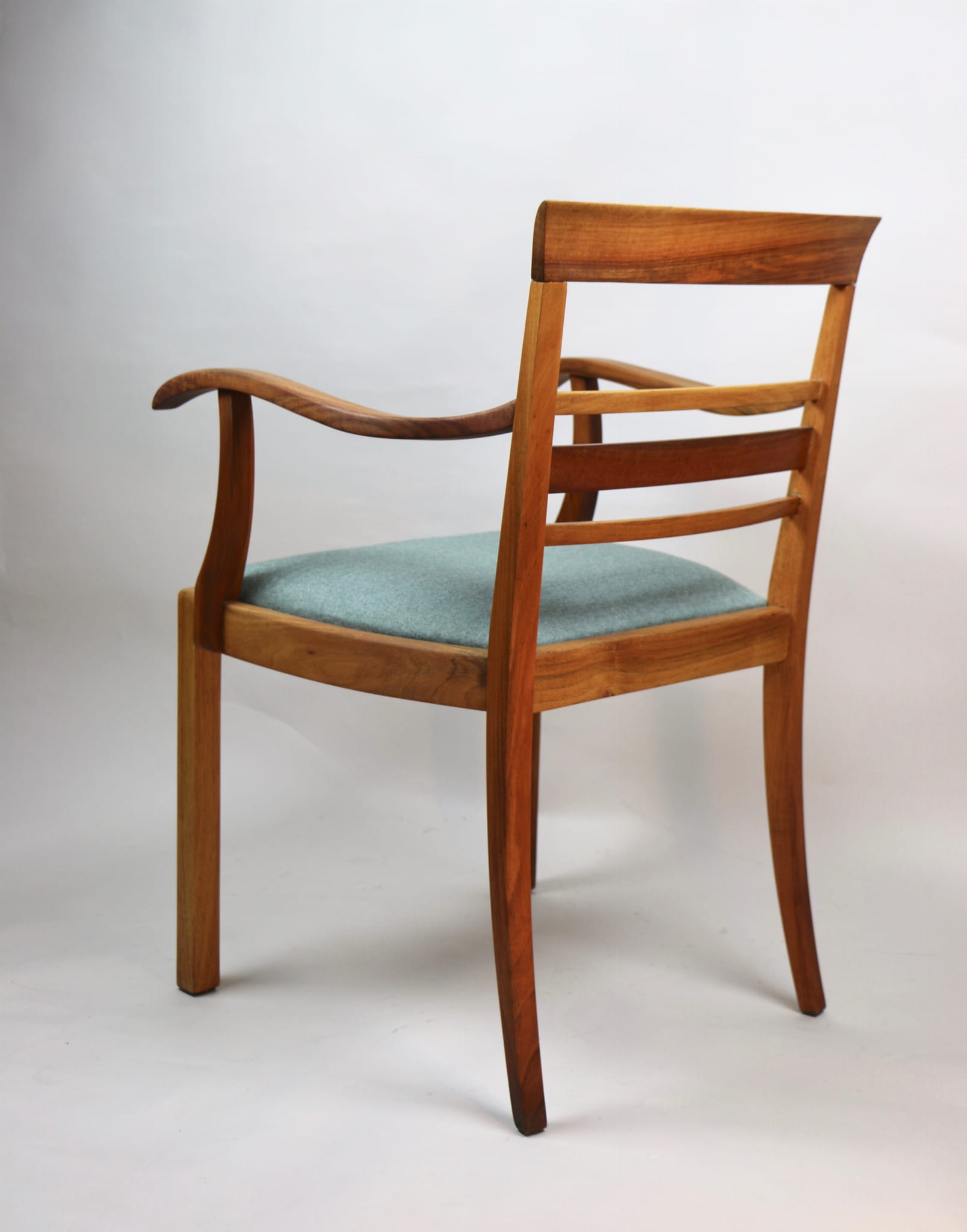 Fotel gabinetowy z lat 60. Odrestaurowany, nowe obicie pokryte najwyższej jakości materiałem tapicerskim w szaro zielonym kolorze typu jodełka. Stelaż drewniany połączony z podłokietnikami w naturalnym kolorze orzecha.