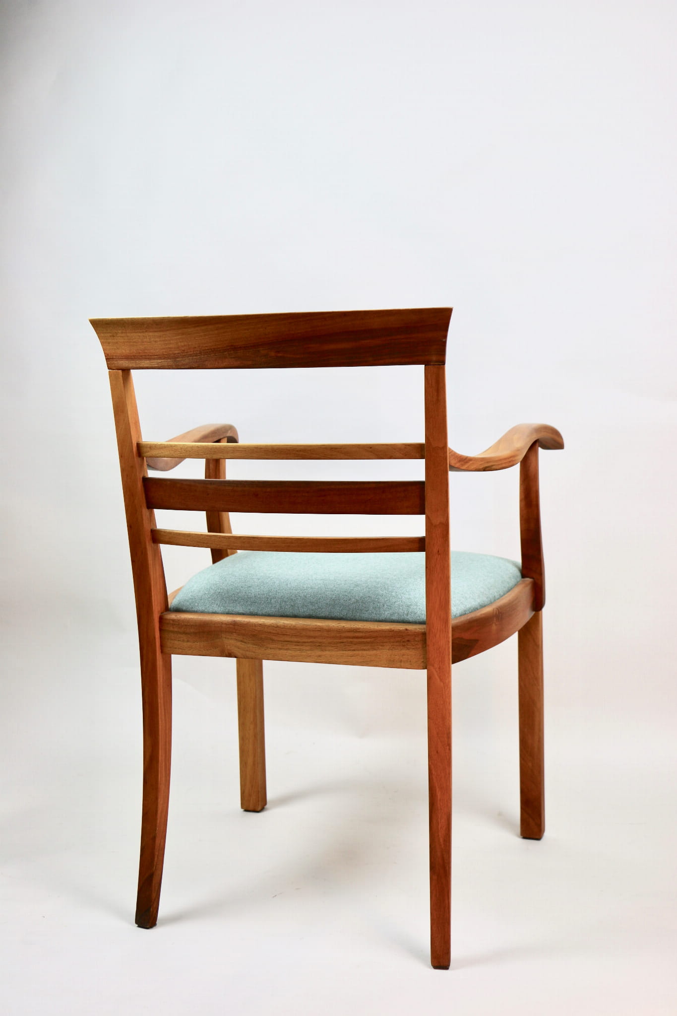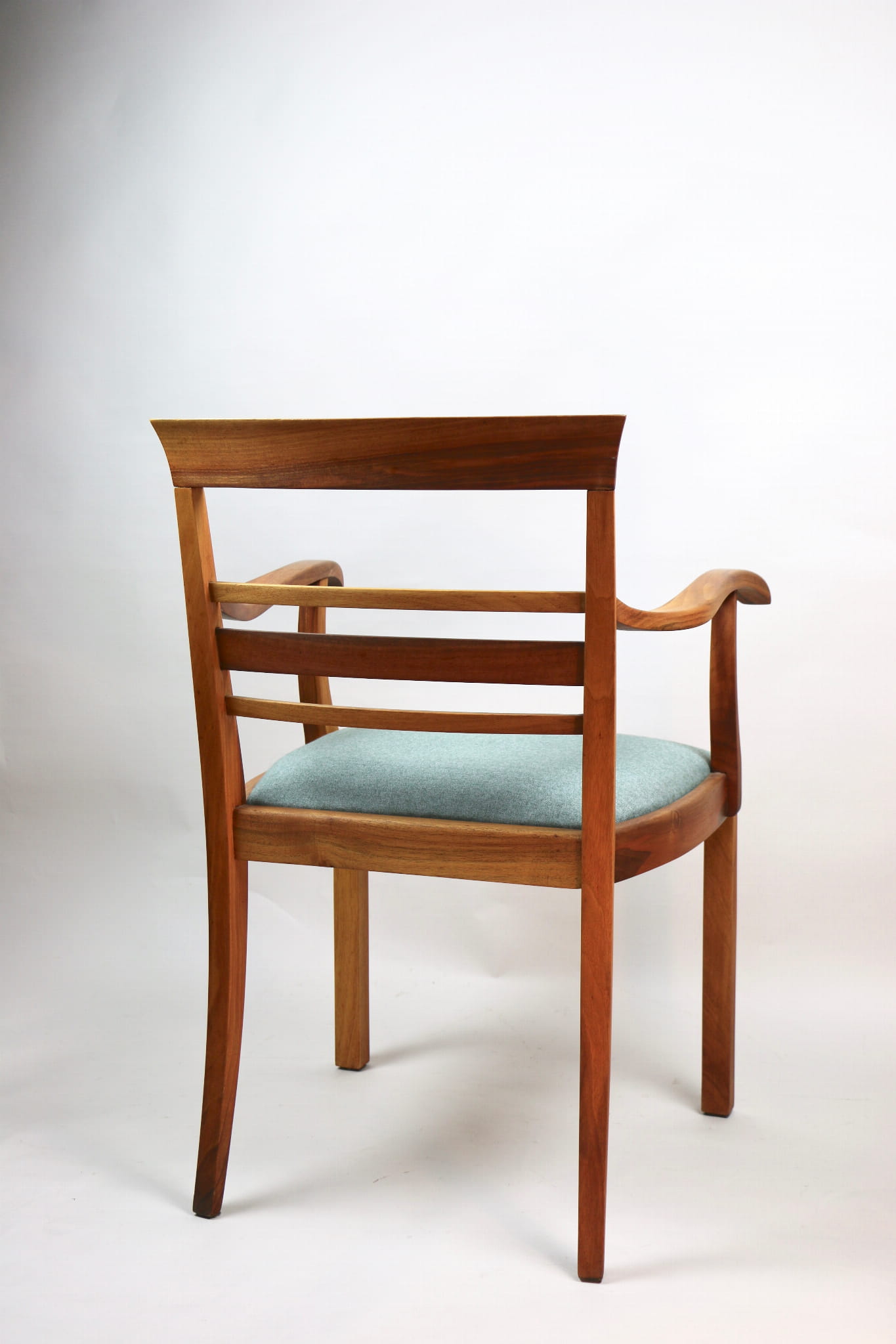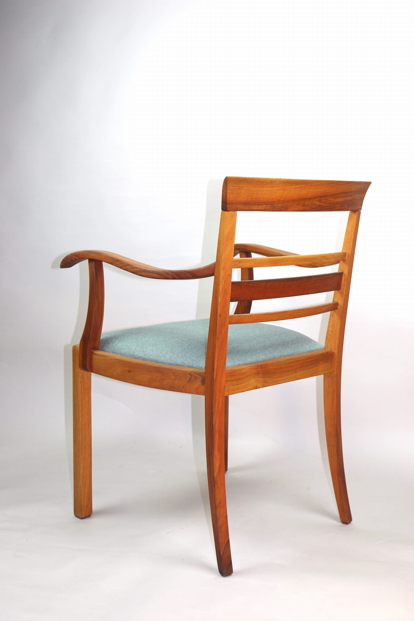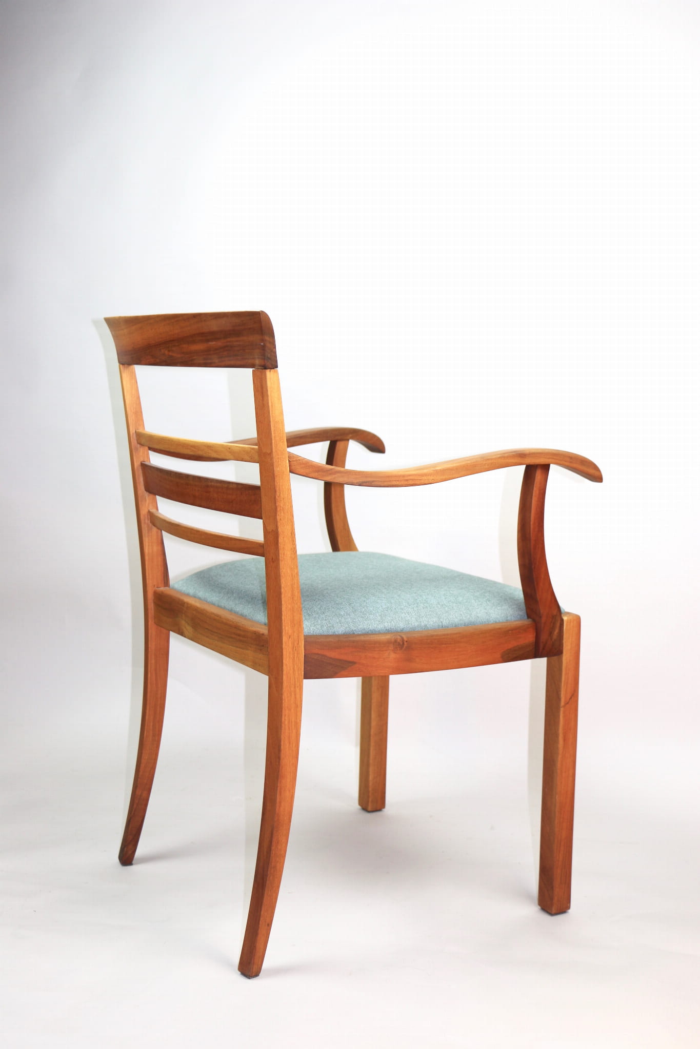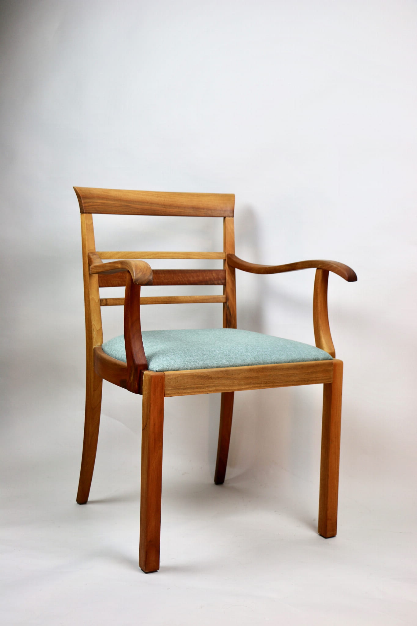 Fotel gabinetowy z lat 60. Odrestaurowany, nowe obicie pokryte najwyższej jakości materiałem tapicerskim w szaro zielonym kolorze typu jodełka. Stelaż drewniany połączony z podłokietnikami w naturalnym kolorze orzecha.